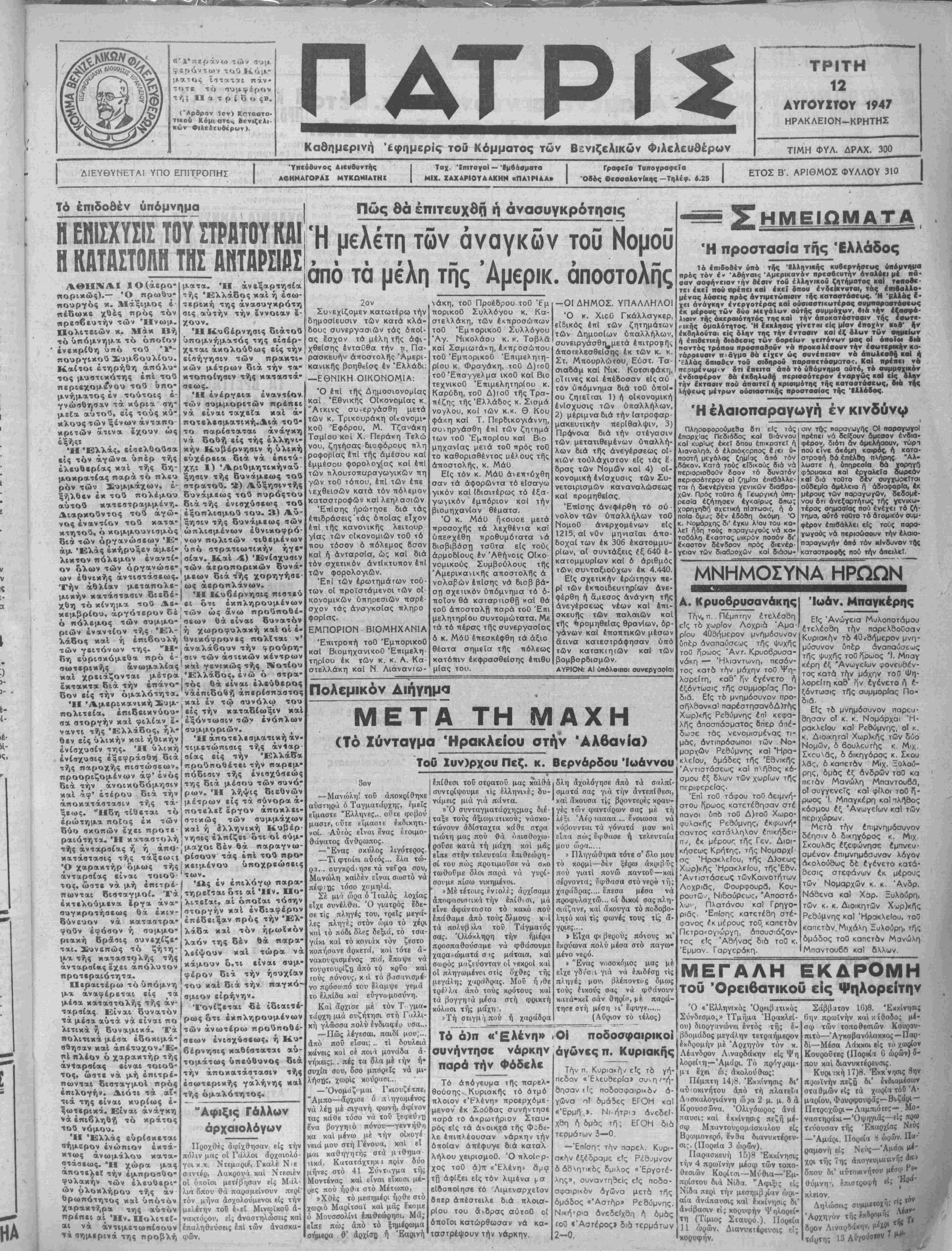 Όδός Οεοοαλον<κΐ|ς -Τηλέφ. «.2$ ΕΤΟΣ Β'. ΑΡΙΘΜΟΣ ΦΥΛΛΟΥ 310 Τό έπιδοθέν ύπόμνημα Η ΕΝΙΣΧΥΣΙΣ ΤΟΥ ΣΤΡΑΤΟΥ ΚΑΙ Η ΚΑΤΑΣΤΟΛΗ ΤΗΣ ΑΗΤΑΡΣΙΑΣ ΑΘΗΝΑΙ 1Ο(άερο· πορικώς).— Ό πρωθυ- πουργός κ. Μάξιμος ε¬ πέδωκε χθές πρός τόν πρεσβευτήν των Ήνωμ. Πολιτειών κ. Μάκ Βή τό ύπόμνημα τό οποίον ενεκρίθη υπό τού Ύ- ηουργικού Συμβουλίου. Καίτοι έτηρήθη άπόλυ- τος μυστικότης επί τού περιεχομενου τού «πό- μνήματος έν ^ τούτοις ε¬ γνώσθησαν τα κύρια ση- μεϊα αυτού, είς τούς κύ- κλους των ξένων άνταπο- κριτών άτινα έχουν ώς έ ξής Ή Ελλάς, είσελθούσα είς τόν άγώνα υπέρ τής ελευθερίας καί τής δη¬ μοκρατίας παρά τό πλε>