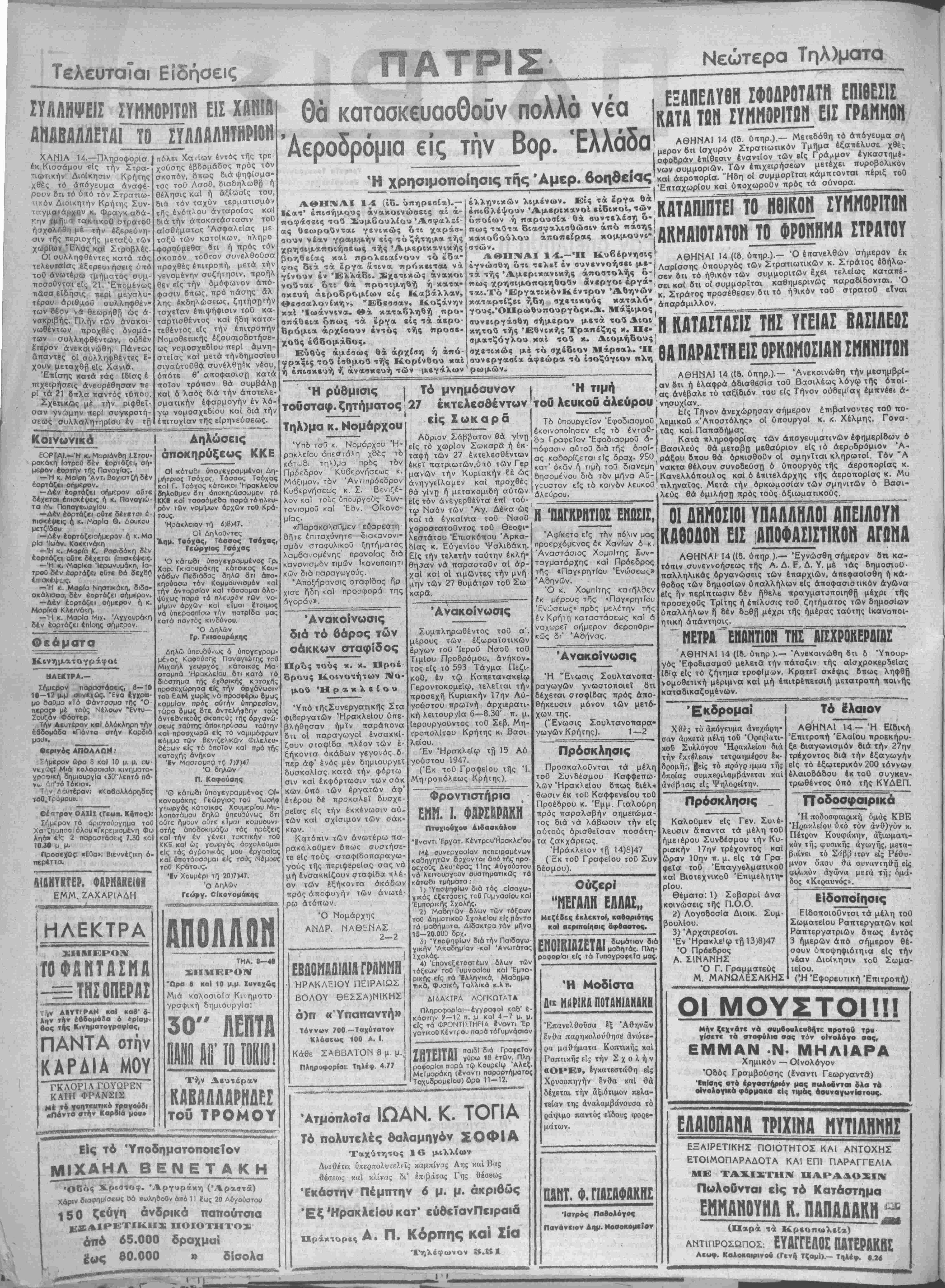 ρω άτόπων. <· -; ■- Ό Νομάρχης ΑΝΔΡ. ΝΛΘΠΝΑΣ 2-2 ΕΒΔΟΗΒΔΙΑΙΑΓΡΑΝΝΗ ΗΡΑΚΛΕΙΟΥ ΠΕΙΡΑΙΩΣ ΒΟΛΟΥ ΘΕΣΣΑ)ΝΙΚΗΣ α)π « Υπαπαντή» Τόννων 700 —Ταχύτατον Κλάσεος 100 Α. Ι Κάθε ΣΑΒΒΑΤΟΝ 8 μ μ. Πληροφορίαι: Τηλέφ 4.77 Τα μνημόσυνον 27 έκτελεσθέντων είς Σωκαρα Αυριον Σάββατον θά γίνη είς τό χωρίον Σωκαρδ ή έκ ταφή των 27 έκτελεσθέντων έκεΐ πατριωτών,ύπό των Γερ μανών την Κυριακήν εέ ώς άνηγγείλαμεν καί προχθές θά γίνη ή μετακομιδή αυτών είς τόν άνεγερθέντα επί τού¬ τω Ναόν των Αγ. Δέκα ώς καΐ τα έγκαΐνια τοθ ΝαοΟ χοροστατοθντος τοθ Θεοφι- λεστάτου Έπισκόπου Άρκα- δΐας κ. ΕύγενΙου Ψαλιδάκη. Είς την τελετήν ταύτην έκλή θη^αν νά παραστοθν αί αρ¬ χαί καί οί τιμώντες την μνή μην των 27 θυμάτων τοθ Σω καρά. 'Ανακοίνωσις Συμπληρωθέντος τοθ α'. μέρους των έξωραίστικών έργων τοθ ΊεροΟ ΝαοΟ τοθ ΤιμΙου Προδρόμου, ανήκον¬ τος είς τό 593 Τάγμα Πεζι- κοθ, έν τώ ΚαπετανακεΙφ ΓεροντοκομεΙφ, τελεΐται την προσέχη Κυριακήν 17ην Αύ- γούστου πρωίνή άρχιερατι- κή λειτουργία 6—8.30' π. μ. Ιερουργοΰντος τοθ Σεβ. Μη- τροπολίτου Κρήτης κι Βασι λεΐου. Έν Ηρακλείω τή 15 Αύ γούστου 1947. (Έκ τοθ ΓρσφεΙου τής 'Ι. Μητροπόλεως Κρήτης) Φροντιστήρια ΕΪ1Η. Ι. ΦΜηΡΑΚΗ Πτυχιοϋχου Αιδαακάλου "Βναντι Έργατ. Κέντρου'Ηρακλε'ου Μέ συνεργαοΐαν πεπειραμένων καδηγητών δρχοντοι άπό τής προ οεχοθς Δευτέρα*; 11ης Αύγούστου νά λειτουργοθν συστηματικώς τα κάτωδ» τμήματα : 1) 'ΥποψηφΙων διά τάς εΓοαγω- γικάς έζιετάοεις τοθ ΓυμνασΙου καΐ Εμπορικάς Γχολής. 2) Μαθηιών δλων των τόζεων τοθ ΔημοτικθΟ Σχολε'ου είς πάντο τα μαθήμοτα. ΔΙδακτρα τόν μήνα 15-20.000 δρχ. 3) 'Υποψηφίων διά την Παιδογυ γικήν Ακαδημίαν -καΙ Άνωτάτας Σχολάς. 4) "τ.πανεξιτοστέων δλων των τάξεων τοθ ΓυμναοΙου καΐ "Εμπο ρικής είς τα Ίλλπνικά, Μαδημα τικό, Φυσικό, Γαλλικά κ.λ π. ΔΙΙιΑΚΤΡΑ ΛΟΠΚηΤΑΤΑ Πληροφορίαι—εγγραφαί κα&' ε¬ κάστην 9—12 π. μ καΐ 4-7 μ. μ. είς τα ΦΡΟΝΤΟΤΗΡΙΑ ίνοντι "Ερ γοτικοΟ Κέντρθϋ παρά τώΓυμνάσιον 9Ι1ΤΕΙΤΙΙΙ παιδΙ διά ρατ 1ΠΙΕΙΙΗ1 γύρω 18 έτθν. Πλη ροφορΐοι πορά τψ ΚουρεΙψ Άλεζ. Μεΐμαράκη (δνσνπ παραρτήυατος ΤοχυδρομεΙου) Ορα 11 — 12. ^ΑτμόπλοΤα ΙΩΑΝ. Κ. ΤΟΓΙΑ Τό πολυτελές θαλαμηγόν ΣΟΦΙΑ Ταχύτητος 1β μιλλίων Δκΐθέτει ύπερπολυτελεΐς καμπίνας Αης καί Β'«ς θέσεως χ<Λ κλίνας δι1 επιβάτας Γης θέσεως Έκαστην Πέμπτην 6 μ. μ. ακριβώς Έξ Ηρακλείου κατ' εύθεΐανΠειραια Α. Π. Κόρπης κο8 Σία Τηλέφωνον 4Η τιμι τού λευκοΰ άλεΰρου Τ6 υπουργείον Έφοδιασμοΰ έκοινοποίησεν είς τδ ένταθ- 8α Γραφείον Έφοδιασμοΰ α¬ πόφασιν αυτού διά τής οποί¬ ας καδορίζεται είς δραχ. 950 κατ' ό*δν Γ) τιμΓ) τού διανεμη θησομένου διά τδν μήνα Αύ¬ γουστον είς τδ κοινόν λευκοΰ άλεύρου. ΚΑΤΑΠΙΠΤΕΙ ΤΟ ΗΘΙΚΟΝ ΣΥΜΜΟΡΙΤΩΝ ΑΚΜΑΙΟΤΑΤΟΗ ΤΟ ΦΡΟΗΗΗΑ ΣΤΡΑΤΟΥ ΑΘΗΝΑΙ 14 (Ιδ. ύπηρ.).- Ό επανελθών οήμβρον έκ ΛαρΙσσης ύπουργός των Στρατιωτικών κ. Στράτος εδήλω¬ σεν δτι τό ηθικόν των συμμορ,τών έχει τελείως καταπέ- οβι κσί «τι οί συμμορίαι καθημερινώς παραδΐδονται. Ο κ. Στράτος προσέθεσεν δτι τό ηθικόν τοθ στραϊθθ είναι απαράμιλλον. ___________ _____ καΤασΜσΊτΈπγεΤασ βασιαεοσ θα παραστηεισ ορκομοσιαη σμηνιτων ΑΘΗΝΑΙ 14 (18. ύπηρ.).— Ανεκοινώθη την μεσημβρί¬ αν δτι ή έλαφρά άδιαθείσΐα τοθ Βασιλέως λόγω τής οποί¬ ας άνέβαλε τό ταξίοιόν τού είς Τήνον ού8εμ·α*| έμτΐνέβι ά- {πιβαίνοντες τοθ πο- κ. κ Χέλμης, Γονα· Π 'ΠΑΓΚΡΗΤΙΟΣ ΕΝΩΣΙΪ, Αφίκετο είς τίΊν πόιν μας προερχόμενος έκ Χανίων ό κ. Άναστάσίος ΧομπΙτης Συν- ταγματάρχης καϊ Πρόεδρος τ?ις «ΠαγκρητΙθυ Ενώσεως» Αθηνών. Ό κ. Χομπίτης κατήλδεν έκ μέρους τής «Παγκρητίου Ενώσεως» πρδς μελέτην τής έν Κρήτη κατ