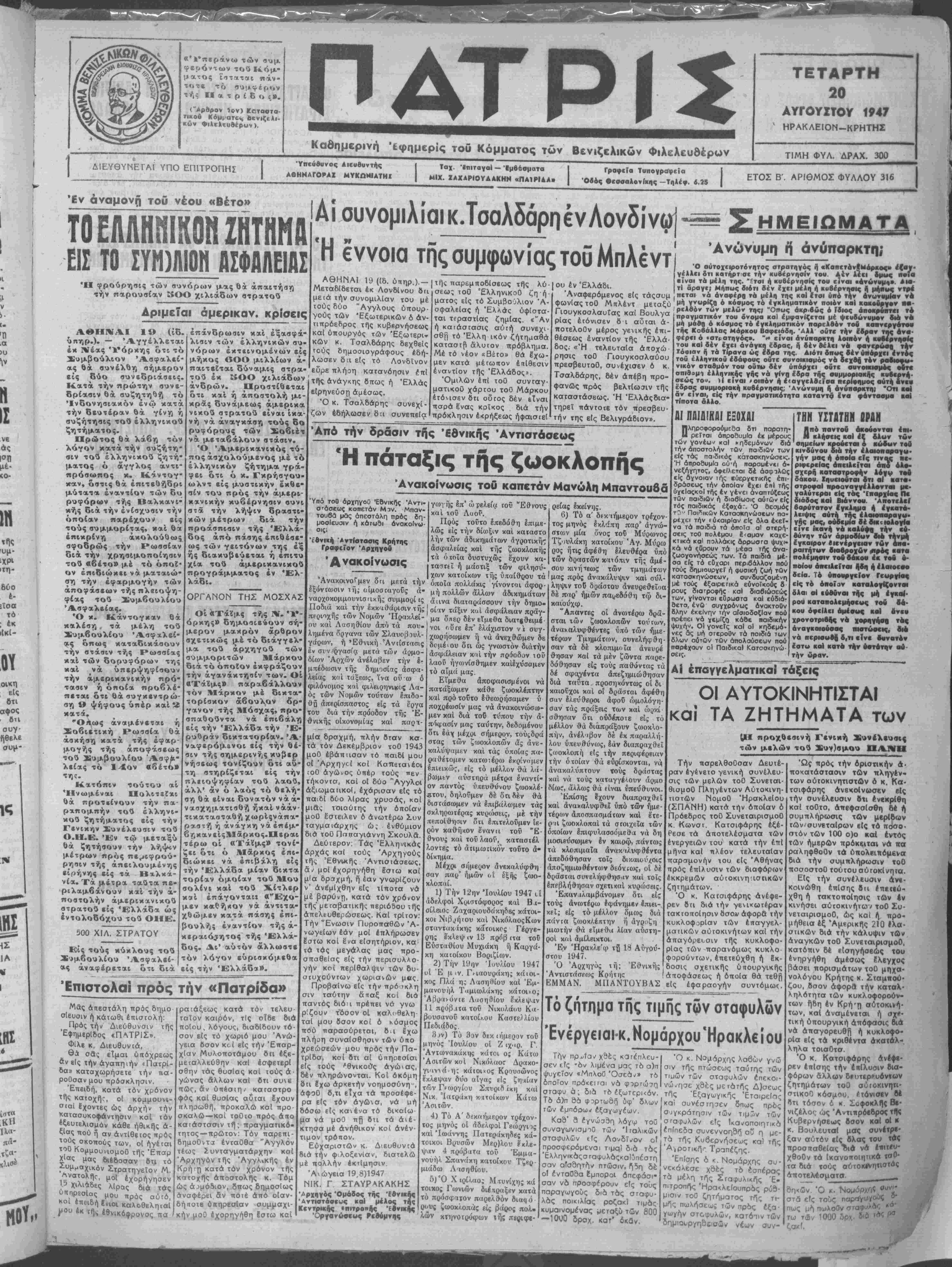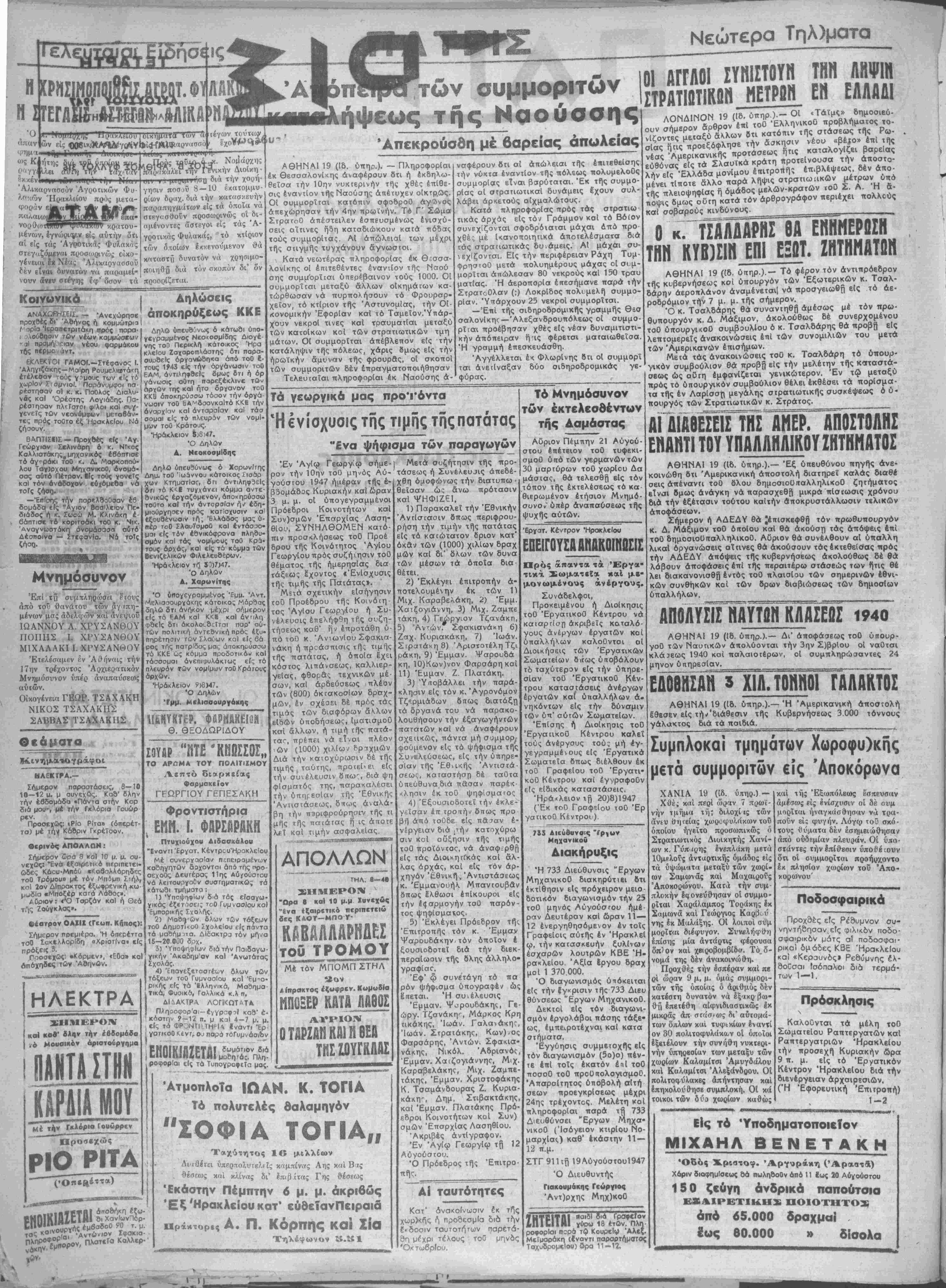 Τηλέφωνον <$.ξ$1 Τό Μνημόσυνον των έκτελεσβέντων τής Δαμάστας Αυριον Πέμτιην 21 Αύγού- στου επέτειον τοθ τυφεκι- σμοθ υπό των γερμανών των 30 μαρτύρων τοθ χωρίου Δα μάστας, Θά τελεσθή είς τόν όπον τής εκτελέσεως τό κα- Ίερωμένον ετήσιον Μνημό¬ συνον υπέρ αναπαύσεως τής ψυχής αυτών. 5) Ά ν τ ώ ν.~ Σφακιανάκη 6) 4κη, 7) Ιωάν. Στρατάκηβ) Άρΐστοτέλη Τζι ράκη, 9) Έμμαν. Ψαρουδά κη, 10)Κων)νον ΦαρσάρηκοΙ 11) Έαμαν Ζ. Πλατάκη. 3) Ύηοβάλλει την παρά¬ κλησιν είς τόν κ. Αγρονόμον Τζβ.ρμιά8ων 6ηως διατάξη τα δργανά τού νά παρακο- λουθήσουν την έξαγωγήντών πατατών καί νά άναφέρουν σχεακώς, ττάντα μή συμμορΓ φοΰμενον είς τό ψήφισμα τής Συνελεύσεως, είς την υπηρε¬ σίαν τής Έθνικής Άντιστά- σεως, καταστήση δέ ταθτα ύπεύθυναδιά πάσαν παρέκ- ησΐν έκ τοθ ψηφ'ισμαι-ος 4) Έξουσιοδοτεΐ την έκλε- γεΐσαν έΐτ τροττήν δπως προ άπό χοθδε είς πά,ταν ε¬ νέργειαν διά ;τήν κατοχύρω σιν κοί αύξησιν τής τιμής τοθ προΐόντος, νά άναφ;ρθ(ΐ είς τάς ΔιοιπητΓκάς καί άλ¬ λας αρχάς, κο.1 είς τόν αρ¬ χηγόν Έθνική, Άντιστάσεως κ. Εμμανουήλ. Μπαντουβάν δπως έλθωσι έπίκουροι είς την εφαρμογήν τσθ παρόν¬ τος ψηφΐσματ,ος. 5) Έκλέγει Πρόεδρον τής Έπιτροπής τόν κ. Έμμα,ν Ψαρουδάκην. τόν οποίον έ ξουσιοδοτεΐ διά την διεκ περαίωσιν τής βλης άλληλο· γραφίαο. Έφ' φ συνετάγη τό πά ρόν ψήφισμα ύηογραφέν ώ< ειτεται. Ή συ ι έλευσις Έμμαν. Ψαρουδάκηι,, Γε ώργ. ΤζανάκηΓ, Μάρκος Κρη πκάκης, Ιωάν. Γαλανάκης Ιωάν. Στρατάκης, Κων)νος Φαρσάρης, Άντών. Σφακια¬ νάκης, Νικόλ. Άδριανό< Έμμαν. Χά(ζογιάννηο, Μιχ Κσραβελάκης, Μιχ. Ζαμπε τάκης, Έμμαν. Χριστοφάκης Κ. Τσαμάνδουρας Ζ. Κυρια¬ κάκης, Δημ. Στιβακτάκης καί Έμμαν. Πλατάκης Πρό- εδροι Κοινοτήτων κοί Συν) σμών Επαρχίας Λασηθίου. Άκριβές αντίγραφον. Έν Άγίω Γεωργίφ τβ 12 Αύγούστου. 'Ο Πρόεδρος τής Έπιτρο ΑΙ ταυτότητες Κατ' ανακοίνωσιν έκ τη*ς χΐορ)κής ή ηροσεσμΐα διά την ?κδοσιν ταυτοτήτων παρετά- 8η μέχρι τέλους τού μηνός Ό<τω6ρΙου. Εργατ. Κέντρον ΉροκλεΙου ΕΠΕίΓΟΥΣΛ ΛΙΪΛΚΟΙΗΟΣΙΣ Πρός όίπαντα τα Έργα· τικά ΣωματεΙα καί με- μονωμένους άνέργους. Συνάδελφοι, Προκειμένου ή Διοίκησις τοθ Έργατικοϋ Κέντρου νά ιαρτίσπ άκριβεΐς καταλό- γους άνέμγων έργατών κοί ύπαλλήων καλοϋντοι αί Διοικήσεις των Έργατικών Σωματείων διτως ύαοβόλουν τ6 ταχύτερον είς την υπηρε¬ σίαν τοθ ΈργατικοΟ Κέν- .ρου καταστάσεις άνέργων έργατών καί ύπαλλήλων α¬ νηκόντων είς την δύναμιν των ύπ' αυτών Σωματείον. ΈπΙσης ή Διοίκησις τοθ ΕργαιικοΟ Κέντρου καλεΐ τούς άνέργους τού; μή έγ- γεγραμμένους είς Έργατικά Σωματεΐα 8πως διέλθουν έκ τοθ ΓραφεΙου τοθ Έργατι κου Κέντρου κσί εγγράψουν είς εΐδικάς καταστάοεκ. Ηράκλειον τή 20)8)1947 (Έκ τοϋ ΓροφεΙου τοθ Έρ γατικοθ Κέντροι·). Ο κΓΤΣΔΛΔΑΡΗΣ ΘΑ ΕΗΗΜΕΡΩΣΗ ΤΗΝ ΚΥΒ3ΣΙΪΙ ΕΠΙ ΕΞΟΤ. ΖΗΤΗΗΑΤ.Η ΑΘΗΝΑΙ 19 (ίδ. ύπηρ.).— Τό φέρον τόν άντιπρόεδρον τής κυβερνήσεως κοϊ υπουργόν των Εξωτερικών κ. Τσαλ- δάρην άεροπλάνον άναμένεται| νά προσγειωθή είς τό αε¬ ροδρόμιον την 7 μ. μ. τής σήμερον. Ό κ. Τσαλδάρης θά συναντηθβ1 άμέσως μέ τόν πρω¬ θυπουργόν κ. Δ. Μάξιμον, ακολούθως δέ συνερχομένου τοθ ύπουργικοθ συμβουλΐου ό κ. Τσαλδάρης θά προβή είς λεπτομερείς άνακοινώσεις επί των συνομιλιών τού μετ* των Άμερικανών επισήμων. Μεΐά τάς άνακοινώσεις τοθ κ. Τοαλδάρη τό υπουρ¬ γικόν συμβούλιον θά προβή είς την μελέτην τής καταστά¬ σεως ώς οθτη έμφανίζεται γενικώτερον. Έν τώ μεταξύ πρός τό υπουργικόν συμβούλιον θέλει εκθέσει τα πορίσμα- τα τής έν Λαρίσση μεγάλης στρατιωτικάς συσκέψεως ό ύ* πουργός των Στρατιωτικών κ. Στρά
