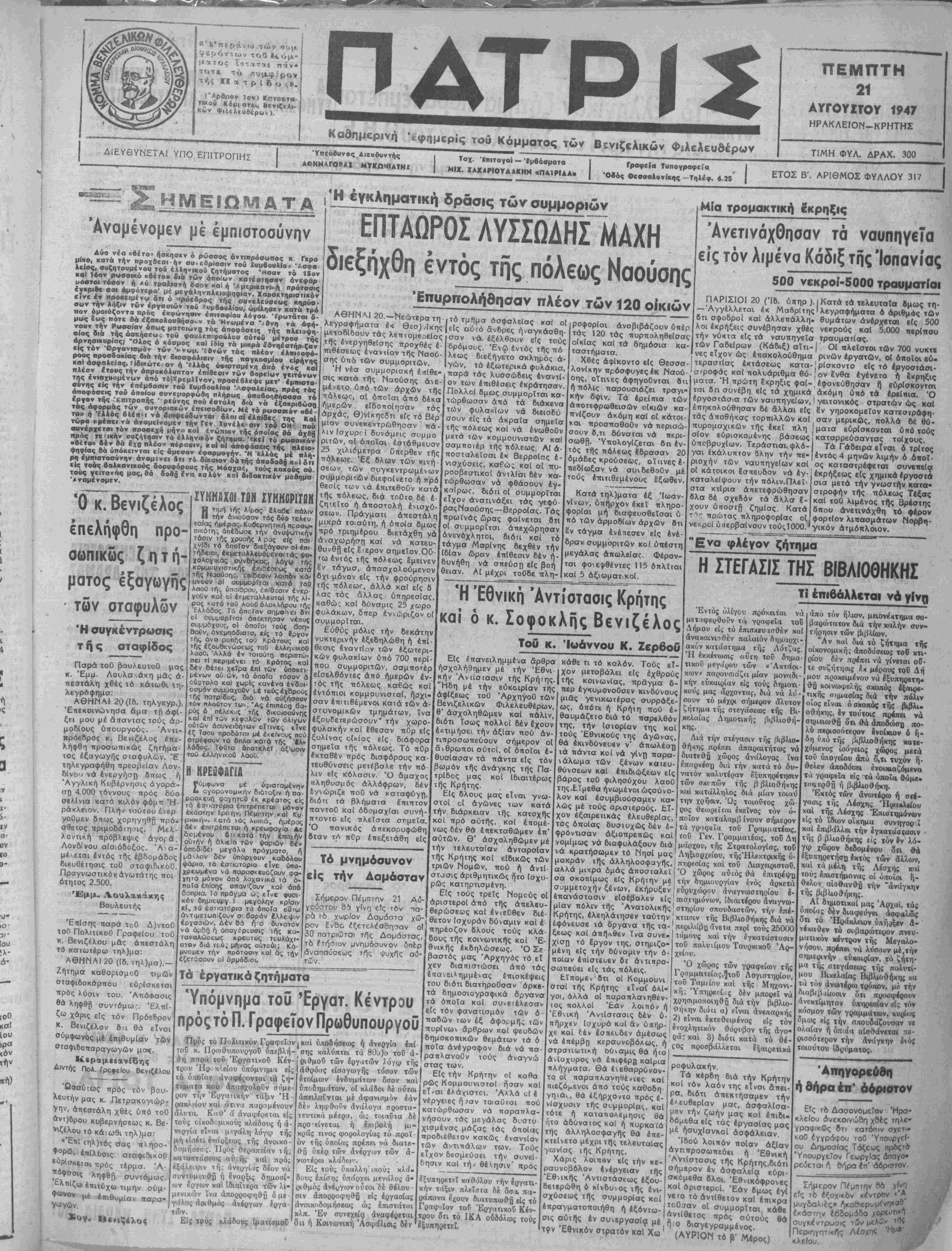 τικοι» Κόμ'ατβΑ, β<ν·ίεΛι- κύν Φιλελεύθερον). ?- Μ ΠΑΤ ™-----'-----—————————————————επ»Μεε--εβεε|π----— Καθημερινή νφ-ιμερίς τού Κόμματος των Βενιζελικήν Φιλελεύθερον ΠΕΜΓΤΤΗ 21 ΑΥΤΟΥΣΤΟΥ 1947 ΗΡΑΚΛΕΙΟΝ-ΚΡΗΤΗΣ ΤΙΜΗ ΦΥΛ. ΔΡΑΧ. 300 ΔΙΕΥΘΥΝΕΤΑΙ ΥΠΟ ΕΠΙΤΡΟΠΗΣ Ύπεύάυνος Λιευβυντής ΑβΗΝΑΓΟΡΑΧ ΜΥΚΩΗΙΑΤΗΖ Ταχ. 'ϊηιταγαί — Έμβάσματα ΜΙΧ. ΖΑΧΑΡΙΟΥΔΑΚΗ*. «ΠΑ1Ρ1ΛΑ· Γραφεία Τυπογραφεία Όβός θεσσαλονίκης —Τηλέφ. 6.25 ΕΤΟΣ Β'. ΑΡΙΘΜΟΣ ΦΥΛΑΟΥ 317 Η,ΜΕΙΟΜΑΤΑ^— δράσις των συμμοριών ^Αναμένομεν μέ εμπιστοσύνην Δύο νέα «βέτο» ήσκηββν ό ρώσσος άντιπρόσωπος κ Γκρο μίκο, κατά την πραχβεσι ήν συνεδρίασιν τού ΙυμβουλΙο.· 'Λσφα λβίας, συζητούμεν ου τού έλληνικοΰ ζητήματος Ήσαν τό 15ον καί Ισον ρυσσικό αβέτο» διά των οποίων κατέστησαν άνεφαρ Μβστοι τόσον ή *ύ τραλιανή δσον «αί ή '4μερικανι»η πρότασις ίνκριαβσαι αμφότερα· μέ μεγάληνπλειοψηφϊαν. Χαρακτηριστικόν είνε έν ηροκειμένω δτι ό ηρόεδρος τής συνελεύσεως κηρύσ· σ«ν την λήξιν των εργασιών τού 'υμβουλίου, ωμίλησεν κατά τρό πον όμοιάζοντα πρός εκφώνησιν έπιταφϊου λόγου. 'ΐρωτάται 8- μιις εως ηότε δα εξακολούθησεν τα Ήνωμένα "*βνη νά άφή· νούν την Ρωσσίαν όπως ματοιώνη. τάς όποφάσεις τής πλίΐοψη- φ(ας διά τής όσκήσεοκ τού φαυλεπιφαύλου ούτοϋ μέτρου τής άρνησικυρίας; Όλος ό κόσμος καϊ (5ία τα μικρά ίθνηέστηρ,ζαν είς τόν Όργανισμόν των'^νωμ. "ίβνών τάς πλέον έλπιοοφό- ρους προσδοκΐας διά την διασφάλιοιν τής παγκοσμίου εΐρήνη καΐ ασφαλείας. Πδικώτε όν ή 'κλλάς ύψισταμένη οκά ενός καΐ πλέον έτους την άπροκάλυπτον επίθεσιν των βορείαν γειτόνον της ένισχυομένων άπό τόΙΧρεμλϊνον, ηροσέβλεψε μετ* έμηιστο- συνης είς την επέμβασιν τού Ιυμβουλίου Ασφαλείας, πρός τάς όποφάσεις τού όποίου συνεμορφώβη πλήρως ύποβοησήσασα τό έργον τής 'ε,πιτροπής Ερεύνης που έοτάλη διά νά εξακριβωθή) τάς αφορμάς των συνοριακύν επεισοδίον. Μέ τό ροσσικόν αβέ- το» ή Ελλάς βλέπΊ νά διαψευδονται δλαι αί έλπίδΐς της ΚαΙ τώρα κρέπει νά άναμείνομεν την Γεν ϊυνέλί'σιν τού ΟΗ(-. πού συνέρχεται τάν προσέχη μήνο καί ίνώπιον τής οποίας σά όχβή πρός τε ικήν συζήτησιν τό ελληνικόν ζήτημα. 'ίκεϊ τό ρωσσικόν «βέτοο δέν 8α έ ι π. πλέον πέρασιν, καί οί άποφόσεις τής πλειό- ψηφίας βά ΰπόκεινται είς άμεσον εφαρμογήν. Ή Ίλλάς μέ πλή ρη εμπιστοσύνην άναμενει δτι τό δίκαιον θά τής άποδοσό Κϋ· ότι είς τοΰς βαλκανικοΰς δορυφόρους τής Μόσχα»:, τούς κακοΰς ού τοΰς γείτονος μας, 8ο δοσά ίνα καλόν κοΐ διδακτικόν μαβημα "Αναμένομεν. ΕΠΤΑΟΡΟΣ ΛΥΣΣΟΑΗΣ ΜΑΧΗ διεξήχθη έντός της πόλεως Ναούσης Έπυρπολήθησαν πλέον των 120 οι'κιών Ό κ. Βενιζέλος έπεληφθη προ¬ σωπικάς ζητή¬ ματος έξαγωγης • τδν σταφυλδν Ή συγκέντρωσις τής σταφίδος Παρά τοθ βουλευτού μα κ. Έμμ. Λουλακάκη μάς ά πεστάλη χθές τό κάτωθι τη λεγροφημα: ΑΘΗΝΑΙ 20 (18- τηλγεγρ.) 'Επεκοινώνησα άμα τή όφί ξει μου μέ άπανΐσς τούς άο μοδΐους ύττουργούς. Άντι- Ηρόε8ρος κ. Βενιζέλος έπε ληφθή προσωπικώς ζητήμα- τος έξαγωγης σταφυλών. 'Ε τηλεγραφήθη πρεσβείαν Λον δίνου νά ενεργήση δπως ί Αγγλικη Κυβέρνησις αγορά¬ ση 4 000 τόννους πρός δύο σελίνια κατά κιλόν φόμπ Ή ράκλειον. Πλήν τούτου ένερ γοθμεν βιτως χορηγηθή πρό¬ σθετος πριμοδότηαις. Μελ- λοντική πρόβλεψις άγοτα, Λονδίνου αίσιόδοξος. ^ μέίεται έντός τής εβδομάδος διευθέτησις τοθ στσφιδικοϋ. Προγνωστικόνάνωτάτης ποι ότηΐος 2.500. - .· Έμμ. Λουλακάκης Βουλευτής Έπίσης παρά τοϋ Δ)ντο0 ιοθ ΠολπικοΟ Γραφείου τού κ. Βενιζέλου μάς απεστάλη τό κατωτέρω τηλ)μσ: ^ΑΘΗΝΑΙ 20 ((δ. ιηλ)μα).— Ζήτημα καθορισμοθ τιμώ