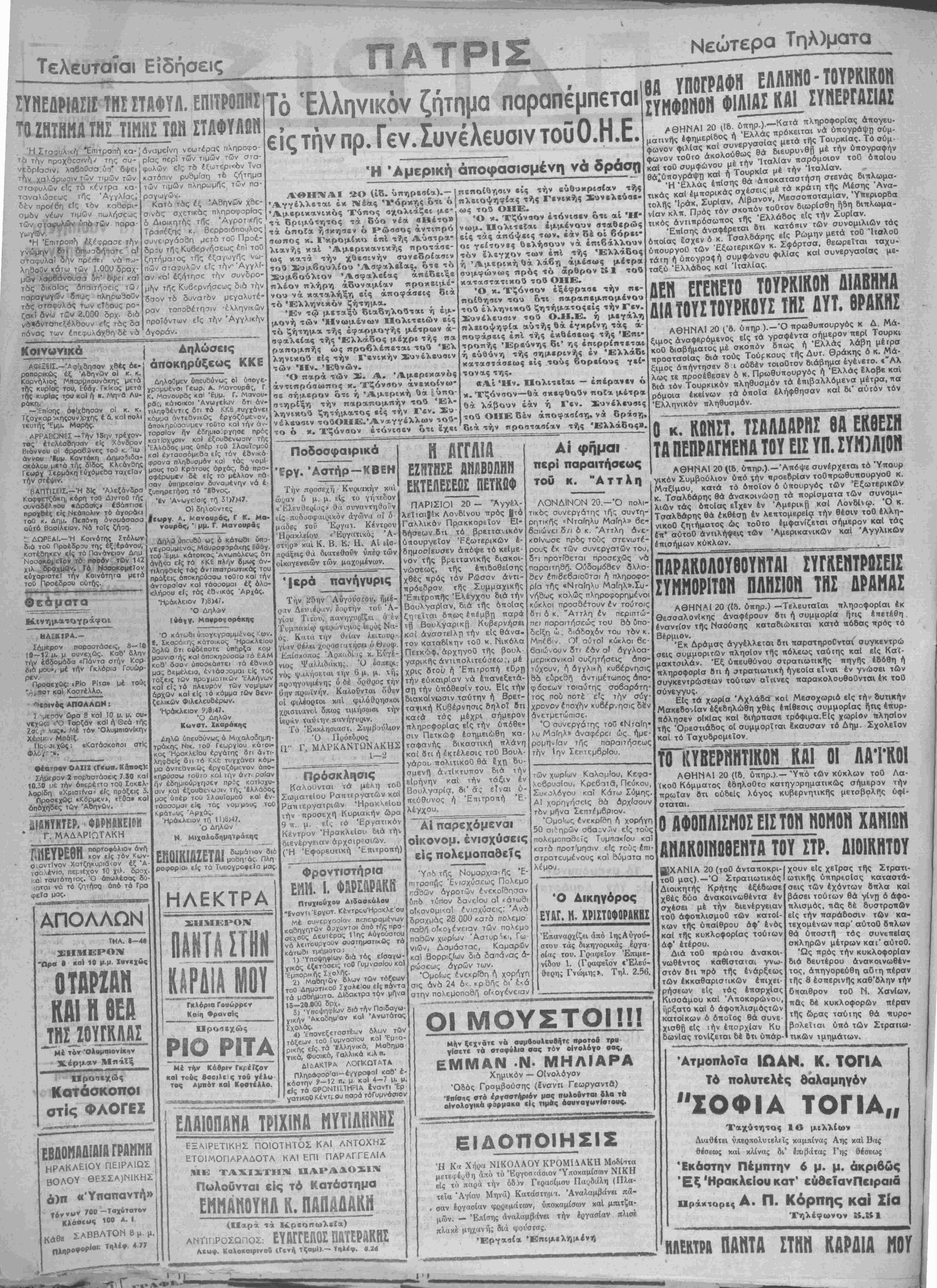 τιληφθε|ς τ<ΐς αντιπατριωτικάς τού μετά πραζει<· όποκηρύασω τοθτοκαΙ την άΐ ) τάοοομαι έξ ολο¬ Φεάματα Κινημοιτογράφοι ΗΑΕΚΤΡΑ.- ΣΛμερον παραοτάσεις, 8—10 10—12 μ. μ ουνεχως. Καθ" δλην την έβδομάδα «Πάντα στήν Κσρ- οΊά μου», μέ την Γκλόρια Γουώρ- ρεν. Προοεχθς: ·Ρίο Ρίτα» μέ τούς νι.ποτ καΐ Κοστέλλο. ΑΠΟΛΛΩΝ: ι ■μι.-^Ί ώρα 8 κσί 10 μ. μ. συ¬ νεχως; «Ό Τορζάν καΊ ή Θεά της νας». Μέ τόν ΌλυμπιονΙκην ν, Μπάϊζ. . ^χως: «Κατάσκοηοι στΐς πραζει< όπκηρύ η άνταρσΐαν κο) τάοοομαι έξ ολο κλήρου είς τάς έβνίκας Αρχάς. Ηράκλειον 7)8)47. Ό Δηλών Μα«ρο<(ορβκης θέατρον ΟΑΙ1Χ (Γ«»η. ΚΑπος): Σήμερον 2 παρτιστάσεις 7 30 καΙ ,.------ ----- 10 30 υέ την όπερέττα τοθ Σακελ-Ιην εδημιούργησεν Ό κάτωθι υπογεγραμμένος ^βν. 6. Σ·ιαρά^ ής κάτοικος Ηρακλείου δολθ ότι ουδέποτε ύπήρζο. κομ μουνισΓής καΙ όποκηρυσοω τό ΕΑΜ κοθ' δσον ΰποσκ6πτει τα έθνικά μας θεμέλειο, έντάσοομαι ί,ίς τος τάξίΐς των ηρογματικών ΐλλήνων κα) εί; τό πλευρόν των νομΐμων αρχθν κα) είς τό κόμμα των Ββνι· ζελΐκών φιλελευθέρων. Ηράκλειον 9;β)47. Ό Δηλών Κονοτ. Χκαράκης ίιηΧώ ύπευ&ύνως ώ Μιχολοδημη» τράκης Νικ. τοθ ΓεωργΙου κάτοι- κάς Ήρακ,λεΙου έργάτης οπ άντι- ληφβεΐς δ π τό ΚΚί: τυγχάνει κόμ¬ μα άντεονικώς έργοζόμενον άπο· κηρύσσω τουτο κοΙ την άντ« ροίαν πρδς κατίσχυ Ποδοσφαιρικά 'Αστήρ-ΚΒεΗ Την προσέχη / Κυριακήν καί ώ^αν 5 μ. μ. είς το γή-τεδον «Ελευθερίας» θά συναντηθοΰν είς ποδοσφαιρικόν άγώνα αι δ μαδες τού Έρν«τ· Κέντρου Ηρακλείου «Έργατικό; Ά- στηρ» καΐ Κ. Β. Ε; Η. Αί &.ζσ- πράξεις θά διατεθοΰν υπέρ των οΐκογενβιών των μαχομένων. '|ερά πανήγυρις Την 25ην ΑΰγούσΓου, ημέ¬ ραν Δευιέρκν, εορτήν τοΰ Ά- γίου Τιτου, πανηγυρίζει ό έν Τυμπακίω φε^ώννμος Ιει^ός Να- ός Κ(ΐτ« την θείαν Η ΑΓΓΛΙΑ ΕΖΗΤΗΣΕ ΑΝΑΒΟΟΗΝ ΕΚΤΕΛΕΣΕΟΣ ΠΕΤΚΟΦ ΠΑΡΙΣΙΟΙ 20 - Άγγέλ- λεΤται|ίκ ΛονδΙνου πρός |τό Γαλλικόν Πρακκορεΐον ΕΙ· &ήσεων Βτι τό βρεττανικόν υπουργείον Εξωτερικών ε¬ δημοσίευσεν άπόψε τό κείμε¬ νον τής βρειτανΐκής διακοι¬ νώσεως, τής έπιδοθείσης χθές πρός τόν Ρώσον άντι- πρόεδρον τής Συμμαχικής 'Επιτροπής Έλέγχου διά την Βουλγαρίαν, διά τής δποΐας ζητεΐχαι δΐτως Ιτιίμβτι παρά ιή Βουλγαρική Κυβερνήσει άνσστεΐλρ την είς θάνα- ΆοκΊθ^ς κ. Εύγε-) „„, _.. ιδάκη;. Ό έσπερΐ; νος ψαΑ,ήσειαι την 6 μ. μ. τή; νιος προηγουμένης «5 όέ ύ'ρθρος: την ϋ'ην πρωϊνίιν. Καλοθνται όθεν οί φιλέορτοι καί, φιλόθ·ρησκοι χριστιανοΊ δπως τιμήσωσι την Ιεράν ταύιην πανήγυριν. Το Έκκλησιαστ. Συμβούλιον Ό Πρόεδρθς II" Γ, ΜΑΡΚΑΝΤΩΝΑΚΗΣ 12 11).ου 106. ι·|» «ΐ"Ε.ΗΛΙ11^ '"" ^««·>·· ·ΐ|· -~·ιγ-—ι-·-·------ -■·- _» .-., ,ί·