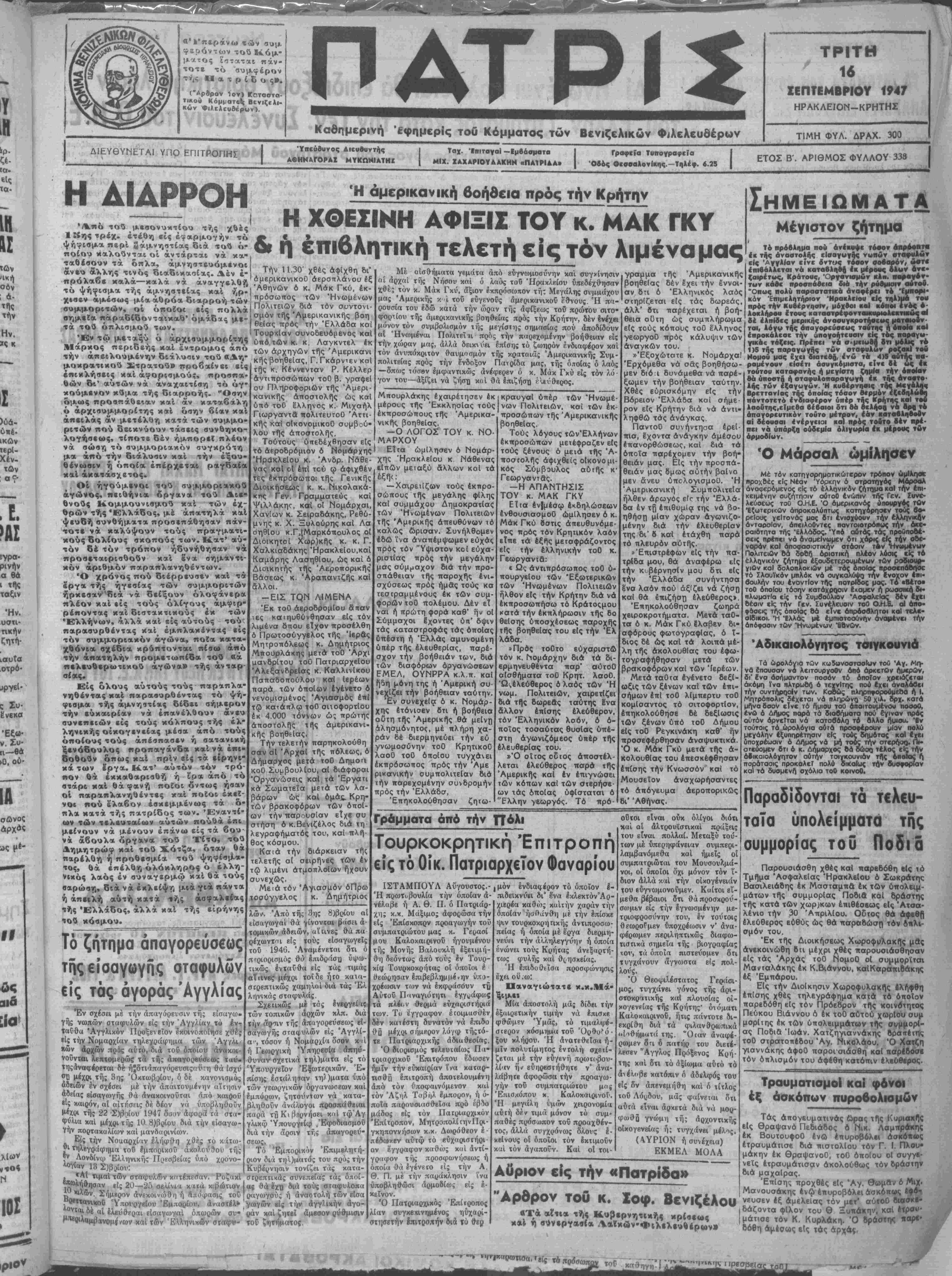 θέατρον ΟΑΧΙΧ <Γεωπ. Κηπος): Σήμερον άργει προετοιμαζόμε- νόν διά την ούριανήν εναρζιν τοθ Νέου Συγκροτήματος Βσριετέ πού παοουσιάσο στό Ηράκλειον 6 " ' " καί Αι Ηνωμεναι Πολιτειαι θά έπιδιώξουν οριστικήν λύσιν " ""% * " ' ος κατά την Γεν. Συνέλευσιν τού 0. Η. Ε. ΛΟΝΔΙΝΟΝ 15 ((δ. ύπηρ ). — Αφιχθείς χθές είς Νέαν εγόρκην ό ύπουργός των Ε¬ ξωτερικών των Ήνωμ. Πολι- τειών κ. Μαρσάλ διά νά πα· ραστβ είς την έναρκτήριον συνεδρίασιν τής Γενικάς Συ¬ νελεύσεως, εξεφώνησεν βα- ρυσήμσντθν λόγον, σχεχιζό- μενον μέ την πολιτικήν των Ήν. Πολιτειών έναντι τοθ Ο. Η. Ε. Ό κ. Μαρσάλ ετόνισεν μεΐσξύ αλλων ότι ή άμερικα- νική άντιηροσωτιείσ παρά τή Γενική Συνελεύσει είναι άποφασισμένη νά άντιδρά- Βαρυοήμαντος λόγος τού οτροτπγοθ Μαρσάλ ση ένεργώς κατά πάσης α¬ ποπείρας δθεν δήποτε προερ- χομένη διά τό σσμποτάρι- σμα τοθ Ιργου αυτής. Άναφερόμενος είς τώ Ελ¬ ληνικόν ζήτημα ό κ. Μαρσάλ εΐηεν δτι ή Βουλγαρία, Γι- ουγκουσλσυΐα καί Άλβανία ένισχύουν την Ελληνικήν άνταρσΐαν παντοιοτρόπως, άπειλουμένης ούτω τής άκε- ραιότητος τής Ελλάδος, πράγμα δπερ ή Άμερική θά άντικρούστ) δι" δλων των μέ σων συνιστωσα είς την Γε¬ νικήν Συνέλευσιν την λήψιν αποφάσεως διά την όριστι- κήν'ρύθμισιν τοθ ζητήματος τούτου. Ώς πρός τό ζήτημα τοθ Βέτο ό κ. Μαρσάλ ετόνισεν ότι ή συχνή καί κσκή χρήσις ωρισμένων άρθρων τοθ κα· ταστστικοθ των Ήνωμένων Εθνών άπειλεΐ νά καταστρέ ψρ τό οίκοΒόμημα τοθτο. ΑΙ Ηνωμεναι Πολιτειαι είπεν ό κ. Μαρσάλ δέ ν άνη- τίθεντσι είς τόν καταστατι¬ κόν χάρτην τοθ ΟΗΕ άλλά λέγουν όπως μή γΐνεται κα¬ τάχρησις αύτοθ. Περαιτέρω ωμίλησεν διάτό ζήτημα έλέγχου τής άτομι- κής ενεργείας κσΐ τής οικο¬ νομικάς ένισχόσεως τής Εΰ- ρώπης, την οποίαν αί Ήνω μέναι Πολιτειαι, είπεν είναι ύποχρβωμεναι νά άναλάβουν τό ταχύτερον. «Έηιθυμοθμεν την τιροα- γωγήν τής εΐρήνης έπέρανεν 6 κ. Μαρσάλ καί νομίζομεν 6τΐ ή έπιΐυχΐα τοθ δργου τή^ Γενικής Συνελεύσεως 6έν ε! ναι έπιτυχΐα τ©ν Ήνωμ.Πο- ΟΗΕ νι χ μ λιτβιωνάλλά τοθ ΟΗΕ». Πληροφορίαι έκ Νέας 'Υόρ κης άναφΐρουν δτι ερωτηθείς 6 Πρόεδρας Τροθμαν έτϊΐ θωρηκτοθ «Μισσούρι» τοθ όττοίου'έπιβαίνει έπιστρέ φων έκ ΒραζιλΙσς, διά τόν λόγον τοθ στρατηγοθ Μαρ¬ σάλ, επεδοκίμασαν αυτόν λε γων δτι συμφωνεΐ απολύ¬ τως. συμπάσης ης Μαέστρος ©. Ποποδόπουλος. Πολιτική κίνησις Άφίχθη χθές άρρτπορικώς έξ Αθηνών υ βουλευτής τού Νομοΰ Ρεθύμνης κ. Μιχαήλ Σκουλάς. Πρ6σκλησις Γΐνικής Συνελεύσεως Καλοθνται είς γενικήν συ¬ νέλευσιν οί συνεταΐροι τοΟ ΓεωργικοΟ ΈλαιουργικοΟ ΣυνετσιρισμοΟ Ηρακλείου την 28ην Σεπτεμβρίου έ. 8. καί ώραν 11 ην είς τα Γρα¬ φείον τοθ έργοσταοΐου, όδός Κ, Παλαιολόγου 29, πρός λήψιν άποφάσεων έτιί των κάτωθι θεματων: 1) Περί συνάψεως δανεΐου κινήσεως τοθ έλαιουργείου πσρά τής Α Τ.Ε. καί έξουσιο δότησις Δ. ΣυμβουλΙου διά την σύναψιν τού. 2) "Εγκρισις ΙσολογισμοΟ 31-7-47. 3) Έκλογή δύο μελών τοθ Δ. ΣΓυμβουλίου λόγω λήξεως τής θητ&Ιας. 4) Έκλογή Βύο μελων Έ- ποπτικοϋ ΣυμβουλΙου λόγω λήξεως τής θηιεΐας των. Είς περίπτωσιν μή άπαρτΐ- ας ή συνέλευσις θά επανα¬ ληφθή οριστικώς μέ όσανδή- ποτε παρόντα μέλη, την έπθ μένην Κυριακήν 5ην Όκτω βρίου έ. έ. είς τόν αυτόν τό πον κοί την Ιδίαν ώραν. Έν Ηρακλείω τί) 15 Σε πτεμβρΐου 1947. Ό Πρόεδρος οελτΙον μμ σ ύπ1 όρι» 706 644 ό νήκον είς την Χρυσάνβην Ι. ΖιμπΙ- δου, βθμα πολέμου. Ό ευρών πά- ρακσλεΐτοι βπως τα παραδώση είς τό γραψεΤα μαο, δβδομένου δτι άποβαίνει δχρηοτον δι" αυτόν καί άμεφοήαεται. "Αφιξις έργατικοΰ ηγέτου Ε!ς τδ Εργατικόν Κέντρον ελήφθη τηλεγρ
