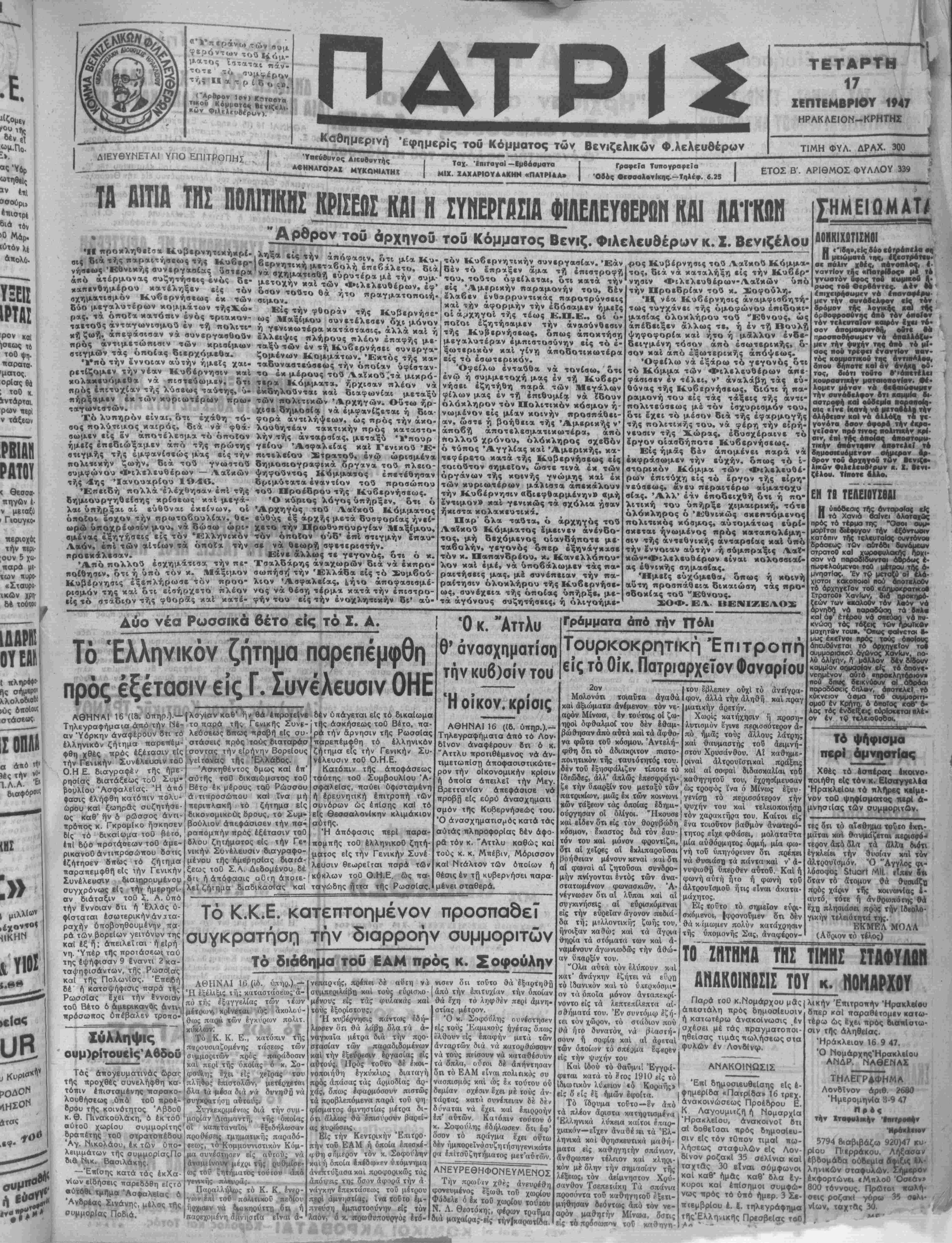< Θεσσα- πηγων έ¬ ν μεταξύ ι Γιουγκο· περιοχάς την περι- ;ουν 5 χο· παρά μϊ· των «υρο· «Σταυρθ' ικΛν χρη- δβ τούτον, Ι πληρ*»»1 ης σήμερον λλολοδιαΜ α ά«ό τή» )ίς την + Ί.Λ.Α. » (ΗΣ «Υπεράνω»» των συμ φερόντων τού Κόμ- ματος ίσταται πάν- τοτι .,το,, αυμνέρον » τ" ρ ί δ ο ι». ("Αρδρον 1ον) ΙΟταοτα τικοΰ Κόμματας Βεν κων Φιλελεύθερον). ΠΑΤ Δ1ΕΥΘΥΝΕΤΑΙ ΥΠΟ ΕΠΙΤΡΟΠΗΣ Κθβημερινή Ί;φημ£ρίς το0 Κόμματος των Βενιζελικών Φ.λελευθέρων 1 ΤΕΤΑΡΤβ 17 ΙΕΠΤΕΜΒΡΙΟΥ 1947 ΗΡΑΚΛΕΙΟΝ-ΚΡΗΤΗΣ ΤΙΜΗ ΦΥΛ. ΔΡΑΧ. 300 'Υπεόουνος Αιενβυντής Α·ΗΝΑΓΟΡΑΧ . * Ταχ. Ίπιταγα) —Εμβάσματα ΜΙΧ. ΖΑΧΑΡΙΟΥΔΑΚΗ* «ΠΑΤΡΙΑΑ» Γραφεία Τυπογραφκϊα Όβός θεσσαλονίκης.—Τηλέφ. 6.25 ΕΤΟΣ Β'. ΑΡΙΘΜΟΣ ΦΥΛΛΟΥ ΤΑ ΑΙΤΙΑ ΤΗΣ Π0Α1ΤΙΚΗΣ ΚΡ1ΣΕ0Σ ΚΑΙ Η ΣΥΗΕΡΓΑΣΙΑ ΦΙΛΕΛΕΥ8ΕΡ8Η ΚΑΙ ΛΑΐΚίΗ Αρθρον τού άρχηγού τού Κόμματος Βενιζ. ΦιΧεΧεν&ίρνν κ. Σ. Βενιζέλου ι λ*ϊξ« ·ίς την καΐ την αφορμήν την έοόοαμεν ημείς προκληθείσα σις διά νήσεως ά«ό ά χΛπενθημέρου βχηματισμόν 6ύο μεγαλυτέρων κομμάτων τήςΧώ ρας, τα όποϊα κατόπιν ενός τριακον- ως Μαξίμου συνετέλεσεν δ*ι α,ό'νον ταετούς ανταγωνισμού εν τή πολιτι- ή γ.νικωίέρα κατάστασίς,άλλά καί ή κή ζωίΐ, απεφάσισαν να συνεργασθούν έλλειψις πλήρους πλέον έπαφής με πρός αντιμετωπισιν των κρισίμων ταξύ των έν τή Κυβερνήσει σν?ν*ρ?£- βτιγμών τας οποίας διερχόμεθα. ζομένων Κομμάτων. Έκτός τής 2α"- •Υπο την έννοιαν αυτήν ημείς Χ«. ταδυναβτεύσεως την οποίαν ύφίσταν- ρετίζομεν την νέαν Κυβέρνησιν καίτο έκ μέρους τού Λαϊκοΰ;τά μικρό- κολ**ευόμεθα να πιστεύωμεν, ότι τερα Κόμματα, ήρχισαν πλέον νά πρός επιτυχίαν τής λύσεως ταύτης, ύ- έκδηλούνται καί διαφωνίαι μεταξύ πρω- των πολιτικών Άρχηγών. Ούτω ήρ¬ χισε δημοσία νά έμφανίζεται ή δια- «ήρξαμεν έκ των κυριωτέρων ταγωνιστών. Τό λυπηρόν είναι, ότι έχάθη τό- φορά αντιλήψεων, ώς πρός την άκο< σος πολύτιμοςκαιρός, διά νά φθά- λουθητέαν τακτικήν πρός καταστο- σωμενεις εν αποτέλεσμα τό οποίον λήν τής άνταρσίας, μεταξύ Υπουρ ημείς εηεδιώξαμεν από τής πρώτης γείου Ασφαλείας καί Γενικού Έ- βτιγμής τής εμφανίσεως μ"ας είς την πιτ&λείου Στρατοΰ, ένφ ωρισμένα πολιτικήν ζωήν, διά τού γνωστοΰ δημοσιογραφικά δργανα τού πλειο- ουμφώνου Φιλελευθέρας — Ααίκών ψηφούντος Κόμματος επετεθησαν τής 4ης Ίανουαρίου 1946. δριμύτατα εναντίον τού προαώπου Έπειδή πολλά "ελέχθησαν επί τής τού Προέδρου τής Κυβερνήσεως, δημιουργηθείσης κρίσεως καί μέγα- Ό κύριος λόγος υπήρξεν, ότι ό λαι ύπήρξαι αί εύθύναι έκείνων, οί Άρχηγός> τού Ααϊκοΰ Κόμματος