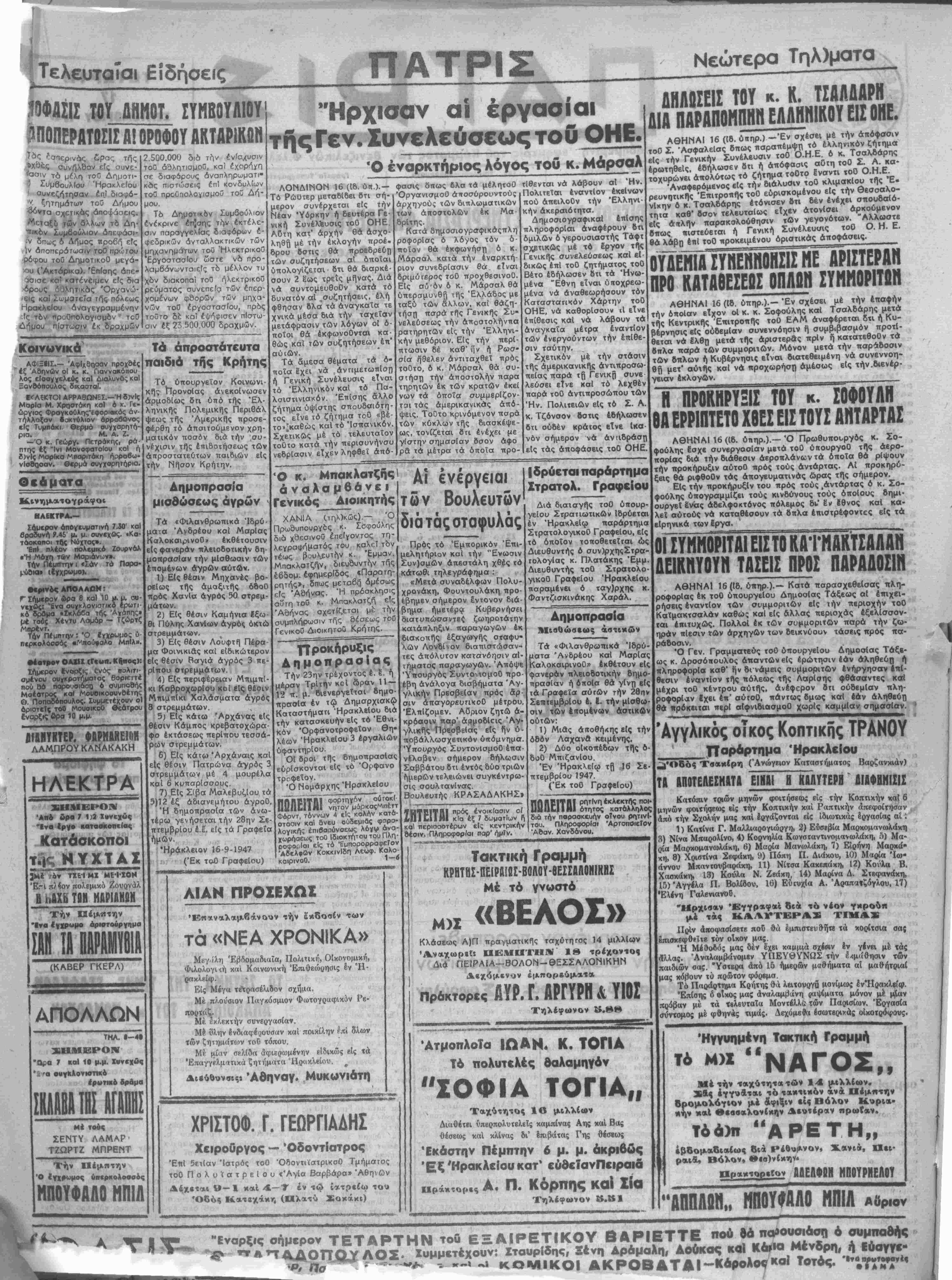 1) Μιάς άποθήι<ης ε(ς την οδόν Λαχανα κειμένης. 2) Δύο οικόπεδον της δ- δοθ Μπιζανίου. Έν Ηρακλείω τ{| 16 Σε¬ πτεμβρίου 1947. (Έκ τοθ Γραφβίου) Ι ότητος κατάλληλος διά την παρασκευήν οΤνου ρητινΙ- του. Πληροφορίαι ΆρτοπθιεΓον Άδαν. Χανδάνου. Τακτική Γραμμή ΚΡΗΤΗΣ·ΠΕΙΡΑΙι1Σ·ΒΟΛΟΥ·6ΕΣΣΑΛΟΝΙΚ1ΙΣ Μέ τό γνωοτό . «,.,»,^^ , ""«Γ,βΒΕΑθΣ» Κλάσεως Α)Π τΐραγματικής ταχύτητος 14 μιλλΐων ΆναχωρεΙι ΠΕΜΠΤΗΝ 18 τρέχοντος Διά ΠΕΙΡΑΙΑ—ΒΟΛΟΝ-ΘΕΣΣΑΛΟΝΙΚΗΝ , Δεχόμενον έμπορεύματα πΡ6κτοΡ£ς ΑΥΡ. Γ. ΑΡΓΥΡΗ & ΥΙΟΣ Γ«.· Τηλέφωνον £ •Ατμοπλοΐα ΙΩΑΝ. Κ. ΤΟΓΙΛ Τό πολυτίΛύς θαλαμηγόν "ΣΟΦίΑ ΤΟΓΙΑ#Ι Ταχύτητος 1β μιλλίων Διαΰβτει ΰπερπολυτβλεΐς καμπίνας Αης καί Βας θέσεως καΐ κλίνας δι9 επιβάτας Γης θέσεως * Εκάστην Πέμπτην 6 μ. μ. ακριβώς Έξ Ηρακλείου κατ' ευθεϊανΠειραιά Α. Π. Κόρπης κα! Σία Τηλέφωνον &.Η1 Ήγγυημένη Τακτική Γραμμή Τό Μ>Σ "ΝΑΓΟΣ,,