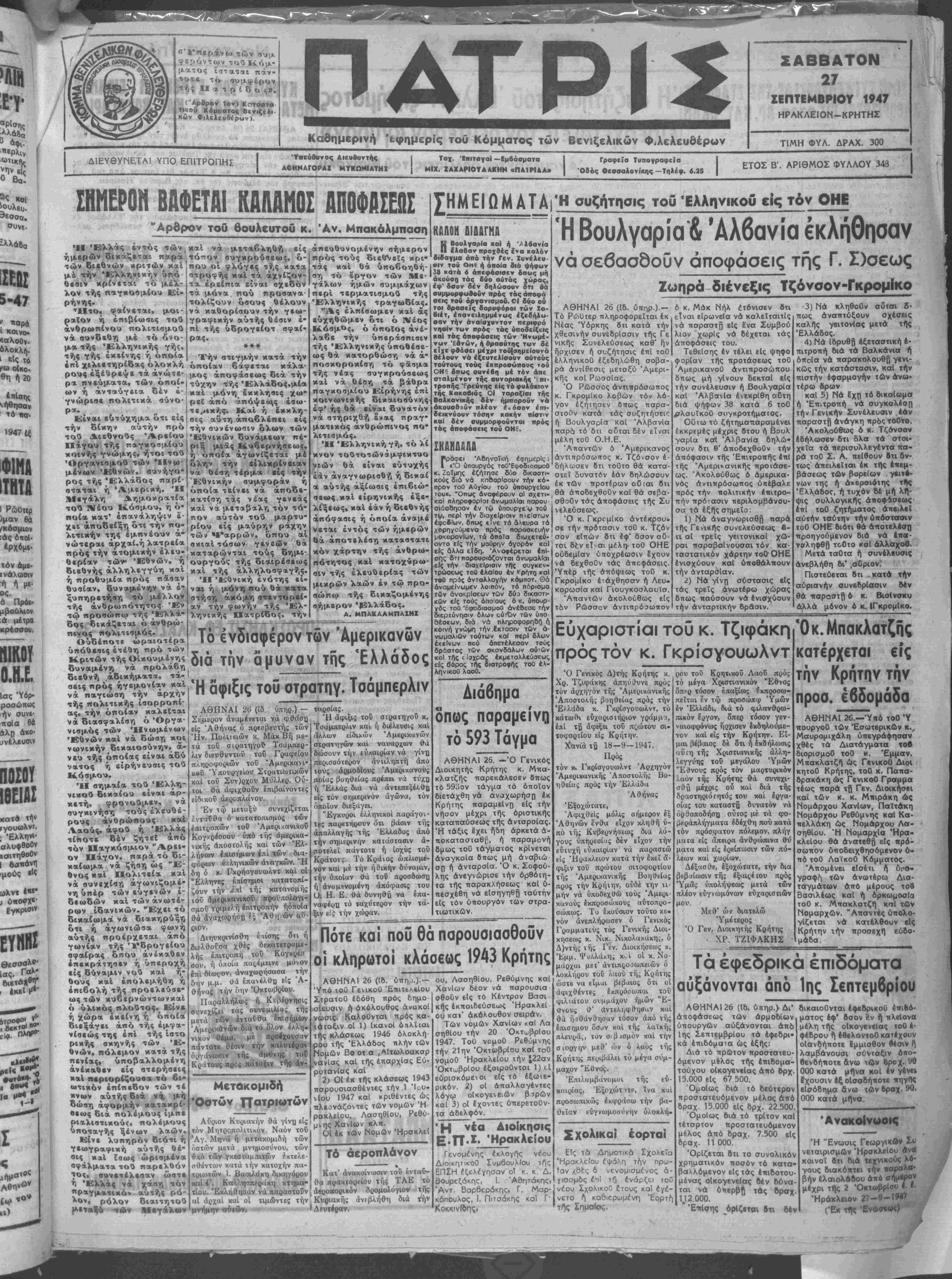 ράν: Επετεύχθησαν < ϊσως διά πρώτην φοράν είς λαϊκήν αγοράν ΙκανοΓτοιητικαΙ τιμαί των έν λόγφ εΐδών. Κατά την διάρκειαν τής ά¬ γοράς τιαρηχολούθησβν με¬ τά μεγάλου ένδιαφέροντος την διεξαγωγήν αυτής 6 πρω τοστατήσας διά την ΧδρυσΙν της Πρόεδρος τής κοινότητος κ. Κωνστ. Κατσιφάρης, 6 ο¬ ποίος είναι δξιος παντός έ- παΐνου διά τάς προσπαθείας τού ταύτας. Πρόσκλησις Γεν. Συνελεύσεως Μή γενομένης άπαρτίας κατά την παρελθούσαν Κυριακήν 21 τοεχ. καλοΓνΓαι καί αίδΗς τα μέλη των Συνδέσμων Έμπορο πανΐοπωλών καί Παντοπωλών Ηρακ' ε.ου,είςγενικήν συνέλευσιν την προσέχη Κυριακήν 28 ην τρέχ. καί ώραν 10 π. μ. βίς την αίθουσαν τού Έπαγγελματικου καί Βιοτεχνικοΰ Έπιμβλητηρίου μέ θέματα : 1) Ή ένότης τής τάξεως καί 2) Λήψις αποφάσεως διά την διενέργειαν αρχαιρεσιών, "Ηράκλειον 26-9-47 Οί Πρόεδροι Γ. ΨΑΡΟΥΔΑΚΗΣ Γ. ΚΑΛΑΪΤΖΑΚΗΣ Οί Γεν. Γρο-μματεϊς ΝΙΚ. ΚΑΡΑΝΙΚΟΛΑΟΥ ΜΙΧ, ΙΑΤΡΑΚΗΣ ΙΗΤΕΙΤΑΙ λυκλινικήν. κόμος είς την Πό- ΑΠΟΛΛΩΝ ' 'Λ ΤΜΑ. 1-4· ΣΗΜΕΡΟΝ *Ωρα 7 καΙ 10 μ.μ. Χ»νεχ6ς "Ενα άριστοΰργημα παρ¬ μένο άπό την Αντίστασιν των ΦιλιππΙνων άνταρτών ΗΠΑΤΑΑΗ Προσεχώς Νεώτερα Τηλ)ματα 8 ΚΥΡΟΙΙΣ ΤΩΝ ΣΥΝΘΗΚ». Ε1ΡΗΙ1ΗΓ Ι1ΕΤΑ ΤΗΣ ΙΤΑΛΙΑΣ ΚΑΙ ΒΟΥΛΓΑΡΙΑΣ ΑΘΗΝΑΙ 26 (18. ύπηρ.).— Καθ* υπαρχούσας ηληρο- φορΐας πρόκειται νά συνέλθη έντός των ημερών ή επί των έξωτερικων^Κοινοβουλ.ευτική έπιτροπή διά τή> κύρωοιν των