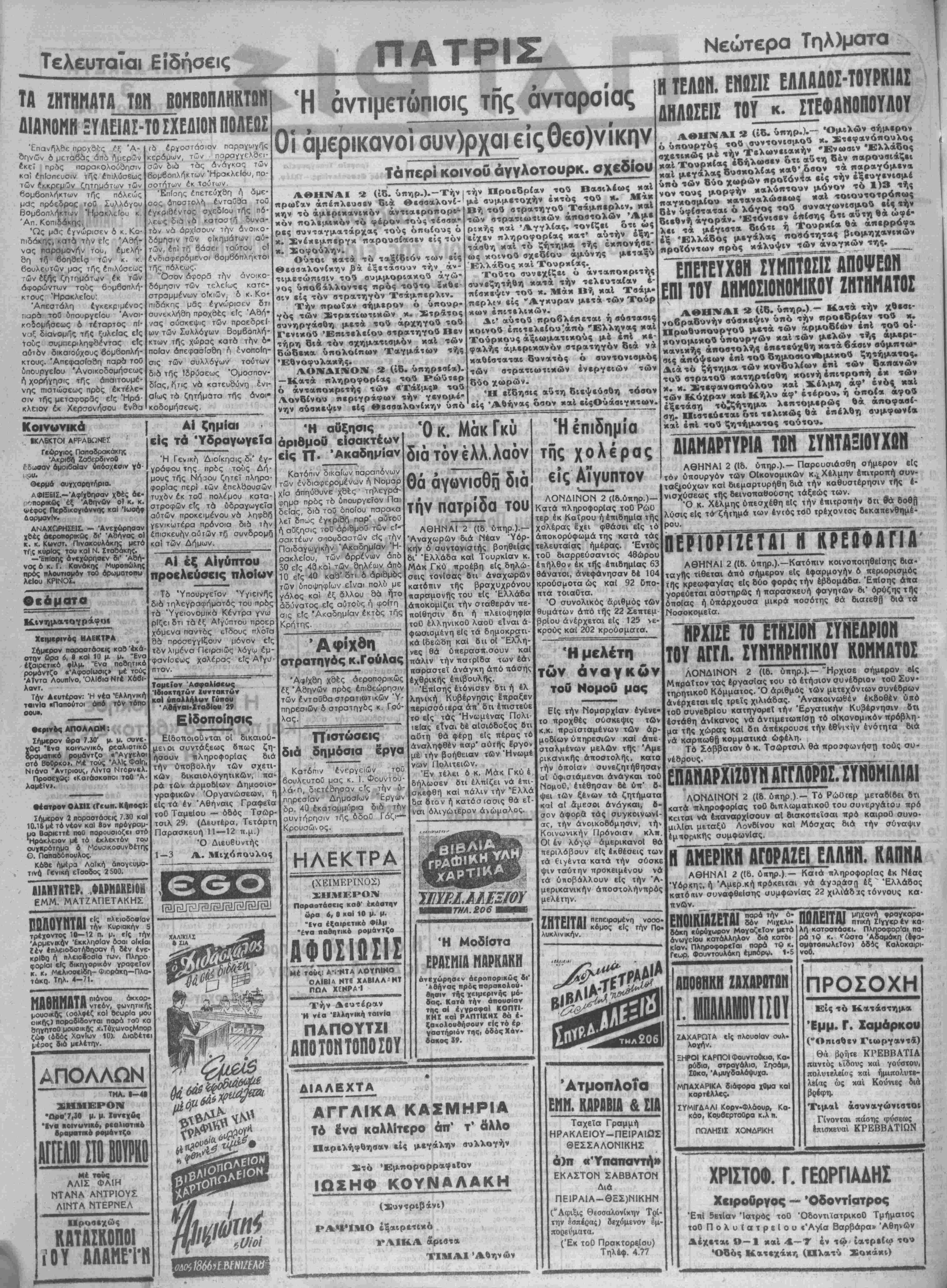 ΛΘΗΝΑΙ » (ίο. ύπηρ.)- Κ*τ<χ την νοβραδυνήν βθβκεψιν ύ«ό τί,ν «ρο·δρί»ν τού κ. Πρωθυπουργού μι·τ» των αρμοδίων επί τού οί- κονομικού υπουργών κ*1 των μελών τ»,ς αμερι- κανικης άποβτολης έπετβυχθη κ»τά βάσιν σύμπτω- οις άπόψεων επί τοθ δημοβΐον*μακού ζητήμαιτος. Διά τό ζήτημ* των κονβυλίων επί των δατιανών το« βτρατθθ κ»τηρτ£αθη κοινή έπιτροπή εκ των κ. κ. _ίτ·φ*νο«ουλου κ*1 Χέλμη *φ· ένό^ **1 των Κ.όχρ<*ν καιΐ Κήλυ άφ» ετέρου, η οποία *φο·» έξετάβη τ6.ζή·ϊηιΐι* λεπτομερώς θά αποφασί¬ ση. Ηιστεύεται δτι τελικώς θά επέλθη ουμφωνία κ»1 έηΐ τού ζητημ,οιτος τούτου. _____ ΰΙΑΜΑΡΤΥΡΙΑ Τ0Ι1 ΣΪΗΤΑ5Ι0ΥΧ8Η ΑΘΗΝΑΙ 2 (Ιδ. ύτιηρ.).— Παρουσιάσθη σήμερον βΐς τόν υπουργόν των ΟΙκονομικών κ.^Χέλμην έπιτροπή συν- τσξ|θύχων κσί διεμαρτυρήθη διά την καθυστέρησιν τής έ- νισχύσεως τής δεινοπαθοθσης τάξεως των. Ό κ. Χέλμης υπεσχέθη είς την επιτροπήν δτι Λ* δοθβ λύσις είς τό- ζήΐημά των ένιόςτθθ τρέχονϊος δεκοητενθημέ- ρου. ΠΕΡΊΤΡΙΙΕΤΑ1 π ΚΡΕΟΦΑΓΙΑ ΑΘΗΝΑΙ 2 (Ιδ. ύπηρ,).—Κατόπιν κοινοποιηθεΐσης βια·· ταγής τίθεται άπό σήμερον είς εφαρμογήν ό περιορισμός τής κρεωφαγΐας είς βύο φοράς την έβδομάδα. ΈπΙσης άπα γορεύεται αυστηρώς ή παρασκευή φαγητών δι' όρύζης τής οποίας ή ύπάρχουσα μικρά ποσότης θά διαιεθή διά τα Νοσοκομεΐα. "ΗΡΧΙΣΕ ΤΟ ΕΤΗΣΙΟΝ ΣΥΗΕΔΡΙΟΗ ΤΟΥ ΑΓΓΛ. ΣΥΗΤΗΡΗΤ1Κ0Τ ΚΟΜΜΑΤΟΣ ΛΟΝΔΙΝΟΝ 2 (15. ύπηρ.).— "Ηρχισε σήμερον βίς Μηράΐτον τάς εργασίας τού ΐό ετήσιον συνέδριον τοθΣυν τηρητικοθ Κόμματος. Ό άριθμός των μετεχόνιωνσυνέβρων άνέρχεται είς τρείς χιλιάδας. Ανακοινωθέν εκδοθέν υπό τοθ συνεβρΐου κστηγομεΧ την Εργατικήν Κυβέρνησιν δτι έστάθη άνΐκανος νά αντιμετωπίση τό οικονομικόν πρόβλη- μα τής χώρας καί δ τι απέκρουσε την εθνικήν ένόΐηΐα Βιά νά καρπωθή κομματικά ώφέλη. Τό Σάββα.ον ό κ. Τσώρτσιλ θά προ^φωνήση τούς συ- νέδρους. ΕΓιΤπΑΡΧΙΙΙϊΗΑΓΓΛΟΡΟΣ. ΣΥΝΟΜΙΛ1ΑΙ ΛΟΝΔΙΝΟΝ 2 (Ιδ. ύτιηρ.).— Τό Ρώθΐερ μεταβΐδει δΐι κατά πληροφορίας τοθ διπλωμαΐικοθ τού συνεργάτου πρό κείται νά έπαναρχΐσουν αί διακοπείσαι πρό καιροθ συνο- μιλΐσι μεταξύ Λονδίνου καί Μόσχας διά την σύναψιν έμτιορΐκής συμφωνίας. πΤπΕΡΙΚπ ΑΓΟΡΑΖΕΐ ΕΑΛΗΒ. ΚΑΠΝΛ ΑΘΗΝΑΙ 2 (16. ύπηρ.).— Καιά πληροφορίας έκ Νέας "Υόρκης, ή Άμερ.κή πρδκεΐται νά άγοοάσ[| έξ " "Ελλάδος κατόπιν συναφθβΐσης συμφωνίας 22 χιλιάδας τόννους κα· πνθν. ___________________________ ΕΝΟΙΚΓΑΖΕΤΑΙ %? Ζ£ δάκη «ύρύχωρον Μαγαζείον μετά άνωγεΐου κατάλληλον διά κατοι κΐαν. Πληροφορίαι πορά τ κ. Γεωρ. Φουντουλάκη έμπορν· 1*5 ΑΟΟΒΗΚΗ ΖΑΧΑΡΟΤΟΗ Τ. ΖΑΧΑΡΩΤΑ είς πλουσίαν ουλ- λή ΞΗΡΟΙ ΚΑΡΠΟΙ Φουντοθκια, Κα· ρύδια, στρογάλιο, Σησάμι, Ιθκσ, Άμυγδαλόφυχα. ΜΠΑΧΑΡΙΚΑ διάφορα χθμα καί κορτέλλες. ΣΥΜΙΓΔΑΛΙ ΚορνΦλόουρ, Κα- κάο, Κουβερτοθρα κ.λ ι*. ΠΩΛΗΣΙΣ ΧΟΝΔΡΚΗ ΠΟΛΕΙΤΑΙ πΓήνΓ.γΥερ^: λή κοτοστάσο. Πληοοφορ'αι π<3· ρά ι κ. χ-ώοτα Άδαμάκη (·φα- ομβτοιΐυλεΤον) 6δός Καλοκαιρι- νού. ΠΡΟΣΟΧΗ Εις τό Κ.*τάοτημα Έμμ. Γ. Σαμάρκου ("Οπισθεν Γιωργαντά) Θ« βρήϊβ ΚΙΈΒΒΑΤΙΑ παντός ιΐδους καί γούστου, πολυτελβίσς καί ήμιπολυτε- λΐ ώς κα'ι Κούνιες διά Τιμαί ά,αυνα,γώνιβιοι Γίνονται πάοης φύσεως ΙπισχβυαΙ ΚΡΕΒΒΑΤΙΩΝ ΧΡΙΣΤΟΦ. Γ. ΓΕΩΡΓΙΑΔΗΣ 1 Χβιροθργος — ΟδοντΙατρος Επί δετΐαν Ίατρός τοθ ΌδοντιίατρικοΟ Τμήματος τοθ Π ο λ υ £ α τ ρ ε Ι ο υ «Άγία Βαρβάρα» Αθηνών Δέχετχι 9-1 Μ«ΐ 4-Τ έν τώ ιατρείω τού Όβός Κατεχάκη (αλατύ Σοκάκι)