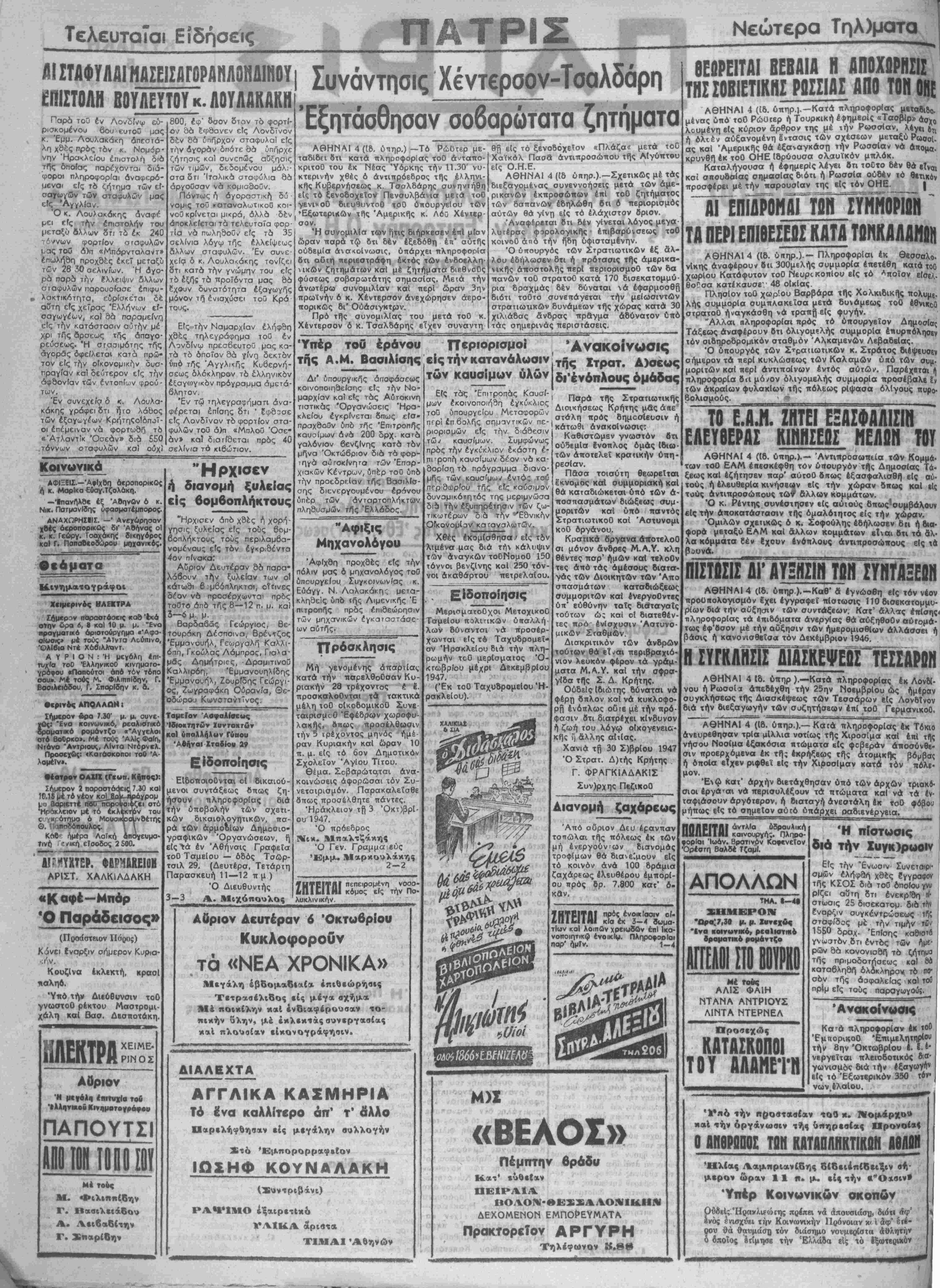 '*& -·<7β- Α ·* ;* * -ί · *Γ +ν* ■■ ^••■Λ* '■■■? «ΒΕΛΟΣ» Πέμπτην βράδιι ♦ ευθείαν .» ΔΕΧΟΜΕΝΟΝ ΕΜΠΟΡΕΥΜΑΤΛ )ΐρακίορ€ϊον ΑΡΓΥΡΗ , .. Τηλέφωνον £ ϊ ν^Λ* Τ Α ΠΕΡΙ ΕΠΙΘΕΙΕΒΙΚΛΤΑ Τί ΗΚ ΑΛΛΗί» ΑΘΗΝΑΙ 4 (16. ύπηρ.).-- Πληροφορίαι έκ Θβσσολο.: νίκης άναφέρουν διι 300μελής συμμορία επετέθη κατά τοθ ! χωρίου Κατόφυτον τοθ ΝευροκοπΙου είς τό Α^οϊον εΐσελ.ί βο?σσ κατέκαυσεν 48 οΐκΐας. : Πλησίον τοθ χωρίου Βαρβάρα τής Χολκιδικής πολυμε.Ι λής συμμορία συμπλακεΐσα μετά δυνάμεως τοθ έθνικοθ1 στρατοθ ηναγκάσθη νά τρσπή είς φυγήν. ι "Αλλαι πληροφορίαι πρός τό υπουργείον Δημοσίας- Τάξεως άναφέρουν 6τι όλιγομξλής συμμορία έπυρπόληθΕ»; τόν σιδηροδρομΐκόν σταθμόν Άλκαμενών ΛεβαδεΙας. : Ό ύπουργός των Στρατιωτικών κ. Στράτος διέψςυοενί σήμερον τα τιερΐ κυκλώσεως των Καλαμών ύκό των συμ·! μοριτών καί περί άντιποίνων έντός αυτών. Παρέχβτοι γ"| πληροφορίαι δα μό^ον όλιγομελής συμμορία προσέβαλβ ϊι των άκραΐων φυλακΐων τής πόλεως ρΐψασα ολίγους πυρο βολισμους. ~ ! ΤΟ Ε.Α.Η. ΖΗΤΕΙ ΕΞΑΣΦΑΛΙΣΙΝ ! ΕΛΕΥΘΕΡΑΣ ΚΙΝΗΣΕΩΣ ΜΕΛΩΗ ΤΟΥ ΑΘΗΝΑΙ 4 (Ιδ. ύπηρ.).— Άντιπροσωπεία των Κομμά·; των τοθ ΕΑΜ επεσκέφθη τόν υπουργόν τής Δημοσίας Τά«- ξεως καί εζήτησεν τταρ' αύτοθ διτως εξασφαλισθή είς αύ·| τούς ή ελευθερία κινήσβ<*ν είς την χώραν 5κως καί είς! τοΰς άντιπροσώπους τώ# δλλων κομμάτων. Ό κ. Ρέντης συνέστησεν είς αύιούς δπως'συμβάλουν είς την άηοκατάστασιν τής ομαλότητος είς την χώραν. Όμιλών σχετικώς ό κ. Σοφούλης εδήλωσεν δα ή δια- φορά μεταξύ ΕΑΜ καί άλλων κομμάτων είναι δτι τα σλ· λα κόμματα δέν ίχουν ένόπλους άντιπροσώπους είς λο>