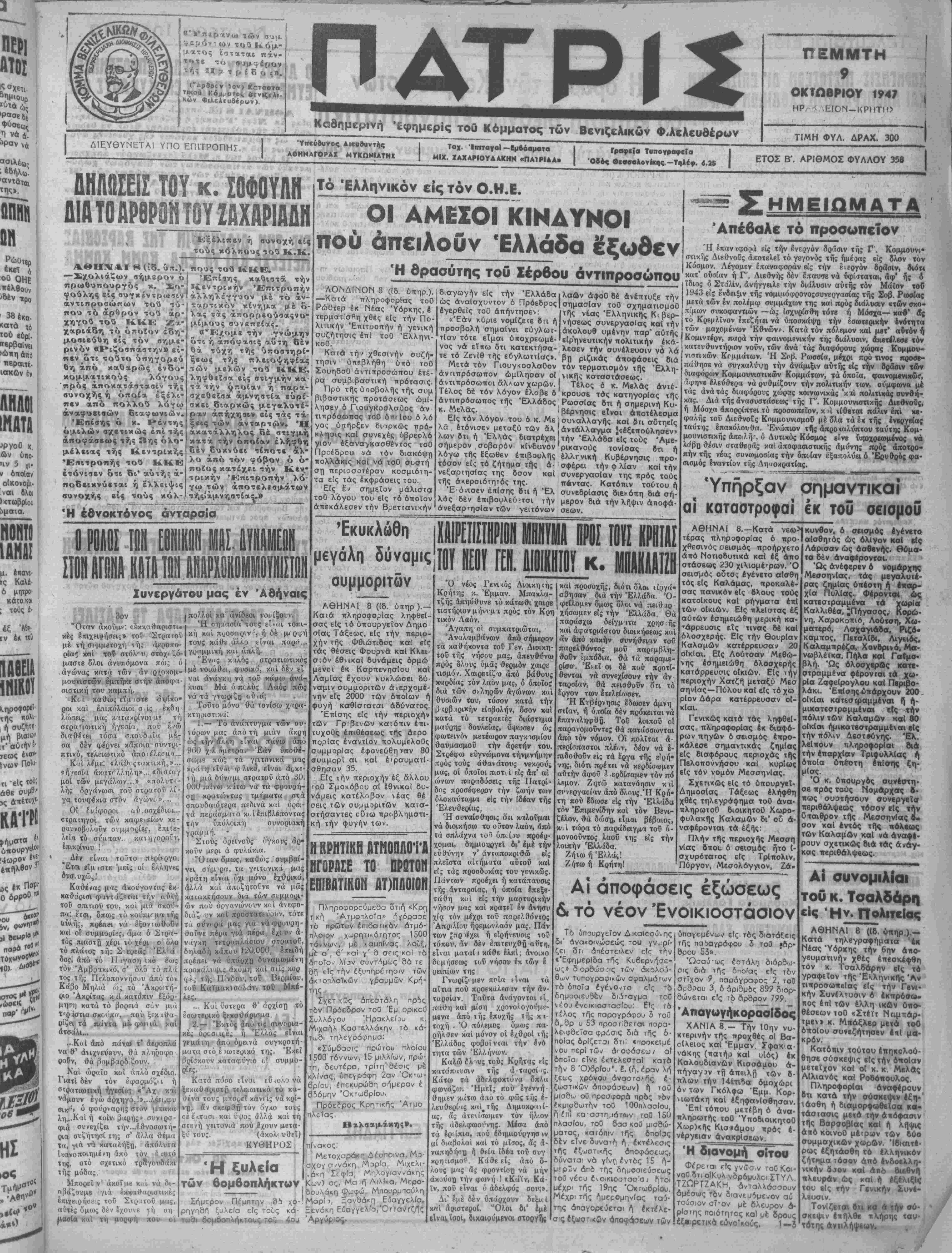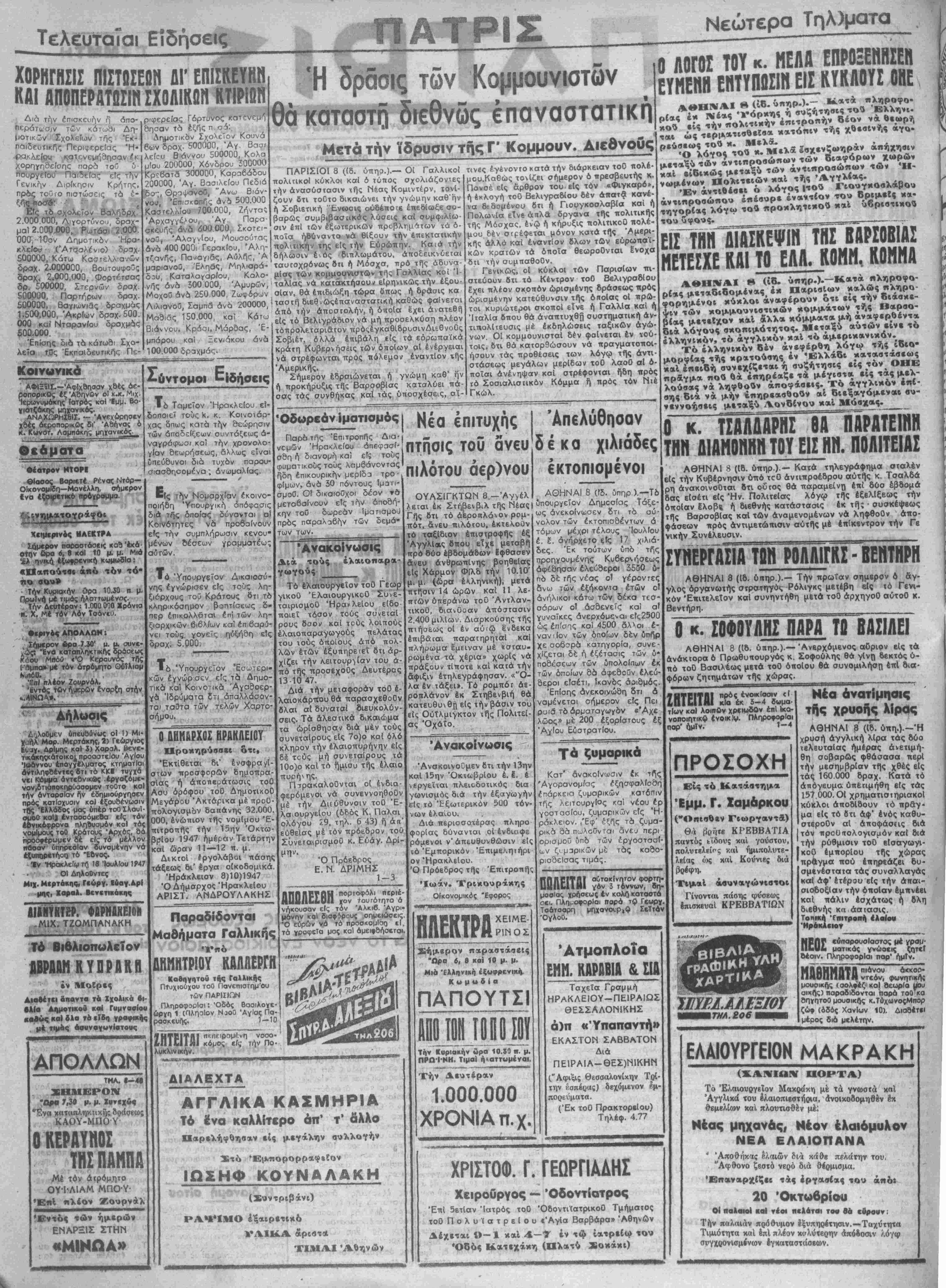 μ. μ. (ώρα έ<.ληνική), μετά πτήσιν 14 ώρών καί 11 λε¬ πτόν υπεράνω τοΰ Άντλαν- τικοθ, διανΰοαν απόστασιν 2.400 μιλΐων. Διαρκούσης τής πιήσεως οί έν αύ<ώ ϋνοεκα έπιβάιαι παρατηρήται καί ιΐλήρωμα έμειναν μέ «σταυ- ρωμένα τα χέρια» χωρΐς νά πράξουν τΐποτε καΐ καΐά την α.φιξΐν έτηλεγράφησαν. «"Ο¬ λα έν τάξει». Τό ρομπόΐ άε¬ ροπλάνον έκ Στηβενβιή θά κατευθυνθή είς την βάσιν τού είς Ούΐλμιγκτον τής Πολιτεί- ας Όχάΐο. Ανακοίνωσις Ανακοινούμεν δτι την 13ην καΐ 15ην ΌκταβρΙου έ. ί. 6 νεργεααι πλειοδοτικός δια γωνισμός διά την εξαγωγήν είς τό "Εξωτερικόν 500 τόν¬ νων ελαίου. Διά περισσοτέρας πληρο φορΐσς δύνανται οί ένδιοφε ρόμενοι ν" άπευθυνθώσιν είς ιό Εμπορικόν Έπιμελητήρι όν "Ηρακλείου. Ό Πρόεδρος τής Έπιτροπής Ιωάν. Τρικουράκη; ΟΙκονομικός "Εφορος , ΗΛΕΚΤΡΑ ΧΕΙΜΕ- Ρ1ΝΟΣ Σήμερον παράστασις "ίίρα 6, 8 καΐ 10 μ. μ. **ΐά Έλληνική έξοφρενική. >ίν< Κ»μαδία ΠΑΠΟΥΤΣΙ ΗΜ.ΙΙΙΙΟΥ Την Κυριακην δρα 10.89 η. μ. ΠΡΩΊ'ΝΗ. Τιμαί ή*αττυμέναι. Την Δευτέραιν 1.000.000 ΧΡΟΝΙΑ π. χ. νολον των έκτοπισδέντων ά τόμων μέχρι τέλους "Ιουλίου έ. ί. άνηρχετο ςίς 17 χιλιά δες. Έκ τούτων υπό τής προηγουμένης Κυβερνήσεως αφέθησαν έλεύσεροι 3530 υ¬ πό δέ τής νέας οί γερόν τες ανω των έξήκοντα έτών οί άνήλικοι κάτω των δέκα τεσ- σάρων ο? άσοενεϊς καί αί γυναϊκες άνερχόμεναι εϊς2500 ώς έπίσης καΐ 4500 δλνοι έ¬ ναν ι Ιον των οποίων δέν δπήρ χε σο6ορ6 κατηγορία, συνε- χίζεται δέ ή έζέτασις των ύ· ποδέσεων των ίιηολοίπων έκ των οποίων 56 άφεθοϋν έλεύ- δεροι εΤσέτι, Ικανός άοιδμός. Έπίσης ανεκοινώθη δτι ά ναμένεται σήμερον είς Πει ραΐ<5 τό άρματαγωγόν «Άχε λώος» μέ 200 έξορΐστους έξ "Αγΐου ΕΟστρατΙου. Τα ζυμαρικά Κατ' ανακοίνωσιν £κ τής 'Αγορανομ/ας ίξησφαλίοθη ίπάρκεια ζυμαρικων κατόπιν τής λειτουργίος καΐ νέου ίρ γοστασίου, ζυμαρικων είς Η¬ ράκλειον. ,Έφ' εξής τ6 ζυμα- ρικό δα πωλοϋνται ανεο περι ρ ρ ορισμοΰ υπό των έργοστσσΙ- α,ν ζιμπρικώνμέ ρισοεΐσας τιμάς. τάς κασο- ΠΠΠΡΙΤΠΙ αυτοκίνητον φορτη· 111Ι11Ι.11ΜΙ γόν 3 τόννων, δή, μοοΐας χρήσεως έν κσλβ κοταστά οει. Πληροφορίαι πορά τφ Γεωργ. Τσάτοαρη μπχοντχρ^ Σϊ,ϊτον Όγλοθ. Άτμοπλοΐα ΕΜΜ. ΚΑΡΑΒΙΑ & ΙΙΛ Ταχεΐα Γραμμή ΗΡΑΚΛΕίΟΥ-ΠΕίΡΑΙΩΣ ΘΕΣΣΑΛΟΝΙΚΗΣ ά)π «Υπαπαντή» ΕΚΑΣΤΟΝ ΣΑΒΒΑΤΟΝ Διά ΠΕ1ΡΑΙΑ-ΘΕΣ)Ν1ΚΗΝ ("Αφιςις θεσσαλονίκην Τρί¬ την ίσπέοας) δεχόμενον ίμ· πορευματα. (Έκ τοθ ΠρακτορεΙου) Τηλέφ. 4.77 ,'ΧΡΙΣΤΟΦ. Γ. ΓΕΩΡΓΙΑΔΗΣ ■' Χειροθργος — Οδοντίατρος % Επί δετΐαν Ίατρός τοθ ΌΒοντιίατρΐκοΟ Τμήμαΐος ί «οθ ΠολυίατρεΙου «Άγία Βαρβάρα» Αθηνών Αίχεται Ο—1 καί 41—1Γ έν τώ) ιατρείω ^ Λ *Οδός Κ.ατ»χάκη (Ολατ^ Σοκάκι) εΓς την πολιτικήν επιτροπήν δέον ν» θεωρή ώς τερμ*«9θεϊβ* κατόπιν της χθεβίνης «γο- β τού κ. Μ ε λ ά. , , , Ιόνος τού «. Μελδ δβχενζω*ιρ*ν ο1πηχηβ1ν άν«ηροβώπων των διαφόρων χωρών ξί ω ά^ι«ροβω«ων ,ώ, .Η- ϊ ίίδικώς μ.τοιξί» των ν ώμεν ών Πολιτειών κ α Ι •Εν άντΐθ4β·ι ί» λόγρς έ έ μ •Εν άντΐθ4β·ι ί» λόγρς |τοΟ ΓιουγκθβλαΡου άντιπροβώπου έπέβυρε έν·*τ«ον νού βριμεϊς κ«- τηγορίας λόγω <ο4 *ρο*ιλητ6*ο* ***· ^6ρ«βτι»ιο^ τού υφους. ^_________________. _.______ ΕίΣ"ΤΗΗΐΐΑΣΚΕΨΓΗ ΤΗΣΐΑΡΣΟΒΙΑΣ ΜΕΤΕΣΧΕ ΚΑΙ ΤΟ ΕΛΛ. Ιίθίΐί.. ΚΟΜΜΑ ΑΘΗΝΑΙ β (ίβ. ύι,ηρ.).~Ιε1*τα πληροφο¬ ρίας μεταδιδομένας έκ —*ριαΙων καλώς πληρα φορημένοι κύκλοι άνβιφίρουν δτι «ις την διάσκε¬ ψιν των κομμουνιστικήν κομμάτων τί,ς β«ρβο- Β£ ί 1 ίλλ* κόμμ*τ* μί «ναφερθίντ* Β£*ς μ·τ·ίχον κ»1 ίλλ* κόμμ*τ* μί. «ναφερθίντ* διά λόγους οκοηιμότητος. Μετβξύ πυτών ·ιν· τό ελληνικόν, τό αγγλικόν κ»1 τό οιμερικΛνικόν. Τό ελληνικόν βέν άνβφέρθη λόγω της ιοιο· μορφίας τής κρατουβης έν ·Βλλ*δι κατ