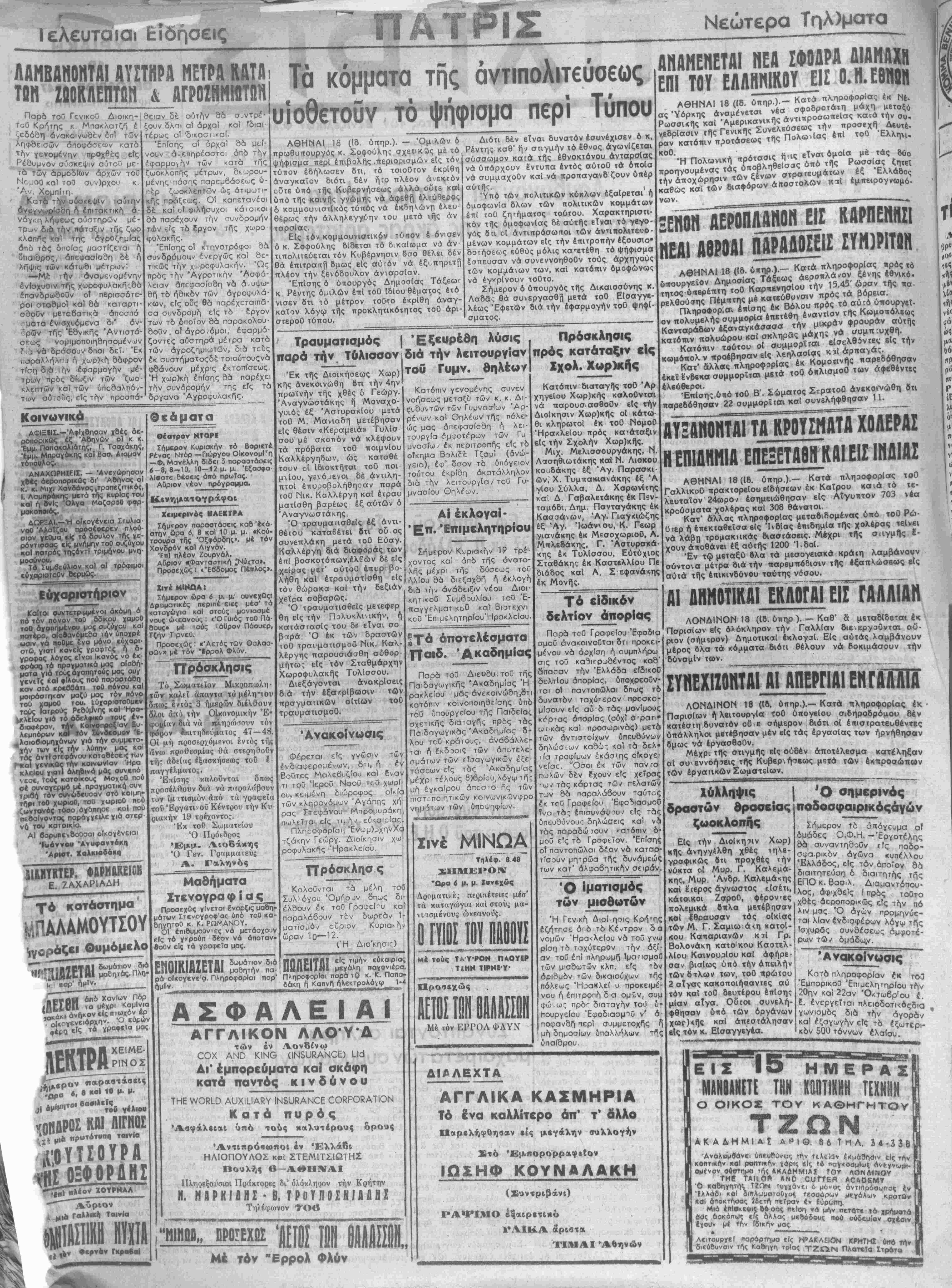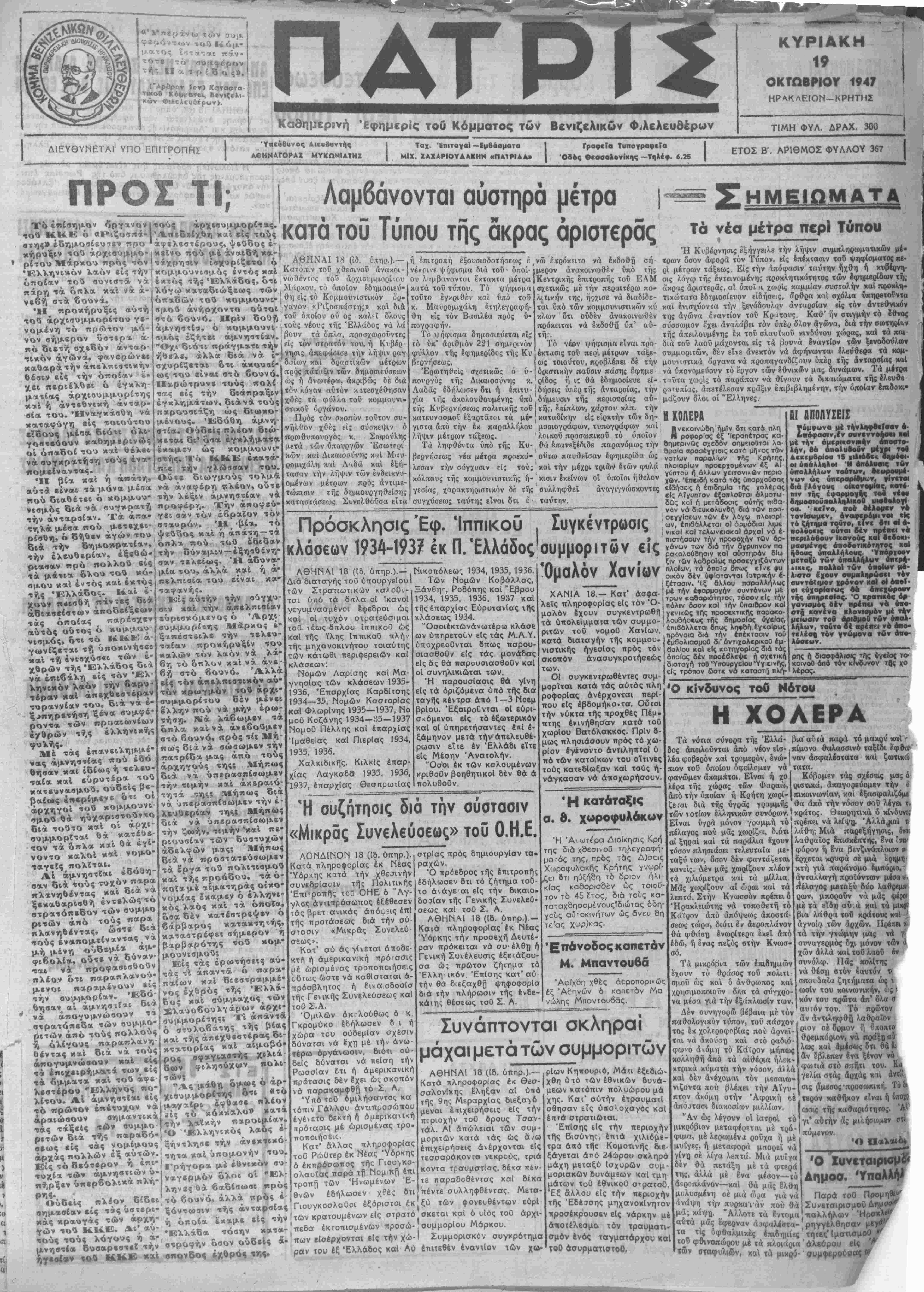 Κ6|η<βΤ6<, Βενιζελι¬ κήν Φιλελεύθερον). Καθηρερινή Εφημερίς τού Κόμματος των Βενιζελικήν Φιλελεύθερον ΚΥΡΙΑΚΗ 19 ΟΚΤΩΒΡΙΟΝ 1947 ΗΡΑΚΛΕΙΟΝ-ΚΡΗΤΜΣ ΤΙΜΗ ΦΥΛ. ΔΡΑΧ. 300 ΔΙΕΥΘΥΝΕΤΑΙ ΥΠΟ ΕΠΙΤΡΟΠΗΣ 'Υικύουνος Αιευβυντής ΑΦΚΝΑΓΟΡΑΧ ΜΥΚΩΝΙΑΤΗΖ Ταχ. ΊπιταγαΙ —Εμβάοματα ΜΙΧ. ΖΑΧΑΡΙΟΥΔΑΚΗ* «ΠΑ1ΡΙΛΑ» Γραφεϊα Τυπογραφ«Τα Όβος θεσσαλονίκης —Τηλέφ. 6.25 ΕΤΟΣ Β'. ΑΡΙΘΜΟΣ ΦΥΛΛΟΥ 367 όργανον ι τού ΚΚΕ ό «Ριζο««ά-| στής» εδημοσίευον κήρυξιν τού άοχιαυμμο-^κβΐνο πού ψεύδος ε- • ρίτου Μάρκου πρός τόν Ελληνικόν λαόν είς την οποίαν τού συνιστά- νά πάρη τα όπλα καΐ νά ά- νεβή βτα €ουνά. Ή προκήρυξις αυτή ίθύ άρχισυμμορίτου γε¬ νομένη τό πρώτον μό¬ νον σήμερον ΰστερα α- πό διετή βχβ,δόν άνταρ- τικόν άγώνα, φανερώνει καθαρατήν άπελπιστικήν Θέσιν είς την οποίαν £- χει περιέλθει ό έγκλη- ματίας άρχιουμμορίτης καί ή άντεθνβκή ανταρ- βία τού. Ηναγκάσθη νά καταφύγη είς τοιούτου εΐδους μέσα διότι ολι- γοστεύουν καθημερινώς οί όηαδοί τού καί θέλει να συγκρατηθή τούς ενα¬ πομείναντας. 7 Ι Ή βία καί η απατη, -„ Λαμβάνονται αύστηρά μέτρα τού Τύπου της άκρας άριστερας .— .ή επιτροπή έξουσιοδοτήσεως ένώ έιρόκητο νά έκδοθϋ σή ψηφισμα υπό τού κομμουνισμός "έντός καί Κατόπιν τού χθεσινου άνακοι-|νέχιΊνε ψηφισμα διά τού* όπθί-} έκτός τής Ελλάδος, ότι νωθέντος τοί> άρχισνμμορίτου ου λ «μβανονται έκτακτα μετρα