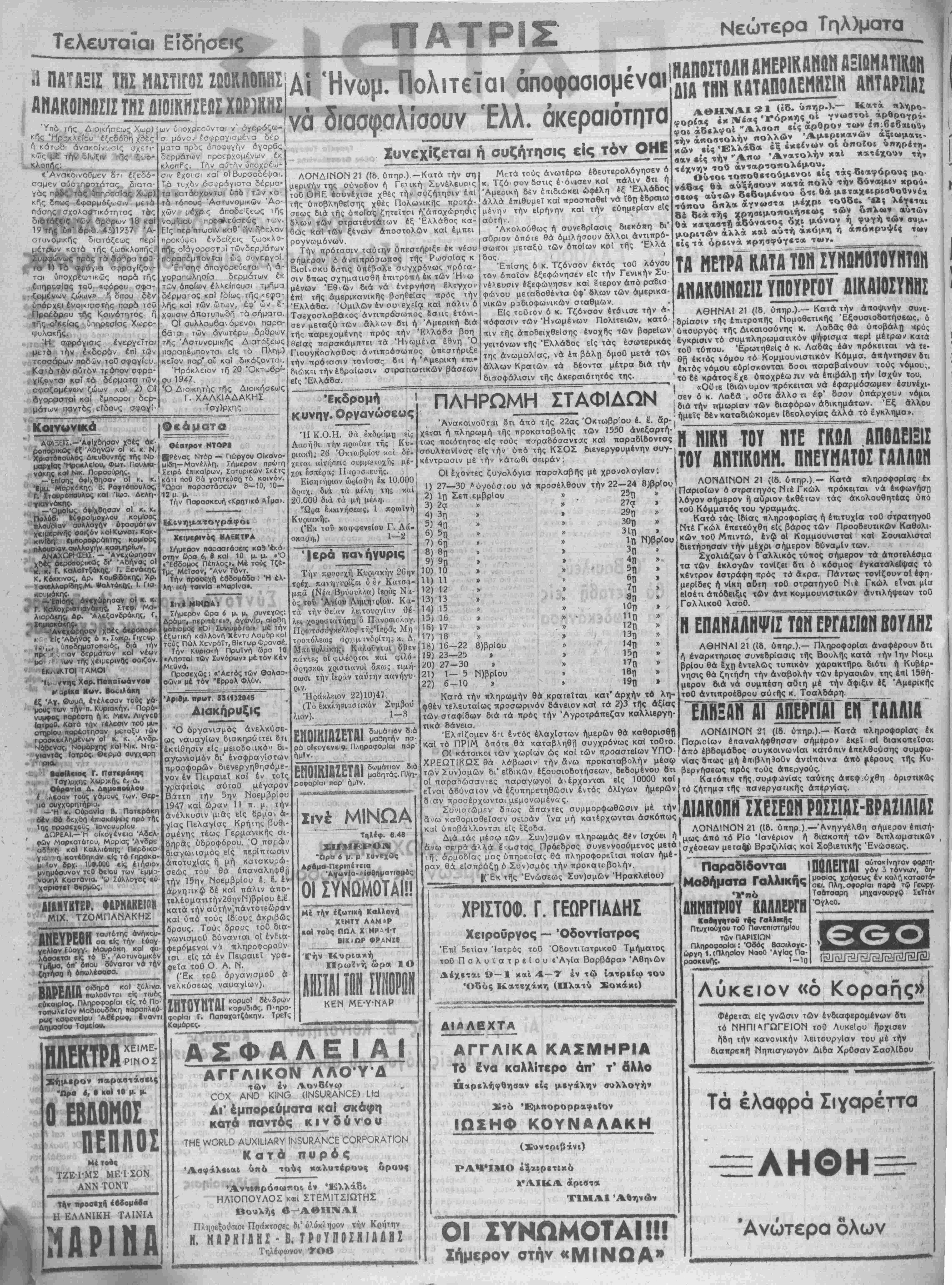 ίίνω σε;ρά άλλά ε<ι»στος Πρόεδρος συνεννοούμενος μβτά Λρμο&Ιας μσς ύπηρεοΐας θά πληροφορεΐχαι ποΐσν ημέ¬ ραν θά εΐσττράξη ό Συν)σμός την προκατοβολήν. |(Έκ τής Ενώσεως Συν)σμών Ηρακλείου) ' ΙΧΡΙΣΤΟΦ Γ. ΓΕΩΡΓΙΑΔΗΣ ■ ^ Χειροθργος — Όδοντίατρος Επί 5ετ.1αν Ίατρός τοθ ΌδοντιίατρικοΟ Τμήματος τοθ ΠολυιατρβΙου «ΆγΙα Βαρβάρα» Αθηνών Δέχεται 9—1 καΐ 4—Ύ έν τί*» ιατρείω , . Όδός Κατβχάκη (Πλαντύ Σοκάκι) Η ΕΠΑΗΑΑΗφΐΣ ΤΩΝ ΕΡΓΑΣΙΩΝ ΒΟΥΛΗΣ ΑΘΗΝΑΙ 21 ({δ. ύπηρ.).— Πληροφορίαι άνοφέρουν δτι ή έναρκτηριος συνεδρΐαοις τής Βουλής κατά την Ιην Νοεμ βρίου θά Ιχη εντελώς τυπικόν χαρακτήρα διότι ή Κυβέρ¬ νησις θά ζητήο*η την άναβολήν των εργασιών της επί 15θή- μερον διά νά συμπέση αυιη μέ την άφιξιν έξ Άμερικής τοθ άντιπροέδρου αυτής κ. Τσαλδάρη.______ ιμξανΤΓ^ρ^εΤΙαλλια ΛΟΝΔΙΝΟΝ 21 (ίδ. ύπηρ.).— Κατά πληροφορίας έκ Παρισίων έπαναλήφθησαν σήμερον έκεΐ αί διακοπείσαι < άπό εβδομάδος συγκοινωνΐαι κατόπιν έπελθούσης συμφω¬ νίας δπως μή έ(ΐιβ,η3οΟν άνιΐπθινα άπό |ΐέρους τής Κυ¬ βερνήσεως πρός τούς άτιεργούς. Κατόπιν τής συμφωνίας ταύτης άττεφ ύχθη οριστικώς τό ζήτημο τής πανεργαηκής άπίργίας. Δ1ΑΚ0ΠΗΙΧΕΣΕΟΗ Ρ0ΙΙΙΑΣ-ΒΡΑ1ΙΑ1ΑΣ Ι ΛΟΝΔΙΝΟΝ 21 (Ιδ. 6«ηρ ) —Ανηγγέλθη σήμερον επισή¬ μως άκό τό Ρίο Ίανέριον ή διακοπή των διπλωματικήν σχέσεων μεταβή ΒραζιλΙας κοί Σοβιετικάς Ενώσεως. Παραδΐδονται ΐΠίΑΕΙΤΑΙ Μαθήματα Γαλλικής ΠΗΜΗΐΡΙθΓκΑΛΛΕΡΓΗ Καοηγητοθ της ΓαΑΑικής Πτυχιούχου τοθ Πανεπιστημίου των ΠΑΡΙΣΙΩΝ Πληροφορίαι: Όδός Βαοιλογε- ώργη 1. (Πλησίον ΝαοΟ ΆγΙας Πά- ροοκευής. 1—1ο Δ1ΔΛΕΧΤΑ ;Α» · ΑΓΓΛΙΚΑ ΚΑΣΜΗΡΙΑ Τό «ίνα καλλίτερο άπ' τ* δλλο Παρελήφθησαν είς μεγάλην συλλογήν Χτό 'ΝΕμπορορραφεΙον ΙΩΣΗΦ ΚΟΥΝΑΛΑΚΗ , , (Συντριβάνι) ΡΑΨΙΜΟ 4ξαιρετΐκ6 ' ' '■ νΛΙ|_Α άριβτ» 1 ΤΙΜΑΙ ΟΙ ΣΥΝΩΜΟΤΛΙϋ! Σήμερον οτήν «ΜΙΝΩΑ" αυτοκίνητον φορη γόν 3 τόννων, δη· μοοΐας χρήσεως έν κάλι} καταστά· σει. Πλη^οοορΙαι ηαρά τφ Γεωργ. Τοδτοαρη μηχανουρϊφ ΙκΤτόν ΌγλοΟ. Λύκειον «ά Κοραής)* Φέρετσι είς γνώσιν των ενδιαφερομένων δτι τό ΝΗΠΙΆΓΩΓΕ1ΟΝ τοθ Λυκείου ήρχισβν ήδη την κανονικήν λειτουργίαν τού μέ την διαίΐρβ»ιί| Γίηττισγωγόν Διδα Χρθσαν ΣασλΙδου Τα έλαφρά Σιγαρέττα * >'