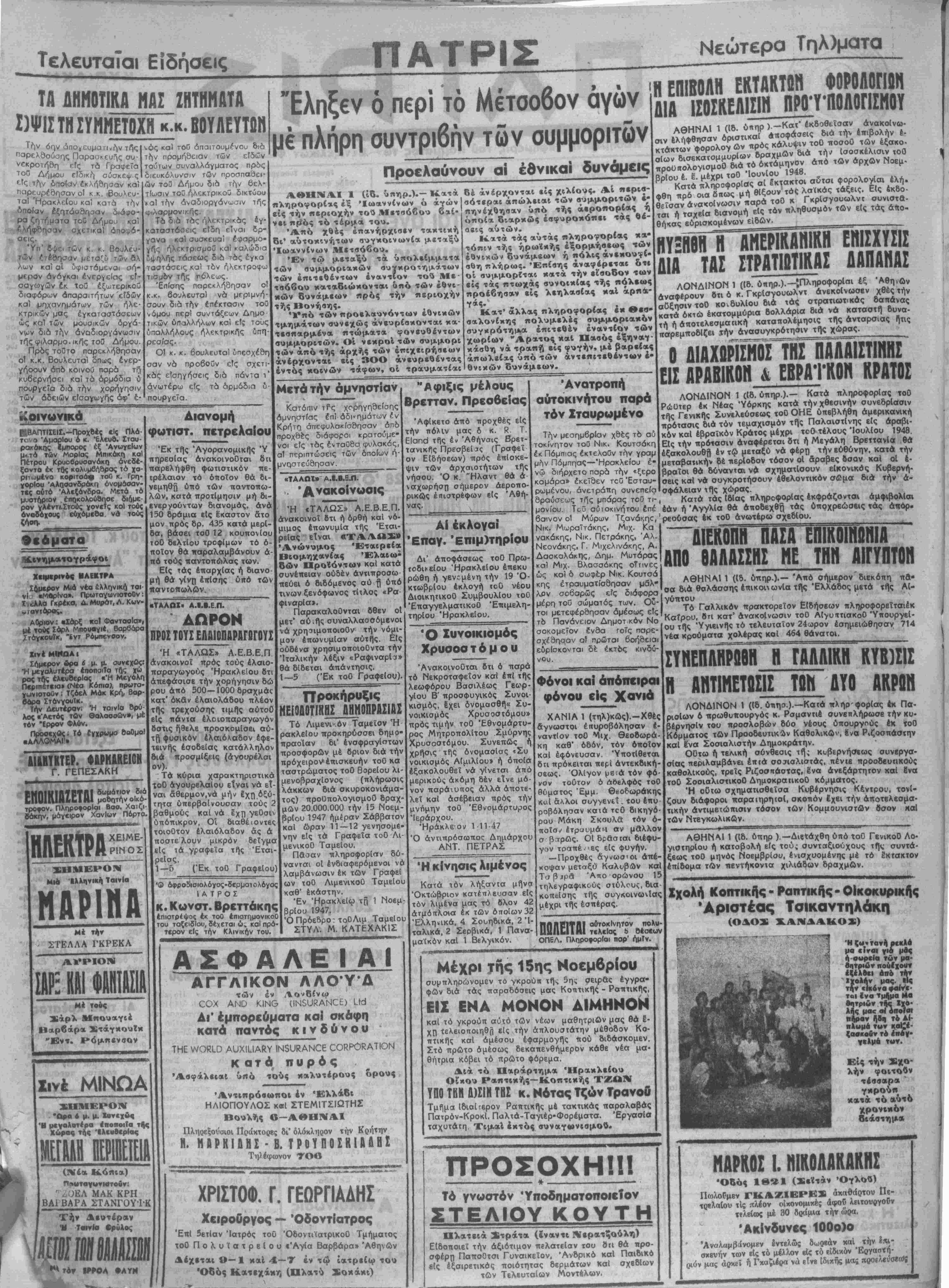 Ή <ΤΑΛΩΣ» Α.Ε.Β.Ε.Π. ανακοινοί βτι ή όρθή καί νό- μιμος έπωνυμΐα τής Έται- ρεΐας είναι «ΤΑΛΩΣ» Άνώνυμος Έταιρεία Βιομηχανίας Έλαιω- δών Προΐόντων καί κατά συνέπειαν ουδέν άντιπροσω πεύει ό βιδόμενος σύ ή υπό τίνων ξενόφωνος τίΐλος «Ρα- φιναρία». Παρακσλοθνται δθεν οί μετ* αύ.ής συναλλασοόμενοι νά χρησιμοτιοιοθν την νόμι- μον έπωνυμΐαν αυτής. Είς ουδένα χρησψοποιοθντα την Μταλικήν λέξιν «Ραφιναρί^» θά δίδεται απάντησις. 1—5 (Έκ τοθ Γραφείου). Προκήρυξις ΜΕίΟΰΟΤΙΗΗΣ ΠΗΜΟΠΡΑΣΙΰΣ Τό Λιμενΐ".όν Ταμείον Ή ρακλείου προκηρόσσει δημο¬ πρασίαν δι' ένσφραγΐπτων προσφορών μέ βριον διά την πρόχειρον* επισκευήν τοθ κα ταστρώματος τοθ θορείου λι- μενοβραχΐονος (πλήρωσις λάκκων διά σκυροκονιάμα- τος) προθπολογισμοθ δραχ- μών 20.000.000 την 15 Νοεμ- βρίου 1947 ημέραν Σάββατον καΐ ώραν 11—12 γενησομβ- νην είς τα Γραφεΐα τοθ Λι- μενικοθ Ταμείου. Πάοσν τιληροφορίττν δύ¬ νανται οί ένδιαφερόμενοι νά λαμβάνωσιν έκ των ΓραφεΙ ών τοθ ΛψβνικοΟ Ταμείου καθ" εκάστην. Έν Ήρακλείφ τη 1 Νοεμ¬ βριού 1947. Ό Πρόεδρο-τοθΛιμ Ταμείου ΣΤΥΛ. Μ. ΚΑΤΕΧΑΚΙΣ ΑΣΦΑΛΕΙΑΙ ΑΓΓΛΙΚΟΝ ΛΛΟΥΔ των έν Λονδίνω ΟΟΧ ΑΝΟ ΚΙΝΟ (ΙΝδυβΑΝΟΕ) ίτά ΑΓ έμπορεύματα καΐ σκάφη κατά παντός κ ι ν δ 0 ν ο υ ΤΗΕ ΑυΧΙίΙΑΚΥ ΙΝδυΚΑΝΟΕ ΟΟΚΡθβΑΤΙΟΝ κατά πυρός Άαφάλειαΐ δρο»«. Άντιπρόιωποι έν «Ελλάδι ΗΛ1ΟΠΟΥΛΟΣ κβΐ ΣΤΕΜΙΤΣΙΩΤΗΣ Βουλής β-ΑβΗΝΑΐ Πληρεξούσιοι Πράκτορβς δι' ολόκληρον την Κρήτην Ν. πηΡΚΙΟΣ -Β. ΤΡΟΥΠΟΣΚΙΗΗΪ Τηλέφωνον ΤΟβ ΧΡΙΣΤΟΦ. Γ. ΓΕΩΡΓΙΑΑΗΣ Χειροθργος — Όδοντίατρος Επί 5ετίαν Ίατρός τοθ ΌδοντιϊατρικοΟ Τμήματος τοθ Πολυ'ίατρείου «Άγία Βαρβάρσ» Αθηνών Αίχιχ&ι Ο—1 καΐ 4—Τ έν τώ ιατρείω τού Κατεχάκη (Πλ»"!) Χοχάχι) Αφίκετο άπό τιροχθές είς την πόλιν μας δ κ. Κ. Τ. ΕΙαηό τής έν Αθήναις Βρετ- τανικής Πρεσβείας (Γρσφεΐ όν ΕΙδήοεων) πρός επίσκε¬ ψιν των άρχαιοτήτων τής νήσου. Ό κ. "Ηλαντ θά ά νσχωρήση σήμερον άεροπο- ρικώς έπιστρέφων είς Άθή νας. ΑΙ εκλογαί Έπαγ. 'ΕΠΐμ)τηρ.ου Δι' αποφάσεως τοθ Πρω- τοδικείου Ηρακλείου έπεκυ ρώθη ή γενομένη την 19 Ό- κτωβρίου έκλογή ΐοθ νέου ΔιοικητικοΟ ΣυμβουλΙου τοθ ΈπαγγελματικοΟ Έηιμελη- τηρίου Ηρακλείου. Ό Συνοικιομός Χρυσοσ τ 6 μ ο υ Άνακοινοθται δτι ό παρά τό Νεκροταφείον καί έπ{ τής λεωφόρου Βασιλέως Γεωρ- γΐου Β' προσφυγικδς Συνοι- κισμός, εχει ονομασθή» Συ- νοικισμός Χρυσσστόμου» πρός τιμήν τοθ 'Εθνομάρτυ- ρος ΜητροπολΙτου Σμύρνης Χρυσοστόμου. Συνεπώς ή χρήσις τής όνομασΐσς «Συ νοικισμός ΑΙμιλίου» ή όποΐα έξακολουθεΐ νά γίνετσι άπό μερικούς άκόμη δέν είνε μό νόν παράιυπος άλλά άποτε λεΐ καΐ ασέβειαν πρός την μνήμην τοθ Έθνομάρτυρος Ιεράρχου. Ήρ&κλεον 1-11-47 Ό άντιτιρόσωπος Δημάρχου ΑΝΤ. ΠΕΤΡΑΣ Ή κίνησις λιμένος Κατά αόν λήξαντα μήνσ "Οκτώβριον κατέπλευσαν είς τόν λιμένα μας τό 6λον 42 άτμόπλοκι έκ των όΐΐοΙων32 Έλληνΐκά, 4 Σουηβικά, 2 Ί- ταλικά, 2 Σερβικά, 1 Πανα- μαίκόν καΐ 1 Βελγικόν. Χθ0 4ρχδν θήκας ευρισκομένων ΗΥΞΗΘΗ Η ΔΙΑ ΤΑΣ ΙΗΕΡίΚΑΝΙΚΗ ΣΤΡΑΤΙΩΤΙΚΑΣ ΕΝΙΣΧΥΣΙΣ ΔΑΠΑΝΑΣ 'Ανοτροπή αύτοκινήτου παρά τόν Σταυρυμένο Την μεσημβρίαν χθές τό αΰ τοκίνητον τού Νικ. Κουτσάκη έκ Πόμπιας έκτελοθν την γραμ μ^ν Πόμπηας—Ηρακλείου έ νώ διήρχετο παρά την «ξερο καμάρα» εκείθεν τού Έσταυ- ρωμένθυ, άνειράπη συνεπεία Θραύσεως τής μπ<5ρας τού τι- μονίου. Τοϋ αόΐοκινήτου έπέ βαινον οί Μύρων Τζανάκηο, Νικ. Μωραΐτάκης. Μιχ. Κα νακάκης, Νικ. Πετράκης, 'Αλ. Νεονάκης, Γ. Μιχελινάκης, Α. Δασκαλάκης, Δημ. Μυτάρας καΐ Μιχ. Βλασσόκης οΐτινες ώς κοι δ σωφέρ Νικ. Κουτσά κης ετραυματίσθησαν μδλ· λρν σοβαρώς είς δισφορα μέρη τού σώματός 