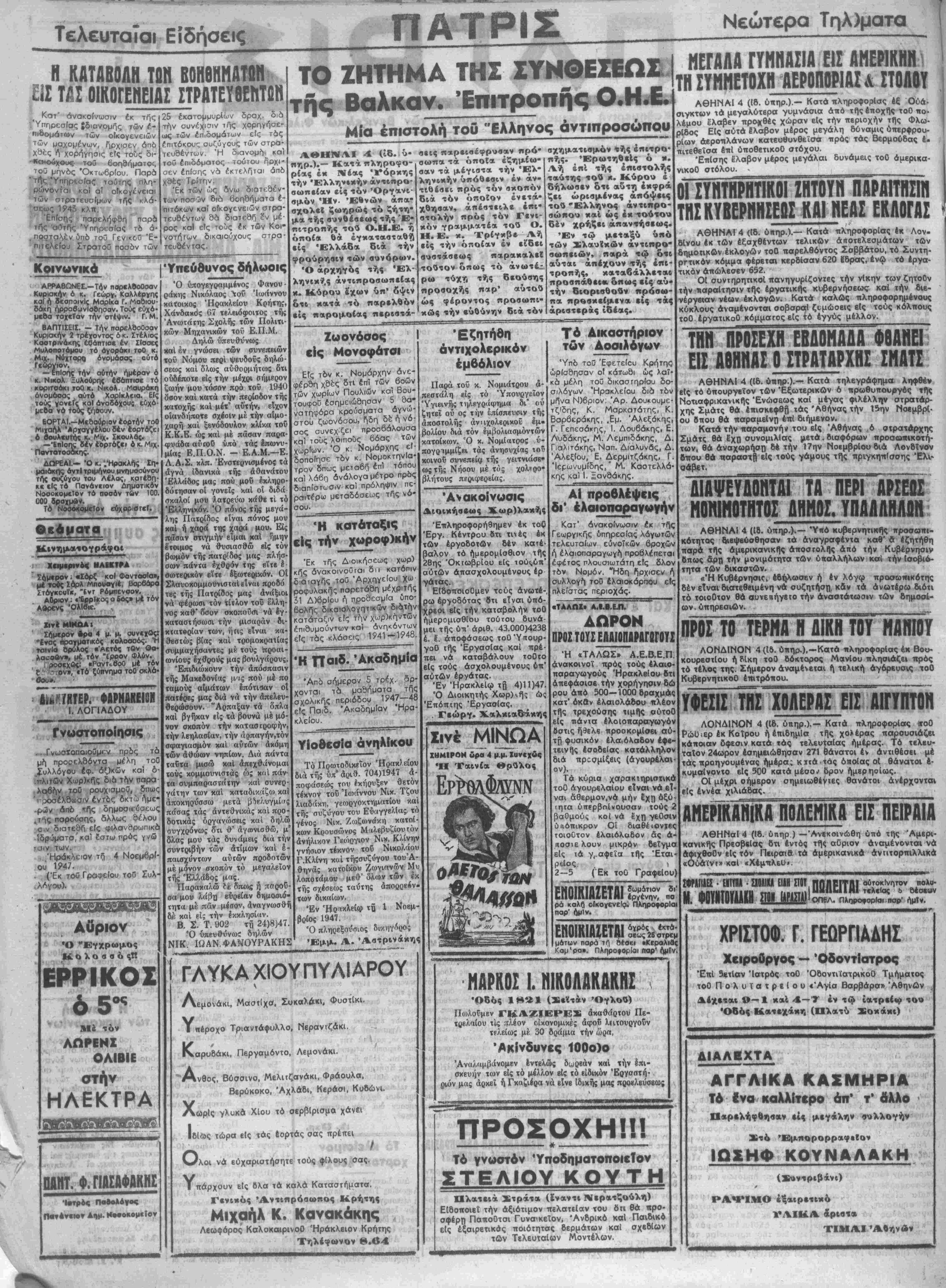 «Ή ΚυβέρνηοΐΓ» έθήλ<»σεν ή έν λόγφ προσωιιικότης οέν είναι διατεθβιμένη νά συζητήση, κδν τα ανωτέρω διότι τό τοιοθτον θά βυνεηήγειο την άναοτάτωοιν των δημοσί- ών ύπηρεσιών. ΠΡΟΣ ΤΟ ΤΕΡΜΑ Η ΔΙΚΗ ΤΟΥ ΜΑΓΠΟΥ ΛΟΝΔΙΝΟΝ 4 (15. ύπηρ.),—Κατά πληροφορίας έκ Βου- κουρεστΐου ή Ρίκη τοθ δόκτορος Μανίου πλησιάζει πρός τό τέλος της. Σήμερον άναμένεται ή τελική αγόρευσις ιοθ ΚυβερνητικοΟ έπιτρόπου. ΐίΐ^^ΙϊΙίΐ ΛΟΝΔΙΝΟΝ 4 (Ιδ. ύηηρ.).— Κατά πληροφορίας «τοθ Ρώϋίερ έκ Κοΐρου ή έτιιδημΐσ τής χολέρας πσρουσιάζει κάποιαν δφεσιν κατά «άς τελευταίας ημέρας. Τό τελευ¬ ταίον 24ωρον εσημειώθησαν 271 θάνατοι έν αντιθέσει μέ τάς προηγουμένας ήμέρα; κϊτά τάς οποίας οί θάνατοι έ· κυμαΐνοντο είς 500 κατάμέσο^ δρον ημερησίως. Οί μέχρι σήμερον σημειωθ4ν<ες θανάτοι άνέρχονται ε(ς έννέα χιλιάδας. ΑΜΕΡΪΚΑΗ.ΚΑ ΠΟΑΕΜΙΚΑ ΕΙΣ ΠΕΙΡΑΙΑ ΑΘΗΝαΙ 4 ((8. ύπηρ ) —Ανεκοινώθη υπό τής Άμερι- κανικής Πρεσβείας δτι έντός τής αυριον αναμένονται νά άφιχθοθν είς τόν Πειραια τα άμερικανικώ άνΐαορπιλλικά «ΟύάΐνΓ» καί «Χέμιτλεϋ». •^^νεΜΐιΐιΐΊΐΝν^εννηεσΜεΜ ΣΦίΙΙΙΐΑΕΣ · ΕΙ.ΤΑΑ · ΣΙΟλΙΚΑ ΕΙΔΗ ΣΤΟΤ ΠΟΙ,ΡΙΤΑΙ β^οκΐνητον ηολυ- Μ. Φ0ΥΝΤ0Ϊ1ΑΚΗ ίΙΙΟΜΑ^ ΧΡΙΣΤΟΦ. Γ. ΓΕΩΡΓΙΑΔΗΣ ι Χειροθργος — ΟδοντΙατρος Επί 5βτΙσν Ίατρός τοθ ΌΒοντιίατρικοΟ Τμήματος τοθ Πολυ(ατρεΙου «Άγία Βαρβάρσ» Αθηνών Δ έχεται 9—1 κ αί 4—Τ έν τώ ιατρείω το« Όδός ϋΐαιτεχάκη (Ολατύ Σοκάκι) ΔΙΑΛΕΧΤΑ "ϊ ■-.,·.{.» , ■ . ΑΓΓΛΙΚΑ ΚΑΣΜΗΡΙΑ Τό ίνα καλλίτερο άπ' τ* άλλο η«ρ«ενήφθη4αν ϋ μεγάλην βυλλογήν ■ Χτο 'ΕμπορορραφεΙο» ''''.. ** ΙΩΣΗΦ ΚΟΥΝΑΛΑΚΗ ' ■ ■ .- ' (Χυντριβάνι) * ΡΑΨΙΜΟ έξαιρετικό ■··> ^'ί"^