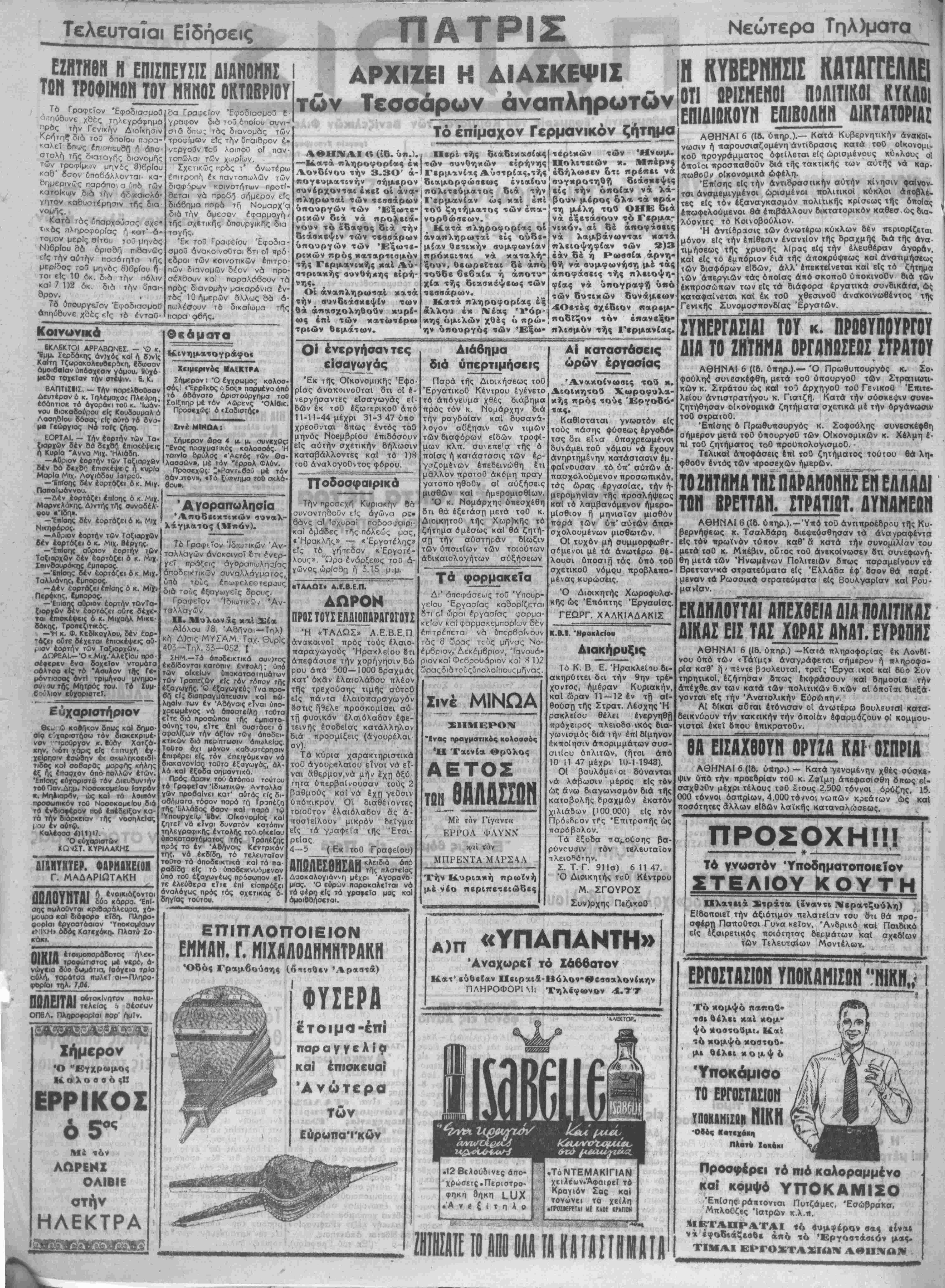 τίλίΐας >, 9έσ<ων ΟΠ5Λ. ΠλοροφορΙσι ηορ' ήμΤν. Σήμερον •Ο "ΑΕγχρωμος Κ. ο λ ο ο ο 6 ςϋ ΕΡΡΙΚΟΣ τόν ΛΩΡΕΝΣ ΟΛΙΒΙΙ στήν ΗΛΕΚΤΡΑ Τό Γραφ( *ον Ίδιωτικών Άν- ταλλαγών άνοκοινοΐ δπ ε*νερ- γεΤ πράζεις άγθραπωληα/ας ρζς γρης άποδεικτικών ουνολλάγματος, υπό τοος έπωφελεοτερους διά τούς ίξαγωγεΤς δρους. Γραφείον Ίδιωτικω^ Άν- ταλλαγ(7;ν Π. Μυλωνας καί Σία Αΐόλου 78, 'Αδηναι—Τηλ) κή Δ)σις ΜΥΣΑΜ Ταχ. Θυρΐς 403—Τηλ. 33-052 { ΣΗΜ.—Τό άποδεικτικά συν)τος έκδΐδοντοι κατόπιν έντολή; υπό των οΐκεΐυν ύποκαταοτηυάτων τΟν Τροπεζθν βΐς τόν τόπον τής έζανωγής, "© έζαγωγεύ; ϊνα προ¬ βή εί; διαπραγματευθή καί πώ- ληοΐν των έν Αθήναις είναι υπο- χοεωμένος νά όποστεΐλο τοθτα εΤτε διά προσώπου τής έμπιστο- σύνη; τού, εϊτε επί οιιθΓάοει ά σφσλΐζων την αξίαν των άποδει- κτικθν διά περίπτωσιν απωλείας Τοθτο όχι μόνον κασυοτέρησιν έπιφέρει είς τόν έπειγόμενον νό διακανονίση τοθτα ίξαγωγάς, ολ' λό καί έξοδα οηυαντκά. Πρός άρσιν τοθ άτόπου τούτου τό Γραφείον Ίδιωτικθν ΑντοΚλα γίΒν προβαίνει κατ' αύτάς είς δι- αβήμαΓα τόσον παρά τγ^ Τραπέζα τής "Ελλάδος βσον κοί παρά τφ 'ΥπουργεΙφ '66ν. ΟΙκονομίας καί ζη?εί νό εΤναι δυνατόν κατόπιν τηλεγραφικής έντολής τοθ οίκβΐου ύποκοταοτήματος τής Τραπέζης πρ6ς το έν Ά&ήνοις Κεντρικόν της, νό έκδΐδη, τό τελευταίον τοθτο τα όποδοκτικό καί τα πά ραδΐδο είς τό οποδεικνυΛμενον υπό τοθ έζαγωνέως πρόσωπον εί¬ τε έλεύσερα είτε επί εΐσπράξει αναλόγως πρός τος σχετικάς ό- δηγΐος τούτου. Τόέπίμαχον Γερμανικόν ζήτημα ΑΘΗΝΑΙ «(ίδ.ύπ.).| Ιΐερί τής διαδικασίας —Κατά πληροφορίας έκΐτών συνθηκών είρήνης Λονδίνου την 3.3Ο ά-Ι Γερμανίας Αύστρίας,τής τερΐκών Πολιτικών κ. Ήνωμ. Μπέρνς πογευματινήν σήμερον συνέρχονται έκεί οί άνα· πληρωταί των τεσσάρων ύπουργών των Εξωτε¬ ρικών διά νά προλειά- νούν τό έδαφος διά την διάσκεψιν των τεσσάρων ύπουργών των Εξωτε¬ ρικών πρός καταρτισμόν τής Γερμανικής καί Αύ- βτριακης αυνθήκης είρή- νης. Οί αναπληρωταΐ κατά την ουνδιάσκεψίν των θά άπασχοληθοΰν κυρί- ως επί των κατωτέρω τριών Θεμάτων. εδήλωσεν δτι πρέπει νά διαμορφώσεως ένιαίου[ουγκροτηθή πολιτεύματος διά την | είς την οποίαν ν* λ*- Ι"ερμανίαν ώς καί επί τού ζητήματος των έπα- νορθώσεων ρώε. Κατά πληροφορίας οί άναπληρωταί είς ουδε¬ μίαν θετικήν συμφωνίαν πρόκβιται νά καταλή- ξουν, θεωρεϊται δέ άπό τούδε βεβαία ή άποτυ- χία τής διασκέψεως των τεσσάρων. Κατά πληροφορίας έξ άλλου έκ Νέας Ύόρ- βουν μέρος δλα τα κρά- τη μέλη τού ΟΗΕ δια ν ά έξετάβουν τό Γερμα¬ νικόν, <χΙ δέ άποφάβεις νά λαμβάνωνταε κατά πλειοψηφίαν των ^ 9)3 εάν δέ η Ρωσσία αρνη¬ θή νά συμφωνήση μέ τοις άποφάσεις τής πλειοψη- φίας νά υπογραφή υπό των δυτικών δυνάμεων 4Οετές σχέδιον παρεμ- κης ομιλών χθές ό πρώ- «οδίζον τόν έπανεξο ην ύπουργός των Έξω- πλισμόν τής Γερμανίας. Ο- ένεργήσαντες είσαγωγάς Έκ τής ΟΙκονομικής Έψο· ρΐας άνακοινοθται 8τι οί έ- νεργήσαντες εΐσαγωγάς εΐ- δων έκ τοϋ έξωτερικοθ άπό 11-11-44 μέχρι 31-347 υπο χρεοθνται όπως έντός τοθ μηνός Νοεμβριού έπιδόσουν είς αυτήν σχετικήν δήλωσιν καταβάλλοντες καί τό 1)8 τοθ άναλογοθντος φόρου. Ποδοσφαιρικά Την προσέχη Κυριακήν δα συναντηδοΰν είς άγώνα ρε· 6άνς α! ίσχυραΐ ποδοσ,ραιρι- κα! οκάδες τής πόλεώς μας, Ήρακλ^ς» — «Έργοτέλης» είς τ6 γήιεδον «Έργοτέ- λους» "Ωρα ενάρξεως τού ά- γώνθς ωρίσθη ή 3.15 μ.μ. «ΤΑΛΩΖ· Α.1Β.Ε.Π. ΛΩΡΟΝ ΠΡΟΣ ΤΟΥ£ ΕΛΑΙΟΠΑΡΑΓΟΓΟΥΣ Ή «ΤΑΛΩΣ» ανακοινοί πρός Η Α.Ε.Β.Ε.Π τούς έλαιο ρ πσραγωγούς Ηρακλείου 8τ απεφάσισε την χορήγησιν δώ ρου άπό 500—1000 δραχμάς κατ' οκάν