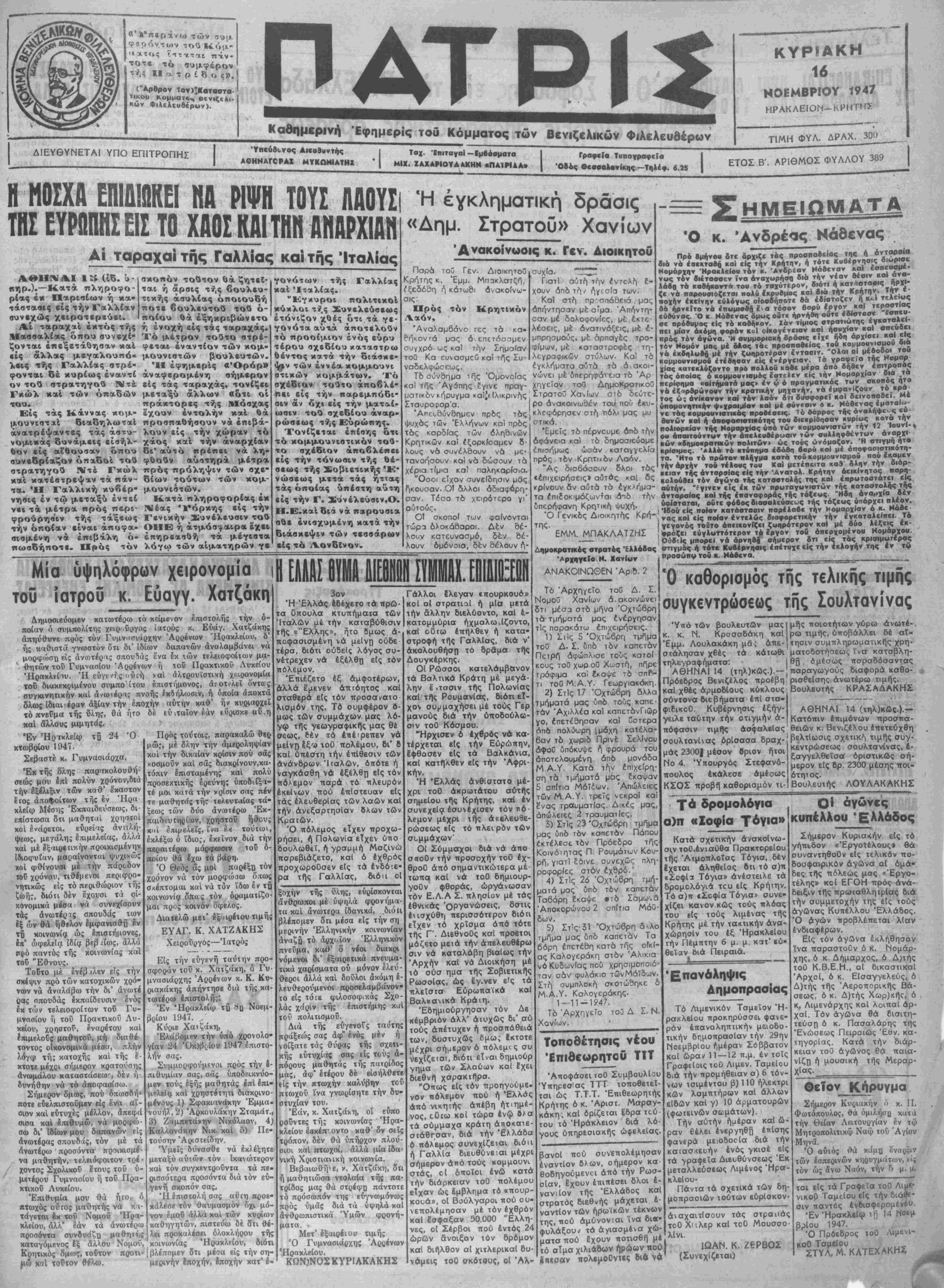 <ρούς αΰτοϋ Ποντελζν καΙ Ίάκω- βον Λιανόκην ώς καΙ την οΐκογί- γειον τοθ γαμβροθ τού Έμμ. Σπ. Χατζηδοκη συλλυπούμεθα θερμώς. , ΑΙ1ΗΥΚΤΕΡ. ΦΔΡΜΑΚΕΙΟΗ θ. ΓΕΩΡΓΙΑΔΟΥ την Δευτέραν έ- οπέρος ΪΟη τρεχ. όπό πλατείαν Αγ ΔημητρΙου μέ- χρι ζαχσροπλασΐεΐου Ρεγονάκη καρφΐτσα οχήιιατος καρδίας (κλΐπ) μέ πολυτίμους λΐθους. Πρόκειται περΙ οΐκογενοακοθ κειμηλΐου. Ό ευρών παρακολεΤται να τό φέρη είς τόν κ. Γεώργ. Κωνσταντίνον, πλατεΤα Αγ. ΔημητρΙου καί άμει φθήοεται γΐννα'ως. 1—Χ Α" ΚΑΑΑΙΟΠΗ ΗΚΑΙΑΡΑ ΜΟΔΙΣΤ Α Έηανηλθεν έξ Άβηνών κομΐσοσο πλουσίαν συλλογήν κροκΙ κοΙ νέων μοδίλων τής χειμερινής μό- δος ΑΠ0ΑΕΙ6Η τιμάς; 3 000 Αθριον Κυριακήν πογευμοτινή. Αμερικης εϊσογω-, Τόν κ. -όφούλην θά συνοδεύουν είς την είς τδ κοινόν διά περιο8ε1αν τού οί κ. κ Στράτος καί Δίγκας. άνά 80 δράμια] Ε(ς Θεσσαλονίκην θά μεταβή κσί ό σ ρΐτη γός κ. ΛαΙφσεϋ. , Λ ^^.^1 ' Ό κ Σοφούλης θά ομιλήση είς ϊτυ*Κεν τρώσεΐς αξιωματικών καί δττλιτώ . είς τούς όποίους θά τονίση την απόφασιν τόσον τής Έλλη.ικής Κυβερνήσεως Οσον κσί ιών συμμάχων δπως τερματισθή" τό συντομώτε ρον ό συμμοριακός αγών δι* ά*ποφασιστική δράσεώς. Κατά πληροφορίας έκ ΧαλκΙδος 30με λής συμμορία επετέθη εναντίον τοθ χωρίου Σπαφέρη τής ΒορεΙου ΕύβοΙας καί τό έλεη- λάτησεν. Στρατιωτικαί δυνάμεις κινοθνται δ.ά την εκδίωξιν των συμμοριτών. Κατά πληροφορίας έξ άλλου έκ Πα- θέατρον «ΝΤΟΡΕ» Μουσική Κωμωδΐα ΚαΙτος Β«ρώ- νη Σήμερον Σάββατον τα βργο πού δφησε έποχή οτήν Άβήνα »"Ετσι είν' ή ζωή» είς δύο παρσ στάσεις. Σήμερον ή πρώτη οίκογενειακή Λπογευμπτινή άρα 6 30' μέ λαΤκός ' ] ΛΙ 2 000. ώραν 6.30' ά Κινηματογράφοι Χειμερινος ΒΑΕΚΤΡΑ ι} Σήμερον: Τό κοινονκό άριστούρ γημα «Θύελλα σέ Μητρική Καρδιό» μέ την Τζόαν Κράουφορντ, Τζόκ Κόρσον καΙ ό Ελλην Ζάκερυ Σκότ. Την Δευτέραν "ίνα βργο κα- ταοκοπεΐας «Πήτ ΧάΤν ..6 Τρομε¬ ράς». Οί τρομεροί άγώνες εναν¬ τίον τής Γκαστάπο. Χινέ ΜΙΝΟΑ: Σήμερον "Ωοα 6 μ. μ. συνκχας Μιά άνυπέρβλητη δόξα τής έβδο- μηςΤέχνης«Τά Ξύπνημα τοθ Σκλά- βου», ένα άθάνατο άριστούργημα πού τό πλαισιώνουν δΰο άποοσπέ- λαστες μεγαλειότητες τής όδόνης Τσάρλς Λώτον; Μώρην Όχά,οα. Ευχαριστηριον Ό Σΰλλογος των Διδασκάλων, ή Σχολική ΈφορεΙα καΙ ο) Μαθηταί τοθ 5)ξ'ου Δημ. ΣχολεΙου Νέας 'ΑλικορνασσοΟ αΐσθάνονται Ιεράν υποχρέωσιν ν' άπευβύνουν καΙ διά τοΟ'Τύπου την οίωνΐαν των ευ¬ γνωμοσύνην πρός τόν έν Άδή ναις Σύλλογον Άλικσρνασοέων ό, ΐ'Ηρόδοτος» διά την αποστολήν! μερΙμνΓ) τοθ συμπατριώτου μος Ια- τροθ κ. Ανδρέα Οικονομίδου Έ πιμελητοθ τής 'Υγειονομικής Σχο λής "Αθηνών των κάτωθι Έποπτι Ή διανομή τού ΙματισμοΟ Δελτία προτεραιότητος ίμα τισμοθ θά διανεΐμη τό Α'. Αστυνομικόν Τμήμα είς τούς άρχηγούς οίκογενειών επί τή έπιδιίξει των έσφραγισμέ- νων δελτΐων ιροφΐμων καί των ταυτοτήτων προκεΐμέ- ου περί άξιωυαηκών άπό τής προσεχοθς Τρίτης δι* 6· λοτ τα κσταστήματα καί άπό τής 10—12 π. μ. Ή διανομή θά ένεργκΐται άπό 7 30 μ. μ. ΑΙ σταφυλαί μας είς τό Λονδίνον Ό έν Λονδίνω "Ελλην Πρε σβευτης κ. Μελδς διά χθε- σινοΰ τηλεγραφΓψατός πρός την Στπφυλικήν Επιτρο¬ πήν "Ηρακλείου γνωρίζει δτι τό τελευταίον φορτίον στα- φυλών δπερ μετεφέρθη έκεϊ διά τού α)π «Σαγκολάντ» δια τίθεται τα μέν σ·δ<;ρίτης είς τ6 38 — 42 σελίνια τα δέ ρο- ζακΐ είς τα 32 1)2—45 σελ- τής 12— ι λίνια όναλόγως τής καταστά¬ σεως τού έμπορεύματος. Ανακοίνωσις Τό Κ.Β Ε. Ηρακλείου α¬ νακοινοί δτι σήμερον Κυριακήν Ι6ην ΝοεμβρΙου καΐ ΰ>ραν ΙΟην Θέλει λάβη χώ¬