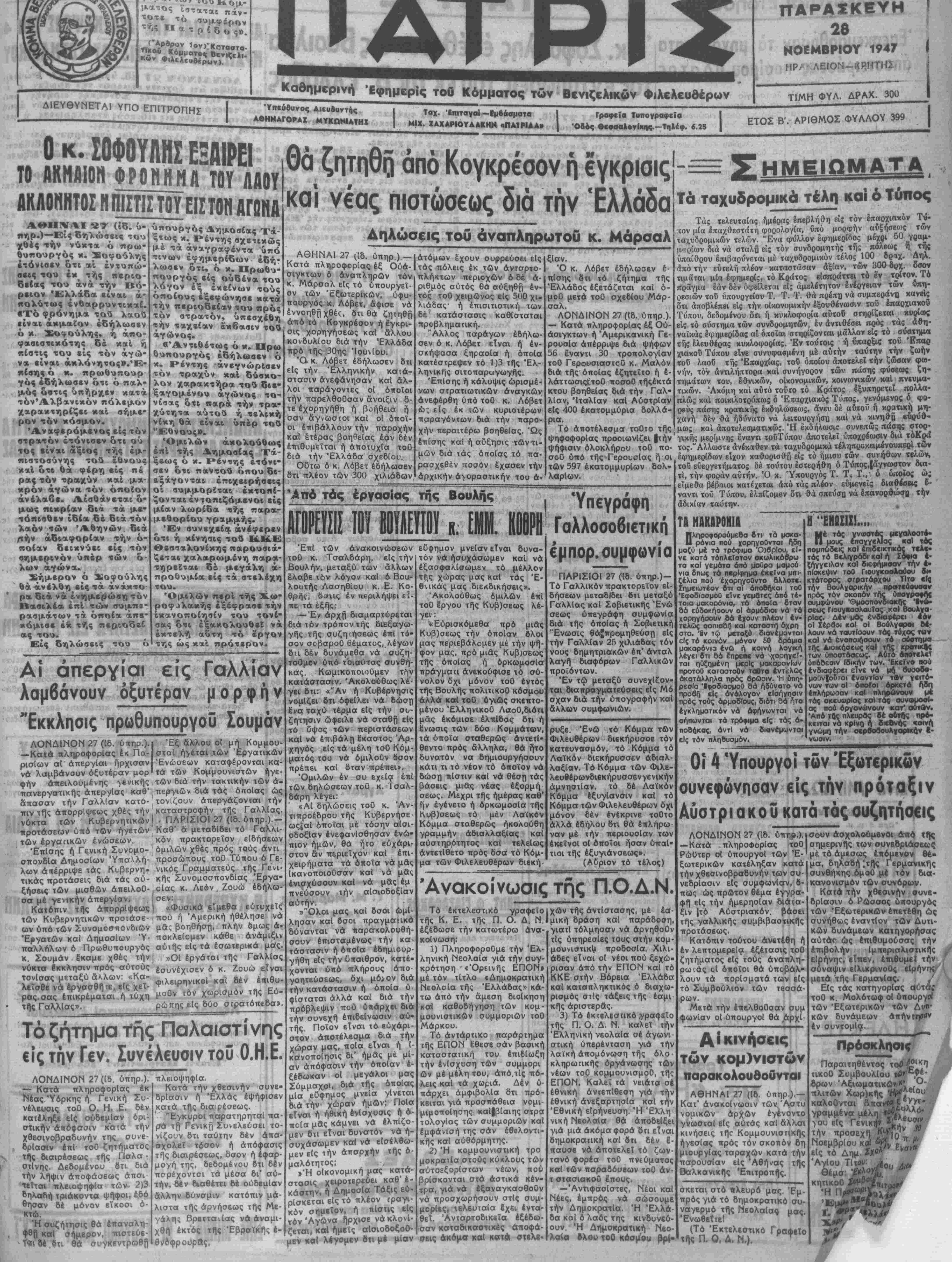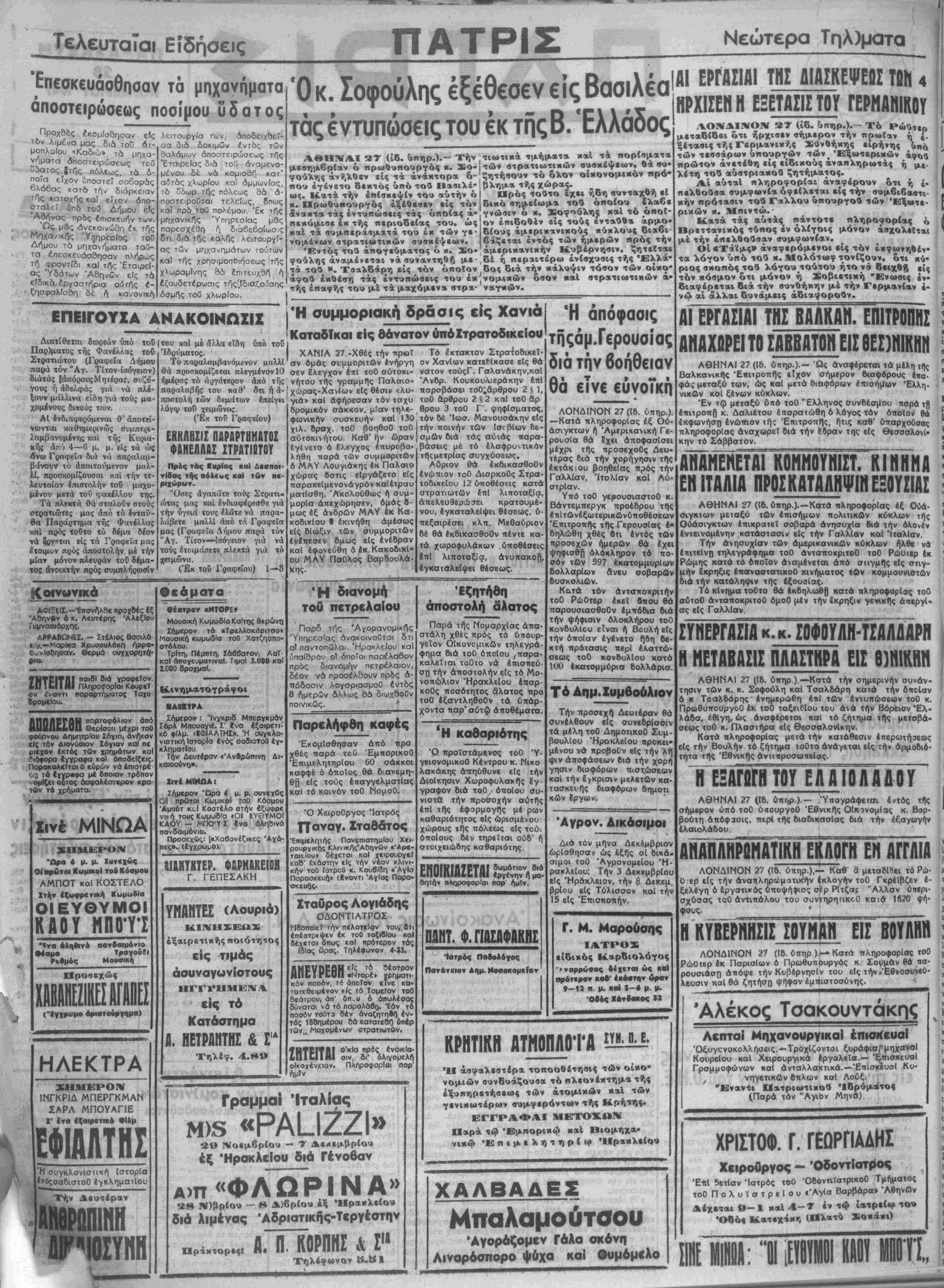 '<ναρρύοας «έχεται «ς καΐ κοοτερον κα6' έκαστην ώραν 9-12 π. μ. καί %—$ μ. μ. Οβός Χάνδακος «2 ΚΡΗΤΙΚΗ ΑΤΜ0ΠΑ0Τ1Ο-- Ή άσφαλεβτέρ* τοποοθέτηβιί τΛν οΐ*ο- νομιών βυνβυάζουσα τό πλεονέκτημ* της εξυπηρετήσεως των άτομίκΔν »ι»1 των γ·νικωτέρων συμφερόντων της Κρήτης. χ·'< ΕΓΓΡΑΦΑΙ ΜΕΤθ-ΙίΙΝ «*Μ* α»ρά τώ Εμπορικώ καί Βιομηχα- νικφ Επιμελητηρίω Ηρακλείου Γ'Τ/Λ -/ ΧΑΛΒΑΔΕΣ Μπαλαμούτσου 'Αγοράζομεν Γάλα σκόνη Λιναρόσπορο ψύχα καί Ουμόμίλο ΛΟΝΔΙΝΟΝ *Τ (ίδ. ύπηρ.).— Χό μεταδίδει ότι ήρχισεν σήμερον την πρωΐαν η ξεταβις τής Γερμ»νικής Συνθήκης είρήνης V των τεσσάρων ύπουργών των 'Έξωτερικών ά πρώτον ανετέθη είς είδικους άναπληρωτάς ή μ,, λίτη τού αύστριακού ζητήματος. Αί αυταί πληροφορίαι άναφέρουν ότι ή £. πελθοΰσα συμφωνίαι οφείλεται είς την συμβιβαα-ϊι κήν πρότασιν τοθ Γάλλον υπουργόν των 'Έξωτε¬ ρικών κ. ϋΐπιντώ.- Κατά τάς αύτάς πάντθτε πληροφορίας ό Ηρεττανικός τύπος έν όλίγοις μόνον άσχολεΐται μέ την επελθούσαν συμφωνίαν. Οί «Τάϊμς» άναφερόμενοι είς τόν εκφωνηθέν¬ τα λόγον υπό ιου κ. Μθλότωφ τονίζουν, δτι κύ· ριος ακοπός τού λόγου τούτου ήτο ναι δειχθή είς τόν κόσμον δτι μόνον ή _·οβιετική Ένωσις εν- διαφέρεται δια την συνθήκην μέ την Γερμανίαν έ¬ ν Λ αί άλλαι δυνάμεις άδια^ορούν. ΑΓεΤΓΑΣΙΑΙ ΤΗΣ ΒΑΛΚΑΗ. ΕΠ1ΤΡΟΠΗΣ ΑΝΑΧΟΡΕΙ ΤΟ ΣΑΒΒΑΤΟΝ ΕΙΣ ΘΕΣ3ΝΙΚΗΗ ΑΘΗΝΑΙ 27 (Ιδ. ύπηρ.).— Ώς άνσφέρεται τα μέλη της Βαλκανικής Έππροπής «Τχον σήμβρον διαφόρους ίηα· φάς μεταξύ των, ώς καΐ μετά διαφόρων επισήμων Έλλη· νίκων κοί ξένων κύκλων. Έν τώ μβταξύ 6τιό τοθ Έλληνος συνδέσ^ου πσρά τβ έπιτροπβ κ. Δαλιέτου έπαρατώθη 6 λόγος τόν οποίον θά έκφωνήση ενώπιον τής Έπιτροπης, ήτις καθ* υπαρχούσας πληροφορίας αναχωρεί διά την £δραν της βίς θεσσαλονΐ· κην τό Σάββατον. ΑΐΑπΕΝΕΤΑΙ ΚΟΜΜΟΤηΤΣΤΤ ΚΪΝΙΗ Α ΕΝ ΙΤΑΛΙΑ ΠΡΟΣΚΑΤΑΑΗΨΙΗ ΕΞΟΥΣΙΑΣ ΑΘΗΝΑΙ 27 (ίδ. ύπηρ.).—Κατά πληροφορίας έξ Ούά· σιγκτων μεταξύ των επισήμων πολιτικών κύκλων τής Ούάσιγκτων έπικροτεΐ σοβαρά άνησυχία διά την όλονέν εντεινομένην κατάστασιν είς την Γαλλίαν καί Ιταλίαν. Την ανησυχίαν των άμερικανικών κύκλων ήλθε νά έπιτείνη τηλεγράφημα τοθ άνταποκριτοθ τοθ Ρώϋιβρ έκ Ρώμης κατά τό οποίον άναμένεται άπό σιιγμής β(ς στιγ¬ μήν Ικρηξις έπβναστατικοθ κινήματος των κομμουνιστήν διά την κατάληψιν τής έξουοίας. Τό κΐνημα τοθτο θά εκδηλωθή κατά πληροφορίας τοθ αύτοθ άνταποκριτοθ όμοθ μέν την εκρηξιν γενικάς άηβργΐ- σς είς Γαλλίαν. ΣΥΗΕΡΓΑΣΙΑ κ. κ. ΣΟΦΟΥΑΗ-ΤΣΑΑίΑΡΗ Η ΜΕΤΑΒΑΣΙΣ ΠΑΑΣΤΗΡΑ ΕΙΣ 61ΝΙΚΗΝ ΑΘΗΝΑΙ 27 (ίδ. ύπηρ.) —Κατά την σημερινήν συνάν¬ τησιν των κ. κ. Σοφούλη καΐ Τσαλδάρη καιά την οποίαν ό κ Τοαλδάρης ένημερώθη επί των ένιυπώσεων τοθ κ. ΠρωθυπουργοΟ έκ τοθ ταξβιΡίου τού άνά την Βόρειον Ελ¬ λάδος έθίγη, ώς άναφέρβται καΐ τό ζήτημα τπ,ς μβτσβά- σεως τοθ κ. Πλασιήρα είς θεσσαλονίκην. Κατά πληροφορίας μετά την κατάθεσιν επερωτήσεως είς την Βουλήν τό ζήτημα ιοθτα άνάγεται είς την άρμοβιό- τητα τής Έθνικής άνητιροσωπεΐας. ΑΘΗΝΑΙ 27 (16. ύπΓ,ρ.).— 'Υπογράφετσι βντός τής σήμβρον υπό τοθ ύπουργοθ Έθνικής ΟΙκονομΙας κ. Βαρ- βούτη απόφασις, ττερί τής διαδικασίας διά την εξαγωγήν έλαΐολάδου. ΑΗΑΠΑΗΡΐπΑΤίΚΗΊΚΑΟΓΗ ΕΝ ΑΓΓΛΙΑ ΛΟΝΔΙΝΟΝ 27 (Ιδ. ύπηρ.),— Καθ" α μεταδίοει τό Ρώ· είς την άναπληρωματικήν εκλογήν τοθ Γκρέϊβζεν ε¬ ξελέγη ό εργατικάς όποψήφιος σ'έρ Ρίτζαρ "Αλλαν ύΐιερι- σχύσσς τοθ άντιπάλου τού συντηρηηκοθ κσΐά 1620 ψή- φους. ' __________ Η ΚΥΒΕΡΝΗΣΙΣ ΣΟΥΜΑΝ ΕΙΣ ΒΟΥΛΗΝ ΛΟΝΔΙΝΟΝ 21 (ίδ. οπηρ ).— Κατά πληροφορίας τοθ Ρώυτερ έκ Παρισίων ό Πρωθυπουργός κ Σο