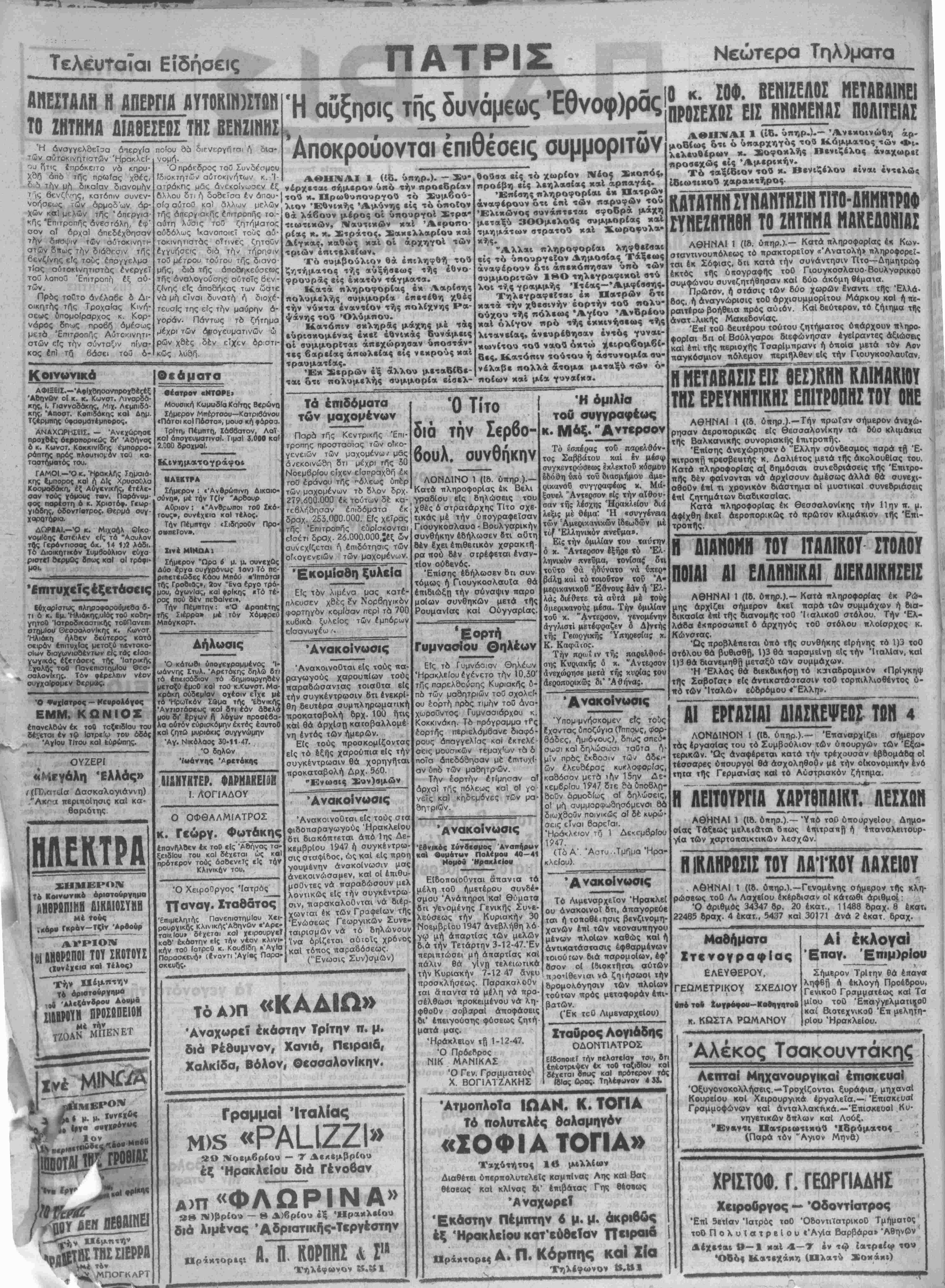 Έβνΐκός Ζύνδ<ομος Ανάπηρον καί Ονματαν Πολέμου 40—41 Ηομον Ηρακλείου Είδοποιοθνται άπαντα τα μέλη τοθ ήμετέρου συνδέ- σμσυ Άνάπηροι καί θόματα βη νενομένης Γενικής Συνε¬ λεύσεως την Κυριακήν 30 Νοεμβρίου 1947 ανεβλήθη λό γφ μή άπαρτίας των μελών δ.ά την Τετάρτην 3-12-47.Έν περιπτώσει μή άπαρτίας καί πάλιν θά γίνη τελειωτικά την Κυριακήν 7-12 47 ανευ προσκλήσεως. Παρακαλοθν ται άπαντα τα μέλη νά προ¬ σέλθωσι προκειμένου νά λη- ψθοθν σοβαραί άποφάσεις δι' επειγούσης φύσεως ζητή· ματά μας. •Ηράκλειον τβ 1-12-47. Ό ΠρόεΛρος ΝΙΚ ΜΛΝΙΚΑΣ Ό Γεν. Γραμματεύς^ Χ. ΒΟΠΑΤΖΑΚΗΣ Η άμιλΐα τοθ συγγραφέως κ. Μάξ." Α ντερσον Τό εσπέρας τοΰ παρελθόν τος Σαββάτου χαί έν μέσφ συγκεντρίόσβως έχλεχτοϋ κόσμον Ιδόθη υπό τοΐ δνασμήμοΐ) άμε οικανου συγγοαφέα>ς χ. Μά-