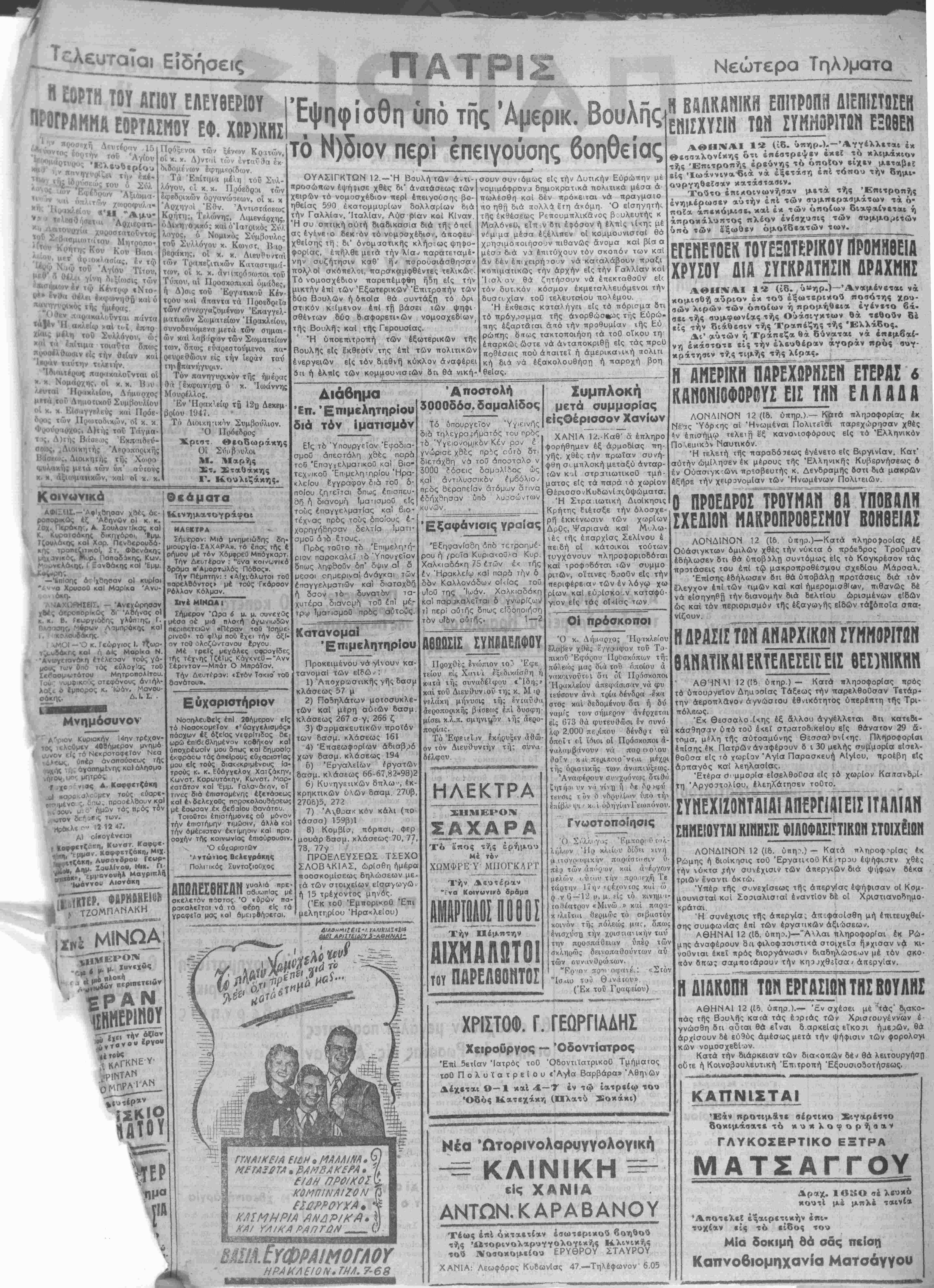 Ίίσλαν θά ζητήσουν νά έπεκταθοθν εί< τόν δυτικόν κόσμον έκμετσλλευόμενοι την δυσπ χΐαν τοθ τελευταίου πολέμου. Ή έκθεσις καταλήγει είς τα ττόρισμαι 8τι τό πρόγρσμμα τής άνορθώσ§£5ς τής Εύρώ- πης έξαρταται άτό την προθυμίαν τής Ε:ύ ρώπης δτως τακτοποιήοη τα τοθ οΐκου τη έιταρκώς ώστε νά ανταποκριθή είς τάς προϋ ποθέσεις πού άπαιτεΐ ή άμερικανΐκή ιτολιτι κή διά νά εξακολουθήση ή παροχή βοη θείας. Λιάβημα Έη. 'Επιμελητηρίου διά τόν ίματισμόν Είς τό Υπουργείον Έφοδια- σμοΰ απεστάλη χδές παρό τοδ Έπαγνελματικοΰ καΐ Βιο- τεχνΐκού Επ μελητηρίου Ηρα¬ κλείου έγγραφον διά τοΰ ό- ποίου ζητεΐται δπως έπισπευ- δπ ή διανομη ίματισμοθ ε?ς τοος έπαγγελματίας καΐ βιο- τέχνας πρός τοϋς όποίους έ- χορηγιίδησαν δελτία Ιματι- σμοΰ άιδ 5τους. Πρός τούτο τδ Έπιμελητή- ριον παροκαλεΐ ι δ Ύπουγεΐον δπως ληφθούν όπ' δψιν αί δ μεσοι σημεριναί άνάγκαι των έπαγγελματιών καΐ διαταχδίϋ η δσον τδ- δυνατόν τα¬ χυτέρα διανομη τοΰ επί μέ- τρω ίμαπσμοθ πρδς αύτούς. Κατανομαι Προκειμένου νά γΐλουν κα- τανομαΐ των είδώ^: 1) Άποχρωστικής γής δασμ κλάσεως 57 μ 2) Ποδηλάτων μοχοσυκλε- τών καΐ μέρη αυτών βασμ κλάσεως 267 σ γ, 266 ζ 3) Φαρμακευτικών προίόν των δασμ. κλάσεως 161 4) ΈπαεωφορΙων άδιαβρό χων δασμ.κλάσεως 194 6) Έργαλείων ίργατών δασμ. κλάσεως 66-67,82-98)2 6) Κυνηγετΐκών δπλω", εκ¬ κρηκτικών ύών δααμ. 27Οβ, 270δ)5, 272 7) Άν,θοακ κόν κάλι (πό¬ τασσα) 159β)1 8) Κομβίσ, πόρπαι, φερ μουάρ δασμ. κλάσεως 70, 77, 78, 77γ · ΠΡΟΕΛΕΥΣΕΩΣ ΤΣΕΧΟ ΣΛΟΒλΚΙΑΣ, ωρίσθη ήμέρα τΐοοσκομΐοεως δηλώσεων με. τα των στοιχεΐων είςαγωγώ-' ή 15 τρέχοντος μηνός. (Έκ τοθ 'ΕμπορικοΟ Επι μελητηρίου Ηρακλείου) ΪΑΤΟΥ ημα ψ ΠΡΰ/ΧΟΣ ΚΟΜΠΙΝΑΙΖΟΝ ΠύΡΡΟΥΧΑ. ·ι* ΚΑΪΜΗΡ/Α ΑΝΔΡ/ΚΑ· ΧΑ/ Υ/Ι/ΚΑ ΡΑΠΓΰΑΐ____0 [ΕΥΦΡΑΙΜΟΓΑΟΥ ΗΡΑΚΛΕΙΟΝ.ΤΗΛ. 7-68 Αποστόλη 3ΟΟΟδόσ. δαμαλίδος Τό υπουργείον 'Υγιεινής δια τηλεγρα^ήματός τού πρός τδ 'Υγειονομ^ικον Κέν ρον έ γνώρισε χδες πρ^ς ούτδ δτι διετάχδη νά τού άποσταλο ν 3000 δόσειζ δαμαλίδος ώς καΐ άν'τιλυσσΐκδν εμβόλιθν- πρός θεραπείαν άτόμων απνα έδήχ^ησαν δπδ λυοσώντων κυνών. , γραίας Εξηφανίσθη 6πδ τετραημέ- ρου ή /ροΐα Κυρια<οΰΑα Κυρ Χαλκιαδάκη 75 έτών έ< της έν Ήρακλείφ κα! παρά την ό δδν Καλλονάδων οϊ<ίας τοΰ υίοϋ της Ιωάν. Χαλκιαδάκη και παρ ^καλείται δ γνωρίζων τί περϊ αυτής δπως ειδοποιηθη τδν υϊόν αΰτη"ς. 1—2 Α8ΟΩΣΙΣ ΣΥΜΛίΙΕΑΦΟΥ Πρ,οχθε,ς ενώπιον ιο" Έφε τείου είν, Χιινι* εξε,δικάσθη ή κατά τής συναδέλφου «"Ιδής* καί τοϋ Διευθυνιθί' της κ. Μ ΐρ νελάκη μήνυσις τής Ινιαΰι)α άεροπορικής βιίσεως επί δυσφη μίσει κ.λ.π. σμηνιτ^όν τή; αερο- πορίας. ΤόΈφει?Ϊ3ν εκήρυξεν άθώ όν τόν Διευθυντήν τή; συνα δέλφου ΗΛΕΚΤΡΑ ΣΗΜΕΡΟΝ ΣΑΧ_Α_ΡΑ Τό έπος τής έρήμου Μέ τόν ΧίίΜΦΡΕΎ ΜΙΙΟΓΚΑΡΓ Την Δευτέραν "ίνα Κοινυνικό δράμα Την Πέμπτην ΑΙΧΜΑΛΩΤΟΙ τού ΠΑΡΕΛ8ΟΝΤΟΣ Συμπλοκή μετά συμμορίας είςθέρισσον Χανίων ΧΑΝΙΑ ΙΛ-ΚαίΓά έπληρο φορήθημεν έξ αρμοδίας πη- γής, χθές την πρωΐαν συνή¬ φθη σ<_μτιλοκή μεταξύ άνταρ- ΐών κΛ στρηΐΐωτικοθ τμή- ματος είς τα Μαρα ι ό χωρίον Θέρισσο^Κυδωνί-ίςύψώματα. Ή Στρα ιωτική Διοίκησις Κρήτης Ειέτσξε την δλοσχε- ρή εκκένωσιν των χωρίων Δρΰς, Ψαριανά καΐ Μυλω- ές ιής επαρχίας Σελίνου έ πειδή οί κάτοικοι τούτων τυγχάνουν πληροφοριοδόται καΐ τροφοδόται των συμμο ριτών, οΐτινες δροθν είς την περιφέρειαν των έν λόγω χω ρίων καί ευρίσκουν καταφύ- γιον είς τάς οΙ*Ιας των ΟΙ πρόσκοποι Ό κ. Δήααρχο; ρ έλαβεν χθές εγγιϊαφον τού Το- πικου Έφόρου ΙΙοοσκόπο;ν τής πόλεώς μας διά τοΰ όποίου ά νακοινοϋτοΐ δ τι οί Πρδσκοποι Ηρακλείου απεφάσισαν,νά φυ τεύσουν αν,