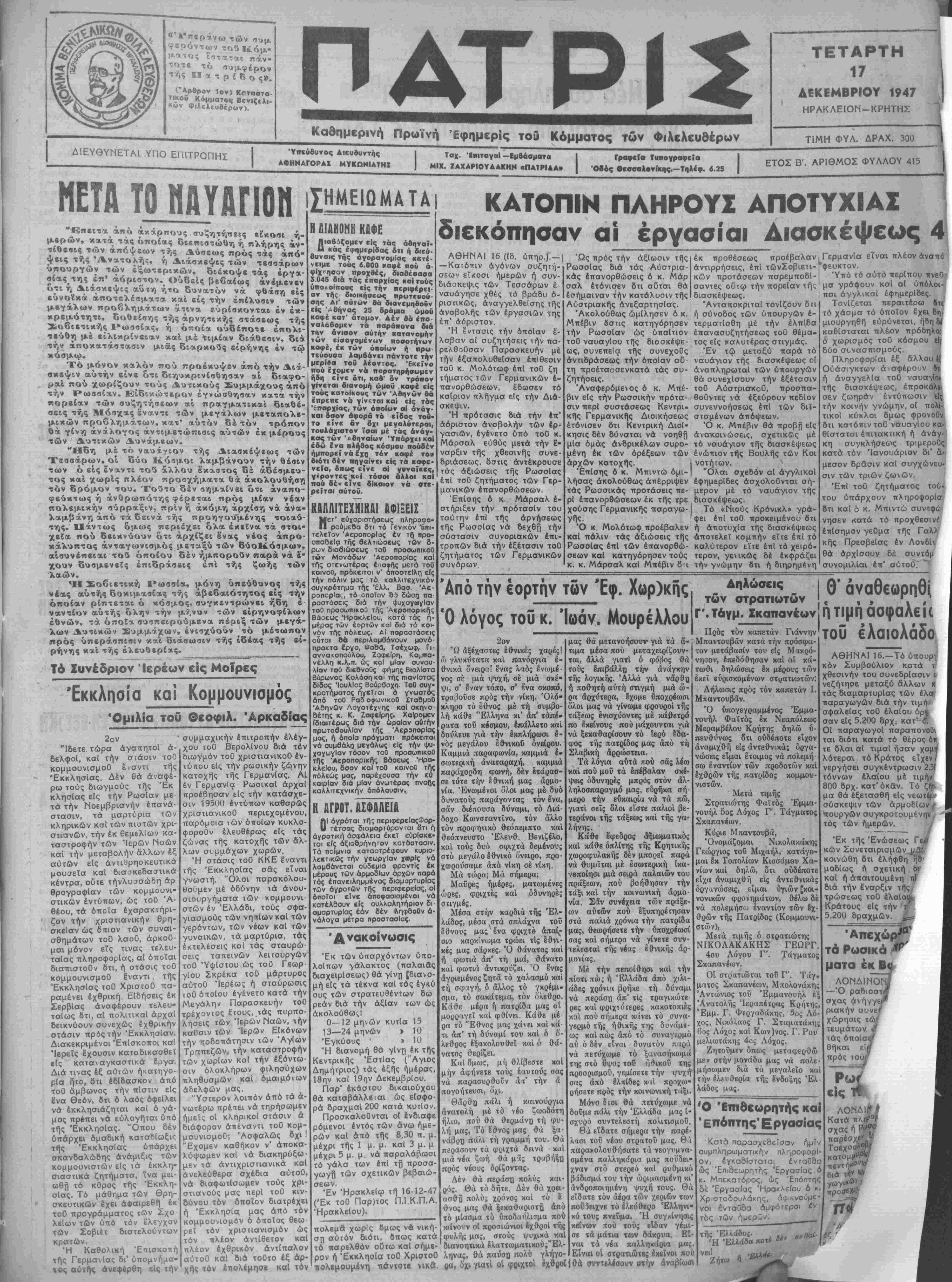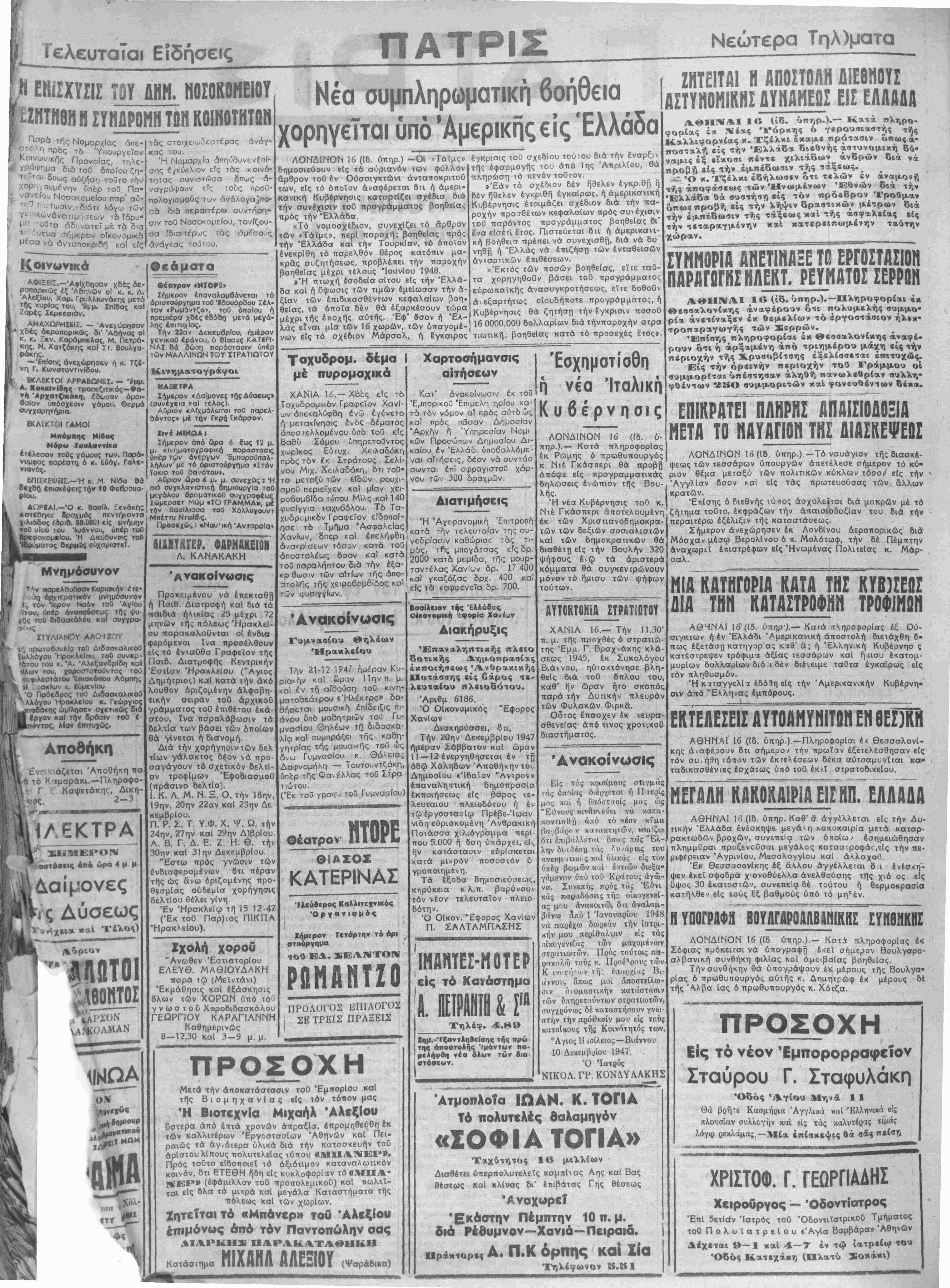 ται βΙ<; ολα τα μκρά καΐ μεγάλα Καταστήματα τής πόλεως καΐ των χωρίων. Ζητείταιτό «Μπάνβρ» τοθ Αλεξίου έπιμ6νως άπό τόν Παντοπώλην σας ΗΑΡΑΚΑΤΑΘΗΚΗ (Ψαράδικα) Κατάσιημα ΜΙΧΑΗΛ ΑΛΕΞΙΟΥ Διατιμήσεις Ή Άγορανομική Έπιτροπη κατά την τελευταίαν της συ¬ νεδρίασιν καδώρισε τάς τι¬ μάς, τΡς μπογάτσας είς δρ 2000 κατά μερΐδα, της μουρ- ταντέλας Χανίων δρ. 17.400 καΐ γκαζόζας δρχ. 400 καΐ ;ΐα δρ. 700. βαοΐλειον τής Ελλάδος Οΐκονομική ί Χ Διακήρυξις Έπαναληπτικής πλειό δοτικής Δημοπρασίας έκποιήσεως 'Ανυρακικής Ποτάασης είς βάρος τε< λευταίου πλειοδότου. Άριθμ 6186. Ό Οικονομικάς "Εφορος Χανίων Διακηρύσσει, δή, Την ϋθην Δεκεμβριού 1947 ημέραν Σάββατον καΐ ώραν 11—·12 ενεργηθήσεται έν τή όδ@ Χάληοων Αποθήκην τού Δημοσίου «Ίδαΐον "Άντρον» έπαναληητική δημοπρασΐα έκποιήσεως είς βάρος τε< λευταίου πλειοδότου ή έν τώέργοσταοΐω Πρέβε-Ίωαν νΐδη εΰρισκομένη Άνθρακική Πότασσα χιλιόγραμμα περί- που 5.000 ή οση ύπάρχει, ε ήν κατάστασιν ευρίσκεται καΐά μικρόν ποσοστόν ύ γροποιημενη. Τα εξοδα δημοσιεύσεως, κηρύκεια κ λ.π. βαρύνουν τόν νέον τελευταίον πλειό δότην. Ό Οίκον. Έφορος Χανίων Π. ΣΑΛΤΑΜΠΑΣΗΣ ΙΜΑΝΤΕΣ-ΜΟΤΕΡ είς τό Κατάστημα Α. ΠΕΙΡΑΝ!» & Ι'α Τηλέφ. Χημ.·'Ιξαντληθε(αης της πρώ της αποστολάς '(μάντ»ν πά- ρεληφθή νέα δλων των δια οτόσευν. εν Εθνών _Γ Ό κ. Τζ ή τής αποφάσεως τώνΉνωμένων Εθνών διά την «Ελλάδα θά βυστήβη είς τόν πρόεδρον Τρούμαν όπως προβή είς την λήψιν δραατικών μέτρων δι* την εμπέδωσιν της τάξεως καί τής ασφαλείας είς την τετ*ρ*γμένην κ*1 ««τβρείπωμένην ταύτην χώραν. ΛΟΝΔΙΝΟΝ 16 (Ιδ. 0- τιηρ.).— Κατά πληροφορίας έκ Ρώμης ό πρωθυπουργό κ. Νιέ Γκάσπερι θά προβή άπόψε είς προγραμματικάς δηλώσεις ενώπιον τής Βου- λής. Ή νέα Κιβέρνησις τοθ κ. Νιέ Γκάσπερι αποτελούμενη έκ των Χριστιανοδημοκρα- τών των δεξιών σοσιαλιστών καΐ των δημοκρατικων θά διαθέτη είς την Βουλήν 320 ψήφους έώ τα άριστερά κόμματα θά συγκενιρώνουν μόνον τό ήμισυ των ψήφων τούτων. ΑΥΤΟΚΤΟΝίΛ ΣΤΡΑτΤωΤΟΥ ΧΑΝΙΑ 16.— Την 11.30' π. μ. τής πρσχθές ό στρατιώ- της "Εμμ. Γ. Βραχνάκης κλά¬ σεως 1945, έκ Συκολόγου Βιάννου, ηυτοκτόνησε βλη- θεΐς διά τού ΰπλου τού, καθ* ήν ώραν ήτο σκοπός παρά την Δυτικήν πλευρόν των Φυλακών Φιρκά. Οδτος έπασχεν έκ νευρα- σθενείας άπό τινος χρονικοθ διαστήματος. Ανακοίνωσις Είς τος κοισίμους σΤιγμος τάς οποίας δ έρχε-ται ή ΙΙητρίς μ«ς καί ή υπόστασις μας ώς "Εθνους κινδυνευει νά κατα- ποντισθίί άπό τό νέον κίμα βαΜβιίρο ν κατακτητών, νομίζω ότι επιβαλλίταΐ όποις πάς "Ελ¬ λην διαθέση τάς ^νάμεις τού πνευμ ιτικ< ς καί ύλακάς είς τΰν υπέρ βωμών κ α Ιττιών διεξα- γόμενον υπό τοϋ Κράτου; άγώ- να. Συνεπής πρός τάς Έθνΐ κάς παραδόσεις τής οικογενεί¬ ας μ^ΐ) άναχοινώ, δΐι άναλαμ- βάνω άπό 1 Ιανουάριον 1948 νά παρέχω δωρεάν την ιατρι¬ κήν μου περίθαλψιν είς τάς οικογενείας των μαχομένων στρατιωτών. Πρός τούτοις πα- ω τούς κ. Ποοέ^οους των Β ΣΥΜΜΟΡΙΑ ΑΝΕΤΙΝΑΗΕ ΤΓ! ΕΡΓΟΣΤΑΣΙΟΝ ΠΑΡΑΓΟΓΗΣΗΛΕΚΤ. ΡΕΥΜΑΤΟΣ ΣΕΡΡΟΗ ΑΘΗΝΑΙ 1 β (ίδ. ύπηρ.).—Πληροφορίαι έκ Θεβααλονίκης άναφέρουν ότι πολυμελής συμμο- ρία άνετίναξεν έκ θεμελίων τό εργοστάσιον ήλεκ- τροπαραγωγής των Σερρών. Έπίσης πληροφορίαι εκ Θεσσαλονίκης ανβιφέ- ρουν δτι ή αρξαμένη άπό τριημέρου μάχη είς την περιοχήν τής Χρυαοβίτσης έξελίβσεται επιτυχώς. Είς την όρεινήν περιοχήν τού Γράμμου οί βυμμορΐται ύπέστησαν αληθή πανωλεθρίαν συλλη¬ φθέντων 224Ο αυμμοριτών καί φονευθέντων δ έκ α. ΕΠΙΚΡΑΤΕΙ ΠΛΗΡΗΙ βΠΑΙΠΟύΟΞΙΑ ΜΕΤΑ ΤΟ ΝΑΥΑΓΙΟΝ ΤΗΣ ΔΙΑΣΚΕΨΕΩΣ ΛΟΝΔΙΝΟΝ 16 (ίδ. ύπηρ.)—Τό να