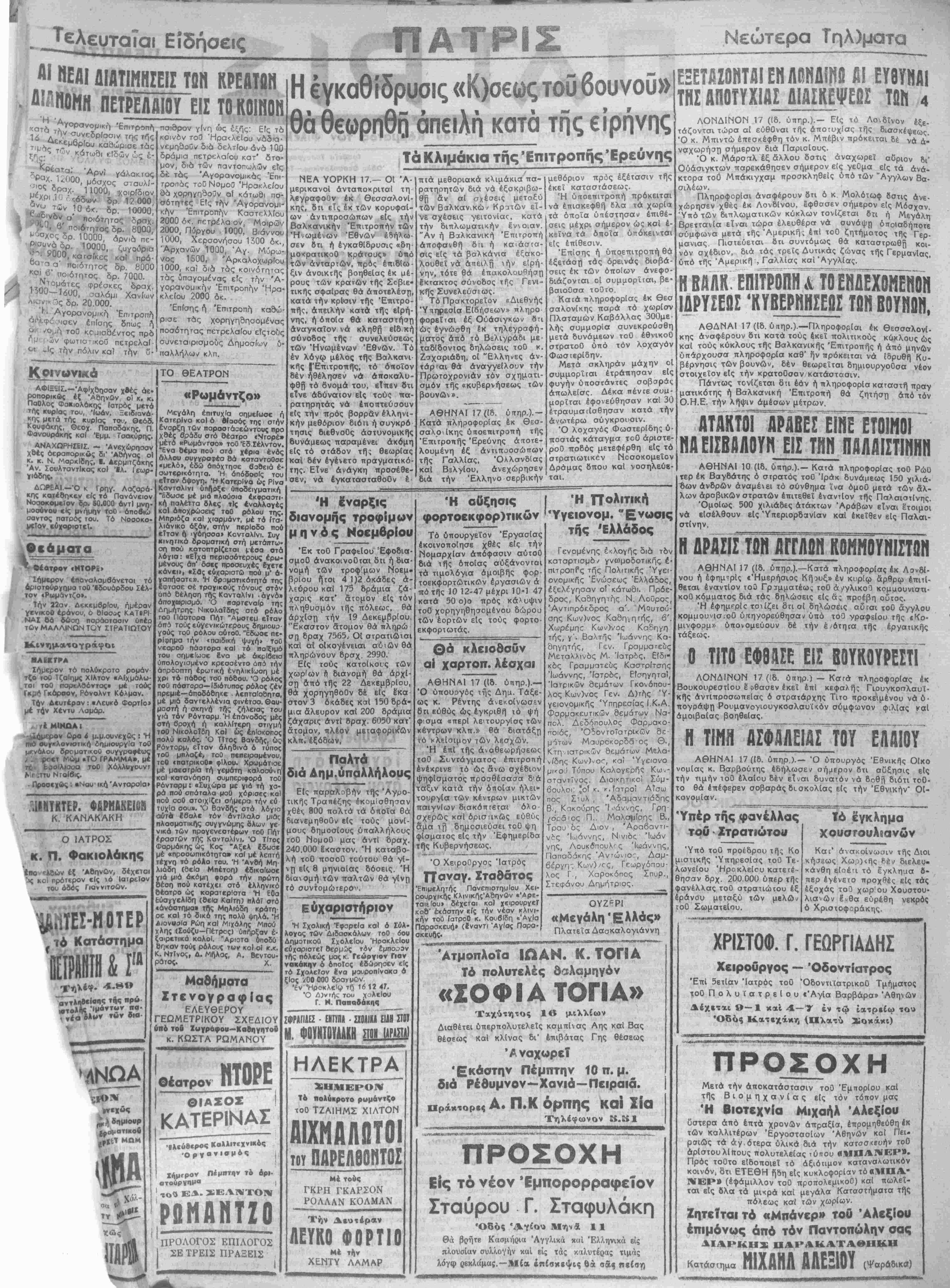κήσ<·ως Χωρ)<ής Ρ-έν διελευ- κάνθη βίοέ'ΐ τό εγκληαα β- περ εγένετο προχθές είς τάς έξοχάς τοθ χωρ'ου Χουστου- λιανών έ«θα ευρέθη νεκρός ό Χριστοφοράκης. ^ΧΡΙΣΤΟΦ. Γ. ΓΕΩΡΓΙΑΔΗΣ Χειροθργος — Όδοντίατρος Επί δετίαν Ίατρός τοθ ΌδοντιΐατρικοΟ Τμήματος τοθ Πολυίατρείου «Άγία Βαρβάρα» Αθηνών Δέχκται β~1 καί 4.—Ύ έν τώ ιατρείω τού Κατεχάκη (αλ*τύ Σοκάκι) ΠΡΟΣΟΧΗ Είς τό νεον Εμπορορραφειον Σταύρου Γ. Σταφυλάκη «Αγίου Μην δ 11 Θά βρήτε Κασμήρια 'Αγγλικά «αί Έλληνιχά εις πλουσίαν συλλογήν καί είς τάς καλυΐέρας τιμάς λόγφ ρεκλάμας.—ΑΚ« επίσκεψις θά ηΒ.% «είση ΠΡΟΣΟΧΗ Μετά την αποκατάστασιν τοθ Έμπορίου καί τής Βιομηχανίας είς τόν τόπον μας 'Η Βιοτεχνία Μιχαήλ Αλεξίου υστερα άπό έπτά χρονών άπραξία, επρομηθεύθη έκ των καλλιτέρων 'Εργοστασίων Αθηνών καί Πει. ρσΐώς τα άγ.ότερα ύλικά διά την κατασκευήν τοθ αρίστουλίπους πολυτελείας τύιτου ΛΜΙΙΑΝΕΡ». Πρός τοθτο ειδοποιεί τό αξιότιμον καταναλωτικόν κοινόν, 8τι ΕΤΕΘΗ ήδη είς κυκλοφορίαν τόαΜΠΑ.- ΝΓΕΡ» (έφάμιλλον τοθ προπολεμικοθ) καί πωλεΐ- ται είς δλα τα μικρά καί μεγάλα Καταστήματα τής πόλεως καί των χωρίων. Ζητεΐται τό «Μιτάνερ» τοθ Αλεξίου έπιμόνως άπό τόν Παντοπώλην σας ΠΑΙ'ΑΚΑ ΓΑΘΙΙϋΗ (ψαρβδικβ) Κατάσΐημα ΜΙΧΑΗΛ ΑΛΕΞΙΟΥ