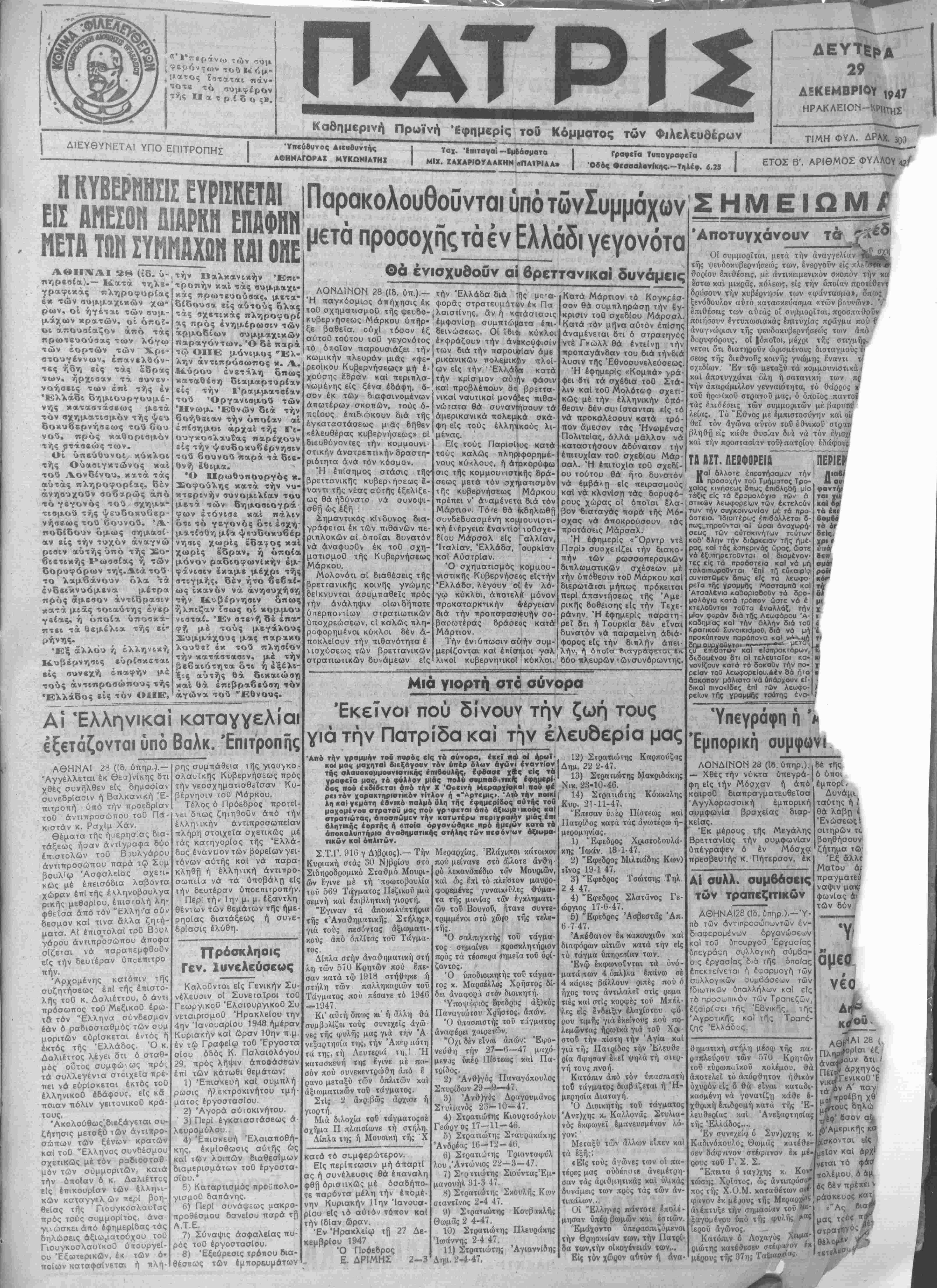 - <α τ ρ ί δ ο ς·. 'θτε ΠΑΤ Δ1ΕΥΘΥΝΕΤΑ1 ΥΠΟ ΕΠΙΤΡΟΠΗΣ -----------^■■■"ε—■■■■■^■■^^■■■■■■^^^^Η Καθημερινή Προϊνή Εφημερίς τού Κόμματος τόν Φιλελεύθερον 'Υικύσυνος Αιβυβυντής ΑΟΗΝΑΓΟΡΑΧ ΜΥΚΩΗΙΑΤΗΙ ■ ΚΥΒΕΡΝΗΣΙΣ ΕΥΡΙΣΚΕΤΑΙ ΕΙΣ ΑΜΕΣΟΝ ΔΙΑΡΚΗ ΕΠΑΦΠΗ ΜΕΤΑ Τίίίΐ ΣΥΜΜΑΧηπ ΚΑΙ ΟΗΕ Ταχ. Ίπιταγαΐ —Εμβάσματα ΜΙΧ. ΖΑΧΑΡΙΟΥΔΑΚΗ* «ΠΑ1ΡΙΑΑ» 29 ΔΙΚΕΜΒΡΙΟΥ 1947 ΗΡΑΚΛΕΙΟΝ-ΚΡΐτΗ£ ΤΙΜΗ ΦΥΛ. ΔΡΑΧ. 3θ0 Γραφεία Τυπογραφεία Όβός Θεσσαλονίκης.-Τηλέφ. 6.25 ΕΤΟΣ Β'. ΑΡ1ΘΜΟΣ ΦΥΛΛΟΥ ΑΘΗΝΑΙ »8 (ίδ. ύ-, πηρεσία).— Κατά τηλε-! γραφικάς πληροφορίας εκ των συμμαχιχών χω- ρων, οί ηγέται των αυμ- μάχων κρατών, οί όποϊ- οι άπουσίαζον άπό τάς πρωτευούσης των λόγω των έορτών των Χρι- στουγέννων, επανελθόν¬ τες ήδη είς τάς εδρας των, ήρχισαν τα συνεν- νοήσεις των επί τής έν Ελλάδι δημιουργουμέ- νης καταστάσεως μβτά τόν σχηματισμόν τής ψβυ δοκυβερνήσεως τού βου νού, πρός καθορισμόν τής στάσεώς των. Οί ύπεύθυνοΐ, κύκλοι τής Ούασιγκτώνος καί τού Λονδίνου, κατά τάς αύτάς πληροφορίας, δέν άνηουχούν σοβαρώς άπό τό γεγονός τού σχημα- τισμοΰ τής ψευδοκυ6βρ- νήσεως τού 6ουνοΰ. 'Α- ποδίδουν όμως σημασί¬ αν είς την τυχόν άναγνώ ρισιν αυτής υπό τής Σο¬ βιετικάς Ρωσσίας η των δορυφόρων της.Δΐά τού το λαμβάνουν όλα 'τά ενδεικνυόμενα μέτρα πρός άμεσον αντίδρασιν κατά μιάς τοιαύτης ένερ γείας, ή όποία ύποσκά- πτει τα θεμέλια τής εί- ρήνης. Έξ άλλόυ ή έλληνική Κυβέρνησις ευρίσκεται είς συνεχή επαφήν μέ τούς άντιπροσώπους τής Ελλάδος είς τόν ΟΗΕ, Βαλκανικήν Επι¬ τροπήν καί τάς αυμμαχι- κάς πρωτευούαας, μετα- δίδουσα είς αύτούς όλας τάς σχετικάς πληροφορί άς πρός ένημέρωσιν των αρμοδίων συμμαχικών παραγόντων. Ό δέ παρά τω ΟΗΕ μόνιμος "Ελ¬ λην άντιπρόσωπος κ. Λ. Κύρου ένετάλη όπως καταθέση διαμαρτυρίαν είς την Γραμματείαν τού Όργανιαμού των Ήνωμ. Εθνών διά την βοήθειαν την οποίαν αί έπίσημοι αρχαί τής Γ ουγκοσλαυίας παρέχουν «ίς την ψευδοκυβέρνησιν τού βουνού ηαρά τα διε- θνή έθιμα. Ό Πρωθυπουργός κ. Σοφούλης κατά την νυ¬ κτερινήν συνομιλίαν τού μετά των δημοσιογρά φων ετόνισε καί πάλιν ότι τό γεγονός ότι έσχη ματίσθη μξα ψκυδοκυβέρ νησίς χωρίς έδαφος καί χωρίς Εδραν, ή όποία μόνον ραδιοφωνΐκήν εμ¬ φάνισιν έκαμε μέχρι τής στιγμής, δέν ήτο βββαί ως ικανόν νά άνησυχήση την Κυβέρνησιν όπως ήλπιζαν ΐσως οί κομμου νισταί. Έν στενή δέ έπα- φή μέ τούς μεγάλους Συμμάχους μας παρακο λουθεϊ έκ τού πλησίον την κατάστασιν, μέ την βεβαιότητα ότι ή εξέλι¬ ξις αυτής θά δικαιώση καί θά έπιβραβεύση τόν άγώνα τού "Έθνους. Αι Έλληνικαι καταγγελίαι έξετάζονται υπό Βαλκ. Έπιτροπής < ΑΘΗΝΑΙ 28 (Ιδ. οπηρ.).- Άγγέλλεται έκ Θεσ)νίκης δτι χθές συνήλθεν είς δημοσίαν συνεδρίασιν ή Βαλκανική Ε¬ πιτραπή υπό την προεδρΐαν τοϋ άντιπροσώπου τοθ Πά κιστάν κ. Ραχίμ Χάν. Θέματα τής ή ιερησ.ας δια τάξεως ήσαν άντίγραφα δύο έπιστολών τοθ Βουλγάρου άντιπροσώπου παρά τώ Συμ βουλ'ω Ασφαλείας σχετι¬ κώς μέ έπεισόδια λαβόντα χώραν επί τής έ^ληνοβουλγα ρικής μεθορΐου, έπισιολή λη- φθεΐσα άπό τόν Έλλην'α ού δεσμον καί τίνα άλλα ζηιή ματα. Αί επιστολαί τοθ Βουλ γάρου άντιπροσώπου άποφα σΐζεται νά παρατιεμφθοθν είς την δευτέραν ύποεπιτρο πήν. Αρχομένης κατόπιν τής συζητήσεως επί τής έπιστο- λής τοθ κ. Δαλιέττου, δ άντι πρόσωπος τοθ ΜεξικοΟ έρω- τα τόν "Ελληνα σΰνδεσμον εάν ό ραδιοσταθμός των συμ μοριτών ευρίσκεται έντός ή έκτός τής "Ελλάδος. Ό κ. Δαλιέττος λέγει δτι δ σταθ- μός οθτος συμφώνως πρός τα συλλεγέντα στοιχεϊα πρέ- ττει νά ευρίσκεται έκτός τοϋ έλληνικοθ έδ