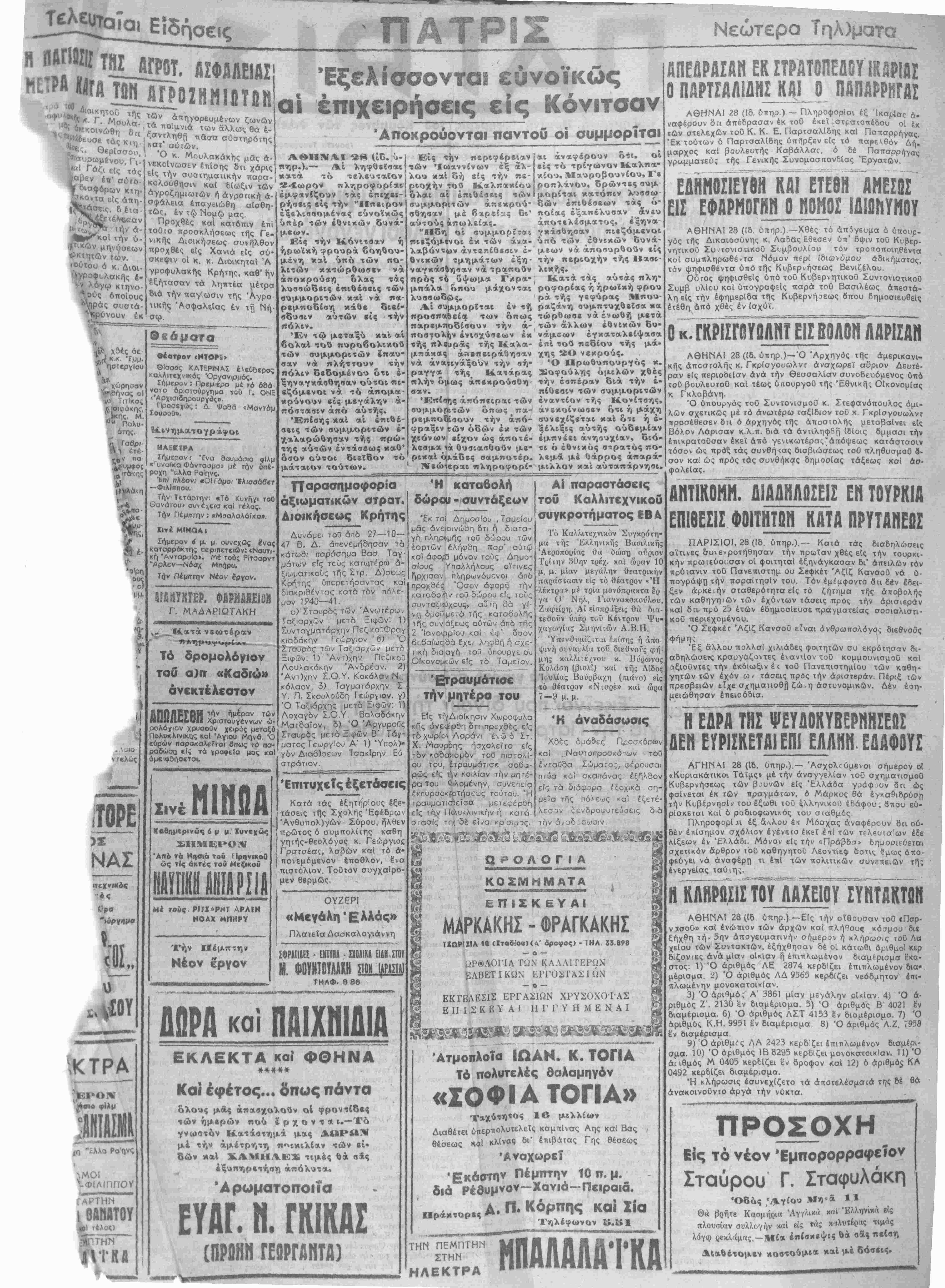 ΑΓΗΝΑΙ 28 (ίδ. ύπηρ.).— Άσχολ<ύμβνοι σήμερον οί «Κυριακάτικοι Τάϊμς» μέ την άναγγελίαν τοθ σχηματισμοθ Κυβερνήσεως τών βουνών είς Έλλάδα γμόφ,υν οα ώς φαίνεται έκ τών πραγμάτων, ό Μάρκος θά έγκσθιδρύσπ την Κυβέρνησίν τού έξωθι τοΰ ξλληνικου έδάφου, 5ηου εύ· ρΐσκεται και ό ροδιοφωνΐνός τού σταθμός Πληροφορίαι έξ α^λου έ< Μόσχας άναφέρουν δα ου¬ δέν επίσημον σχόλιον εγένετο έκεΐ έ τί των τελευταίον έξε λίξεων έν Ελλάδι. Μόνον είς την «Πράβδα» οηϋοοιεύεται σχετικόν άρθρον ιοθ καθηγητοϋ ΛεοντΙεφ δοτις ϊμως άτιο· φεύγει νά άναφέρτ) τι έτχΐ των πολιτικών συνέπειαν τή; ενεργείας ταύης ^ ΑΘΗΝΑΙ 28 ((δ ύπηρ ) —Είς την οίκουσαν τοθ «Πσρ- νασοθ» κα{ ενώπιον τώ ν άρχών κσί πλή°ου* κόσμου διβ ξήχθη ιή· 5ην άπογευματινήι' σήμερον ή κλήρωσις τοθ Λα χείου των Συντοκτών, εξήχθησαν δέ οί κάχωβι άριθμοΐ κερ δΙζον:ες άνά μίαν οΐκΐαν ή έπιπλωμένον διαμέρισμσ ϊκο- στος: 1) Ό άριθμός ΛΕ 2874 κερδΐζει έπιπλωμένον δια- μέριομα. 2) Ό άριθμός ΛΔ 9565 κερδΐζει νεόδμητον εττί- πλωμένην μονοκατοικίαν. 3) Όάρι^μό; Α' 3861 μίαν μεγάλην οΐκΐαν. 4) Ό ά¬ ριθμός Ζ'. 2130 εν διαμέριομα. 5) Ό άριθμός Β' 4021 8ν διαμέρισμα. 6) Ό άριθμός ΛΣΤ 4153 εν διομέρισμσ. 7) Ό άριθμός Κ.Η. 9951 έ'ν διαμέρισμα 8) Ό άριθμός Λ Ζ. 7958 έ διαμέρκτμα 9) Ό άρΐθμίς ΛΑ 2423 κερδ ζει έπιτιλωμένον δισμέρι- σμα, 10) Ό άριθμός 1Β 8295 κεροιζει μονοκστοικίσν. 11) Ό αί ιθμός Μ 0405 κερδίζει δν δροφον κα. 12) ό άριθμός ΚΑ 0492 κερδίζει δναμέρισμα. Ή κλήρωσις έσυνεχίζετο τα άποτελέσματά της δέ β« άνακοινοθντο άργά την νύκτα. ΠΡΟΣΟΧΗ Είς τό νέον Εμπορορραφειον Σταύρου Γ. Σταφυλάκη * -- Όθός 'Αγίου Θά βρητβ Κασμήρια Άγγλιχά *"1 Έ^ληνΐκά βίς πλουσίαν συλλογήν καί είς ίας χιλυΐέρας τιμάς λόγφ ρεκλάμας.-ΙΙΙί» έπίβκβψις θα β&ε, ««(β μέ