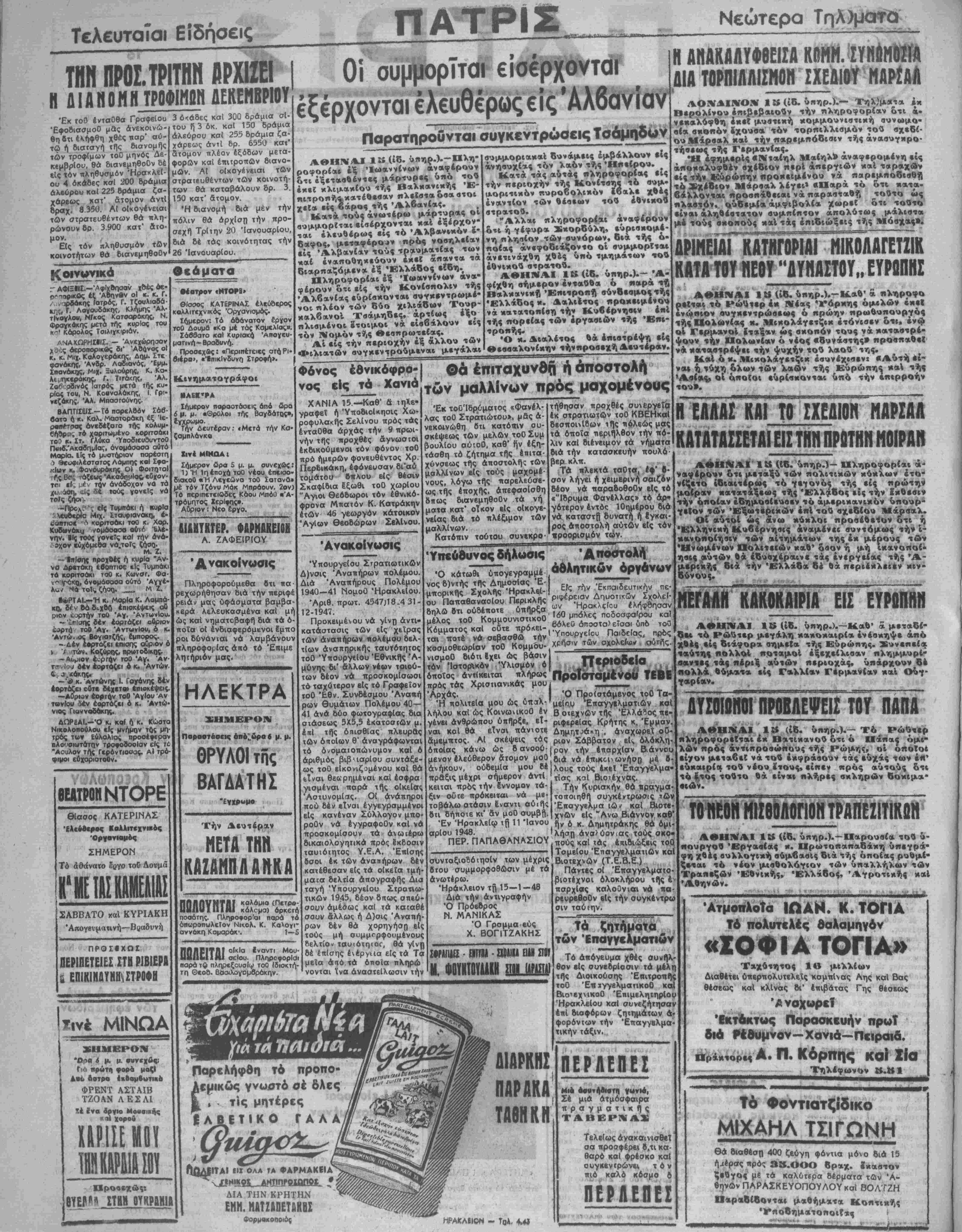 α<φ4βθ«ν ότι· μεταξύ των πολιτικών κύκλων έτθ" νίζετο ίοιαιτέρως τό γ··»όνος τής είς πρώτη* μοίραν καταταξεως τής Έλλάοος είς την έκθεσιν την οποίαν εδημοσίευσεν τό αμερικανικόν υπουρ¬ γείον των Εξωτερικών επί τού σχεδίθυ Ιλάρααλ. Οί αύτοΐ ώς άνω κύκλοΐ προσέθετον ότι ή 'Έλληνική Κυβέρνησις άναμένει συντόμως την ί- ««.νοποίησιν των αίτημάτων της έκ μέρους των 'ΙΙνωμένων αολιτε(ών καθ' όσον ή μή Ικανοποί^ ησις ·ύτών θά έδυοχέραινε τάς ενεργείας τής Ά- μερικής διά την Έλλάδα δέ θα περιέκλειεν κβν¬ ούν ούς. ΗΕΓΑΛΗ ΚΑΚ0ΚΑ1ΡΙΑ ΕΙΣ ΕΥΡΩΠΗΝ ΑΘΗΝΑΙ 15 (ΐβ. ύηηρ.).—Κβθ' α μετ*δί- δ«ι τό Ρώυτερ μεγάλη κακοκαιρία ενέσκηψε άπό χθές είς διάφορα σημεΐα τής Εύρώπης. Συνεπεία ταύτης «ιολλοΐ ποταμοί έξεχείλιααν πλημμυρί- β«ν«ες τάς πέριξ αυτών περιοχάς, ύπάρχουν δέ ηολλά. θύμ»τα είς Γ«λλ(«.ν Γερμανίαν καί Ούγ- γαρίαν. ΔΥΣ01ΟΗΟΙΠΡΟΒΛΕΨΕΙΣ ΤΟΥ ΠΑΠΑ ΑΘΗΙ«ΑΙ 13 (ίο. ύηηρ.).- Τό Ρώυτερ πληροφορίαι έκ Βατΐκανού ότι ό θάπας ομι¬ λών πρός άντιπρασώπους τής Ρώμης, οί οηοΐοι εί/ον μ,εταβεί νά τού έκφράσουν τάς ευχάς των έπ' εύκαιρία τού νέου έτους, είπεν πρός αύτούς ότι τό ί^τος τουτο θά είναι» ηλήρες σκληρών 6οκιμα* 3ΒΗΜΕΡΟΝ Όρβ ί μ. μ. αννεχδ«ΐ Γό ηρύτΐ) φοοα μαζΙ Α»«> οβτρο ΐκΒομβν>τικ6
