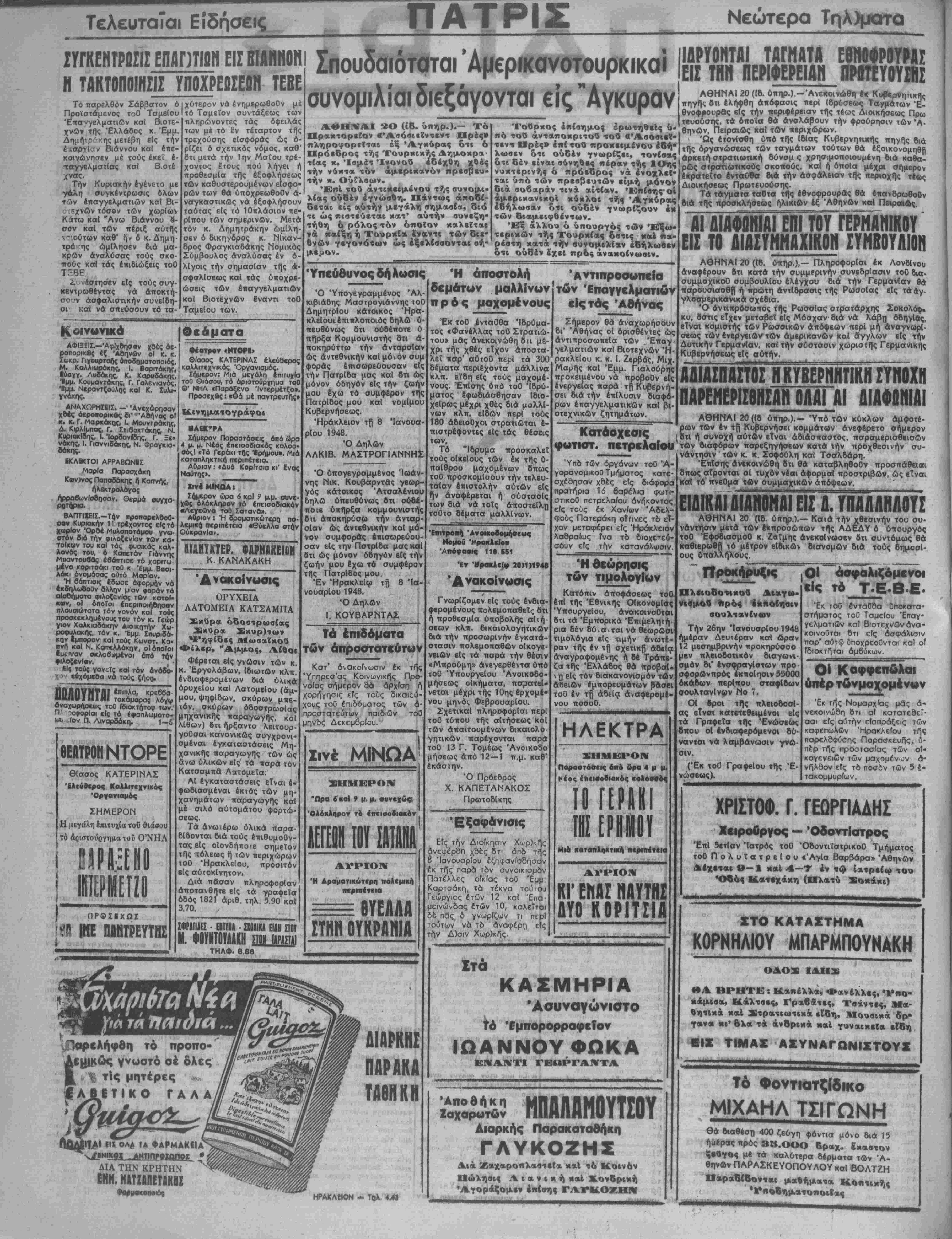 φωτιστ. π<τρ<λα(ου 'Υπδ των όργάνων τού Ά γορανομικοθ Τμήματος κατε σχέσησαν χθές είς διάφορα πρατήρια 16 βαρέλια φωτι στικοθ πετρελαίου ανήκοντος είς τούς έκ Χανίων 'Αδελ φους Πατεράκη οΤπνες τδ εί χον μεταφέρει είς Ήράκλειο λσθραίως Γνα τδ διοχετεύ σόυν είς την κατανάλωσιν Έ θεώρησις των τιμολογΐων Κατόπιν αποφάσεως τοθ|—λ*ιοβοτ*κοβ Αιαγω- έπΐ τής 'ΕΘνικής Οίκονομίας εγπουργβίου, άνακοινοθτα βτι τα 'Εμτίορικά Έπιμεληιή ρια δέ ν δύνανται νά θεωρώσΐ τιμολόγια είς τιμήν Ανωτέ¬ ραν τί)ς Ιν τή σχετικβ αδεία άναγραφομένης ή δέ Τράπε ζα τής Ελλάδος θά προβαί ) είς τόν διακανονισμόν τώ1 άοειών ίμπορευμάτων ράσε τοθ έν τή άβίΐα άναφερομέ- νου ποσοθ. ΗΛΕΚΤΡΑ ΣΗΜΕΡΟΝ Παραοτάοεις όπό ωρα 4 υ μ, ><έος έηΐιοοβιακός κολοαοο* ΤΟ ΓΕΡΑΚ Ι ΕΡΗΜΟΥ Μιά καταηληκτική ηΐριπέτεια ΑΥΡΙΟΝ ΚΓ ΕΝΑΣ ΝΑΥΤΗΣ ΔΥΟ ΚΟΡΙΤΣΙΑ Στά ΚΑΣΜΗΡΙΑ 'Ασυναγώνιστο Τό Εμπορορραφειον ΙΩΑΝΝΟΥ ΦΩΚΑ ΕΝΑΝΤΙ ΓΕΩΡΓΑΝΤΑ ΗΡΑΚΛΕΙΟΝ - Τολ, 44» ΗΠΑΛΑΗΟΥΤΣΟΥ 'Δπο β ή Κ η Ζαχαρωτών Αιαρκής Παρακαταθήκη ΓΛΥΚΟΖΗΣ Δια ΖαχαροΑλαβτεία καί τό Κοινόν Πώλησις Λ ι α ν ι κ ή Μ«1 Χ,ονδρική Άγοράζομεν έηίοης ΓΛΥΚΟΧΗΝ ΑΘΗΝΑΙ 20(18. οπηρ.).—Άνεκοινώθϊ} έκ Κυβερνητικήν ττηγτ}ς βτι ελήφθη απόφασις «βρί Ιδρύσεως Ταγμάτων Έ- θνοφρουρθς βίς την περιφέρειαν τής τέως Διοικήσεως Πρω τβυούσης, τα όποΐα θά άνσλάβουν την φρούρησιν των Α¬ θηνών, Πειραιώς καί των πβριχώρων. Ώς έτονίσθη υπό τής ιδίας Κυβερνητικάς πηγί)ς διά *τ)ς οργανώσεως των ταγμάιων τούτων θά έξοικονομηθ{| άρκετή στρατιωτική δύνσμ ς χρηοιμοποιουμένη διά καθα¬ ρώς στρατιωτικούς σκοπούς, καί ή όποΐα μέχρι σήμερον έκρβτβΐτο ένταθθα διά την ασφάλειαν τής πβριοχής τέως Διοικήσεως Πρωτευούσης. Τα τάγματα ταθτα τής έθνοψρουράς θά έπανδρωθοθν βιά τής προσκλήσεως ήλικιων έξ Αθηνών καί Πειραιώς. ΑΙ ΔΙΑΦΟΡΑΙ ΕΠΙ ΤΟΥ ΓΕΡΜΑΜΙΚΟΥ ΕΙΣ ΤΟ ΑΙΑΣΥΗΗΑΧ1ΚΟΗ ΣΥΜΒΟΥΛΙΟΝ ΑΘΗΝΑΙ 20 (ίβ. οπηρ.),— Πληροφορίαι έκ Λονδίνου άναφέρουν βτι κατά την συμμερινήν συνεδρίασιν τοθ δια- συμμσχικοθ ουμβουλίου έλέγχου διά την Γερμανίαν θά παρουσιασθή ή πρώτη αντίδρασις ΤΓ]ς Ρωσσίας είς τα άγ- γλοσμερικανικά σχέδια. Ό άνηπρόσωτιος τί)ς Ρωσσίας στρατάρχης Σοκολόφ. κυ, όστις είχεν μεταβεΐ είς Μόσχαν βιά νά λάβπ δδηγίας, είναι κομιστής των Ρωσσικών άπόψεων περί μή άναγνωρΐ- σεως των ένεργειώ/ των άμερικανων ΚαΙ άγγλων είς την Δυτικήν Γερμανίαν, καί την σύστασιν χωριστής Γερμανικής Κυββρνήσεως είς αυτήν. ΑΔΙΑΣΠΑΣΤΟΣ ΗΚΥΒΕΡΗΗΤΙΚΗ ΣΥΝΟΧΗ ΠΑΡΕΜΕΡΙΣ8ΗΣΑΗ ΟΛΑΙ ΑΙ ΔΙΑΦΟΝΙΑΙ ΑΘΗΝΑΙ 20 (ίδ ύ«ηρ.).— "Υπό των κύκλων άμφοτέ- ρων των έν τή Κυβερνήσει κομμάτων άνεφέρετο σημερον Οτι ή συνοχή αυτών βΐναι άβιάσπαστός, πσραμερισθεισών των διαφόρων παρεξηγήσεων κατά την προχθεσινήν συ¬ νάντησιν των κ. κ. Σοφούλη καί Τσαλδάρη. ΈτιΙσης ανεκοινώθη 8τι θά καταβληθοθν προσπάθειαι δπως αΤρονται αί τυχόν νέαι αφορμαί προστριβών, ώς είναι κα( τό πνεθμα των συμμαχικών άπόψεων. ΕΙΔΙΚΑΙΔΙΑΝΟΜΑΙ ΕΙΣ Δ. ΥΠΑΑΑΗΑΟΥΣ ΑΘΗΝΑΙ 20 (Ιδ. ύπηρ.).— Κατά την χθεσινήν τού συ¬ νάντησιν μετά των εκπροσωπών τής ΑΔΕΔΥ δ όπουργός τοθ ΈφοίιασμοΟ κ. ΖαΤμης ανεκοίνωσεν ότι συντόμως θά καθιερωθή τό μέτρον είδικών Βιανομών διά τούς οημοσί- ους ύπαλλήλους. 7θΙ ασφαλιζόμενοι «Ις τα Τ.Ε.Β Ε. Έκ τοθ ίνταθσα δποκατα- στήματος τού Ταμείου Έπαγ- γελματιών καϊ Βιοτεχνών ανα¬ κοινούται βτι είς άσφάΛισιν παρ' αύΥω υποχρεούνται καί οί αμβύκων. νι«μου πρός σουλτανίνων Την 26ην Ίανουαρίου 1948 ημέραν Δευτέραν καΐ Ωραν 12 μεσημβρινήν ηροκηρύσσο μέν πλειοδοτικόν διαγωνι¬ σμ