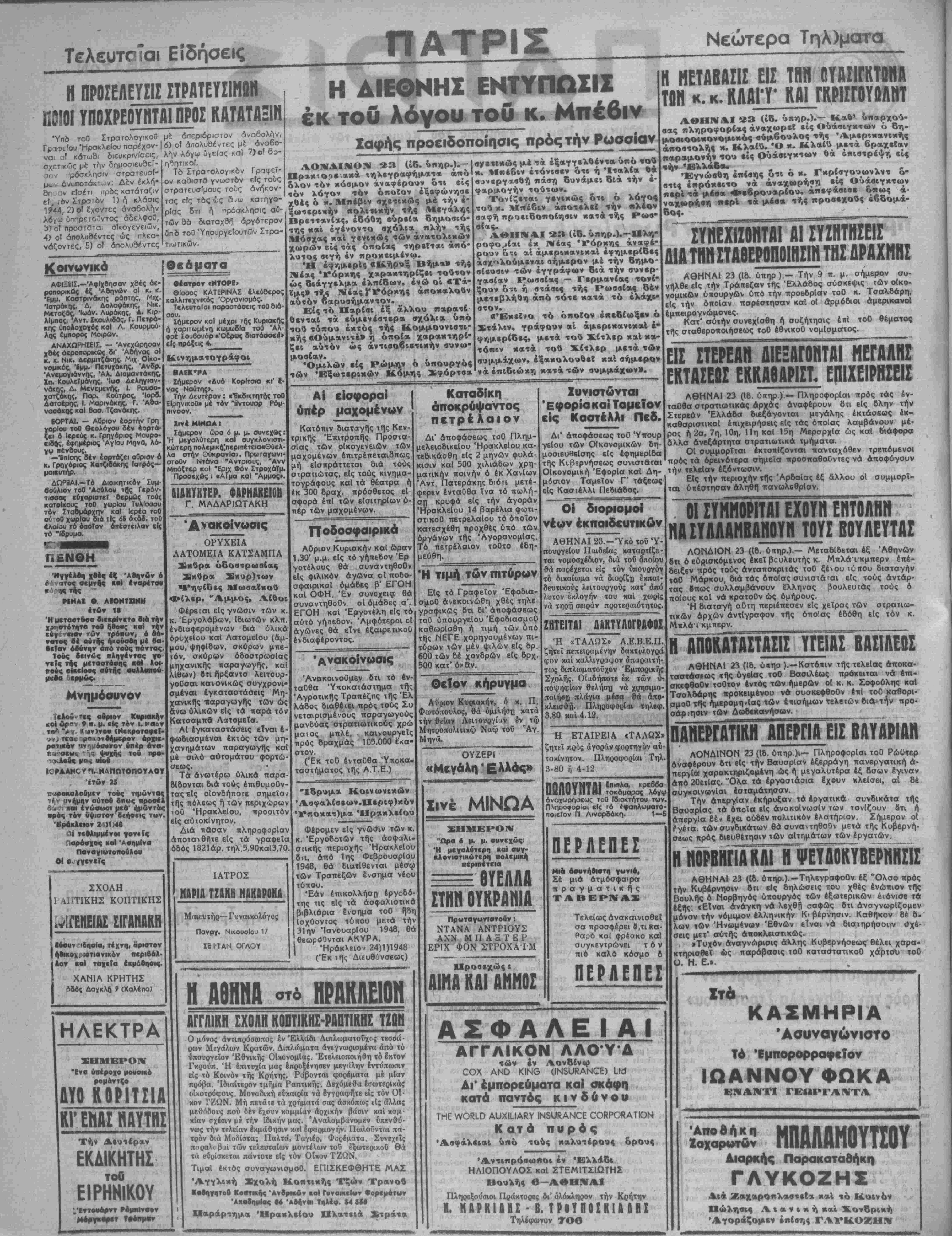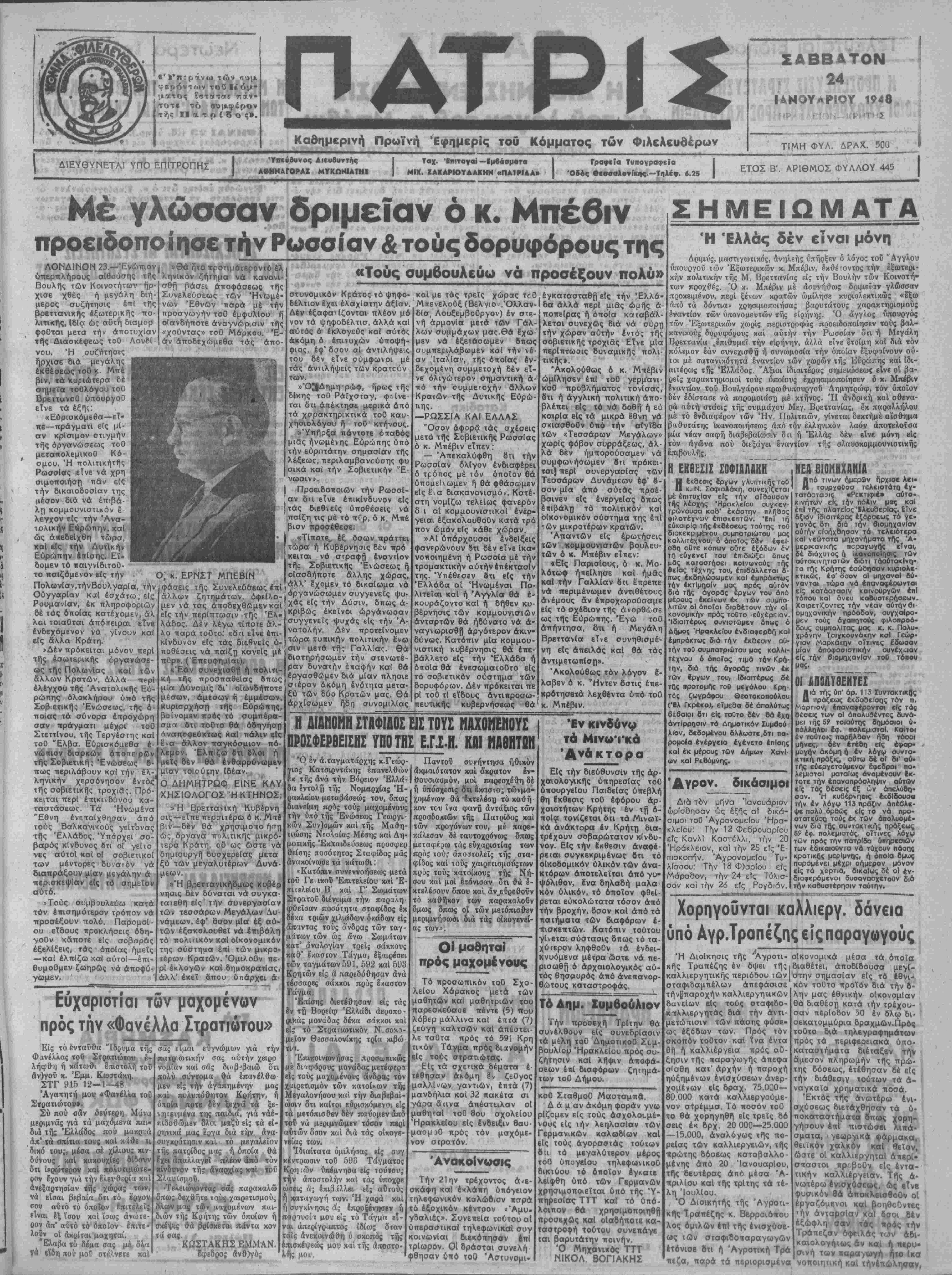 ληνικήν χερσόνησον έντό< τής σοβιετικάς τροχιάς. Πρό¬ κειται περί επικινδύνου κα¬ ταστάσεως. Τα Ήνωμένα "Εθνη ένετταΐχθησαν άπό τούς Βαλκανικούς γεΐτονας τής Ελλάδος. 'Υπσρχει σο- βαρός κΐνδυνος 6τι οί γεΐιο νες αύτοι καί οί σοβιεπκοί των μέντορες δυνατόν νά διαπράξουν μίαν μεγάλην ά περισκεψΐαν είς τό σημείον α,ύτό. συμβουλεύω κατά τόν έπισημότερον τρόπον νά προσέξουν πολύ. ΠαρομοΙ- ου εΐδους προκλήσεις όδη- γοθν κδποτε είς σοβαράς έξελίξεις, τάς οποίας ημείς —καί έλπΐζω καΐ αύτοι—έπι- θυμοθμεν ζωηρώς νά αποφύ¬ γωμεν. σθή βάσει αποφάσεως τής Συνελεύσεως των 'Ηνωμέ- νων Εθνών παρά με την προαγωγήν τοθ έμφυλίου ή οιανδήποτε αναγνώρισιν τής «χούντσς» τοθ Μάρκου. Ε¬ άν άποδεχώμεθα τάς άπο- «Τούς συμβουλεύω νά προσέξουν πολύ» Ο; κ. ΕΡΝΣΤ ΜΠΕΒΙΝ φάσεις τής Συνελεό&εως επί άλλων ζητημάτων, οφείλο¬ μεν νά τάς άποδεχθώμεν κσΐ είς την περίπτωσιν τής Ελ¬ λάδος. Δέν λέγω τΐποτε άλ- λο παρά τοθτο: «δτι είνε επι¬ κίνδυνον είς τάς διεθνεΐς ύ- ποθέσεις νά παίζη κανείς μέ πθρ». (ΈπευφημΙαι). «Εάν συνεχισθή ή πολιτι- κή τής προσπαθείας βπως μΐα Δύναμις δι" οίωνδήποτε μεσων, άμέσων *| έμμέσων κυρισρχήστ) τής Εύρώπης βοΐνομεν πρός τό συμτΐέρα- σμα Οτι τουτο θά οδηγήση αναποφεύκτως καΐ πάλιν είς ένα άλλον παγκόσμιον πό¬ λεμον. 'ΕλπΙζω 6τι δλοι ή μεΐς δέν θά ένθαρρύνωμεν μίαν τοιούΐην Ιδέαν. Ο ΔΗΜΗΤΡΩΦ ΕΙΝΕ ΚΑΥ ΧΗΣΙΟΛΟΓΟΣ "Η ΚΤΗΝΟΣ »Ή Βρεττανική ΚυβΙρνη σις—εΤπε περαιτέρω ό κ. Μπέ βιν—δέν θά χρησιμοπο ήαη ώς,οργανα πολιτικάς μικρό- τερ'α Κράτη, ο6 ως ωστε νά δημιουργή δυσχερείας μετα ξύ των μεγαλυΐέρων Δυνά- μεων. »'Η βρεττανικήδμως κυβέρ νησίς δέν δύναται νά συγκα¬ τατεθή είς την συνεργασίαν των τεσσάρων Μεγάλων Δυ· νάμεων, έφ' δσον μία έξ αυ¬ τών έξακολουθεΐ νά επιβάλη τό πολιτικόν καΐ οικονομικόν της σύστηαα επί των μικρο- τέρων Κρατών. Όμιλοθν πε ρί έκλογών καί δημοκρατίας, άλλ' έκεΐ απού ύπάρχει α¬ στυνομικόν Κράτος τό ψηφο- δέλτιον Εχει ελαχίστην αξίαν. Δέν έξαφα Ιζονται πλέον μό νόν τα ψηψοδέλτισ, άλλά καί αύτάς ό έκλογεύς καΐ σύτός άκόμη ό έπιτυχών ύποψή- φιος, έφ' δαον αί αντιλήψεως τού δέν είνε ούμφωνοι μέ τάς άνιιλήψεις των κρατούν των. »Ό;§Δημη'ρώφ, ήρως τής δίκης τοθ Ράϊχσταγ, φ.ίνε ται δΐι απέκτησε μερικά άπό τα χσρακτηρικτικά τοθ καυ- χησιολόγου ή τοθ κτήνους. »Ύπήρξα πάντοτε ότΐαδός μιάς ήνωμένης Εύρώπης υπό την εύρητάτην σημασίαν τής λέξεως, τιεριλαμβανούσης φυ σικά καΐ την Σοβιετικήν Έ¬ νωσιν». | Προειδοποιών την Ρωσσί¬ αν δα είνε επικίνδυνον είς [τάς διεθεΐς ύποθέσεις νά παίζη τις μέ τό πθρ, ό κ. Μπέ βισν προσέθεσε: «Τίποτε.. έξ δσων πράττει τώρα ή Κυβέρνησις δέν πρό κείται νά στραφή εναντίον τής Σοβιετικάς "Ενώσεως ή οΐασδήποτε άλλης χώρας, άλλ' έχομεν τό δικαίωμα νά όργανώσωμεν συγγενεΐς ψυ¬ χάς είς την Δύσιν, δπως α¬ κριβώς έκεΐ ν οί ώργάνωσαν συγγενεΐς ψυχάς είς την Α¬ νατολήν. Δέν προτείνομεν τώρα τυπικήν πολιτικήν ενω σιν μετά τής Γαλλίας. θά διατηρήσωμεν την στενωτέ- ραν δυνατήν επαφήν καΐ θά έργασθώμεν διά μίαν πλησιε σιεράν άκόμη ένότητα μετα- ξύ των δύο Κρατών μας. θά αρχίσωμεν ήδη συνομιλΐας »· Εΰχαριστίαι τδν μαχομένων πρός την «Φανέλλα Στρατιώτου» Είς τό ΙνταΓιθα "Ιδρνμα τής Φανέλλας τού Στρατιώτου ε¬ λήφθη ή κάτωθι έΊτισιολή τού άν)γοϋ κ. Έμμ. Κωστάκ,η. ΣΤΓ 915 12—1—48 Άγαπητή μόν «Φανέλλα τού Σϊρατιώτου». Σύ πού σόίν δβύτβοη Μάνα μβριμνας γιά τα μαχόμενα παι¬ δία τής Ελλάδος πού μακρυά άη' χά αηίχια τους χά. κάθε τι οιχό χον;, μέσα σέ χιλίους κι