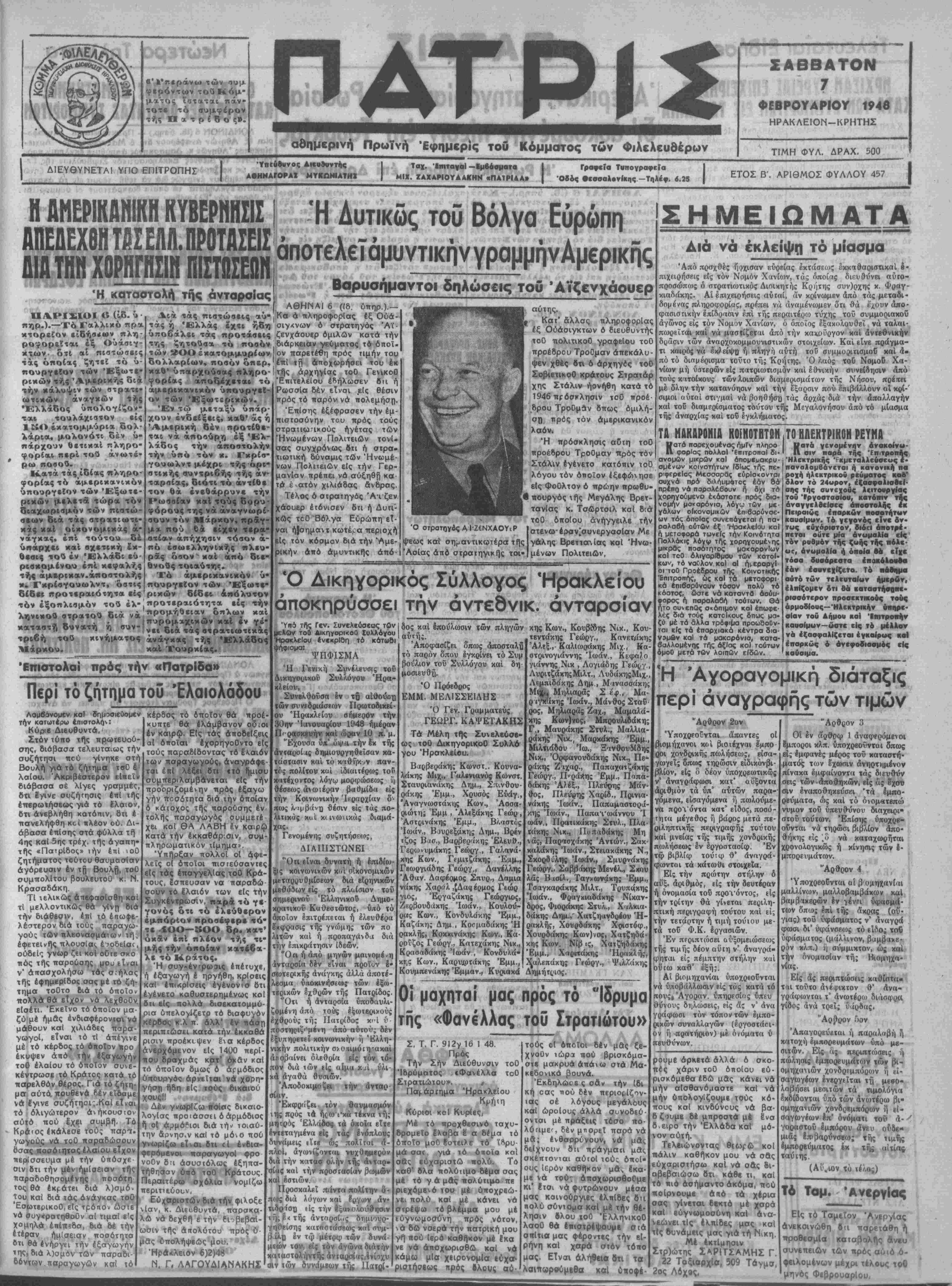 κτορείον εΐ6ήβ<ων πλη- ροφορείται έξ Ούάαιγ- κτ«ων· ότι αί πιστώσεις τάς οποίας ζητεί τό υ¬ πουργείον των Εξωτε¬ ρικών τής Άμερικής διά την κάλυψιν των στρατι¬ ωτικών άναγχών τής Ελλάδος υπολογίζον- τοΜ τουλάχιστον είς 1&&Ο έκατομμύρια δολ- λάρια, μολονότι δέν ύ- πάρχουν θετικαί πληρο¬ φορίαι περί τού ανωτέ¬ ρω ηοσού. Κατά τάς ιδίας πληρο¬ φορίας τό αμερικανικόν υπουργείον των Εξωτε¬ ρικών μελετά τώρα τόν οιαχωρισμόν των πιατώ- σεων διά τάς στρατιωτι¬ κάς καΐ νάγκας, Διά τάς πιστώσεις αύ- Βαρυσήμαντοι δηλώσας τού Αϊζενχάουερ οικονομικάς α- επί τούτου δέ ύηάρχει καί αχετιχή έκ¬ θεσις τού έν Ελλάδι εΰ- ρισκομένου επί κεφαλής τής άμερικαν.αποστολάς *. Γκρίσγουωλντ, όστις δίδει προτεραιότητα είς ΑΘΗΝΑΙ 6 ((8. ύπηρ.).— Κα ά πληροφορίας έξ Ούά- τάς ή Ελλάς έχβι ήδη'σιγκνων ό στρατηγός Άΐ· ύποβάλει τάς ηροτάσεις ζενχάουξρ ομιλών κστά την χγι$ ζητούσα τό ποσόν διάρκειαν γεύματος τό όποΐ- των 2ΟΟ έκατομμυρίων [ όν παρετέτ9η πρός τιμήν τού δολλαρίων, ποσόν όπερ, "επί τή άποχωρήσει τού έκ καθ" υπαρχούσας πληρο-! τής άρχηγίας τοθ Γενικοθ φορίας άποδ^χεται τό.ΈπιτελεΙου εδήλωσεν 6η αμερικανικόν υπουργεί¬ ον των Εξωτερικών. Έν τώ μεταξύ ύπάρ- χουν ενδείξεις, καθ* άς ή Άμερική δέν προτίθε- ται νά άποιύρη έξ Ελ¬ λάδος την αποστολήν την υπό τόν κ. Γκρίσ¬ γουωλντ μέχρι τήςόρι- συντριβής τής άν δό ό ά ής ρής ής ταρβίας, διότι τό άντίθε τον θά ένεθάρρυνε την Ρωσσίαν καί τούς δορυ- φόρους της νά άναγνωρί- σουν τόν Μάρκον, πράγ- μ» πού ©ά είχεν τερα¬ στίαν απήχησιν τόσον ά- πό έσωελληνΐχής πλευ- ράς όσον χαΐ άπό διε- Θνούς τοιαύτης. Τό αμερικανικόν υ¬ πουργείον των Εξωτε¬ ρικών δίδει απόλυτον Ρωσσία δέν είναι είς ή θέσιν πρός τό πσρόν νά τΐολεμήση. ΈπΙσης έξέψρασεν την εμ¬ πιστοσύνην τού πρός τούς στραπω'ΐκούς ηγέτας των Ήνωμένων Πολιτειών τονί¬ σας συγχρόνως δτι ή στρα- τιωτική δύναμις των Ήνωμέ¬ νων Πολιτειών είς την Γερ¬ μανίαν πρέπει νά αυξηθή κα¬ τά έ ατόν χιλιάδας άνδρας. Τέλος ό στρατηγός Αί ζεν χάουερ ετόνισεν δτι ή Δυτι¬ κώς τεθ 'Βόλγα Εύρώπη εΤ- ναι ή|σημαντ κωτέ^α περιοχή είς τόν κόσμον διά την Αμε¬ ρικήν άπό άμυντικής άπό- Ό στρατώνος Α Ι'ΖίΝΧΑΟΥιΡ ψεως καΐ σημαντικώτεραι τί|ς Άοίας άπό στραιηγικής τοι- Κατ' άΧλσς πληροφορίας έξ Ούάσιγκτων ό διευθυντής τοθ πολιτικόν γραφεΐου τοθ προέδρου Τροθμαν άπεκάλυ- ψεν χθές 8τι δ άρχηγάς τοθ ΣοβιετικοΟ κράτους Στρατάρ χης Στάλιν ηρνήθη κατά τό 1946 πρόσκλησιν τοθ ττροέ- δρου Τροθμαν δπως ομιλή¬ ση ττρός τόν αμερικανικόν λαόν. 'Η πρόσκλησις αθτη τοθ προέδρου Τροθμαν πρός τόν Στάλιν εγένετο κατόπιν τοϋ λόγου τόν ότιοΐον ίξεφώνησε είς Φοθλτον ό πρώην πρωθυ- ,·τΐουργόςής Μεγάλης Βρετ¬ τανίας κ. Τσώρτσιλ κοί διά τοθ δτίοΐου ανήγγειλε την στενώ-έραν'συνεργαοΐαν Με ·» *Διά νά εκλείψη τό μίαομα Άπό πρσχθές ηοχισαν εύρείας εκτάσεως εκκιθαριστικαί ε- πιχειρήσεις είς τόν Νομόν Χανίων, τάς οποίας διευθύνβι αύτο- προσώπως ό στρατιωτικάς Διοΐκητής Κρήτης συν)ρχης χ. Φραγ¬ κιαδάκης. Αί έπιχειρήσεις αυταί, άν κρίνωμεν άπό τάς μεταδι- δομένας πληροφορίας, πρέπει νά αναμένομεν ότι θά έ'χουν &αο· φασισακήν επίδρασιν επί τής περαιτέρω τύχης τοΰ συμμοριαχοΰ αγώνος είς τόν Νομόν Χανίων, ό οποίος Ιξακολουθεΐ νά ταλαι· πωρεΐται καί νά μαστίζβται άπό την κακούργον χαΐ άνΐεθνΐχήν δρασιν των άναρχοκομμουνιστικών στοιχείον. Καί είνε πράγμα- ό ά έ^ί ή ύ ά ρχ τι καιςιός νά έκ^είψο ό ό δέ χ ργ αύτη τοθ συμμοριτισμου χαί ά- ή Ό Χ ς ψο ή ηγ η μμρμ πό τό διαμέρισμα 