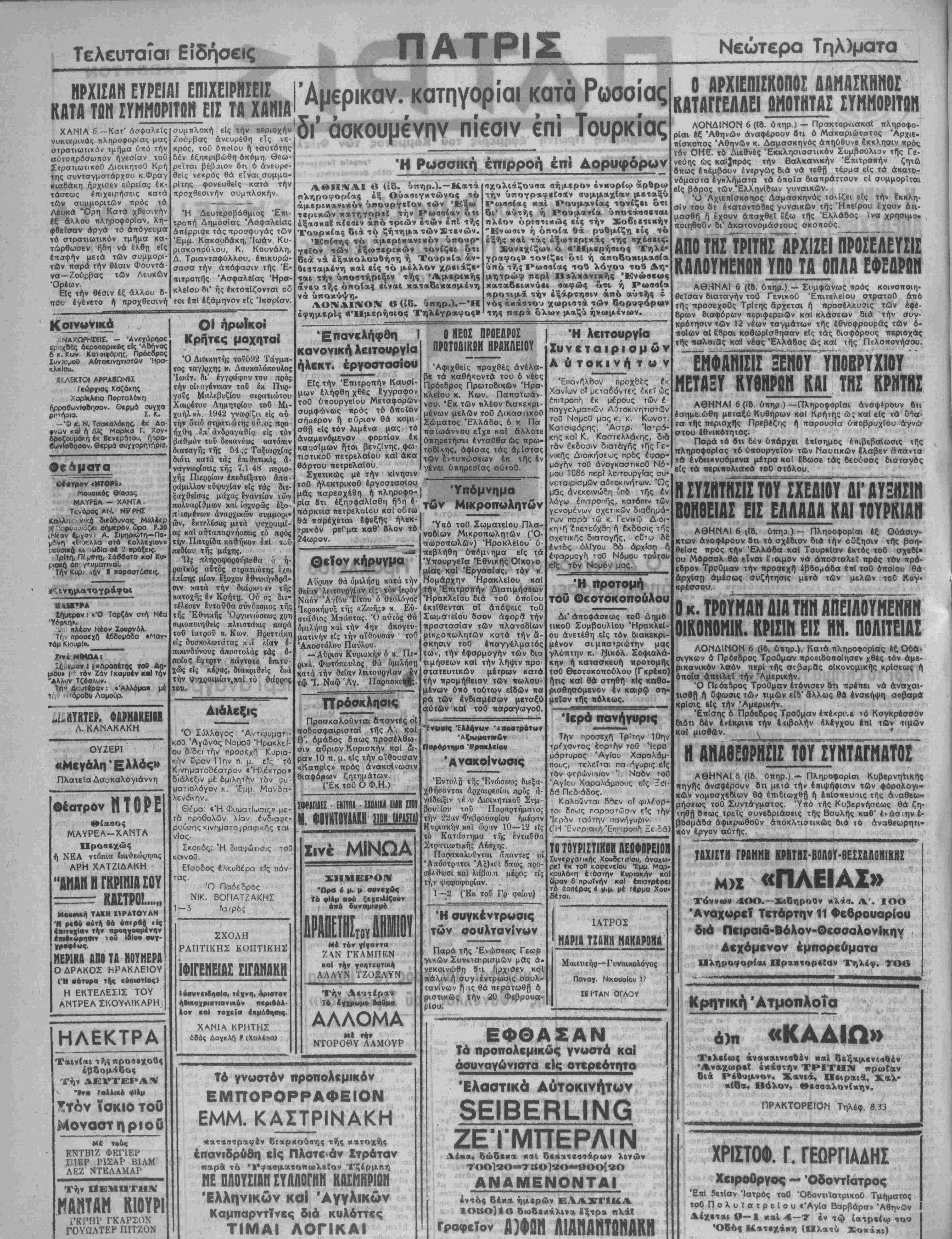 (Ή Ένορ α<ή "Επιτροπή Ξειδά) ΤΟ ΤΟΥΡΙΣ ΤΙΚΟΗ ΛΕΩΦΟΡΕΙΟΝ Συν€ργαπκής Χουδεΐσ'ου, αναχω¬ ρεί έκ τοθ καφενεΐου Έμμ. Μαρ· κουλάκη έ'όσΐην Κυριακήν καί ώραν β πρωϊνήν καί επιστρέψη τό έοπίρας ί υ.μ. μέ Γέρμα Χου· δέται. ΙΑΤΡΟΣ ΜΑΡΙΑ ΤΖ&ΗΚ ΜΑΚ&ΡΟΝα ο--Γυναικολόνος Παναγ. ΝικουοΙου 17 ΙΒΙ'ΤΑΝ ΟΓΛΟΥ ΕΦΘΑΣΑΝ Τα προπολεμικώς γνωστό κα! άσυναγώνιστα είς οτερκότητο Έλαστικά Αυτοκίνητον 3ΕΙΒΕΡυΝ(3 ΖΕΊΜπΕΡΛΙΝ Δε«α* δώδεκα και δεκχτεσσάρων λινών ΤΟΟ]»Ο—ΤΚΟ]*Ο~» 9ΟΟ[2Ο ΑΝΑΜΕΝΟΝΤΑΙ 4ν τος οέκα ήμ«ρών Ε V ΑΣΤ1Κ Α 1Οβθ]1β δωοεκάλινα έξτρα ηλάΐ ΛΙΑΝΑΝΤΟΝΑΚΗ Η ΣΥΖΗΤΗΣΙΣ ΤΟΥ ΣΧΕΔΙΟΥ ΔΙ' ΑΥΞΗΣΙΝ ΒΟΗΘΕΙΑΣ ΕΙΣ ΕΛΛΑΔΑ ΚΑΙ ΤΟΥΡΚΙΑΝ ΑΘΗΝΑΙ 6 (,Ιδ. ύπηρ.).— ΠληοοφορΙαι έξ Ούάσιγ- κτων άνοφέρουν δτι τό σχέδιον διά την οΰξησιν τί|ς βοη¬ θείας πρός την 'Ελλάδα καί Τουρκίαν έκτός τοθ σχε81· ου Μαρσάλ θά είναι έΊοιμον νά άποόταλεΐ πρός τόν πρό¬ εδρον Τροθμαν την προσέχη έβδομάδα επί τοθ όποΐου θά αρχίση άμέσως συζήτησις μετά των μελών τοθ Κογ* κρέσσου. Ο κ. ΤΡΟΥΗΑΗ ΛΙΑ ΤΗίΙ ΑΠΕΪΛΟΥΗΕΗΗΗ ΟΙΚΟΝΟΜΙΚ. ΚΡΙΣΙΗ ΕΙΣ ΗΝ. ΠΟΛΙΤΕΙΑΙ ΛΟΝΔΙΝΟΝ 6 (16. ύηηρ.). Κατά πληροφορίας έξ Ο6ίβ* σιγκων ό Πρόε&ρος Τροθμαν προειθοκοΐησεν χθές τόν αμε¬ ρικανικόν λαόν περί τής σοβαρ&ς οΐκονομικής κρίσεως ή όποΐα άπειλεΐ την Αμερικήν. Ό Πρό&5ρος Τροθμαν ετόνισεν 8τι πρέπει νά άναχαι- τισθή ή υψωσις των τιμών είδ' άλλως θά ένσκήψη σοβαρά κρίσις είς την Αμερικήν. 'ΕπΙσης ό Πρόεδρος Τροθμαν έπέκρινε τό Κογκρέσσον διότι δέν ενέκρινε την επιβολήν έλέγχου έτιΐ των τιμών καί μισθών. ^^_____________ " Η ΑΝΑΘΕ&ΡΗΣΙΣΐθΥ ΣΥίΙΤΑΓΙΙΑΤθΓ ΑΘΗΝΑΙ 6 (Ιδ. ύτιηρ.).— Πληροφορίαι ...Γ.τ...,.....„ πηγής άναφέρουν δτι μετά την έηιψήφισιν των φΰρολογι- κων νομοσχδβΐων θά έπι6ιωχθ|| ή ίπίστιευοις τής ά.αθεω- ρήσεως τοθ Συντάγματος. "Υπό τής Κυβερνήσεως θά ζη- τηθ[) 8αως τρείς συνεδριάσεις της ΒσυλΓ)ς καθ" έ*άσ:ην έ* βδομάδα άφιερωθοθν άποκλ·=ισΐικως 8ιά τό άναθβωρητι- ν Εργον αυτής. ΤαΧΙΖΤΒ ΓΡίΚΗΒ ΚΡΒΤΗΙ-ΒθηθΥ-ΘΕΐΙΑΠΟΗΙΗΚΙ μ>σ «ΠΛΕΙΑΣ»