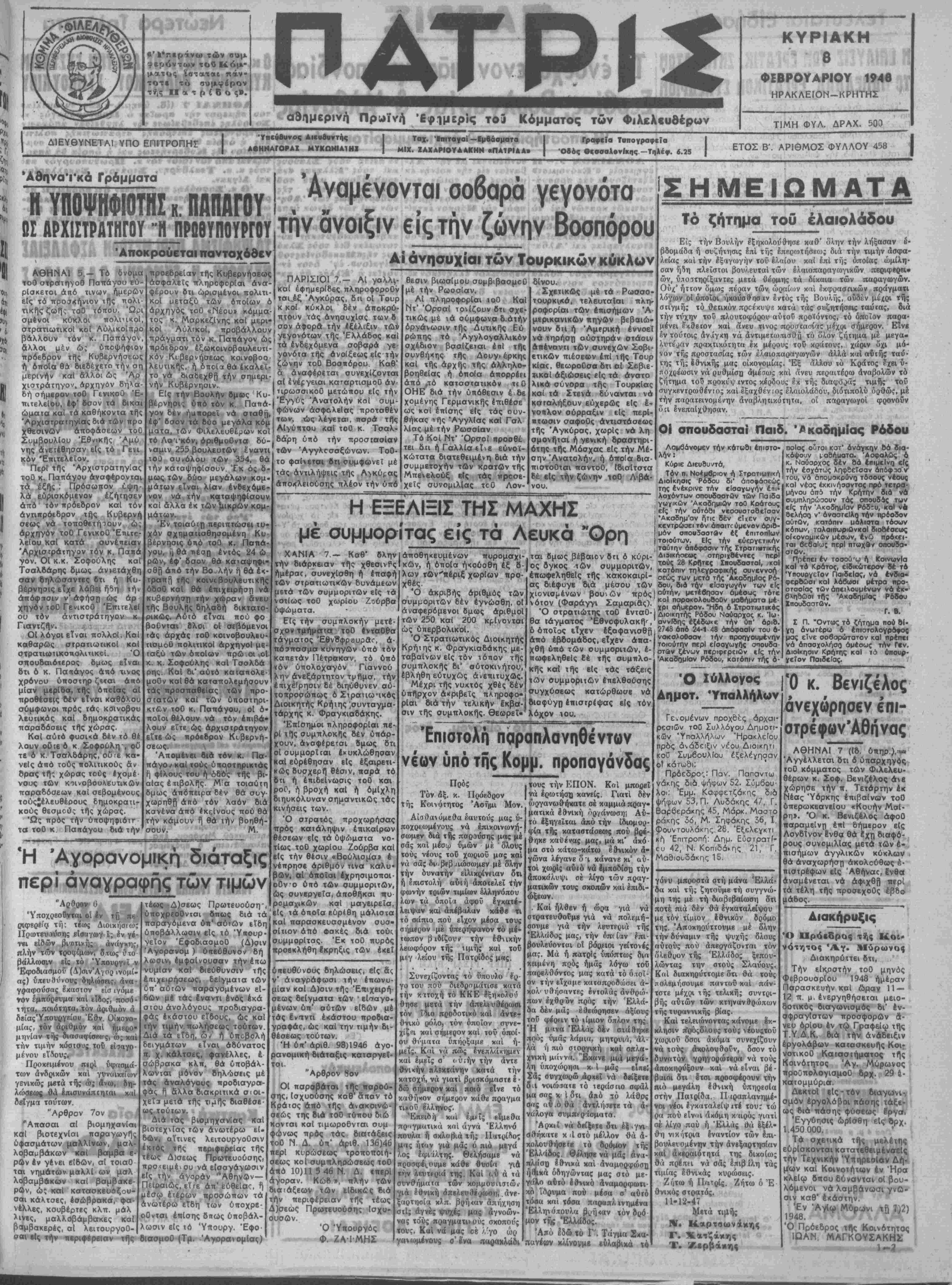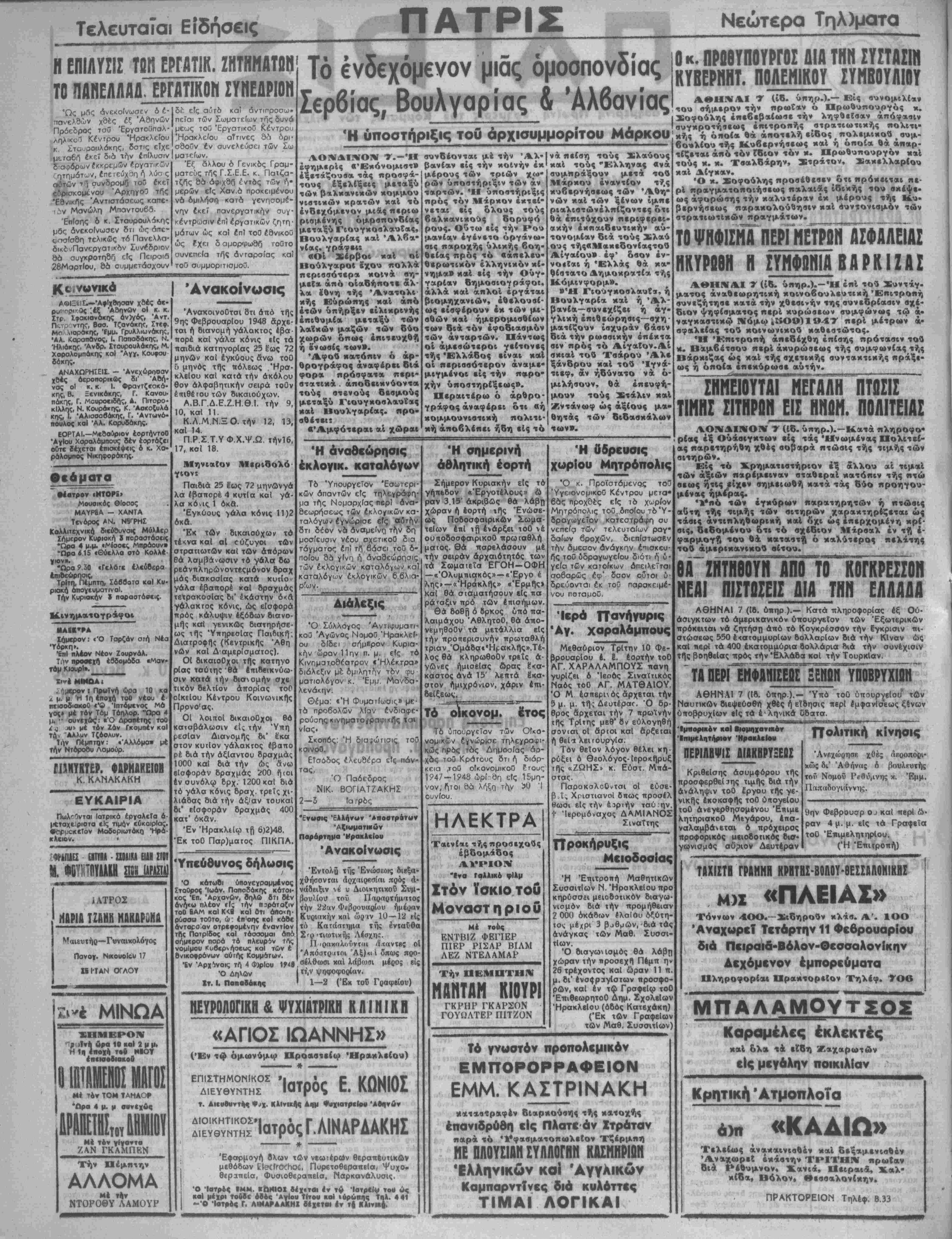 τοθ ΒΑΜ καΙΚ<1 καί δτι άΠο«η- ρύσσω τουτο, ώ- έπ'οης κοί κά&ε όνταρο αν οτρεφομένην εναντίον τΑς Πατρίδος καί τάοοομαι Από σήμερον παρά τό πλευρόν τΛς νομίμου Κυβερνήσεως κοί των έ Ονικοορόνων αυτής Κομμάτων. Έν Άρχ Ίνοις τή 4 Φ)ρΙου Ό Δηλών Ιτ. Ι. Παησδοκης Τό ενδεχόμενον μιάς όμοσπονδίας Σερβίας, Βουλγαρίας & Άλβανίας Ή υποστήριξις τού άρχισυμμορίτου Μάρκου ΛΟΝΔΙΝΟΝ 7.—ΊΙ συνβέονται μέ την Άλ- έφημερΐς «Έκόνομιστ» βανίαν είς την κοινήν έκ ϊξετάζουσα τάς προσφά- τους ,έξελίξεις μεταξύ των βαλκανικών κομμου νιστικών κρατών καί τό ενδεχόμενον μιάς «εριω ρισμένης όμρσπονοίας μεταξύ Γιουγκοσλαυ^ας, Βουλγαρίας καί Άλβα¬ νίας, γράφεΐϊ «Οί Σέρβοι καί οί Βούλγαροΐ έχου πολλά πνρισσότερα κοΐνα αη- μεία άπό οιαδήποτε άλ- λα έθνη τής Άνατολι κης Εύρώπης καί άπό έτών υπήρξεν είλικρινής έπιθυμία μεταξύ των λαΐκών μαζών των δύο χωρών όπως επιτευχθή ή ένωσις των». Άφοΰ κατόπιν ό άρ- θρογράφος άναφέρει διά φορα πρόσφατον περι- στατικά . αποδεικνύοντα τούς στβνούς δασμούς μεταξύ Γιουγκοσλαυία^ καί Βουλγαρίας, προ- σθέτει: «Αμφότεραι αί χώραι μέρους των τριών χω ρών υποστήριξιν των άν ταρτών. Ή ύποστήριξις πρός τόν Μάρκον έκτεί- νεται είς δλους τούς βαλκανικοΰς δορυφό ρους. Ούτω είς την Ρου μανίαν εγένετο οργάνω¬ σις παροχής ύλικής βοη¬ θείας πρός τό «άπελευ- θερωτικόν ελληνικόν κί· νημα» καί είς την Ούγ- γαρίαν δημόσιον ράφοΕ, άλλα καί απλοί εργάται βιομηχανιών, έθελουσί- ως είσφέρουν έκ των μι- αθών καί ήμερομισθίων των διά τόν έφοοεασμόν των άνταρτών. Πάντως οί άμεσώτεροι γείτονες τής Ελλάδος είναι καί οί περισσότερον άναμε- μιγμένοι είς την παρο¬ χήν υποστηρίξεως». Περαιτέρω ό άρθρο- γράφος άναφέρει ότι «ή νά πείση τούς Σλαύους καί τούς "Έλληνας «νά συμηράξουν μετά τού Μάρκου εναντίον τής κυβερνήσεως των Αθη¬ νών κ αί των ξένων ίμπε ριαλιστώνέλπίζοντες ότι θά επιτύχουν περιφερει- ακήν εκπαιδευτικήν αυ¬ τονομίαν διά τούς Σλαύ ούς τήςβΜακεδονίαςτού Αίγαίου» έφ' όσον έν- νοείαι ή Ελλάς θά κα- θίστατο Δημοκρατία τής Κόμινφορμ». »Ή Γιουγκοσλαυία, ή Βουλγαρία καί ή Άλ- βανία—αυνεχίζει ή αγ¬ γλικη επιθεώρησις—β*η· ματίζουν ισχυράν βάσιν διά την ρωσσικήν βπέκτα σιν πρός τό Αίγαΐον.Αί βκιαί τού Ταάρου Άλε ξάνδρου καί τού Ίγνά- τιεφ, άν ηδύνατο νά ό- μιλήσουν, θά έπευφή- μουν τούς Στάλιν καί Ζντάνωφ ώς αξίους μα· κομμουνιστιχή πολιτι· θητάς των διδασχάλων κή αποβλέπει ήδη είς τό των». Ή άναθΐώρησ.ς έκλογικ. κατάλογον Τ6 Υπουργείον Έσωτερι- κών απαντών είς τηλεγράφη- μα τής Νομαρχ/ας περΐ ανα¬ θεωρήσεως των έκλογικών κα- ταλόγωι/ίγνώρισε είς αυτήν δτι δέον ν6 αναμείνη την δή μοσίευσιν νέου σχετικοθ δια β τάγματος δπ! ποίου σά γίνη χ βάσει τοθ 6- άναδεώρησις γ των έκλογικών καταλό·>ων και
