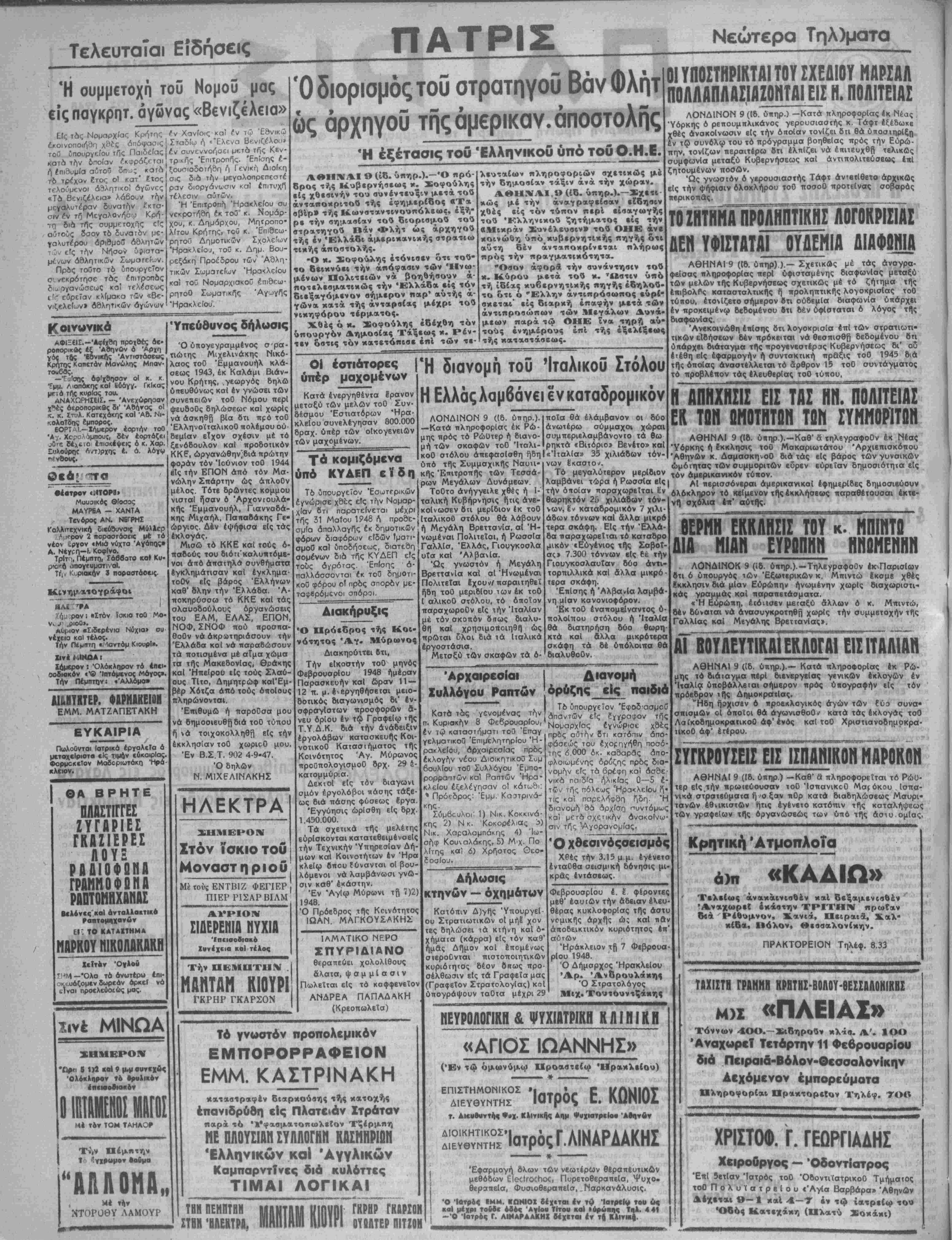 λίτης κα! <5) Χρήστος θεο¬ δ οα (ου. Δήλωσις κτηνών — όχημάτων Κατόπιν Δ)γής "ΥπουργεΙ- ου Στρατιωτικών οί μήέ χον τβς δηλώσβι τα κτήνη καΐ ό- χήματα (κάρρα) είς τόν κα9' ημάς Δήμον κοΐ έπομένως σιεροθνται πιστοποιητικών κυριότητος δέον Οπως προ σέλθωσιν είς τα Γραψβΐα μας (Γραφείον ΣτρατολογΙας) κοΐ ύπογράψουν ταυτα μέχρι 29 .. . . . . , Τδ ύπουρνεϊον Έφοδ'σσμοΟ Κατάτδς Υβνομ<νας την άπαντΟν εΙς ? Κυρ.ακήν 8 Φεβρουαρίου,«Ν ί0 έν τη» καταστήματι τού Επαγ & σ»τήν 8τ| γελματικοΰ Επιμελητηρίου π- - ρακλεΓου, άρχαιρεσΐας πρός εκλογήν νέου ΔιοικητικοΟ Συμ βουλΐου τοθ Συλλόγου 'Εμπο- ρορραπτών κα! Ραπτών Ηρα¬ ί άθ φάσεως τού έχορηγΓίθη ποσό¬ της 6.000 όκ. καθαρδς άπο- φλοιωμένης όρύζης πρδς δια- νομίΊν είς τα βρέφη καΐ άσσε- νικά παιδία ιΊλικίας Ο—5 έ- τ<5ν τής πόλεως Ηρακλείου ΐ' τις καΐ παρελ'ϊφδη ίήδη. Ή διανομ?| σά αρχίση συντόμως καΐ μ£τ6 σχετικήν ανακοίνω¬ σιν τής Άγορανομίας. Ό χβεσινόςσεισμός Χθές την 3.15 μ.μ. εγίνετο ενταύθα σεισμική δόνησις μι κρός εντάσεως. Φεβρουσρίου έ. Ε φέροντες μεθ' έαυιων την αδειαν έευ θέρας κυκλοφορΐας τής άστυ νομικής άρχής ώ; καΐ τ»αν άποβεικτικόν κυριότητος επ" αύτβν Ηράκλειον τή 7 Φεβρουα ρΐου 1948. Ό Δήμαρχος "Ηρακλείου Άρ. Άνδρουλάκης Ό Στρατολόγος Μιχ. Τουτουντζάκης ΗΕΥΡΟΑΟΓΙΚΗ & ΦΥΧΙΛΤΡΪΚΗ Κ Λ1ΗΙΚ Η «ΑΓΙΟΣ ΙΩΑΝΝΗΣ» Προαστείω Ή'ρακλείου) Ίατρός Ε. ΚΩΝΙΟΣ (Έν τώ όμωνύμω οπ·—— ΕΠΙΣΤΗΜΟΝΙΚΟΣ ΔΙΕΥΘΥΝΤΗΣ Αημ ΔΙΟΙΚΗΤΙΚΟΣ» ΔΙΕΥΘΥΝΤΗΣ Ιατρός Γ. ΛΙΝΑΡΔΑΚΗΣ 'Εφαρμογή δλων των νεωτέρων θίρατιευτικων μεθόΒων ΕΙθθΙΐΌθΓΐοίι ΠυρετοθεραπεΙσ, Ψυχο- θερατιεΐα, ΦυσιοθβμαπεΙσ, Ναρκανάλυσις. Ό Ίβτρ4< ιμμ. ΚΟΗΙΟΙ βέχεται έν τι? Ιατρείω τού ΐ έ οι *β Ά ΤΙ ΐ όύ·ιης Τηλ Κλιτικ|. Ό Ίβτρ4< ιμμ. ΚΟΗΙΟΙ βέχεται έν τι? Ιατρεω καΐ μέχρι τονοι *β»ς Άγιον ΤΙτοιι καΐ ·όβύ·ιης Τηλ. 4 41 -Ο Ίατρός Γ. ΑΙΝΑΡΑΑΚΗΧ Μχεται έν τή Κλι| ΒΕΡγΙΗ ΕΚΚΛΗΣΙΣ ΤΟΥ κ. ΜΠΙΝΤΩ ΔΙΑ ΜΙΑΝ ΕΥΡΩΠΗΝ ΗΝΟΜΕΝΗΝ ΛΟΝΔΙΝΟΚ 9 (ίδ. ύπηρ.).—Τηλεγρσφοθν έκ^ΠαρισΙων 6τι 6 ύπουργός ι ών "Εξωτερικών κ. Μπιντώ Ικσμί χθές έκκλησιν διά μίαν Ευρώπην ήνωμένην χωρΐς θιαχωριστι- κάς γραμμάς καί παραπετάσματα. «Ή Εύρώπη, έιόασεν μεταξύ άλλων ό κ. Μπιντώ, δέν δύναται νά άνασυγκροτηθή χωρίς την συμμετοχήν της ΓσλλΙας καί Μεγάλης Βρεττανίας». ΑΤ ΒΟΥΛΕΥΜΑΙ ΕΚΛΟΓΑΙ ΕΙΙΙΤΑΛΙΑΗ πληροφορίας έκ Ρώ- γβνικων έκλογών έν υπογραφήν είς τόν ΑΘΗΝΑΙ 9 (ίδ. ϋτιηρ.).-- Κατά μης τα διάιαγμα περί διενεργείας Ιταλία ύποβάλλειαι σήμερον πρός πρόεδρον τής Δημοκρατίας. "Ηδη ήρχισεν ά «ροεκλογικός αγών των 6ύο συνα· στιισμών οί όποΐοι θά άγωνισθοθν κατά τάς εκλογάς τοθ ΛαίκοδημοκραΐικοΟ άφ'ενός καΐ τοθ Χριστιανοδημρκρα- τΐκοθ άφ' ετέρου. ΣΥΓΚΡΟΥΣΕΙΣ ΕΙΣ ΙΣΠΑΗΙΚΟΗ ΜΑΡΟΚΟΝ ΑΘΗΝΑΙ 9 (Ιδ. ύπηρ.) —Καθ" ά πληροφορεΐται τό Ρώυ¬ τερ είς την πρωτεύουσαν τοϋ Ίστΐανικοϋ Μαι όκου Ισπα- νικά στ'ρατεύματα ϋό ξαν πθρ κατά διαβηλώσβως Μαυρι- τανών έθνΐκιστων ήτις έγένβτο κατόπιν τής καΐαλήψεως των γραφείων τής οργανώσεως των υπό τής άσιυ.ομίας. Κρητική ΆτμοπλοΤα ά)π «ΚΑΔΙΩ» Τελείως άνακάινισθέν καΐ δεξαμενισθέν Αναχωρεί εκάστην ΤΡΙΤΗΝ πρωΐαν β«ά Ρέθυμνον, Χανιά, Πειραια, Χαλ* κίδα. Βόλον, Θεσσαλονίκην. ΠΡΑΚΤΟΡΕΙΟΝ Τηλέφ. 8.33 ΤΑΧΙΣΤΗ ΓΡΑΗΜΗ ΚΡΗΤΗΙ-ΒΟΛΟΥ-ΘΕΙΙΒΛΟΗΙΚΒΣ Μ)ΐ «ΠΛΕΙΑΣ» Τόννων 4ΟΟ.—Χιδηροΰν κλάβ. Α,'. 1ΟΟ Αναχωρ€Ϊ Τετάρτην 11 Φεβρουαρίου διά Πίΐραιά-Βδλον-ΟεσσολονΙκπν Δεχόμενον έμπορεύματα Πληροφορίαι Πρακτορείον Τηλέφ. ΤΟβ ΧΡΙΣΤΟΦ. Γ. ΓΕΩΡΓΙΑΔΗΣ Χειροθργος — Οδοντίατρος Επί 3ετΙαν Ίατρός τοθ ΌβοντιίατρικοΟ Τμήματος τοΟΠολυΐατρβίου ΐΆγΙα Βαρβάρσ» Αθηνώ