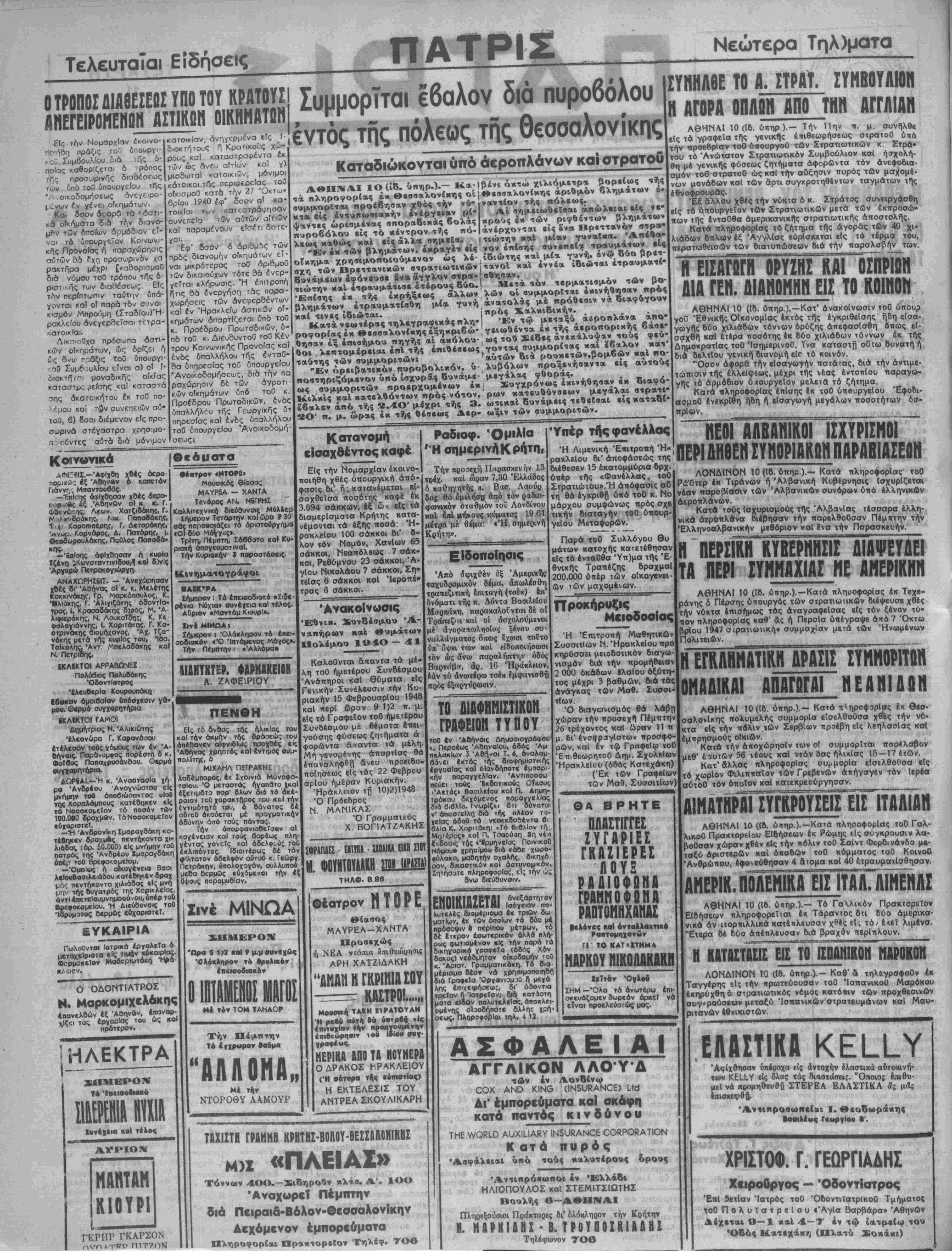 |ελόνε< καΐ ανταλλα«τικο Ραβτομηχανύν ΕΙ ΤΟ ΚΑΤ»ΧτΗΜ* ΜΑΡΚΟΥ ΝΙΚΟΛΑΚΑΚΙΙ ΧεΤτβν ΣΗΜ —Όλο τα ανωτέρω *ηι· σκευάζομ<ν δωρεάν άρκεΤ νό είναι προελεύσεως μας. Νεώτερα Τηλ)ματα ΣΥΝΗΛΘΕ ΤΟ Α. ΙΤΡΑΤ. ΣΥΜΒΟΥΛΙΟΝ Η ΑΓΟΡΑ ΟΠΑΩΝ ΑΠΟ ΤΗΝ ΑΓΓΛΙΑΝ ΑΘΗΝΑΙ 10 (Ιβ. ύπηρ).— Την Ιΐην π. μ. συνήλθε βΐς τα γραφεΐα τής γενικί)ς επιθεωρήσεως στρατοθ ό«δ την προεβρΐαν τοθ ύπουργοθ τθν Σφατιωπκων κ Στρά· τού τό Ανώτατον Στρατιωτικόν Συμβούλιον καΐ ήσχολή- θη μέ γενικής φύσεως ζητήματσ αφορώντα τδν άνεφοδια- σμδν τοθ στρατοθ ώς καΐ την αύξησιν πυρός των μαχομέ¬ νων μονάβων καί των άρτι συγκροτηθέντων ταγμάτων τί|ς έθνοφρουρβς. Έζ άλλου χθές την νύκτα δ κ. Στράτος συνειργάσθη είς τδ υπουργείον τΟν Στρατιωτικών μετά των εκπροσω¬ πών τής ένταθθα άμερικανικής στρατιωτικής άποστολής. Κατά πληροφορίας τδ ζήτημα τής άγορας των 40 χι¬ λιάδων δπλων £ξ Αγγλίας ευρίσκεται ε(ς τό τέρμα τού, περατωθεισών των διατυπώσεων διά την παραλαβήν των. Η ΕΙΣΑΓΩΓΗ ΟΡΥΖΗΣ ΚΑΙ ΟΣΠΡΪΩΝ ΔΙΑ ΓΕΝ. ΒΙΑΝΟΗΙΐΗ ΕΙΣ ΤΟ ΚΟΙΝΟΝ ΑΘΗΝΑΙ 10 (ΙΒ. ύπηρ.),—Κατ' ανακοίνωσιν τοθ υπουρ γθθ Εθνικήν ΟΙκονομΙας έκτδς της εγκριθείσης ήδη είσα- γωγής δύο χιλιάδων τόννων δρύζης απεφασίσθη Οπως ε(- σαχθή καΐ ετέρα ποσότης (κ δύο χιλιάδων τόννων έκ της Δημοκρατίας τοθ ΊσημερινοΟ, ίνα καταστή οθτω Βυνατήή διά δελτΐου γενική βιανομή ε(ο τδ κοινόν. "Όσον άφορθ την εισαγωγήν παΐάτας, διά την αντιμε¬ τώπισιν τής ελλείψεως, μέχρι τής νέας εντοπίου παραγω- γης τδ αρμόδιον ύιΐουργεΐον μελετβ τό ζήτημα. Κατά πληροφορίας έπΐαης έκ τοθ ύπβυργεΐου Έφοοι- ασμοθ ενεκρίθη ήδη ή εΐσαγωγή μεγάλον ποσοτήτων δσ- ηρΐων. «ΕΟΪ ΑΑΒΑΗΙΚΟΓΊΣΧΥΡΙΣΝΟΙ ΠΕΡΙΔΗ6ΕΝ ΣΥΗΟΡΙΑΚΩΗΠΑΡΑΒ1ΑΣΕΟΗ ΛΟΝΔΙΝΟΝ 10 (18. ΰπηρ.).— Κατά πληροφορίας τοθ Ρώυτερ έκ Τιράνων ή Άλβανική Κυβέρνησις (σχυρΐζβται νέαν «αροβΐασνν των Άλβανικών συνόρον όπό έλληνικων άεροπλάνων. Κατά τοθς Ισχυρισμούς τής Άλβανίας τέσσαρα έλλη- νικά άεροπλάνα διέβησαν την παρελθοθσαν Πέμπτην την Έλληνοαλβανικήν μβθόριον καΐ έα την Πσρσσκβυήν. Η ΠΕΡΣΪΚΗ ΚΥΒΕΡΝΗΣΙΣ ΔΙΑΨΕΥΔΕΙ ΤΑ ΠΕΡΙ ΣΥΜΜΑΧΙΑΣ ΜΕ ΑΜΕΡΙΚΗΝ ΑΘΗΝΑΙ 10 (18. οπηρ.).—Κατά πληροφορίας έκ Τεχε- ράνης 6 Πέρσης ύττουργός των στρατιωτικών διέψευσβ χθές την νύκτα επισήμως τάς άναγραφεΐσας ε(ς τόν ξένον τύ¬ πον πληροφορίας καθ' άς ή Περσία υπέγραψε άπδ 7 Όκτω βρίου 1947 οιρατιωτικήν συμμαχίαν με,τά των Ήνωμένων Πολιτειων, Η ΕΓΚΛΗΜΑΤ1ΚΗ ΔΡΑΣΙΣ ΣΥΜγΙΟΡΠΟπ ΟΜΑΔ1ΚΑΙ ΑΠΑΓΟΓΑΙ ΗΕΑΝΙΔΟΗ ΑΘΗΝΑΙ 10(18. ύπηρ.).— Κατά πληροφορίας έκ θεσ¬ σαλονίκης πολυμελής συμμορΐα είσελθοόσα χΛς την νό· κτα είς την πόλιν των Σερβίων προέβη είς λβηλασΐας καΐ έμπρησμούς οΐκιων. Κατά την αποχώρησιν των οί συμμορίαι παρέλαβον μεθ' έϊυτΛν 56 νέους καΐ νιάν δας ήλικίας 15—17 έτών. Κατ'άλλας πληροφορίας συμμορΐα εΐσϊλθοθσα είς τδ χωρίον Φιλιππαΐον των Γρεβενων άπήγαγεν τόν (ερέα αύτοθ τόν οποίον καΐ καΐεκρεούργησαν. ΑΙΜΑΤΗΡΑΙ ΣΥΓΚΡΟΥΣΕΙΣ ΕΙΣ ΙΤΑΛΙΑΝ ΑΘΗΝΑΙ 10 ((8. ύτιηρ.).--Κατά πληροφορίας τοθ Γαλ- λικοθ Πρακτορείου Εΐδήσεων έκ Ρώμης είς σύγκρουσιν λα« βσθσαν χώραν χθέν είς την πόλιν τοθ ΣαΙντ Φερδινάνδο μ«- τσζύ αριστεράν καί οπαδών τοθ κόμματος τοθ ΚοινοΟ Άνθρώπου, εφονεύθησαν 4 αιομα καΐ 40 ετραυματίσθησαν. ΑΜΕΡΙΚ. ΠθϋΐΙΚΑ ΕΙΣ ΙΤΑΑΤλΤμΤηΑΣ ΑΘΗΝΑΙ 10 (18. ύπηρ ).— Τό Γαλλικόν Πρακτορείον Εΐοήσεων πληροφορεΐτοπ έκ Τάραντος ότι 8ύο άμερικα- νικά άν ιτορηιλλικό κατέηλευσαν χθίς εί, τό/ έ<6ΐ λιμένα. Έτερα 8έ δύο άπέπλευσαν διά βραχύν περΐπλουν. Η ΜΤΛΣΤΚΪΣΐΐΤτΤίΣΡΑΝΙΚΟΗ ΜΑΡΟΚΟΝ ΛΟΝΔΙΝΟΝ 10 (18. ύπηρ