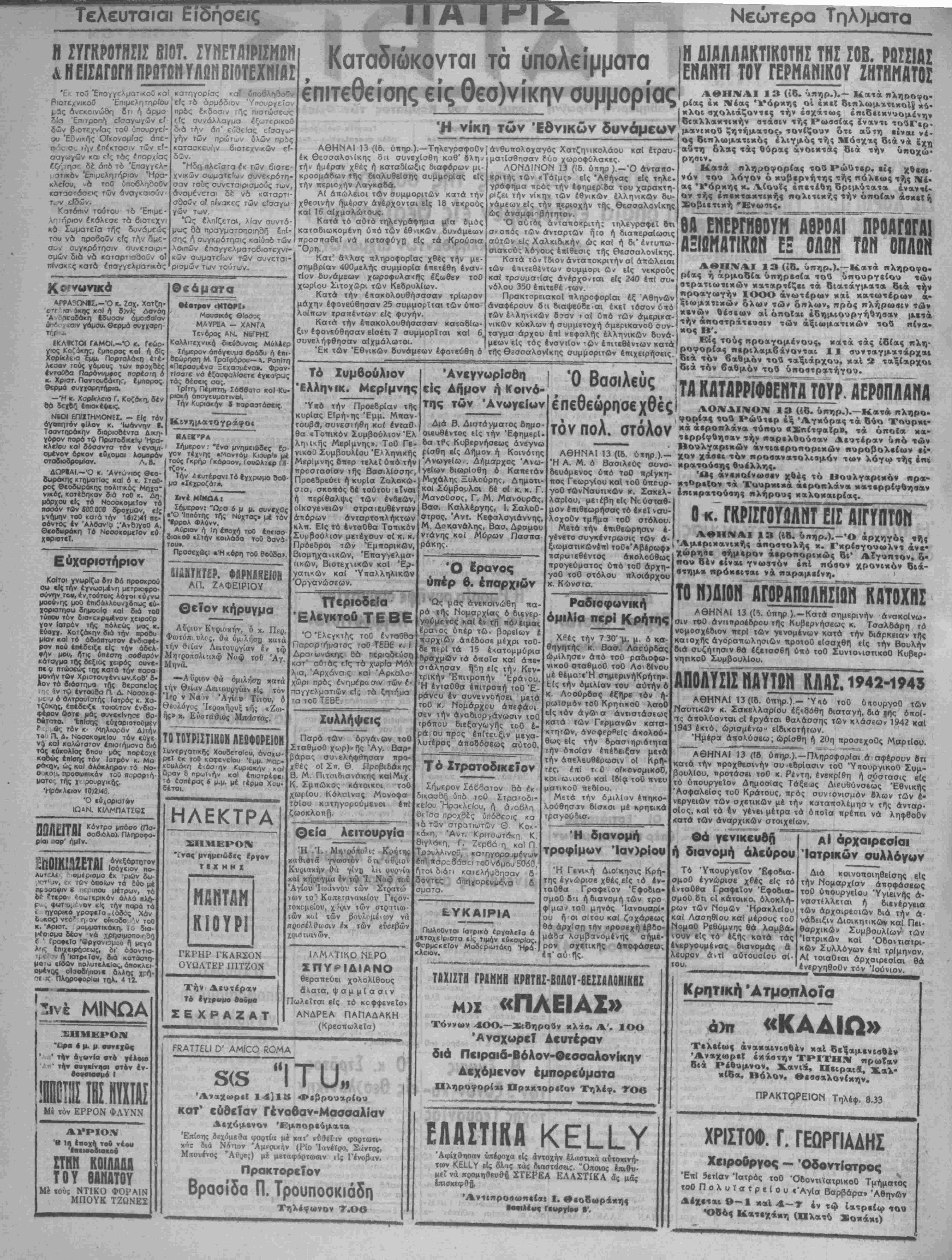 Ι. «9εο8ο·ράκη< V. ΑΘΗΝΑΙ 1» (18. ύηηρ.).—Ό άρχηγός αποστολάς κ. Γκρίσγουωλντ .... . . »ν άεροπορικώς βι' Αίγυπτον, ο· «ου δέν είναι γνωστόν επί πόσον χρονικόν Οΐα- βτημα ηρόκειται νά παραμείνη. ΤΟ ΓΡύΙΟΠ ΰΓΟΡΛΠΟΛΗΣΪθΓΓκηΤΟΧΗΣ ΑΘΗΝΑΙ 13 (ΙΊ. ύπηρ ). — Κατά σημερινήν ανακοίνω¬ σιν τοθ άντιηροέδρου τής Κυβερνήσεως κ. Τσαλδάρη τό νομοσχέδιον ττερΐ των γενομένων κατά την διάρκειαν τί)ς κατοχής άγοραπωλησιών προτοθ εΙσαχθΓΐ ιΐς την Βουλήν διά συζήτησιν θα εξετασθή υπό τοθ ΣυνιονιστικοΟ Κυβερ- νητικοθ Συμβουλίου. ΑΠΟΛΥΣΙΣ ΗΑΥΤΟΗ ΚΑΑΣ. 1942-1945 ΑΘΗΝΑΙ 13 ((δ. ύττηρ.).—Ύιιό τοθ 6«ουργοΟ τβ»ν ΝσυτκΛν κ. Σακελλσρίου έξ'.δόθη βιαταγή, διά ^τ)ς όποί- ις άπολύονται οί εργάται θαλάσσης των κάσ«ων 1942 καί 1943 έκτό, ώρισμένω- εΐδικοτήτων. Ήμέρα άι,ολύσεω; ωρίσθη ή 20η προσεχοθς ΜαρτΙου. ΑΘΗΝΑΙ 13 (ίο. ύιιηρ.).—Π^ΓΐροφορΙαι α αφέρουν β« κατά την τιροχθεσΐνήν συββρΐασιν τοθ 'ΥπουργικοΟ Συμ¬ βουλίου, τιροτάσει τοθ κ. Ρέντη, ενεκρίθη ή σύστασις είς τό υπουργείον Δημοσίας Τάξεος Διευθύνσεως Έθνικής ΆσψαλεΙος τοθ Κράτους, πρός ουντονισμόν βλων των ί· νεργειών των σχετικών μέ την καταπολέμησ ν τί)ς άνταρ· σΐος, καί τα *ν γένει μέτρα τα όιτοΐα τιρέπει νά ληφθοθν <ατά των άναρχικών στοιχείων. Οά γβνικ£υθ(1 ή διανομή άλεύρου Τό "Υπουργείον Έ*οδια- σμοθ εγνώρισε χθες είς τό ένταθθα Γραφείον Έφοδια- σμοθ ΰτι οί κάτοικο. όλοκλή- ρων των Νομώ ν Ηρακλείου καί Λασηθίου καΙ μέρους τού" ΝομοΟ Ρεθύμνης θά λαμβά. νούν είς τό εξής κατά τάς ένεργουμένας διανομάς & ρ λευρον τού. άντΙ αοτουοΐου σ(· ΑΙ αρχαιρεσίαι Ιατρικόν σύλλογον Διά κοινοποιηθεΐσης είς την Νομαρχίαν αποφάσεως τοθ υπουργείον Ύγι'εινΙΙς ό>