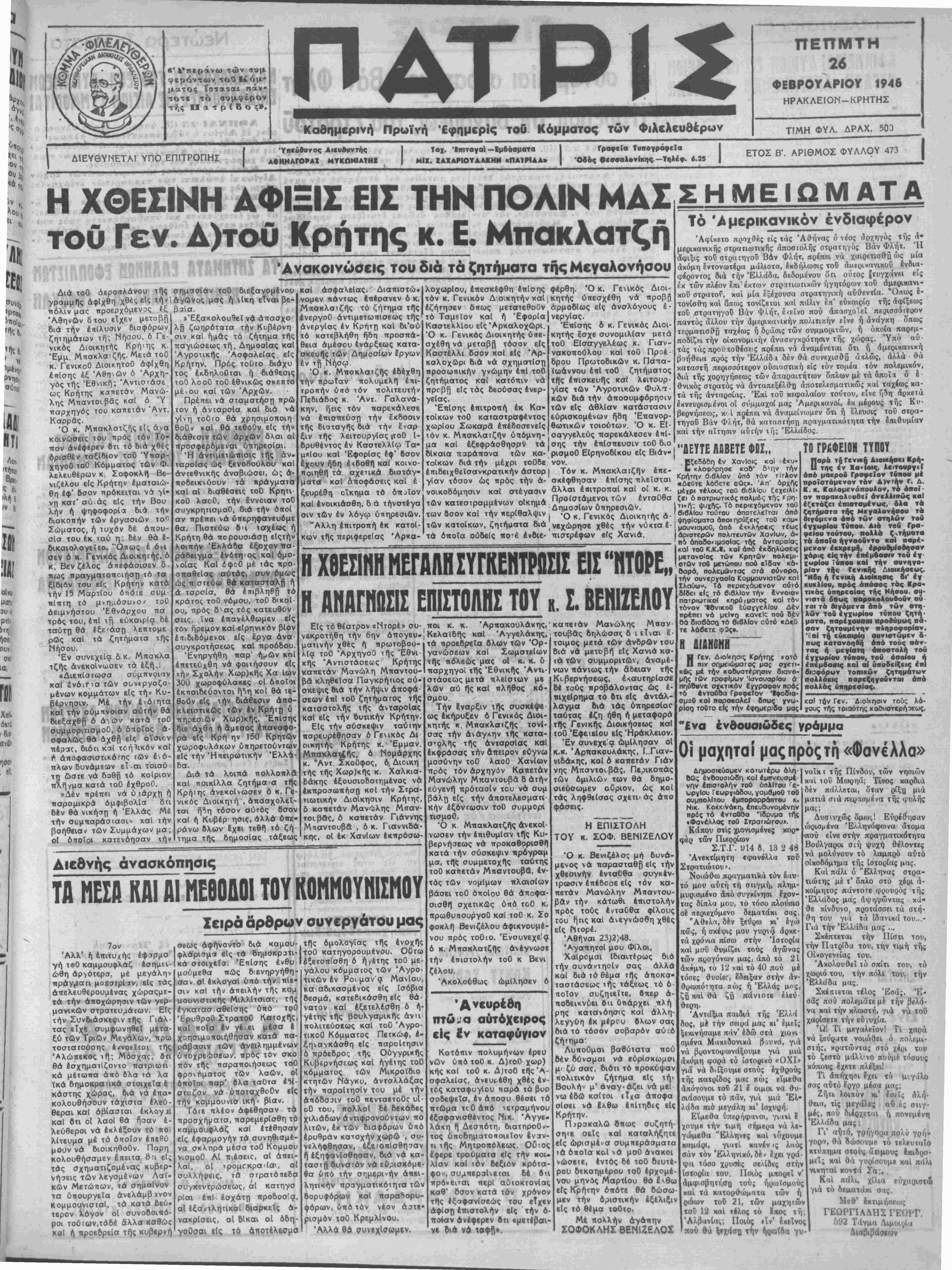 Έμμ. Μτιακλα<ζής. Μετά τοθ κ. ΓενικοΟ ΔιοικητοΟ άφΐχθη έττΐσης έξ Αθηνών ό Άρχη- γός τής 'Εθνική; Άντιστάσε ως Κρήτης καπετάν Μανώ- λης Μπαντοι,βάς καί ό Ύ παρχηγός τού καπετάν Άντ. Καρράς. Ό κ. Μπακλατζής εί^ άνα κοινώσεκ τού πρός τόν Τύ¬ πον ανέφερεν ότι. τό διά χθές δρισθέν ταξΐδιον τοθ 'Υπσρ- χηγοθ τοθ Κόμματος των Φ. λελευθέρων κ. Σοφοκλή" Βε¬ νιζέλου είς Κρήτην έματαιώ- θη έφ' δσον πρόκειται νά >ί·