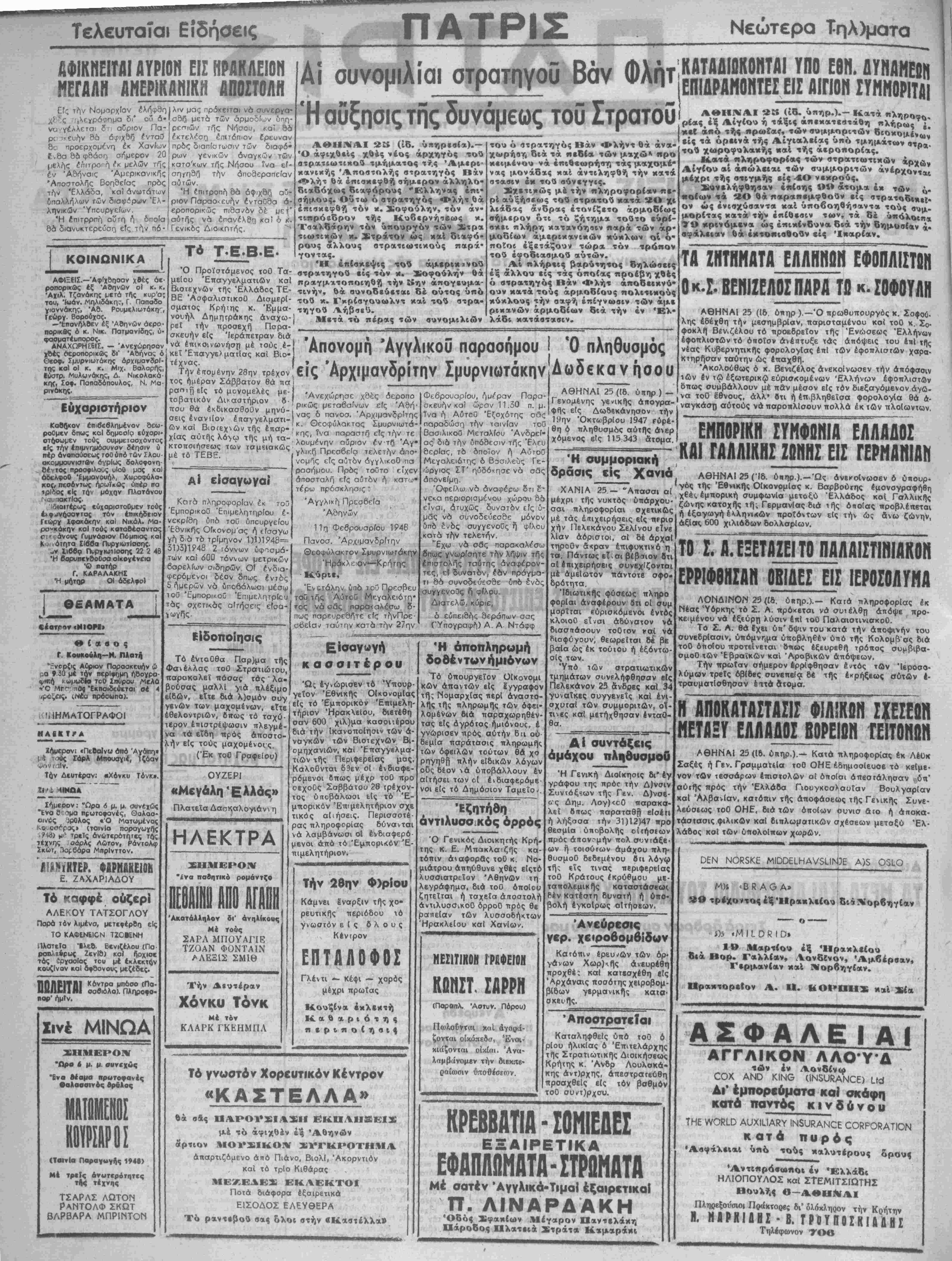 Γενομένης νέ νίκης άπογρα- ναγκσ<,Π αύτούς νά ησροτιλίσουν πολλά έκ των πλοΐωντων. φής είς Δωδεκάνησον την Γ 19ην Όκτωβρίου 1947 ρύρέ- θη ό πληθυσμός αυτής ά>«ρ