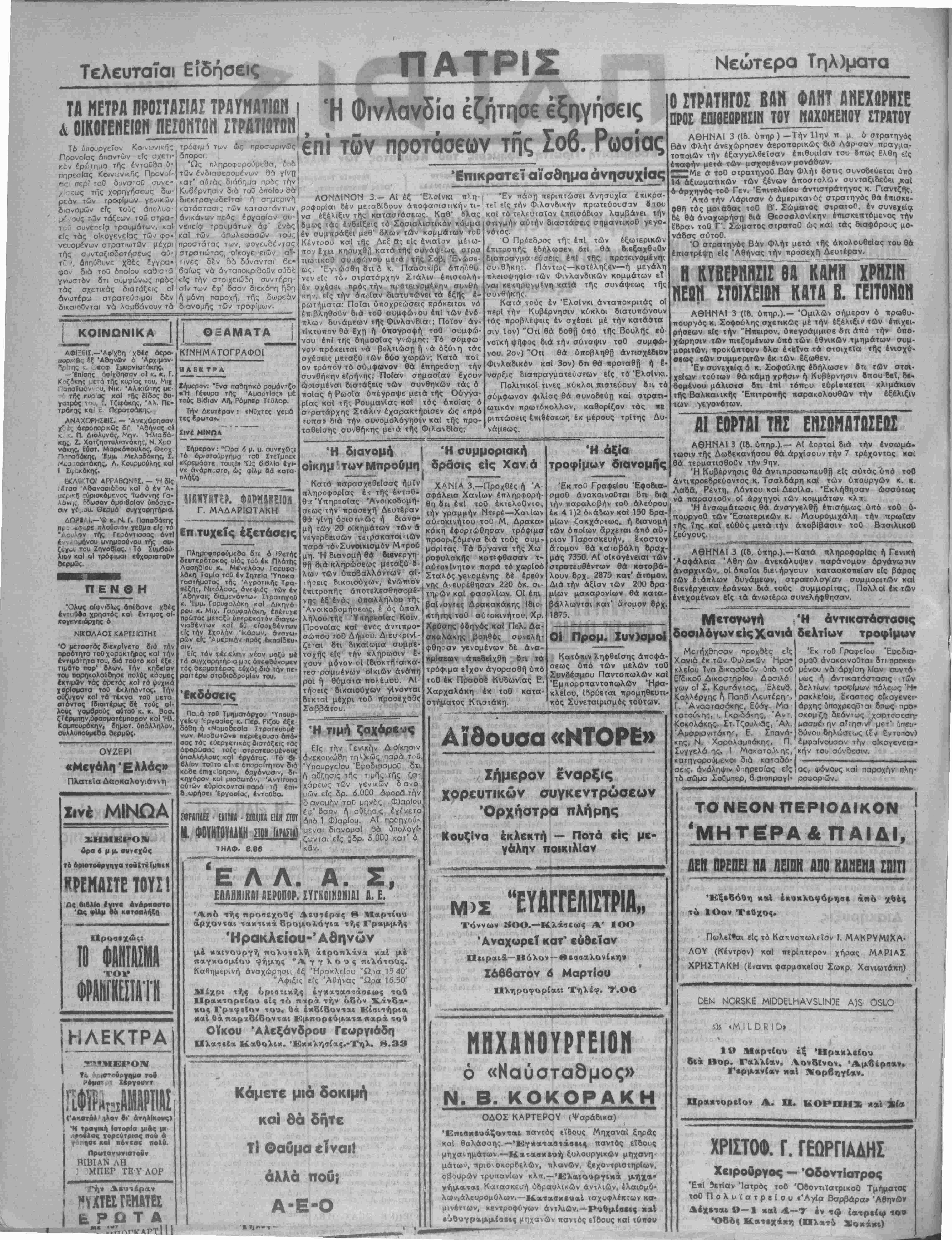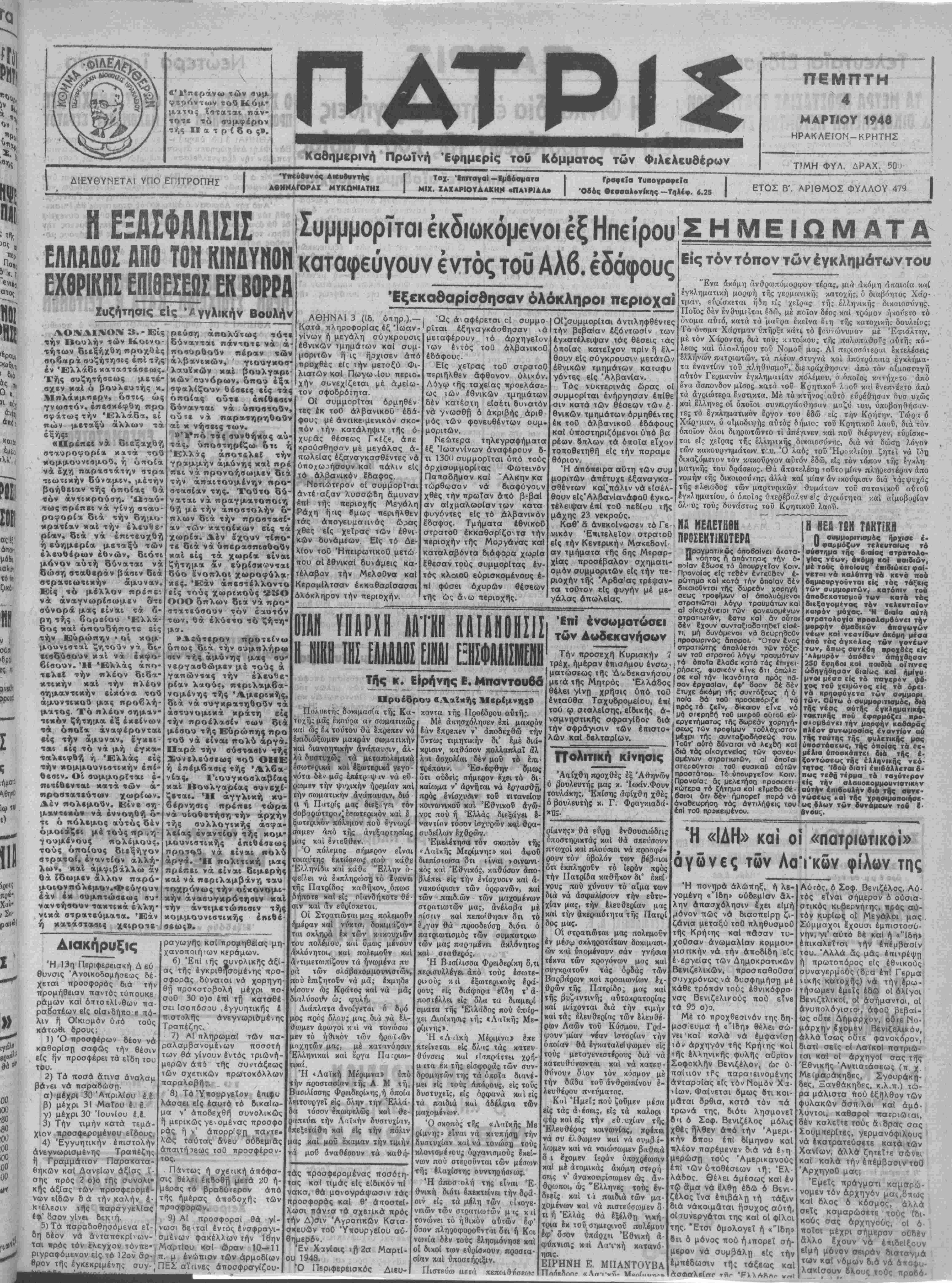 ΤΙΜΗ ΦΥΛ. ΔΡΑΧ. 50<' ΔΙΕΥΘΥΝΕΤΑ! ΥΠΟ ΕΠΙΤΡΟΠΗΣ 'Υπεύθυνος Αιευσυντης ΑΘΗΗΑΓΟΡΑΧ ΜΥΚΩΜΙΑΤΗΧ Ταχ. Ίπιταγαΐ —Εμβάαματα ΜΙΧ. ΖΑΧΑΡΙΟΥΔΑΚΗ»! «ΠΑ1Ρ1ΔΑ» Γρααεΐα Τυπογραφεϊα Όββς θεσσαλονίκης —Τηλέφ. 4.25 ΕΤΟΣ Β'. ΑΡΙΘΜΟΣ ΦΥΛΛΟΥ 479 Ι ,*»' 11 ΕΞΑΣΦΑΛΙΣΙΣ ΕΛΛΑΔΟΣ ΑΠΟ ΤΟΝ ΚΙΝΔΥΝΟΝ ΕΧΘΡΙΚΗΣ ΕΠΙΘΕΙΕΟΣ ΕΚ ΒΟΡΡΑ Συζήτησις εις Αγγλικήν Βουλήν ΛΟΝΔΙΝΟΝ 3.- Είς την Βουλήν των Κοινο τήτων διεξήχθη προχθές σοβαρά συζήτησις επί τής έν Ελλάδι καταστάσεως. Τής συζητήσεως μετ£- βχεν καί ό βουλευτής κ. Μηλάκμπερν, όστις ώς γνωστόν, επεσκέφθη προ σφάτως την Έλλάδα, εί «ών μεταξύ άλλων τα εξής: «Πρεπει νά διεξαχθή στ-αυροφορία κατα τού κομΐ*.ουνιαμού, ή όποία νά έχη παραστάτην βτρα τιωτικήν δύναμιν, μέτήν βοήθειαν τής οποίας θά τόν άντιχρούση. Ωσαύ¬ τως πρέπει νά γίνη σταυ- ροφορία διά την δημο¬ κρατίαν χαί την ελευθε¬ ρίαν, διά νά επιτευχθή ή εύημερία μεταξύ των έλευθέρων εθνών, διότι μονον αυτή δύναται νά δώση σταθεράν βάσιν διά στρατιωτικόν άμυναν. Είς τό μέλλον πρε«ε·. νά άναγνωρίσωμεν ότι σύνορά μας είναι τα δ- ρη τής βορείου Ελλά¬ δος κ αί όπουδήποτε είς την Ευρώπην · οί κομ¬ μουνισταί ζητούν νά δι- εισδύσουν κχί ν ά έκφο- βίσουν. Ή «Ελλάς απο¬ τελεί την πλέον διδα¬ κτικήν καί την πλέον σημαντικήν είχόνα τού άμυντικοΰ μας προβλή- ματος. Τό πλέον^σημαν¬ τικόν ςήτημα έξ έκείνων τα όποία άναφέρονται είς την άμυναν, έγκει¬ ται είς τό νά μή έγ*α- ταλειφθή ή "Ελλάς είς την κομμουνιστικήν επί¬ θεσιν. Οί συμμορϊται έ- πιτίθενταΐ κατά των ά* προστατεύτων χωρίων. Δέν πολεμοΰν. Είνε ση¬ μαντικόν νά εννοηθή ό¬ τι ό πόλεμος αύτός δέν όμοιάζει μέ τούς ηρ >η-