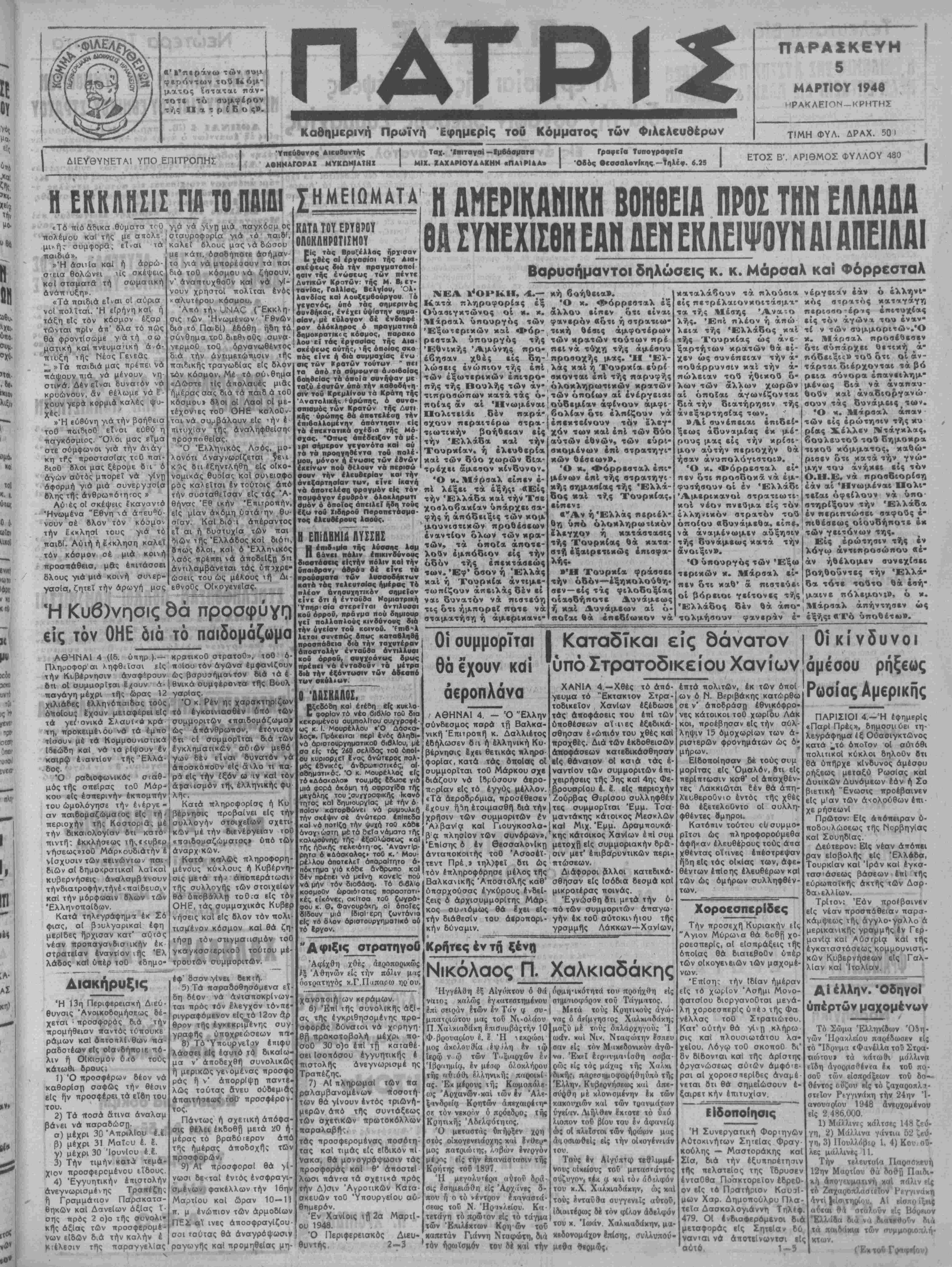 ηαιδί. Αύιή ή έ<κληση καλεΐ τόν κόσμον οέ μιά κοινή ■προσπαθεία, μας έπιτάσσει δλους γιά μιά κοινή συνερ- γασΐα,, ζητεί την άρωγή μσς (γιά νά γίνη μιά παγκόσμ ος Ισταυροφορία γιά τό τται&Ι, Ικαλεΐ 6λους μαςάδώσου με κάπ, δσοδιγποτε άσήμαν- το γιά νά μπορέοουν τα παι διά τοθ κόσμου νά ζήσουν, ν" άναπτυχθοθν καί νθ γί¬ νουν χρηστοί πολίται ενός καλυτέρου κόσμου. Άπό την υΝΑΟ (Έκκλη¬ σις των Ηνωμένον 'Ρθνών διά τό ΠαιδΙ) εδόθη ήδη τα σύνθημα τοθ διεθνοθς συνα- νερμοθ τοθ όργανωθέντος δ.ά την αντιμετώπισιν τής πσιδικής τραγωδΐας είς δλον χΛν κόσμον. Μέ τό σύνθημα «Δώστε τίς άπολαυές μιδς ημέρας σας διά τα παιδ ά τοθ κόσμοι.» δλοι οί ΛαοΙ οί με- τέχοντες τοθ ΟΗΕ καλοθν- ται νά συ^βάλουν είς ^ήν έ ττιτυχίαν τής άναληφθείση< προσποθεΕας. Ό Ελληνικάς Λσός, μο¬ λονότι ΛναγνωρΙζεται γεν ι κ Ώς 6τι έξηντληθη είς οΐκο- νομικάς θυσίας καί συνεισφο ράς καλείται έν τούτοις άπό την συσταθεΐσαν είς τάς "Α¬ θήνας Έθ ικήν Επιτροπήν, είς μίαν άκόμη ύστά'ην θυ¬ σίαν. ΚαΙ διό ι άτιέραντος εΐ αι ή δυστυχία των παι 3ιών ι ής Ελλάδος κοί διότι, 6πως βλοι, καί δ Ελληνικάς λαός τιρέπει νά άποδεΐξπ δή άντιλαμβάνεται τάς ύποχρε» ώσεις τού ώς μέλους ιή Δι- εθνοθς Οικογενείας. Ή Κυ6)νησις δα προσφύγη είς τόν ΟΗΕ διά τό παιδομάζωμα ΑΘΗΝΑΙ 4 (Ιδ. ύπηρ ).— Πληροφοραι Κηφθεΐσαι είς την Κυ(1έρνησιν άνσφέρουν 6τι οί συμαορΐται Ι'χουν ά- παγάγη μέχρι τής ώρας 12 χιλιάδες έλληνόπαιδας τούς ότιοίου: έχουν μεταφέρει είς τα γεΓθνικά Σλαυί<6 κρά τη, προκειμένου νά τα έμπο τΐσουν μέ τα Κομμουνΐσηκά Ιδεώδη καί νά τα ρίψουν έν καιρώ εναντίον τής "Ελλά¬ δος. Ό ραδιοφωνικός σταθ- μός τής οπεΐρας τοθ Μάρ¬ κου είς εσπερινήν έκπομπήν τού ώμολόγησε την έχέργε- αν παιδομαζώματος είς τή^ περιοχήν τής Κοστοριά^ μέ την δικαιολογίαν ότι κατό- πιντή; ίκκλήσεως τή.,«<υβερ νήσεως»τοΟ Μάρκουδιάτήν έ νΐσχυσιν των πεινώντων παι· 8ιών αί δημοκρατικαί λαΐκαΐ κυβερνήσεις άναλσμβινουν τήνδιατροφήν,τήνέκπαΐδευσ^ν καί την μόρφωσιν ολων των ΈλληνοπαΙδων. Κατά τηλεγράφηματ έκ Σ6 φιας, αί βουλγαρικαΐ έφη μερΐδες ήρχισαν κατ' αύτάς νέαν προπαγανδισακήν έκ στρατείαν εναντίον ιής ερχ λάδος καί υπέρ τοθ «δημο- Λιακήρυξις Ή 13η Περιφερειακή Διεύ¬ θυνσις Ανοικοδομήσεως δέ- χεται · τιροσφοράς διά την προμήθειαν παντός τύτιουκε ράμων καί όπτοπλίνθων τια- ραδοτέων είς οιανδήποτε πό¬ λιν ή ΟΙκΐσμόν ύιΐό τούς κάτωθι δρους; 1) Ό προσφέρων δέον νά καθορίση σαφώς την θέσιν Είς ήν προσφέρβι τα εΐδη τού τού. 2) Τα τΐοσά άτινα άναλαμ βάνει νά παραδώση. α) μέχρι 30 Απριλίου έ.ϊ. β) μέχρι 31 ΜαΤχυ έ. 6. ν) μέχρι 30 ΊουνΙου έ.6. 3) Την τιμήν κατά τεμά¬ χιον προσφερομένου ίΛ'δους. 4) 'Εγγυητικήν επιστολήν ανεγνωρισμένης Τραπέζης η Γραμμάτιον Παρακατα- θηκών καί ΔανεΙων άξΐας ΐ- οης πρός 2 ο)ο τής συνολι¬ κήν άξίας των προσφερομέ- νων είδβν διά την καλήν έ Κίέλεσιν τής παραγγεΚίας κρατικοθ στρατοθ», τοθ 6- ' τιοΐου τόν άγώνα έμφανίζουν ώς βσρυσήμαντον διά ιά έ Ι θνικά συμφέροντα τής Βουλ γαρΐας. , Ό κ. Ρέν ής χαρακτηρΐζων τό έγκαινιασθέν υπό των συμμοριτών «τιαιδομάζωμα» ώς άπάνθρωτιον, ετόνισεν ότι οί σομμορΐται διά των εγκληματικήν αυτών μεθό νων δέν είναι δυνατόν νά άποσκοποθν είς άν,λο τι πά ρά είς την ίξόν ω ιν καί τόν ά|>αασμόν τη έλληνικής φυ