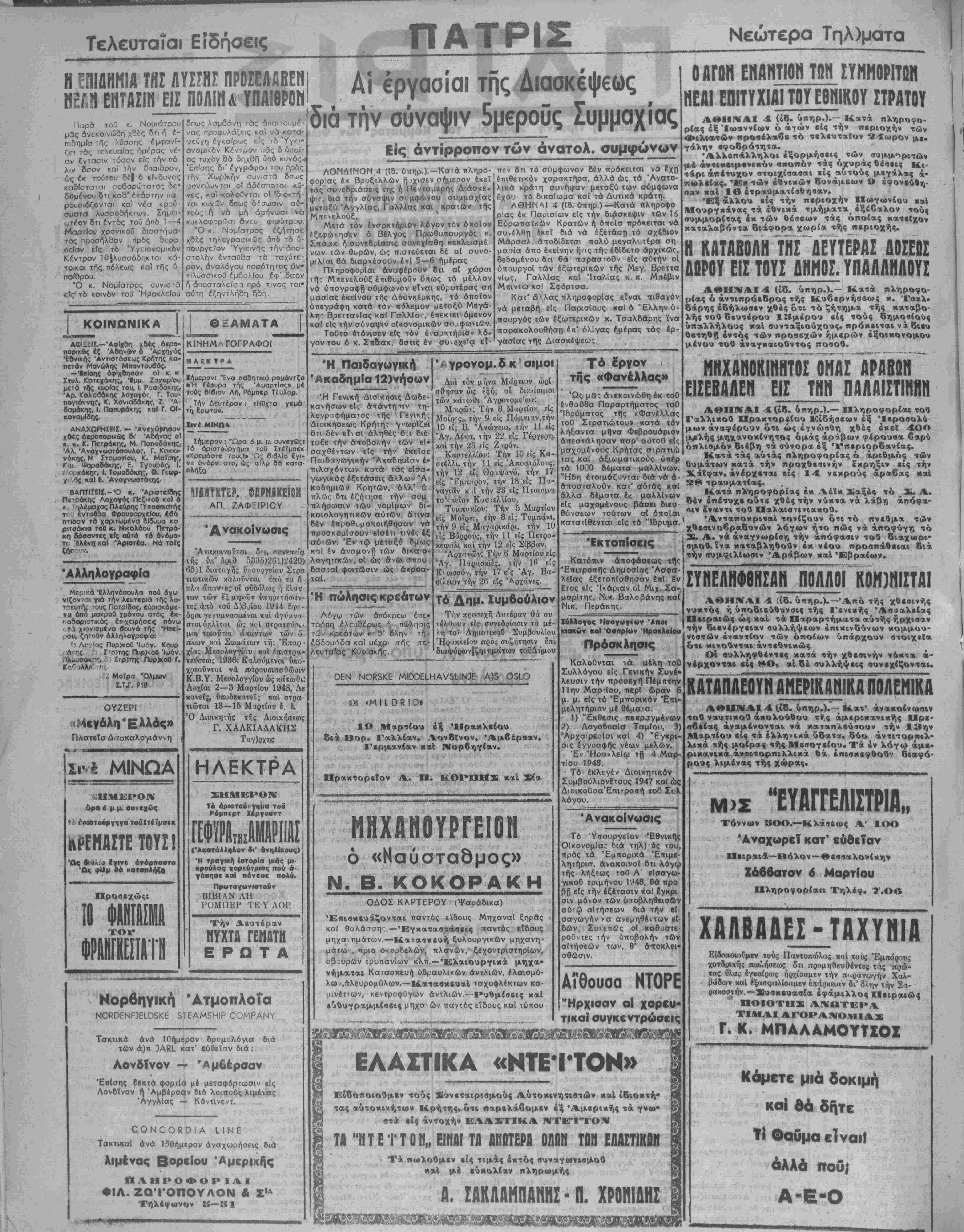 καί την 23 είς Ζ <ρόν. Καστελλίου: Την 10 είς Κα¬ στέλλι, την 11 είς Άποστόλους. την 12 είς Θριψανυ, την 17 είς "Έμπκρον, την 18 είς Π ι- ναγιδν κ Λ την 23 είς Πιαισμα τοΜ·κρίΌν Καστελλίου. Τυμπκκίου: Την 5 Μαρτίου είς ΜοϊρβΓ, την 8 εί; Τυμπάκι, την 9 είς Μαγαρικάρι, την 10 ιίς Βόρρους, την 11 είς Πετρο- κεφπλι καΐ την 12 είς Σίββοιν. Αρχανών: Την 6 Μαρτίου είς Αγ. Παριισκιες, την 16 ϊίς Κνωσσον, την 17 είς Αγ. Βα¬ σίλειον την 26 είς Άρχάνες. Τό ΔΗΜ· Συμβούλιον Την προσέχη Δυτέραν θά συ ν έλθουν είς συνεδρίασιν τα μέ- λη τοΓ' Δημοτικόν Συμβουλίου Ηρακλείου πρός συζήτησιν επί διαφόρων|ζητημάτων τοΰΔήμου ΡΕΝ ΝΟΚ5ΚΕ ΜΙΡΡΕΙ.ΗΑν5ϋΝ3Ε Α)3 0310 19 Μαρτίου έξ Ηρακλείου δια Βορ. Γαλλίαν, Λονδίνον, Άμβέρσαν, Γερμανίαν καί Νορβηγίαν. Πρακτορείον Α. Π. ΚΟΡΠΗΣ καΐ Σία ΜΗΧΑΗΟΥΡΓΕΙΟΝ ό «Ηαύσταθμος» Ν. Β. ΚΟΚΟΡΑΚΗ ΟΛΟΣ ΚΑΡΤΕΡΟΥ (Ψαράδικα) Έηισκευάζονται παντός ΕΪδους Μηχαναί ξηρθς καί θαλάσση-;.·—Έγκαταστάσεις παντός εΐδους μηχανημάτων.—-Κατασκευή ξυλουργικων μηχανη' μάτω-, πριο ο·ίορ8ελών, τιλανών, ξβχοντριστηρΐων, οβ-^υρών τρυπανίων κλπ.—«Ελαιουργικά μηχα· νήμαται Καιασκευή ύδραυλικών άντλιών, έλαιομύ- λων,αλευρόμυλον.—Κατασκευαί ταχυφλέκτων κα- μινέτ'ων, κεντροφΰγων άντλιών.—Ρυθμίαεις χαί εύθυγραμμίσεις μηχανών παντός εΐδους καί ιθπου Τό έργον τής «Φανέλλας» Ώς μδ: ανεκοινώθη έκ τοθ ένθαθθα Παραρτήματος τοθ Μδρΰμστος τής «Φανέλλας τοθ Στρατιώτου» κατά τόν λήξαντα μήνα Φεβρουάριον απεστάλησαν ιχαρ' αύτοθ είς μαχομένους Κρήτας στρατιώ τας καΐ άξινματικούς ύηέρ τα 1000 δέματα μαλλίνων. "Ηδη έτοιμάζονται διά νά ά- άποσταλοθν κατ' αύτάς καί άλλα δέματα έκ μαλλίνων είς μαχομένους βάσει διευ θύνσεων τούτων αί οποίαι καταΊθενται είς τδ "Ίδρυμα. 'Εκτοπίσεις Κατόπιν αποφάσεως τής Έτιιτροπής Δημοσίας Ασφα¬ λείας έξετοτιίοθησαν επί 6ν Ετος είς Ίκάριαν οί Μιχ. Σα- μσρΐτηχ:, Νικ. Βυλοβάνης κσ{ Νιιί. Περάκης. ΜΗΧΑΗΟΚΙΝΗΤΟΣ ΟΜΑΣ ΑΡΑΒΩΝ ΕΙΣΕΒΑΛΕΝ ΕΙΣ ΤΗΝ ΠΑΛΑΙΣΤΙΗΙΙΝ ΑΘΗΝΑΙ 4 (ίδ. ύπηρ.).— Πληροφορίαι τού Γχλλικού Πρακτορείον Είδήαεων έξ Ίεροσολύ- μων άναφέρουν ότι ώς εγνώσθη χθές έχεί 4ΟΟ μ*λής μηχανοκίνητος ομάς άράβων φέρουαα βαρύ οπλισμόν βιέβη τα σύνορα έξ Ύπεριορδανίας. Κατά τάς αύτάς πληροφορίας ό άριθμός των Ουμάτων κατά την προχθεσινήν έκρηξιν είς την Χί%φαν, άν έρχεται είς 14 νεκρούς άραβας καί 28 τραυματίας. Κατά πλ-ηροφορίας έκ Αέϊκ Σαξές τό Σ. Α. θέν επέτυχε οΰτε χθές την νύκτα νά λάβη απόφα¬ σιν έναντι τού Παλαιατινιαχού. Ι Ανταποκριταί τονίζουν ότι τό πνεύμα των χθεσινοβραδυνών λόγων ήτο πώς νά αποφύγη τό Σ. Α. να αναγνωρίση την απόφασιν τού βιαχωρι- ομού, ίνα καταβληθοθν έκ νέου προσπάθειαι διά την συμφιλίωσιν Άράβων κ αί Εβραίων. Χύλλογος Ησαγωγίυν κιακδν κα! ΌοπρΙαν Ηρακλείου Πρόσκλησις Καλοθνται ιά μέλη τοθ Συλλόγου είς Γενικήν Συνέ¬ λευσιν την προσέχη Πέμπτην 11 ην Μαρτίου, περί ώραν 6 μ. μ. είς τό Εμπορικόν Έτιι- μελητήριον μέ θέματσ: 1) Έκθεσις πβπραγμενων 2) ΛογοθοσΙα Ταμίου, 3) Άρχαιρεοίσι κσΙ 4) "Εγκρι¬ σις έγγοσφή·ς νέων μελών. Έν Ήοακλείω τί| 4 Μαρ- τΐου 1948 Τό έκλεγέν Διοικητικόν Συμβούλιονετους 1947 καί ώς ΔιοικοΟσαΈτιιτροπή τοθ Συλ λόγου. Ανακοίνωσις Τό Υπουργείον Έθνικί)ς Οικονομια^ διά τηλ)ός τού, πρός τα Έμπορικά Έπιμε- λητήρισ, ανακοινοί ότι λόγφ τής λήξεως τοθ Α' εΐσαγω- γικοθ τριμήνου 1^48, θά προ β{) είς την εξέτασιν καΐ εγκρι σιν μόνον των ύποβληθεισων αότφ αιτήσεων διά την ε(- σαγωγήν *σ ανεμηθέντων εΐ- 8ων, ΣυιεπίΓς οί καθοστε- ροθντες την υποβολήν των αιτήσεων των, θ' άποκλει· σθώσι