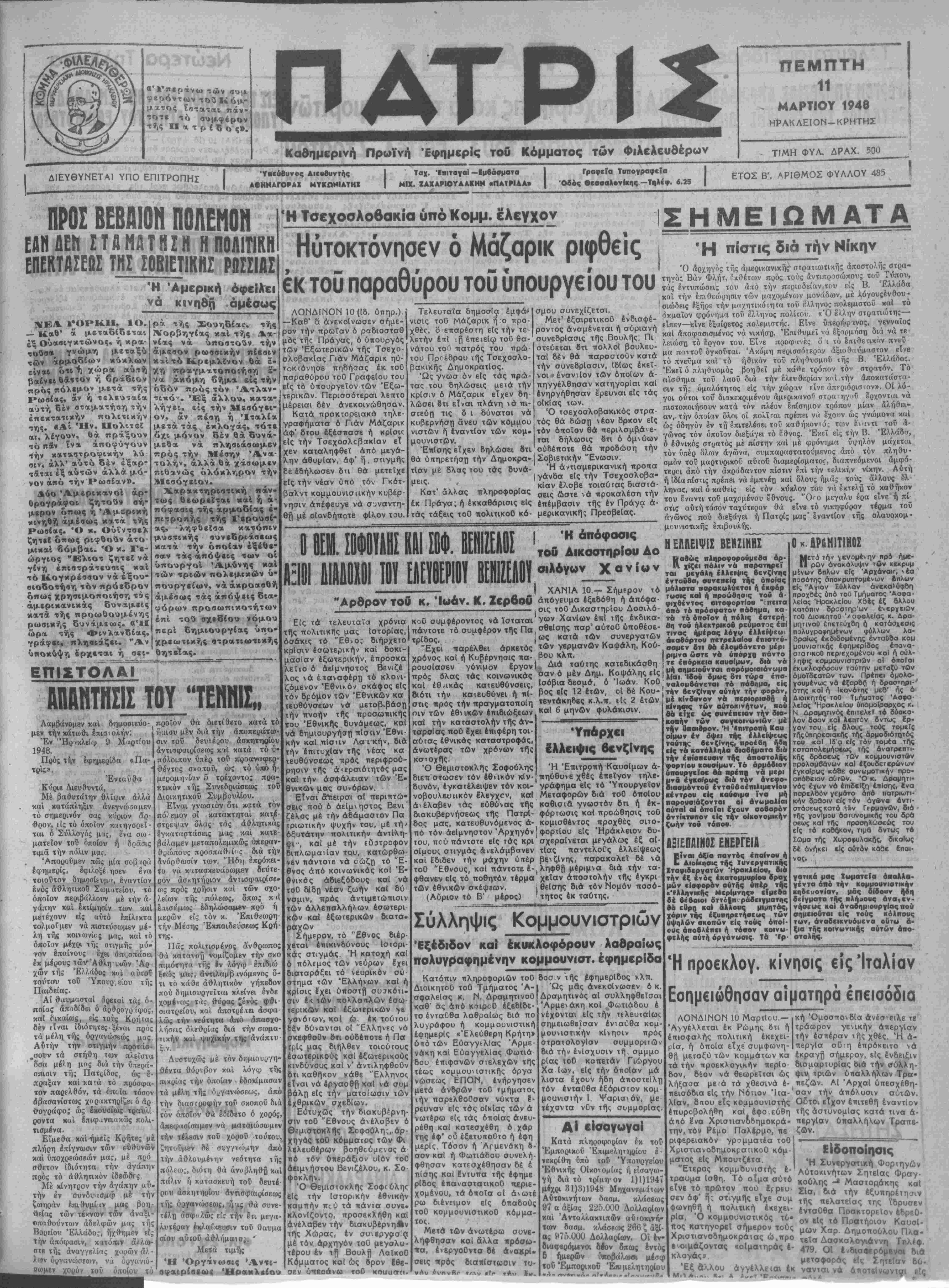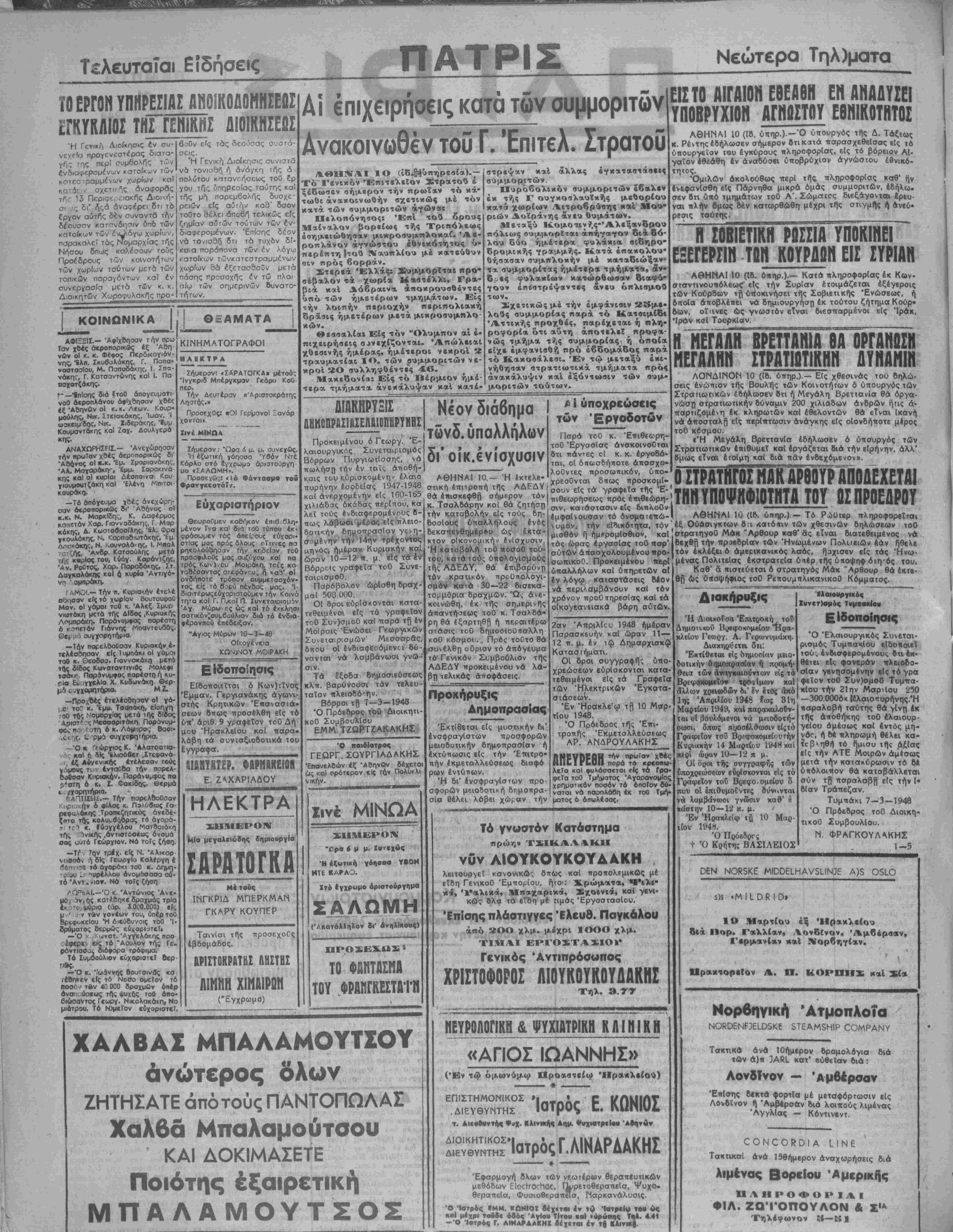 νυμον, την εΐδικότητσ, τόν έξ Ούάσιγκτων β:ι *αι6<τιν των χθεσινών δηλώσεων τοθ μισθόν ή ήμρρομΐσθιον, καί .στρατηγοϋ Μάκ 'Άρθουρ καθ' άς είναι βιατεθειμένος νά τάς ώρας εργασίας τοθ παρ'|βεχθή την προεβρΐαν των Ήνωμένων Πολιΐβιών εάν ήθβλβ τόν έκλέξει ό άμερικανικός λαός, ήαχισεν είς τάς "Ηνω¬ μένας Πολιτείας έκστρατεΐα υπέρ τής ύποψηφ όιη'ός τού. Καθ" ά πιστεύβται 6 στρατηγός Μάκ 'Άρθουρ θά έκτε- στρεψαν καί άλλας έγκαταστάσεις συμμοριτών. Πυρόβολ&χόν συμμοριτών έβαλεν έκ τής Γ ουγχοσλαυΐκής μεθορίου χατάι χωρίων Αιτροβρύσης καί Μου* ριών Δοΐράνης άνευ θυμάτων Μεταξύ Κομοτινής-Άλεξανδρου πόλιως ουμμορϊται άπήγαγον δια βό¬ λου δύο ημετέρα φυλάκια σιδηρο¬ δρομικώς γραμμής. Κατά έπαχολου- θήσασαν συμπλοχην μέ καταδιώξαν- τα συμμορίτας ημετέρα τμήματι, άν- 6. ·ς φυλακίων κατώρθωσαν διαφύ' γουν έπιστρέψαντες άνευ όπλισμού των. Σχετικώς μέ την εμφάνισιν μ λούς συμμορίας παρά τό Κατσιμίδι Άττικής προχθές, παρέχεται ή πλη- ροφορία ότι αυτή αποτελεί προφα- νώς τμήμα τής συμμορίας ή όποία είχε εμφανισθή πρό εβδομάδος παρά τό Κακοσάλεσι. Έν τώ μεταξύ έκι- νήθησαν στρατιωτικά τμήματα πρός ανακάλυψιν χαί εξόντωσιν των συμ· μοριτών τούτων. ί ύποχρεώσεις ΈΡΥοδοτών των Παρά τοθ κ. 'Ετιιθεωρη- τοθ Εργασίας άνακοινοθται βτι πάντες οί κ. κ. έργοδό- ται, οί όπωσδήποτε άπασχο- λοθντες προσωπικόν, ΰπο- χρεοθντσι δπως προσκομΐ- σουν είς τα γραφιΐα της Έ-1 αυτών άπαοχολουμένουτΐρο- σωπικοθ. Προκειμένου περί ύπαλλήλων καί ύπηρετών αί έν λόγω καταστάσεις Βίον νά περιλαμβάνουν καί τόν χρόνον προΰ ιτηρεσΐας καί τα οίκογβανειακά βάρη αυτών. 2αν Απριλίου 1948 ημέραν Παρασκευήν καί ώραν 11— 12 π. μ. έν τώ Δημαρχισκώ Καταστήματι. ΟΙ δροι συγγραφής υπο¬ χρεώσεων ευρίσκονται κατα τεθειμένοι είς τα Γραφεΐα των Ήλεκτρικών Έγκατα στάσεων. Έν Ήρακλε'ω τή 10 Μαρ τίου 1948. Ό Πρόεδρος τής Επι· τροπής Εκμεταλλεύσεως ΑΡ. ΑΝΔΡΟΥΛΑΚΗΣ ΑΝΕΥΡΕΘΗ ρά^ λεία καΙ ·υλάσσ«:τοι ίίς τα Γρα φεΤα τοθ Τμήματος ΆγορανομΙος χρηματικόν ποσόν τό οποίον δύ¬ ναται νά παραλάβη έκ τοθ Τμή¬ ματος 6 απωλέσας. Τό γνωστόν Κατόστημα πρώην ΤΣΙΚΑΛ%ΚΗ νυν ΛΙΟΥΚΟΥΚΟΥΛΛΚΗ λειτουργεΐ κανονικώς δπως καί προπολεμικώς μέ ειδή ΓενικοΟ Έμπορίου, ήτο·: Χρώματα, ^ϊΊλι· κά, 'Υαλιχά, Μηαχαρικά, Σχοινιά, καί γενι· κώς δλα τα είδη μέ ημάς 'ΕργοστασΙου. 'Επίσης πλάστιγγες Έλευθ. Παγκάλου άπό 2ΟΟ χλμ. μίχρι 1ΟΟΟ χλμ. ΤΙΜΑΙ ΈΡΓΟΣΤΑΣΙΟΥ Γενικός 'Αντιπρόσωπος ΧΡΙΙΤΟΦΟΡΟΙ ΛΙΟΥΚΟΥΚΟΥΔΑΚΗΣ Τηλ. 3.ΤΤ ΗΕΥΡΟΑΟίίΚΗ & ΨΥΧΙίΤΡΙΚΗ Κ ΛΙΜΙΚ Η «ΑΓΙΟΣ ΙΩΑΝΝΗΣ» (Έν τώ όμωνυμω Ηροαστείω Ήραΐιΐλείου) ΕΠΙΣΤΗΜΟΝΙΚΟΣ .ΔΙΕΥΘΥΝΤΗΣ τ. ΑιΐΗθυντή^ ·ατ.. Κλΐνικι*)·; Δημ. ΦυχιατρεΙοο Άβηνών Ίατρός Ε. ΚΩΝΙΟΣ Δ1ΟΙΚΗΤΙΚΟΣ» ΔΙΕΥΘΥΝΤΗΣ Ιατρός Γ.ΛΙΝΑΡΛΑΚΗΣ Έφαρμογή ολων των νεωτέρ«ον θεραπευτΐκών μεθόδων ΕIΘ^^^Ο^I1ύ^, Π|)ρετοθβραπεΙα, Ψυχο. θεραπεΐα, ΦυσιοθεραπεΙσ, Ναρκανάλυσις. Ό Ίατρος ιμμ. ΚΑΝΙΟΧ βέχεται έν τ$ Ίατρείν τού ώς «α! μέχρι Τοθβε: όβός ΆγΙοο Τίτου καΙ ιύβάπης Τηλ. 4.41 -Ό Ίοτρό< Γ. ΑΜΑΙ»ΔΑΚΗΙ βέχεται έν τβ Ι(λιηκ|. ρηγς ρυρ θ θή ώς όττοψήφΐος τοθ ΡεπουμπλικανικοΟ Κόμματος. Διακήρυξις Ή Διοικοίσα ΈπιτροΛη τοϊ) Δημοτικαί» Βρβφθκομβίου ΓΪοα- κλείου ΓεωοΥ- Α. Γε,ρωνυμάκη. Διακηρΰττετ δτΓ. Έκτίθβται είς δημοσίαν μ«ιο· δοτικήν δημοπρασίαν ή προμή- θεια των άνηγχαιούντων είς τ6 Ίλαιουρνικ&ς Ιιινετ)α|ΐός ΤυμαακΙο» Είδοπο.ησις Ό 'Ελαιουργικός Συνεται- ρισμός ΤυμπακΙου εΐοοποιε'ΐ τού, ενδιαφερομένους ότι έκ- Θέτει είς φανεράν πλειοδο¬ σίαν γενησομένην εΙς_τό γρα ΒθΕφοκομεϊον τρο