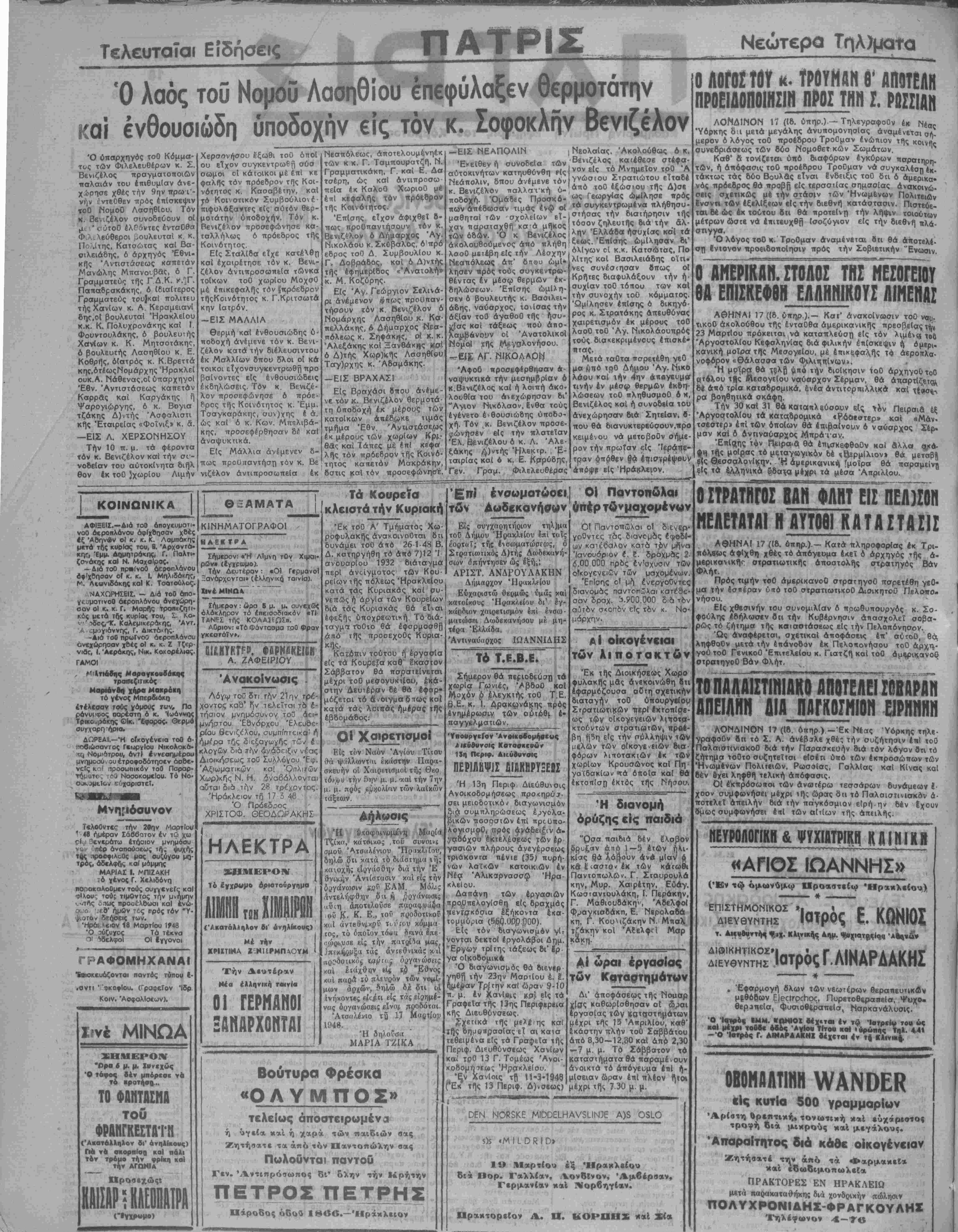 ίνήκοντβς είι#τι είς τάς $<)ψί- νας όργανώσεις £Ϊνα^ προδόται. Άτσαλένΐο τΜ 17 ί 1948. Ή δηλοΰσιί ΜΑΡΙΑ ΤΖΙΚΑ Βούτυρα Φρέσκα «ΟΑΥΜΠΟΣ» τελείως άποστειρομένοι ή ύγεία καί ή χαρ ά των παιδιών βας Ζητήσατε τα άπό τόν Παντοπώλην βας Πωλοθνται τταντοϋ Γεν. Άντιηρόσωηος δι' όλην την Κρήτην ΠΕΤΡΟΣ ΠΕΤΡΗΣ Πάροδος όδοΰ 18Οβ.—Ηράκλειον 13η Περιφ. Αιεύσυνσις ΠΕΡΙΛΗΨΙΣ ΰίΰΗΗΡΥΞΕ.Ι Ή 13η Περιφ Διεύθυνσις Ανοικοδομήσεως ηρο<ιρύ7- σει μειοδοτικόν διαγωνισμόν διά συμπληρώθΕως έργολα- ρικών τΐασοσΐων επί τιροθπο- λονισμοθ, πρός άνάδει£ιν ά- ναδόχου εκτελέσεως των έρ γασιάν πλήρους ανεγέρσεως τριάκοντα πέντε (35) πυρή- νων λαϊκόν κατοικιών έν Νέα Άλικαρνασσώ Ηρα¬ κλείου. Δαπάνη των εργασιών προϋπολογισθή είς δραχμάς ^ενΐ,σκδσια έξήκοντα έκα- τομμύρια (5&ρ.Ο0Ρ £300). Ε,Ις τόν διαγωνισμόν γΙΓ νονται δεκτοΙ έργολάβοι Δημ. "Εργων τρ·της τάξεως δι" ίρ- γα ο'κοοομικ* Ό διαγωνισμός θά διενερ γηθή την 23ην ΜαρτΙου έ. Ι. ίέ^αν ΤΡίΓΤ|ν καΐ ώραν °-10 μ. έν ΙΚσνΙ^ς κα) είς χά Γρσφεϊα της 1?ης Περιφερεια κης Διευθύνσεως. £χεπκά της μελί'ης καί ΐί)ς οηα^ττραοΐας εΐ αι καισ τεθεψένα είς χά Γραφεΐα τής Περιφ, Διευθύνσεως Χανίων κβί ΐρθ 13 Γ. Τομέως Άνοι- ίΒομήΉίίίς ΉρακλβΙου. 'ξν Χανίοις τ"{| Π-3.-1948. ΓΕκ τής 13 Περιφ. Δ)νσβως) Ο! Παντοπώλαι οί ρ γοθντες τάς διανομας ίφθδί· ών κατέ^ςιλον κατά τφν μηνα Ιανουάριον ί. 8. δραχμάς 2 ό.ΟΟ 000 πρ6ς έν'αχυσιν των οΥκογενειιϊν των μσχομένων Έπίσης οί μή ένεργοθντες διανομάς παντοπώλαικατέθε σαν δραχ. "^.900.000 διά τόν αυτόν σ*οπ6ν είς τόν κ. Νο μάρχην. ΑΙ οικογένειαι των λιποτακτών Έκ τής Διοικήσεως Χωρο φυλακάς μας ανεκοινώθη βιι εφαρμόζουσα αυτή σχετικήν διαταγήν τοθ ΟττουργβΙου Στρατιωτικών ττερί έκτοπΐσε ως των οίκο,γεγειών λιττοτα κτούντων στρατιφτών, πρθέ βη ή5η είς την πύλληψιν τβν μϊλθν τ&ν οικογένειαν δια¬ φόρων λιηθτακτών έκ των χωρίων Κρουσώνος καΐ Πή γαίδακίων«τά όποΐα καΐ θά έκτοπΙσ[) έκτός της Νήσου. Ο ΛΟΓΟΓΤΟΥ *<- ΤΡΟΥΜΑΜ θ' ΑΠΟΤΕΛΗ ΠΡΟΕΙΔΟΠΟΙΗΣΙΝ ΠΡΟΣ ΤΗΝ Σ. ΡΩΣΣΙΑΝ ΛΟΝΔΙΝΟΝ 17 (16. ύπηρ.) — Τηλεγραφοθν έκ ΝέΟς Υόρκης ο;ι μετά μεγάλης άνυπομονησΐας άναμένετσι σή. μερον ό λόγος τοθ προέδρου Τροθμαν ενώπιον τής κοινήν συνεδριάσεως των 80ο Νομοθετ κων Σωμάτων. Καβ' α τονΐζεται υπό διαφόρων έγκορων παρατηρη. κ, ή απόφασις; τοθ ττροέβρου Τροθμαν νά συγκαλέση έκ· τάκτως τάς 66ο Βουλδς είναι ένδειξις τοθ δή ό άμερικα· νός τιρόεδρος θά τιροβη είς τερσσιίας σημσσΐας άνσκοινώ- σεις σχετικώς μέ την στάσιν των Ήνωμένων Πολιτειβν ίνσνη των έξελΐξβων είς την διεθνή κατάστασιν. Πιστβθε- ται δέ ώς έκ τούτου δτι θά τιροτεΙνΓ| την λήψιν τοιούτων μέτρων ώσΐδ νά επιτευχθή (σοζύγιον είς την διεθνή «λά- στιγγα. Ό λόγος τοθ κ. Τροθμαν άναμένεται βτι θά αποτελέ¬ ση Ινιονον τιροειδοποΐησιν πρός την Σοβιετικήν "Ενωσιν. οΤΜΕΡΪΚΑΝ. ΣΤΟΑΟΣ ΤΗΣ ΜΕΣΟΓΕΙΟΥ 8Α ΕΠΙΣΚΕΦΘΗ ΕΑΛΗΗ1Κ0ΥΣ ΛΙΜΕΝΑΣ ΑΘΗΝΑΙ 17 ((δ. ύττηρ ).·— Καΐ" ανακοίνωσιν τοθ να^. τικοθ άκολούθου τής ενταύθα άμερικανικής τιρεοβεΐας ^ 23 ΜαρτΙου πρόκειται νά καταπλεύση είς τόν λι,μέν^ τ,βθ Άργοστολίου Κεφαληνιας διά φιλικήν έτιζσκεψιν ή όμβρι. κανική μοΐρα της ΜβσογεΙου, μέ έτηκςφαί}ς ι$ άεροπλα· νοψόρον «θάλασσα των Φιλιττ,ιτ,Ινωνί. Ή μρ^ρρ; θά τ,ελ{1 ^ιπο την βιοίκησιν τοθ άρχηγοθ τοθ «τάλου τής Μεσογείου ναύαρχον Σέρμαν, θά άπ,αρτΐζεΐςα δέ άπό τρΐα καταδρομικά, ένέα άνταορπιλλι,κβ καΐ, τ.4«σ%Λ ρα βοηθητικά σκάφη. Την 30κα131 θά Καταηλβύσουν είς τβν Πειραια εί Άργοσ,τολίου τα κατσ,βρομικά «Ρ^όθεβτερ» καί «Μάν- τσεστερ» επί των οποίων θά έτΐφαΐνουν