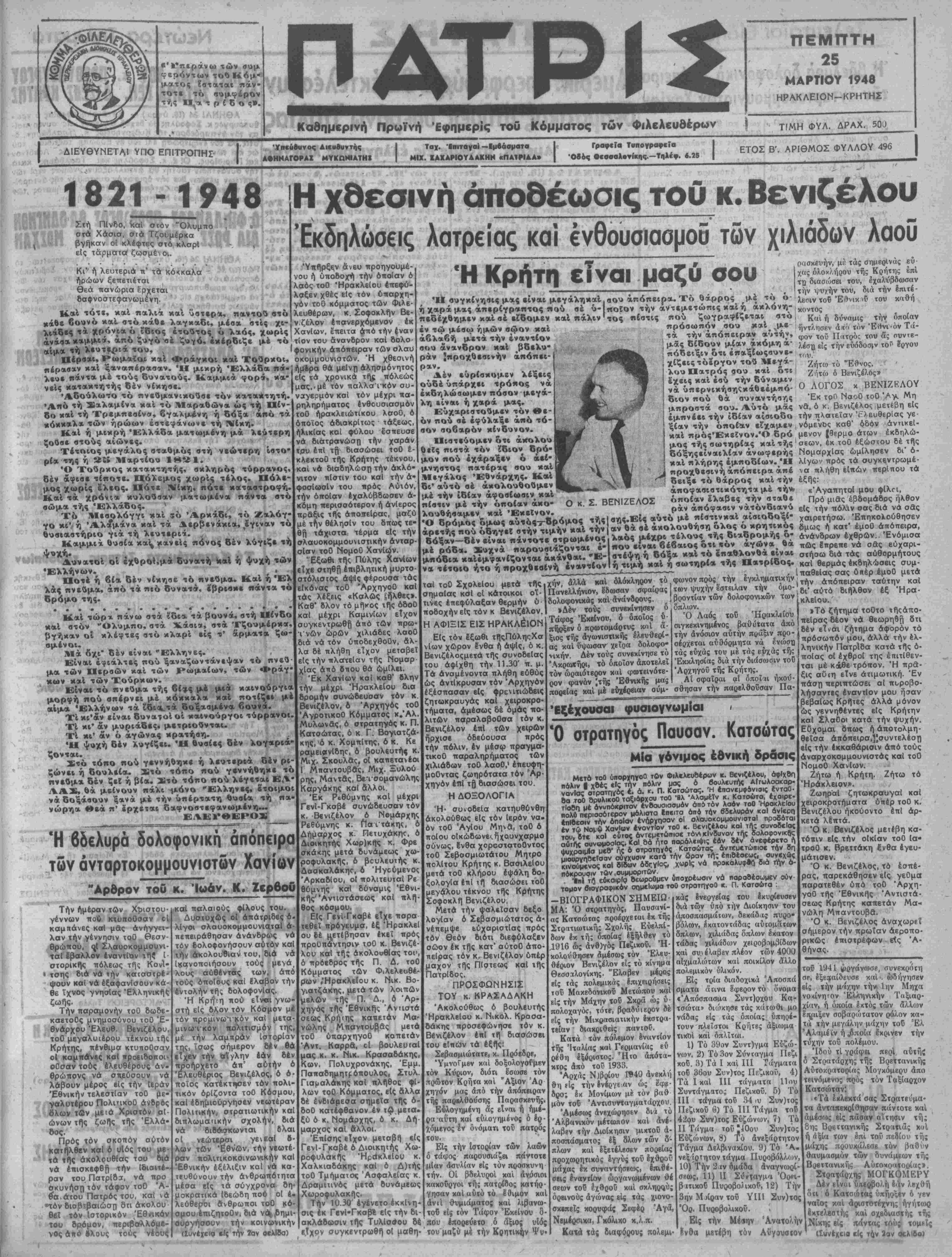 <Ρ*οόντων τού Κόμ¬ ματος ίσταται πάν- τοτε τό συμφέρον τής Π -. τ ρ ί δ ο ς». Καδημερινή Πρωΐνή Εφημερίς τού Κόμματος των Φιλελεύθερον ΠΕΜΠΤΗ 25 ΜΑΡΤΙΟΥ 1948 ΗΡΑΚΛΕΙΟΝ-ΚΡΗΤΗΣ ΤΓΜΗ ΦΥΛ. ΔΡΑΧ. 50ϋ Ι ΔΙΕΥΘΥΝΕΤΑ1 ΥΠΟ ΕΠΙΤΡΟΠΗΣ- Ι Ύικΰουνος Αιευβυντής ΑΘΗΝΑΓΟΙΆΧ ΜΥΚηΝΙΑΤΗΙ Ταχ. Ίπιταγαι — Εμβάσματα ΜΙΧ. ΙΑΧΑΡΙΟΥΑΑΚΗΝ «ΠΑ1ΝΔΑ» Γραφεϊα Τυπογραφκϊα •Οβος ·εβααλ·τ(κης.—Τηλέφ. «.25 ΕΤΟΣ Β'. ΑΡΙΘΜΟΣ ΦΥΛΛΟΥ 496 1821-1948 Στή Πίνδο, καί στόν "Ολυμπο στά Χάσισ, σία Τζουμέρκα (ϊγήκαν ο! κλΐφτες στό κλσρΐ είς τάρματοί ζωσμένοι. ι Κιν ή λευτεριά π' τα κόκκαλα ήρώων ξεπετιέτσι θεά πανώρια έρχεται δαφνοστεφανωμένη. Κ*1 τότε, καί ηαλιά και ΰστερα, π αν τ ού βτό «άβε βουνό κ<*1 βτό κάθε λαγχαδι, μέσα 'βτΐς χι- λιάδες τα χρόνια ό ΐδιος έτούτος ό λαός, χωρίς άνάσα καμμιά, από ζυγό^σέ ζυγό, έκέρδιζε μέ τό αίμα τή λευτεριά τού, Ν Ηέρσαι, Ρ ωμαί ο* καί Φράγκοι καί Τθύρκοι, πέρασαν καί ξαναπέραααν. Ή μικρή Έλλάδα; πά- λευε «άντα μέ τούς δυνατούς. Καμμιά φορά, κα- νείς κατακτητής δέν νίκησε. Άδούλωτο τό πνεύμανικούσε τόν κατα*τητή. •Αηό τή Σαλαμίνα καί τό Μαραθώνα ώς τή Πίν- οο καί τή Τρεμπεβίνα, βγαλμάνη ή δόξα άπό τα *όκκαλα των ήρώων έστεφάνωνε τή Νίκη. Καί ή μικρή Έλλάδα ματωμένη μά λεύτερη ζούσε στούς αίώνες. Τέτοιος μεγάλος βταθμός βτή νεώτερη ίβτο- ρία της ή ί££» Μαρτίου 1821. Ό Τούρκος κατακτητής, βχληρός τύρρανος, 8έν άφιαε τίποτε. Πόλεμος χωρίς τελος. Πόλε- μος χωρίς έλεος. Πότε Νίκη, πότε καταστροφή. Καί τα χρόνια κυλούοαν μάτωμένα πάντα βτό σώμα τής Ελλάδος. ν Τό^ ΛΛεαολόγγι καί $ό Άρκάδι, τό Ζαλόγ- γο κι'^ή Άλίμάνα κ αί τα Δερβενάκια,,έγιναν τό θυσιαστήριο γιά τή λευτεριά. Καμμιά θυσία καί^ κανείς πονος δέν λύγιζε τή Δυνατοί οί έχθροι,μά δυνατή καί ή ψυχή των Έλλήνων. , ,. Ποτέ ή βία. δέν νίκησε τό πνεΰμα. Κ αί ή Έλ λας πνεύμα, βπό τα πιό δυνατά, έβριακε πάντα τό δρομο της. Η χθεσινή άποθέωσις τού κ. Βενιζέλου Έκ δηλώσας λατρείας και ένθουσιαομοά των χιλιάδων λαοϋ "ίώρα πάνω στ ά ιδία τα β ου ν ά, στή Πίνδο καί στόν "Ολυμπο, στά Χάαια, στά Τζουμέρκα, βγήκαν οί κλέφτες στό χλαρί είς τ' άίρματα ζω- αμένοι. Μά δχι* δέν είναι Έλληνες. Είναι έφιάλτες πού ξαναζωντάνεψαν τό πνευ- μα των Περσών καί των Ρωμαίων, των Φράγ Α «ών κ αί των Τούρκων. *>&* Είναι τό πνεύμα τής βίας μέ μιά καινούργια