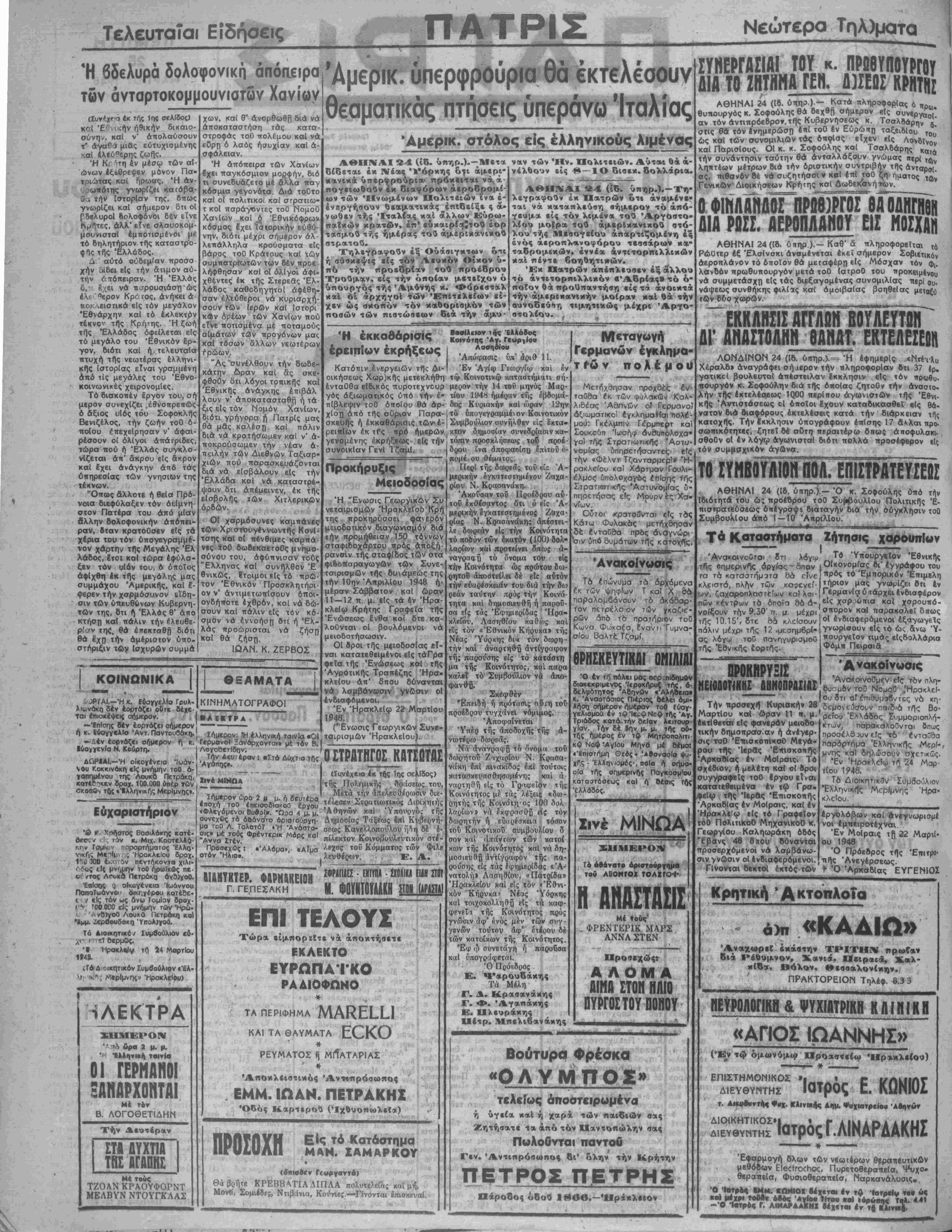 Μ«τοΰ< ΤΖΟΑΝ ΚΡΑΟΥΦΟΡΝΤ ΜΕΛΒΥΝ ΝΤΟΥΓΚΛΑΣ . . νοι ΒυβοΙ». "Ωρα 4 μ. μ. ουνεχβς τό άοάνατο άριοτούργη- μα τοθ Λ. Τολοτόΐ «Ή Ανάστα¬ σις» μέ τούς Φρέντερικ Μόρς κο) "Αννα Στέν. Προσεχώς: «ΆΑόμα», «Αίμα οτόν 'ΗΑιο». 1Ι&ΗΤΚΤΕΡ. ΦΛΡΗ1ΚΕΙ0Η Γ ΓΕΠΕΣΑΚΗ η ; τής Δημοσίας Τάξεως έ«ί Κνβερνή- σεως Κανελλοπούλου ί^η δέ έ- πίλεκτον Κοινοβουλευτικόν στέ- λίχος τοΰ Κόμματος των Φιλε λευθέοων. Ε. Α. ΣΦΡ«ΙΑΕΣ~^ ΕΙΤΤτΉ* ~ ΣΧΟΑΙΚ* ΕΙΔΗ ΣΤΟϊ Μ. ΦΟΥΝΤΟΥΛΑΚΗ ηιι ΕΠΙ ΤΕΛΟΥΣ Τώρα είμηορζίτε νά άηοχτήσετε ΕΚΛΕΚΤΟ ΕΥΡΩΠΑΙΚΟ ΡΑΑΙΟΦΩΝΟ ΤΑ ΠΕΡΙΦΗΜΑ ΚΑΙ ΤΑ ΘΑΥΜΑΤΑ ΡΕΥΜΑΤΟΣ 1 ΜΐΤΑΤΑΡΙΑΣ ' * Αποκλειστικόν Άντ*-πρόσωηος ΕΜΜ. ΙΩΑΝ. ΠΕΤΡΑΚΗΣ *Οδός Καρτερού (ΊχθυοπωλεΙ») ΠΡΟΙΟΧΗ Κατάστημα ΜΑΝ. ΖΑΜΑΡΚΟΥ Γεωργαντά) Θά βρήτε ΚΡΕΒΒΑΤΙΑΔΙΠΛΑ πολυτελείας καί μή Μονί, Σομιέδε;, Ντιβάνια, Κούνιβς —Πνονται έπισχευαί. λαρίων καί ηροτείνει όπως «- ναγραο,ί) τό ονομα τού είς την Κοινότητα ώς πρώτον δω- ρητοΰ αποστείλει δέ είς αυτόν την εύαρέσχειάν τού διά την δια ρεάν ταύτην πρός την Κοινό τητα και δημοσιευθή ή παροίι- σα ε(ς τάς Εφημερίδας ' Ηρα¬ κλείου, Λαστ/Οίσυ καθώς καί είς τόν «Εθνικόν Κήουκα» τής Νέας Υόρκης δι4 τόν δωςη · την καί άναρττ)θ'ό αντίγραφον ντ; παρούσης είς τό καταστή μα της Κοινότητος, καί παρα καλεΐ τό Συμβούλιον νά απο¬ φανθή. Σκεφθέν ή πρότασις αΰ:η τού ό ή ρ προέδρου τυγχάνει νόμιμος. Άποφαίνεται Υπέρ τής άποδοχής τής- α¬ νωτέρω δωρεάς. Νά άνανραφίί τό ο'νομα τού δωρητού Ζ'ΐχαοίου Ν. Κρασα- νάκη επί πινακίδος επί τούτοις κατασκευασθϊΐσομένης καί ά ναρτηθή είς τό Γραφείον τής Κοινότητος μέ τάς" λέξεις «δω- ρητής τής ΚοινότΧη.Ός 100 δολ λαρίων» νά έχφρησθίί είς τόν δωρητήν ή εύορέσκεια τόσον τού Κοινοτικόν συμβουλίου δ σον καί Απάντων των κατοί κων τής Κοινότητος καί νά δη· μοσιευθ|| αντίγραφον τής πα¬ ρούσης είς τάς εφημερίδας «Α¬ νατολή» Λασηθίου, «Πατρίδα» Ηρακλείου κ«ί είς τόν «Εθνι¬ κόν 'Κήρυκα' Νέας Υόρκης καί τοιχοκολληθ^ είς τα καφ- φρνεΐ'ΐ τ τίς Κοινότητος πρός γνώσιν άφ' ενός μέν των συγ - γενών τούτου άφ' έτέοου δέ των κατοίκων τής Κοινότητος. Έφ ί^ συνβΓάγη ή παοοΰσα καί ύπογράφ,εταΐ. Ό Πρόεδρθς Κ. *1*αρουδάκης Τα Μέλη Γ. Δ. Κρασανάκης Γ. <Φ. Άγαπάκης Έ. Πλευράκης Πέχρ. ΛΙπελιβανάκης Μεταγογή Γερμανών έγκλημα τ ι*ώ ν πολέμου προχσές έν Καλ- Μετήχδησαν ταθθα ίκ, των ψ λι6έσς Άδπνθν οί Γερμανοϊ δξιωματΐκοΐ έγκληματίαι πολέ¬ μου: Γκέλμττιν Γέρμπερτ καί Σουκούπ ΊωσίΊφ άν&υήολοχα· γο) της Στρατιωτικάς ^Αστυ- νομίας υπηρετήσαντες είζ τ^ν «Φέλντ Τζανταρμερΐ» Η¬ ρακλείου καί Χάρτμαν ·Γουλι- ίίλμος ίίπολθχαντΐς έπίσης τ^ς Στρατιωτική^ 'Αστυνομίας δ- πηοετήσας είς Μρυρνές Χα¬ νίων Ούτοι κρατοίόνται είς τος Κάτω Φυλακάς μετήχθησαν δέ ένταθ&α πρός άναγνώρι σιν υπό δυμάτων τ^ς κατοχής. Ανακοίνωσις Τά ίπώνυμα τα άρχόμενα έκ των ψηφΐων Τ κα! Χ θά παραλαμβάνουν τ6 όκάδαρ- τον πετρέλαιον των ν/χαζιε- ρών άπό τί) πρατήριον τοθ Κωνσ Φωκα^α, έναντιΤυμνα- σίου Βαλτέ, Τζαμί. ΘΡΗΣΚΕΥΤΙΙϋΗ ΟΜΙΛίΑΙ Ό έν ιη πόλει μας πορ.πιδημύ&ν διοκεκριμένος Ίεροκήρυζ τής, α¬ δελφότητος Άβπνθν «Άλήθεισ» κ. "Δναοτάσιος Πιέριος θέλει όμι- Αήσζ) σήμερον ημέραν τοθ Εθαγ- γελιομοθ έν τν'ΙεμνΝοφ τής "Αγ. Τριάδος κατά-τήν θείαν λπτουρ γΙον. Την δέ 5ην μ. μ. τής οθ- τζς ημέρας έν τφ Μητροπολιτι κφ Ναφ ΆγΙου Μηνβ μβ θέμα: «Έπιοτήμη Θζσς · ΆοανασΙα ψϋ· χής - Έλληνισμές·, ποία ή οημα- οία τής οημερινής Παγκοομ^ου καταστόθεως καί ή βάσις ΐής Ελλάδος. Σινέ ΜΙΝΩΑ ΣΗΜΕΡΟΝ Τό άβάνατο όριστούργημα τοΰ ΑθΟΝΤΟΧ ΤΟΑΙΓΟΙ· Η ΑΝΑΣΤΑΣΙΣ Μέ «ούς ΦΡΕΝΤΕΡ1Κ ΜΑΡΣ ΑΝ