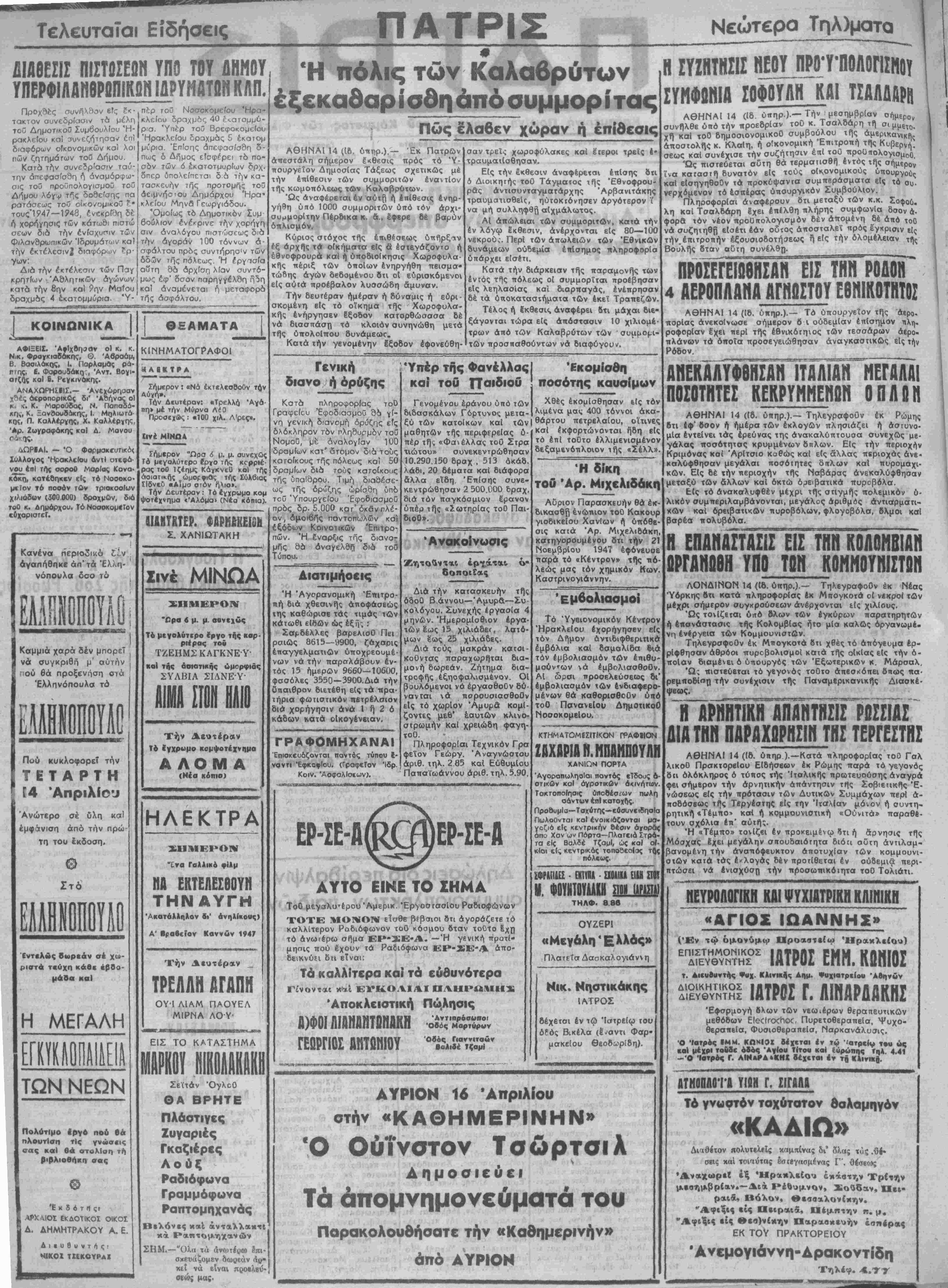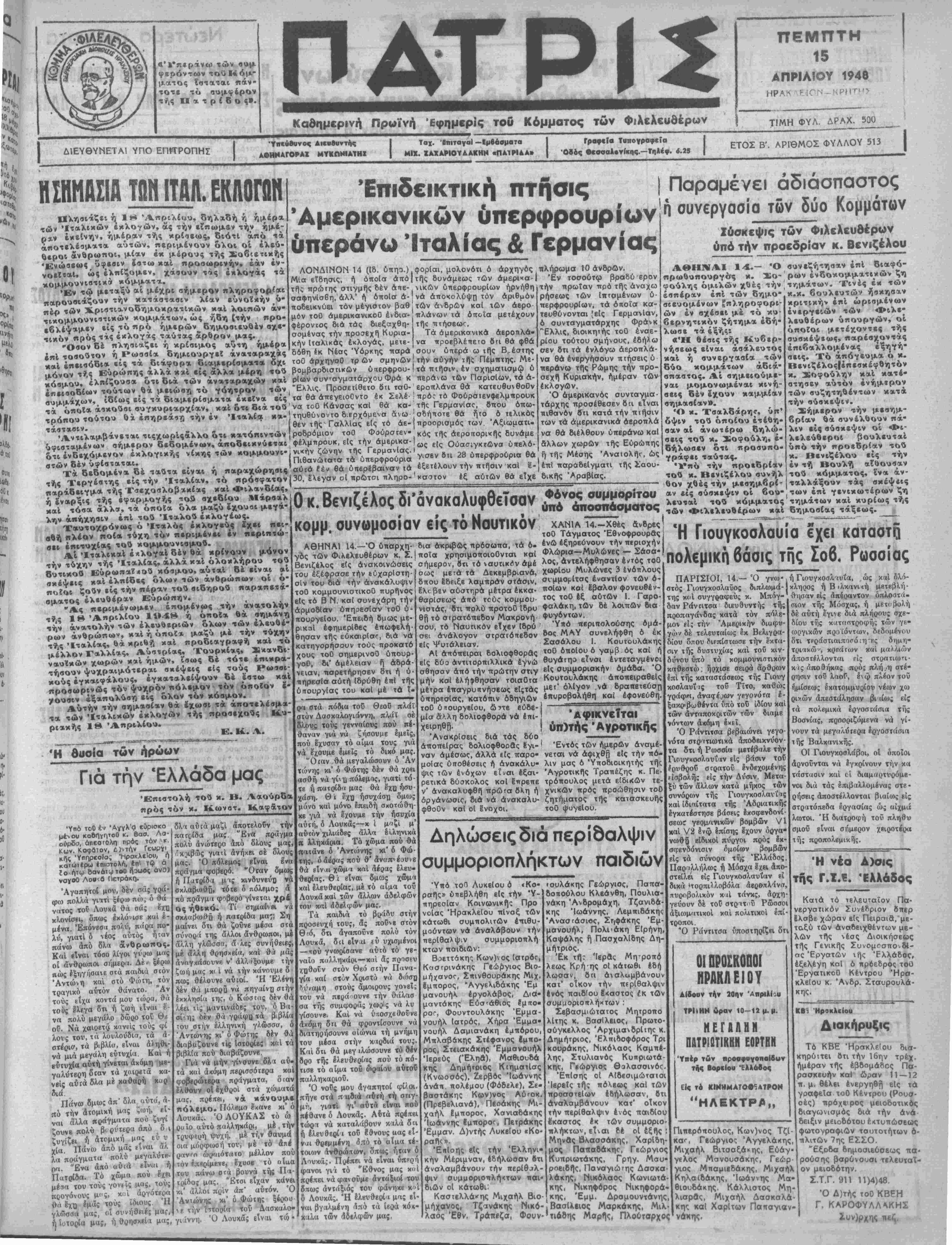 μ<ατος ίσταται πάν- τοτε τό συμφέρον τής Π α τ ρ ί δ ο ς». ΠΔΤ Κασημερινή Πρωϊνή Εφημερίς τού Κόμματος των Φιλελεύθερον ΠΕΜΤΤΤΗ 15 ΑΠΡΙΛΙΟΥ 1948 ΗΡΑΚ Ε4ΟΝ- ΤΙΜΗ ΦΥΛ. ΔΡΑΧ. 500 Δ1ΕΥΘΥΝΕΤΑ1 ΥΠΟ ΕΠγΤΡΟΠΗΣ •Υπκΰβυνος Αιειιουντής ΑβΗΜΑΓΟΡΑΧ ΜΥΚΩΝΙΑΤΗΙ Ταχ. 'ΒπιταγαΙ —Εμβάσματα ΜΙΧ. ΧΑΧΑΡΙΟΥΛΑΚΗΝ «ΠΑ1ΡΙΑΑ» Γραφεΐα Τιιπογραφεία Όββς ·εοοαλοτίκης.—Τηλέφ. 6.25 ΕΤΟΣ Β'. ΑΡΙΌΜΟΣ ΦΥΛΛΟΥ 513 Ι ΗϊΗπΑΣΙΑ ΤΩΝ ΙΤΑΛ. ΕΚΛΟΓΟΗ . «1 ■■!,,, . —————————. ' ' ί Πλησιάζει ή 18 Απριλίου, δηλχδή ή ήι**!ρα των Ίταλικών έχλογών, άς την είπωμεν την ημέ¬ ραν εκείνην, ημέραν τής κρίσεως, διότι άπό τα άποτελέσματα αυτών, περιμένουν όλοι οί έλεύ- θεροι άνθρωποι, μίαν έκ μέρους τής Σοβιετικάς Ενώσεως ϋφεοιν έστω χαί προσωρινήν, εάν έν- νοείβαΐ, ώς ελπίζομεν, χάσουν τάς εκλογάς τα κομμουνιστικαί κόμματα. Έν τώ μεταξυ αί μέχρι σημερον πληροφορίαι ■·'^»ρουβιάζουν την κατάστασιν λίαν ευνοΐκήν ύ» πέρ των Χ,ριστιανοδημοκρατΐκών καί λοιπών άν- -,ικομμθυνιστικών κομμάτων, ώς ήδη £τήν προ- εβλέψαμεν είς τό πρό ημερών δημοσιευθέν σχε¬ τικόν πρός τάς εκλογάς ταύτας άρθρον^μας.^ "Οσον δέ πλησιαζει η κρίσιμος αυτή ημέρα •πί τοσούτον ή Ρωσσία δημιουργεί άναταραχάς καί έπεισόδια είς τα διάφορα διαμερίαματα οχι μόνον τής Εύρώηης άλλά κ»1 είς άλλα μέρη «ού κόομαυ, έλϊϊίζουσα ότι διά των αναταραχών καί έηειαοδίων τούτων Θά μειώαη τό γόητρον των ( βυμμάχων, ιδίως είς τα διαμερίσματα έκείνα εις τα όποΐ* άσκούοι «υγκυριαρχίαν, καί ότι διά τού' τρόπου τούτου θ* *ηηρεάιη την έν Ιταλία κα-, τάσταοιν. %>,, ■>*»· Ι