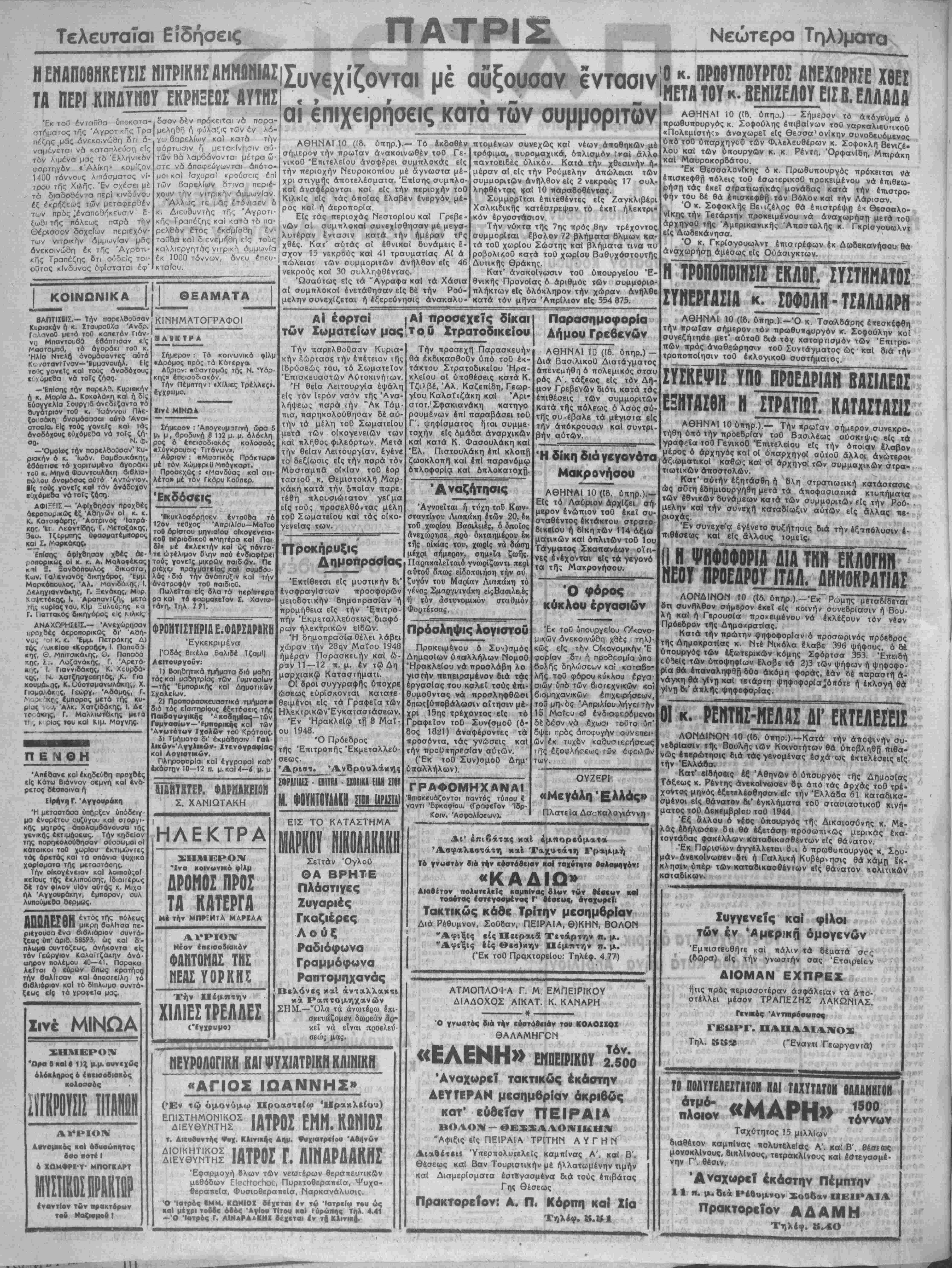 μειοδοτικήν δημοπρασίαν < προμήθεια είς την 'ξτπτρο πήν Εκμεταλλεύσεως διαφό ρων ήλεκτρικών είδών. Ή δημοπρασΐα θέλει λόβε χώραν την 28ςν Μαΐου 1948 ημέραν Πσρασκει,ήν καΐ ω ραν 11 —12 π. μ. έν τώ Δή μαρχιακώ Καταστήματι. Οίσροι συγγραφής ύποχρε ώσεως ευρίσκονται κατατε θειμένοι είς τα ΓραφεΤα των Ηλεκτρικών'Εγκαταστάσεων Έν Ηρακλείω τή 8 Μαΐ· ου 1948. Ό Πρόεδρος τής Έπιτροττής 'Εκμεταλλεύ σεως. Αριστ. ΆνΒρουλάκης ΙΦΡΑΗΙΕΣ - ΕΝΠΠλ~-ΟΛΙΚλ ΕΙΑΗ ΣΤΟΤ Μ. ΦΟΥΝΤΟΥΛΑΚΗ ΕΙΣ ΤΟ ΚΑΤΑΣΤΗΜΑ Σεϊτάν ΌγλοΟ ΟΑ ΒΡΗΤΕ Πλάστιγες Ζυγαριές Γκαζιέρες Λούξ Ραδιόφονα .■ Γραμμοφωνα Ραπτομηχανάς Βελόνες καί άνταλλακτι κά Ραπτομηχανών ΣΗΜ.—Όλα τα ανωτέρω έπι- σκευάζομεν δωρεάν αρ- κεΐ νά είναι προβλβύ- .^™ οεώ; μας. ΜΕΥΡΟΑΟΓΙΚΗ ΚΑΙ ΨΥΧΙΛΤΡΙΚΗ ΚΛΪΙΗΚΗ . «ΑΓΙΟΣ ΙΩΑΝΝΗΣ» * αΐΐε»—ε—ε-ε—ε·—■—»—«———■—■——«^——ε»—^——■—εε-ε—ε»βε«ι«———^ Εν τώ όμονύμω Προαστείω Ηρακλείου) ΕΚ°ΜΤ!ΪΣΟΣ ΙΑΤΡΟΣ ΕΜΜ. ΚΩΝΙΟΣ τ. Ακυβνντής Φυχ. Κλινικην Δημ. ΨυχιατρεΙου ΔΙΟ1ΚΗΤΙΚΟΣ ΔΙΕΥΘΥΝΤΗΣ Έφαρμογή βλων των νεωΐέρων θεράπευπκων μβθόδων ΕΙθ<:γ,<χγι<χ, ΠυρβτοθερατιεΙα, Ψυχο- θεραπεΐα, ΦυσιοθερατιεΙα, Ναρκανάλυσις. Ό Ίατρός ΙΜΜ. ΚΑΜΙΟΧ βέχ*ται έν τ0 Ιατρ.ίν τ·υ ώς καΐ μέχρι τούδε όδος Άγιου Τίτου καΐ ίυρώπης τηλ. 4.41 -Ό Ίατρός Γ. ΑΙΝαΡΑαΚΗΧ βέχεται έν τή Κλινικβ. ΙΑΤΡΟΣ Γ. ΛΙΝΑΡΔΑΚΗΣ θά έκδικασθοόν υπό τοθ έ«- τάκτου Στρστοδικείου Ηρα¬ κλείου αί ύποθέσεις κατά Κ Τζιλβέ, Άλ. Καζεπίδη, Γεωρ- γΐου Καλαΐτζάκη καΐ Άρι· στοτ.'Σφακιανάκη κατηγο ρουμένων επ! παραβάσει τοθ Γ'. ψηφΕσματος ήτοι συμμε τοχήν είς όμάδα άναρχικών καΐ κατά Κ. Φασουλάκη καί Έλ. Πιστουλάκη επί κλοπη ζωοκλοπη" καΐ επί παρανόμω όπλοφορΐα καΐ όπλοκατοχή. 'Αναζήτηοις "Αγνοεΐται ή τύχη τοϋ Κων σταντίνου Λιοπάκη έ των 20, έκ τοϋ χωρίου Βασιλειές, δ οποίος άνεχώοησβ πρό οκταήμερον έκ τής οικίας τού, χωρίς νά δώσχι μέχρι σήμεοον, σημεΓ,α ζωής. Παρακαλεΐταιδ γνωρίζωντι περί αύτοΰ δπως ειδοποιηθη την σύ ζυγόν τού Μαρίαν Λιαπάκη τό γένο; Σμαργιανάκη είςΒασιλειές ή νόν αστυνομικόν σταθμόν Φορτέτσας. Πρόσληψις λογιστοΰ Προκειμένου ό Συν)σμός Δημοσΐων όιαλλήλων ΝομοΟ Ηρακλείου νά τιροσλάβη λο γιστήν πεπειραμένον διά τάς εργασίας τού κσλεΐ τούς έπι- Θυμοθντας νά προσληφθΛσι οπως{ύποβάλωσΐν αίτησιν μέ- χρι 15ης τρέχοντος είς τό Γραφείον τοθ Συν(σμο0 (δ· δος 1821) άναφέροντες τα τιροσόντα, τάς γνώσεις καΐ την ιτροϋαηρεσΐαν αυτών. ("Εκ τοθ Συν)σμο0 Δημ1 ύπαλλήλων). ΓΡΑΦΟΜΗΧΑΝΑΙ Ίπιθκευάζονται παντός τύπου € ναντι "ΕφκοφΙου. (ΓρθφεΤον Ίδρ- Κοιν. Άοφαλίσεων). Παρασημοφορία Δήμον Γρεθενών ΑΘΗΝΑΙ 10 (18. ύτιηρ.) - Διά ΒασιλικοΟ Διατάγματος απενεμήθη ό πολεμικός σταυ ρός Α'. τάξεως είς τόν Δή¬ μον Γρεβενών διότι κατά τάς έπιθέσεις τθν συμμοριτων κατά τής πόλεως ό λαός αυ¬ τής συνέβαλε τα μέγισΐα είς την άτιόκρουοιν καΐ συντρι- βήν αυτών. Ή δίκη διά γε γονό Μακρονήσου ΑΘΗΝΑΙ 10 (16. ύτίηρ.).— Είς τό Λαύριον άρχίζει σή¬ μερον ενώπιον τοθ έκεΐ συ- σταθέντος έκτάκτου στρατο δικείου ή 6(κη των 114 άξιω ματικών καί όπλιτών τοθ 1ου Τάγματος Σκαπανέων οΐτι¬ νες ένέχονται είς τα γεγονό τα τή; Μακρονήσου. κ. ΠΡΟΟΥΠΟΥΡΓΟΣ ΑΝΕΧΩΡΗΣΕ ΧΘΕΣ ...... ΒΕΝΙΖΕΛΟΥ ΕΙΣ Β. ΕΑΑΑΔΑ ΑΘΗΝΑΙ 10 ((Β. ύτττρ.) - Σήμερον τό άπόγΕυμα ό πρωθυπουργός κ. Σοφούλης έπιβαΐνων τοθ ναρκαλιβυηκοθ «Πολεμιστήζ» αναχωρεί είς Θεσσα'ονΙκην συνοδευομένη υπό τοθ ύπαρχηγοθ των Φιλελευθέρας κ. Σοφοκλή Βενιζέ¬ λου καί των οπουργών κ. κ Ρέντη, Όρψανίδη, Μτιιράκη καί Μαυροκορδάτου. ' Έκ θεσσαλονίκης δ κ. Πρωθυπουργός ττρόκειται νά επισ