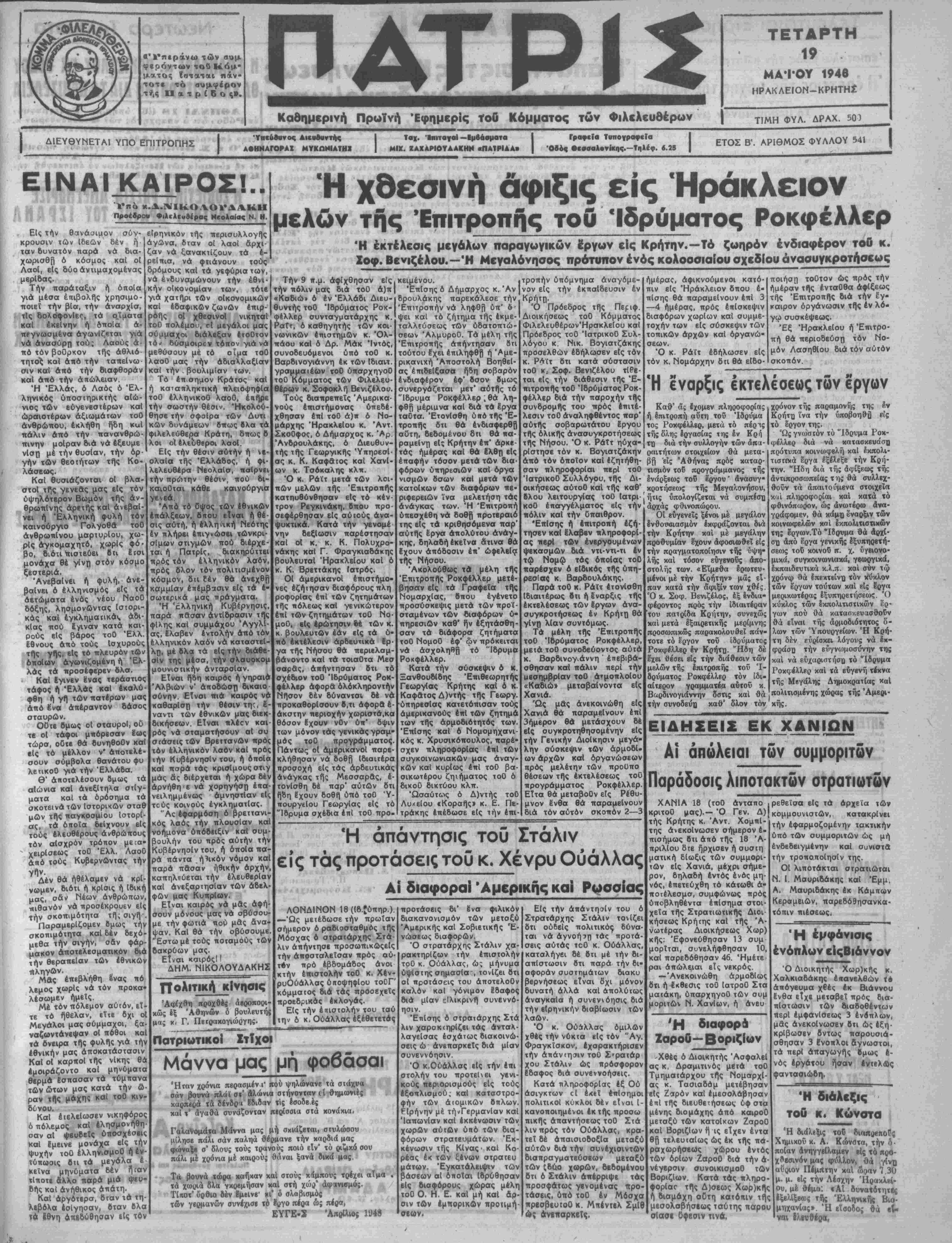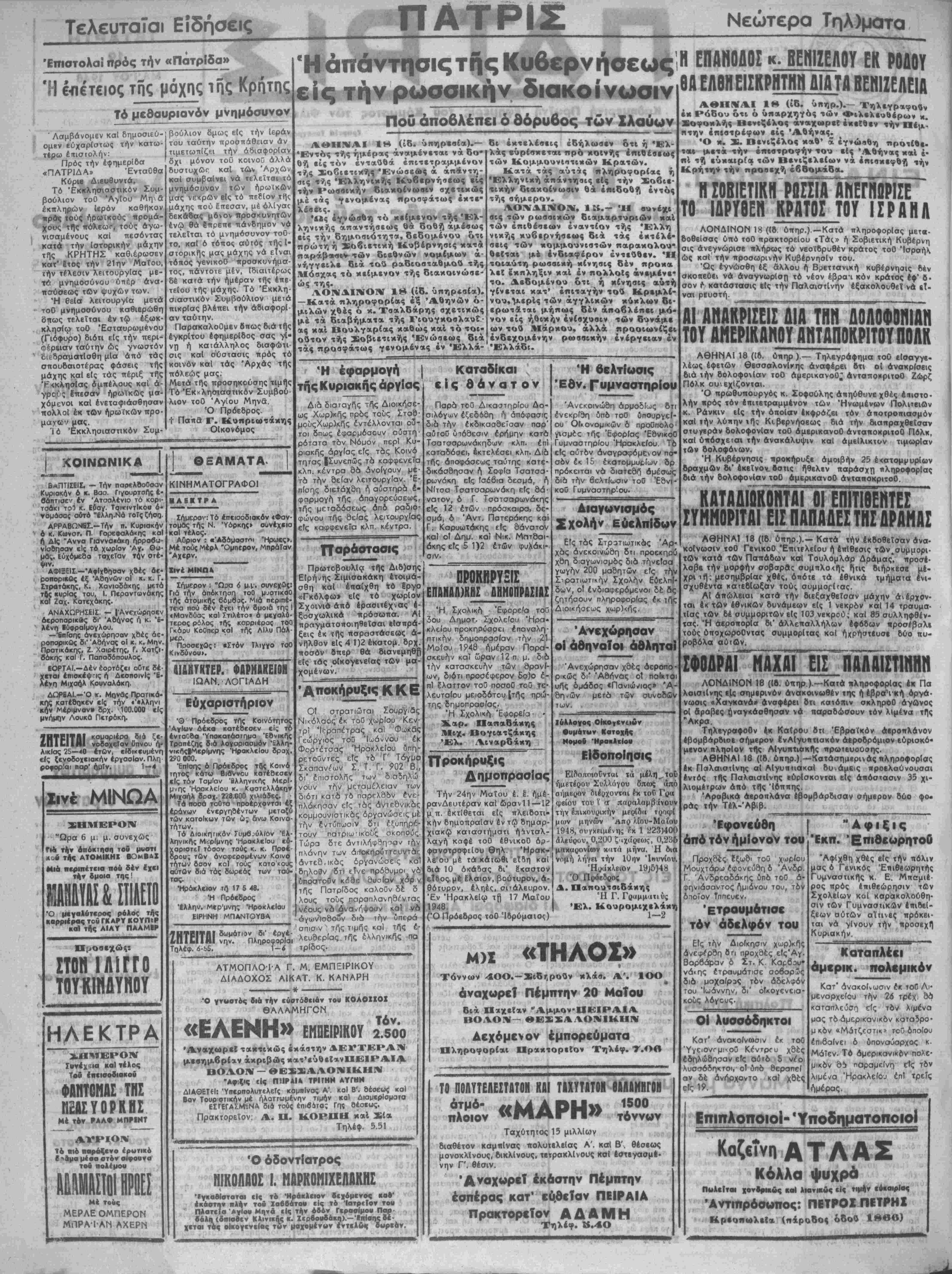 Διοικήσεως χωρ)<ής. Ανεχώρησαν οί άθηναϊοι άθληταΐ Ανεχώρησαν χδές άεροπο ρικώς δι* Άβήνας οί παίκται υής ομάδος «ΓΊανιώ^ιος» 'Α- αηνών μετά των συνοδών των. Ιύλλογος ΟΙκο,ενειών ΦυμάτΜΥ Κατοχής Νομόν Ηρακλείου ΕίδοποΙησις ΕΙδοποιοΓινται τα η ήμετέρου Συλλόγου δπως έ άπό μων σήμερον διέοχονται έκ τού Γ'ριι φβίου τού Χ α παραλαμβιίνουν την έπικονριχήν μεοίδκ τροφί μηνών Ήπρ λίου-Μαΐου , συγκειμένης έκ 1 22.1)400 άλεύρυυ, Ο,'^ΟΟ ζιχάρεακ, 0,2ο6 μαχαρονίων κατά μήνα, Η δια νομή λήγει την 10ην Ίκυνί Ηράκλειον 19)5)48 Ό Πρόεδρος Δ. Παπουτσιοάκης Ή Γ. Γραμματεύς Έλ. Κουρομιχελάχη 1-2 «ΤΗΛΟΣ» Τόννων 4ΟΟ.-ΣιδΓ,ρούν κλάσ. Α'. 1ΟΟ αναχωρεί Πέμπτην 20 ΜαΤοιι διά ΠαχεΙαν *Άμμον-ΗΕΙΡΑΙΑ ΒΟΛΟΝ— ΘΕΣΣΑΛΟΝΙΚΗΝ ΡΚί Δεχόμοον έμπορεύματα ,^; Πληροφορίαι Πρακτορείον Τηλέφ. Τ.ΟΛ ΤΟ ΠΟΛΥΤΕΛΕΣΤΑΤΟΜ ΚΑΙ ΤΙΧΥΤΑΤΟΗ 6ΑΑΑΜΗΓ0Ν άτμό- «ΜΑΡΗ» 1500 πλοιον ^Ι^ΙΛγΓΙ^ τόννων •.«β..·,·.-.^! Ταχύτητος 13 μιλλΐων ·ΐ-. ,,»β διαθέτόν ΚαρηΙνας πολυτελείας Α'. καΐ Β'. θέσεως μονοκλΐνους, δικλίνους, τβτρακλΐνους κσΐ έστβγασμΙ- νην Γ'. θέσιν. νβχωρβΤ εκάστην Πέμπτην εσπέρας κατ' ευθείαν ΠΕΙΡΑΙΑ Πρακτορείον ΑΔΑΜΗ Τηλέφ. 8.4Ο Η ΕΠΑΝΟΔΟΣ κ. ΒΕΝΙΖΕΛΟΥ ΕΚ ΡΟΔΟΥ ΘΑ ΕΛΒΗ ΕΙΣΚΡΗΤΗΙΙΔΙΛΤΑ ΒΕΝΙΖΕΛΕΙΑ ΑΘΗΝΑΙ 18 (ίδ. ύιιηρ.).- Τηλεγραφοθν εκ Ρόδον ότι ο υπαρχηγός των Φιλελεύθερον μ Χοφοκλής Βενιζέλος αναχωρεί εκείθεν την Πέμ¬ πτην έπιστρέφων είς Αθήνας. Ό κ. Σ. Πενιζέλος καθ» α εγνώσθη προτίβε- τ** μετά την έ««στροφήν τού είς Αθήνας κ αί έ· ηί τή εύκαιρΓα των Βενιζελείων νά επισκεφθή την Κρήτη* την προσέχη έββομάδα. Η ΣΟΒΙΕΤΙΚΗ ΡΟΜΟΗεγΜοΡΪσΤ" ΤΟ 1ΔΡΥΘΕΠ ΚΡΑΤΟΣ ΤΟΪ ΙΣΡΑΗΑ ΛΟΝΔΙΝΟΝ 18 ((β ύπηρ.).—·Κατά πληροφορίας μετβ- δοθείσας υπό τοθ πρακτορεΐου «Τάτ.» ή Σοβιετική Κυβέρνη σις άνεγνώρισε κλήρος τό νεοΐβρυθέν κράτος τοθ Ίσραήλ ώς καΐ την προσωρινήν Κυβέρνησιν τού. Ώς εγνώσθη έξ άλλου ή Βρεττανική κυβέρνησις βέν σκοπεοει νά αναγνωρίση τό νέον έβρα·ι κόν κράτος 4φ' β· σον γ*· κατάστασις είς την ΠαλαιστΙνην έξακολουθεϊ νά βΐ- ναι ρευστή. ΑΙ ΑΝΑΚΡΙΣΕΙΣ ΔΙΑ ΤΗΝ ΔΟΛΟΦΟΝΙΑΗ ΤΟΥ ΑΜΕΡ1ΚΛΙ10Υ ΑγΪΤΑΠΟΚΡΙΤΟΥ ΠΟΛΚ ΑΘΗΝΑΙ 18 (Ιδ. ύτιηρ ).— Τηλεγράφημα τοθ εισαγγε¬ λέως έφετών θεσσαλονίκης άναφέρει βτι οί άνακρίσεις διά ιήν βολοφονΐαν τοθ άμερικανοθ"; ΑνταποΗριτοΟ Ζώρζ Π6λκ ουεχ(ζονται. Ό πρωθυπουργός κ. Σοφούλης απηύθυνε χθές βπιστο· λήν κρός τόν επιτετραμμένον των Ήνωμένων Πολιτειθν κ. Ράνκιν είς την οποίαν έκφράζει τόν άηοτροπιασμόν καί ΐήν λύπην τής Κιβερνήοεως διά την διατιραχθείσαν στυγτράν δολοφονΐαν τοθ άμερικανοθ άνταποκριχοθ Πόλκ, καΐ ύκόσχεΐαι την ανακάλυψιν καΐ άμεΐλικτον τιμωρίαν τ&ν δολοφόνων. Ή Κυβέρνησις τιροκήρυξε αμοιβήν 25 έκατομμυρΐων βραχμΛν δΥ εκείνον βστις ήθελβν παράσχη πληροφορίας διά την ΒολοφονΙαν τοθ άμερικανοθ άνταποκριτοθ. ΚΑΤΑΔίΩΪΟΝΤΑΙ ΟΙ ΕΠΙΤ1ΘΕΗΤΕΣ ΣΥΜΜΟΜΤΑΙ ΕΙΣ ΠΑΠΑΔΕΣ ΤΗΣ ΔΡΑΜΑΣ ΑΘΗΝΑΙ 18 (16. ύπηρ.).- Κατά την έκοοθβΐσαν ανα¬ κοίνωσιν τοθ ΓενικοΟ ΈπιτΓλεΙου ή επίθεσις τών,συμμορι- τθν κστά των Παπάδων καΐ Τουλομλάρ δράμας, ττροσέ· λαββ την μορφήν σοβαράς συμπλο<τ)ς ήτις διήρκεσε μέ-< χρι τή; μεσημβρΙαΓ χθές, όπότε τα έθνικά τμήμσΐα έν»- σχυθέντα κατεδίωξαν τούς συμμορΐτας. ΑΙ απώλειαι κστά την διεξαχθεΓσαν μάχην άχέρχόν· ται έκ των έθνικΟν δυνάμεων είς 1 νεκρόν καΐ 14 τραυμα- τίας των δέ συμμοριτθν είς 103 νεκρού; καΐ 85 συλληφθέν¬ τος. Ή αεροπορΐα δι' αλλεπαλλήλων ίφόοων «ροσέβαλι τούς ΰποχωροθντας συμμορίτας καΐ ήχρήστευσε δύο «υ- ροβόλα αυτών. ΣΦΟΔΡΑΠΪΑΧΑΓΕΙΣ "ΠΑΑΑΙΣΤΙΗΗΗ ΛΟΝΔΙΝΟΝ 18 (16. ύπηρ ).—Κατά πληροφορίας