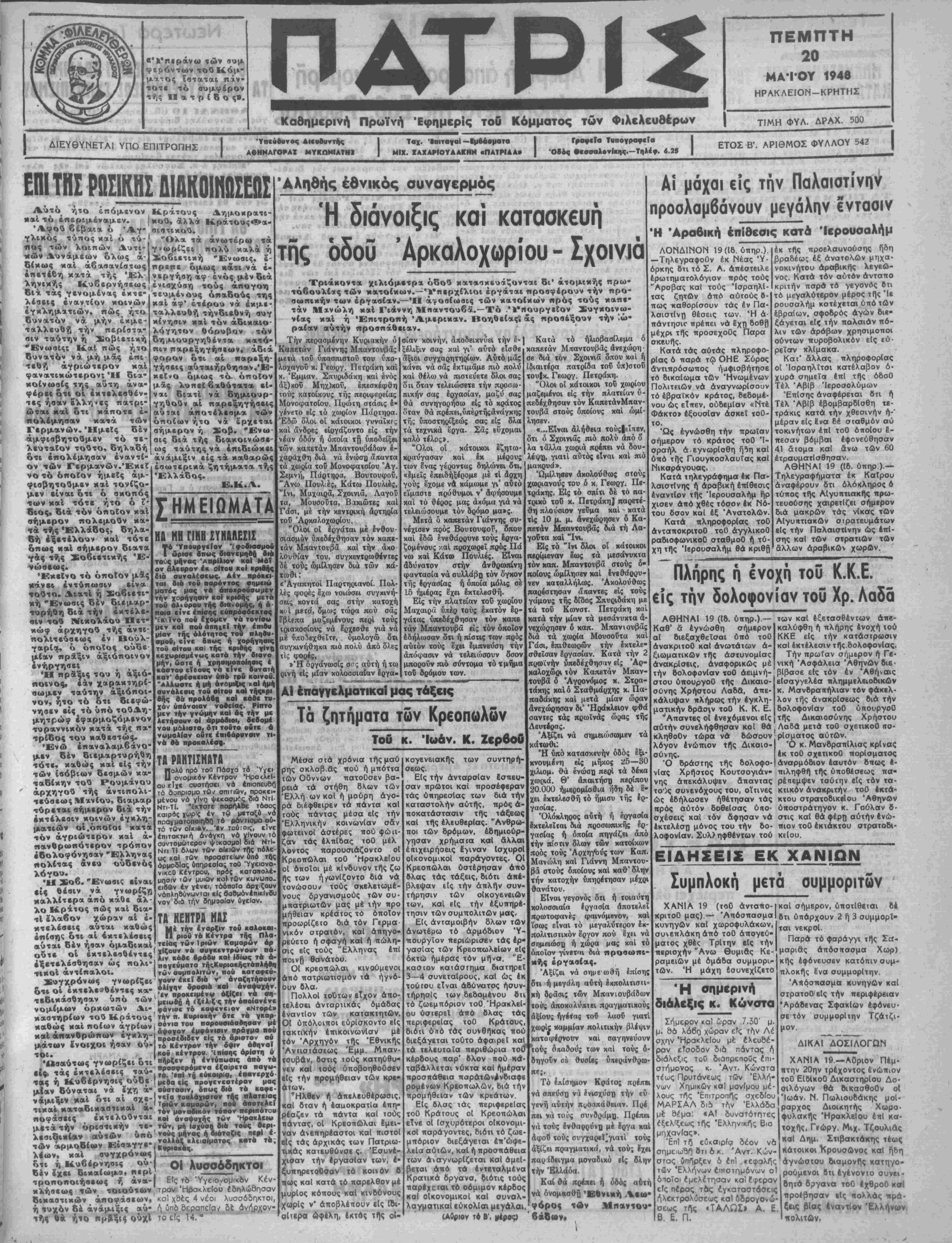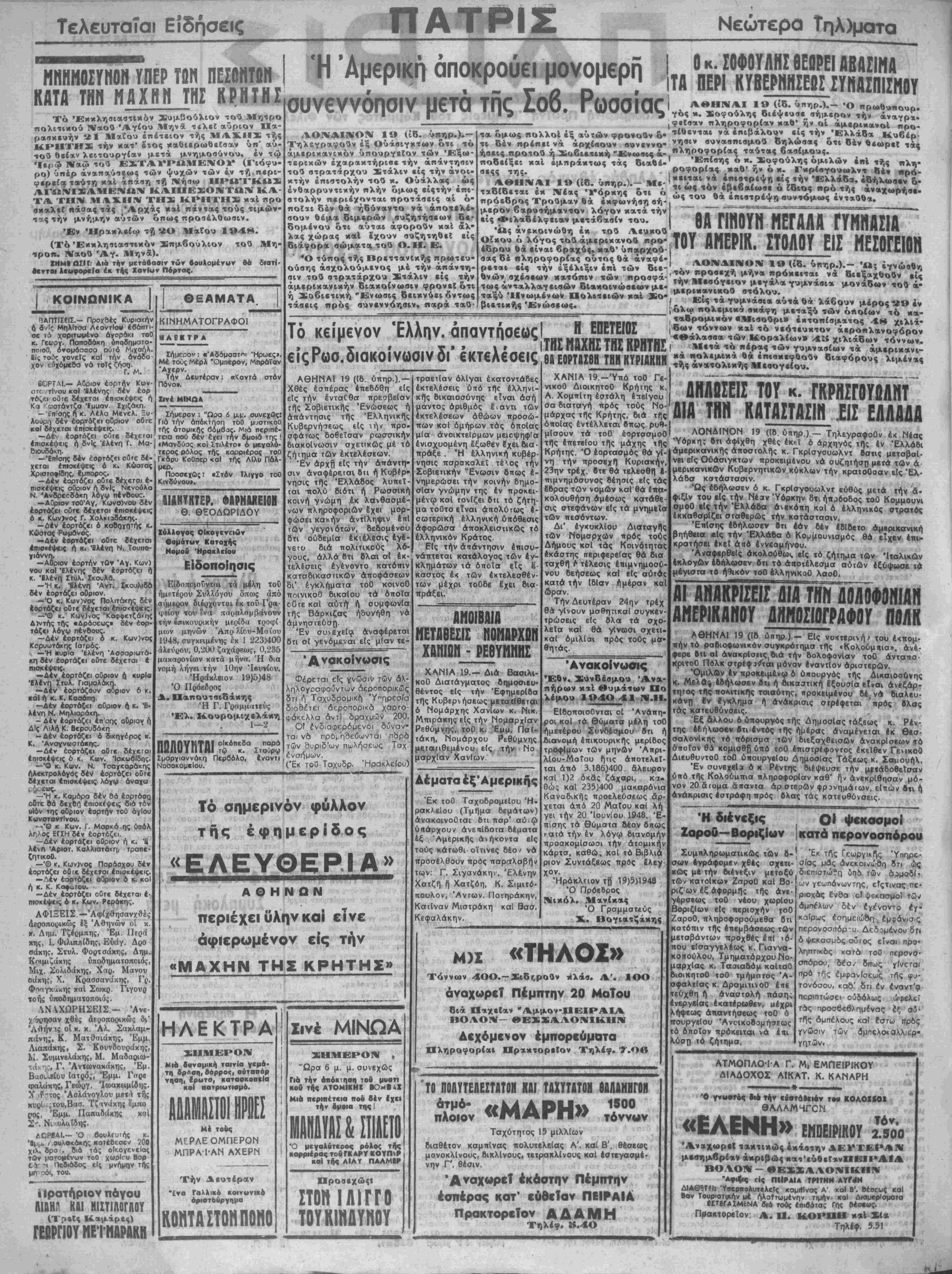 ΛΟΝΔΙΝΟΝ 19 (Ιο ύπηρ.)— Τηλεγραφοθν έ< Νέας κη; βτι αφιχθη χθές έκ*ΐ ό άρχηγός τής έν Ελλάδι άμερικανικής άποστολής κ. ΓκρΙσγσυωλντ όστις μετσβαΐ· νει είς Οόάσιγκτων προκβιμένου νά συζητήση Η«τ* των ά μερικανικών Κυβερνητικήν κύκλων την κρατοθοαν είς Έλ· λάδσ κατάστασιν. Ώς εδήλωσεν ό κ. ΓκρΙσγουωλντ ευθύς μετά την 4- φιξΐν τού είς την Νέαν Υόρκην οτιήπρόοδος τοθ Κομμουνι σμοθ β(ς την "Ελλάδα άνεκόπη καί ό ελληνικάς στρστος έκκαθαρίζει σταθερώς την κατάστασιν. Έπίσης εδήλωσεν βτι εάν δέν εδίδετο άμιρικανική βηήθεια «Ις την Έλλάδα ό Κομμουνισμός θά είχεν έτιι- κρατήσει έκεΐ ά πό έννεαμήνου. ΆναφβρθεΙς άκολούβωι, είς τό ζήτημα των Ίταλικων βκλογών εδήλωσεν δτι τ6 άαοτέλβσμα αυτών έξύψωσε τα μέγιστα τό ή9ικόν τοθ έλληνικοθ λαοθ, ΑΙ ΑΗΑΚΡΙΣΕΙΣ ΔΙΑ τΜδΟαΊΪΦΟΝΙΑΝ ΑΜΕΡΙΚΑΝΟΥ ΔΗΗΟΣΙΟΓΡΑΦΟΥ ΠΟΑΚ ΑΘΗΝΑΙ 19 (Ιδ ύπηρ.).— Είς νυκτερινήν τού έχπομ· πήν τό ραοιοφωνικόν συγκρότημα τής «Κολούμηια», άνβ- φερε 6η αί άνακρίσίΐς(διά την δολοφονΐαν τοθ άνταπο· κριτοθ Πόλκ στρέφιν'ται μόνον εναντίον άριστερών. "Ομιλών έν προκειμένω ό ύιιουργός της Δικαιοσύνης κ. Μελα<4 εδήλωσεν βτι ή βικαατική εξουσΐα βί»αι άνεξάρ- τηίος τήςποΜτικής τοιαύτης, προκειμένου δέ νά Βιαλευ- κάντ) ίν Ιγκλημα ή άνάκρισις στρέφεται 'πρός βλος τάς κατευθύνσβις. Έξ άλλου ό ύπουργός τής Δημοσίας τάξεως κ. Ρέν¬ της έίήωοβν 6τι ίντός τής ημέρας άναμένβται έκ θεσ¬ σαλονίκης τό πόρισμα των οΐΕξαχθεισων άνακρΐσεων <ϊό όποΓον θά κομισβρ υπό τοθ έπιστρίφοντος εκείθεν Γε»ικοΟ ΔιευθυντοΟ τοθ ύποιιργεΐου Δημοσίας Τάξεως κ. Σαμουήλ. Έν συνεχεΐα ό κ Ρέντης βιέψβυσε την μετάβοθεΐσαν υπό τής Κολούμπια πληροφορίαν καθ' ήν άνεκρΐθησαν μό¬ νον 20 άτομα άπαντα άρ στερών Φρσνημάιων, εΐπών ατνή άνάκρισις έστράφη πρός βλας τάς κατευθύνσεις. Η διένεξις ΟΙ ψεκοσμοΙ * Ζοροϋ—Βοριςίων κατάπερονοσπόροι* ■ ι^εβεββ—μμεΜΜε> ^ ^