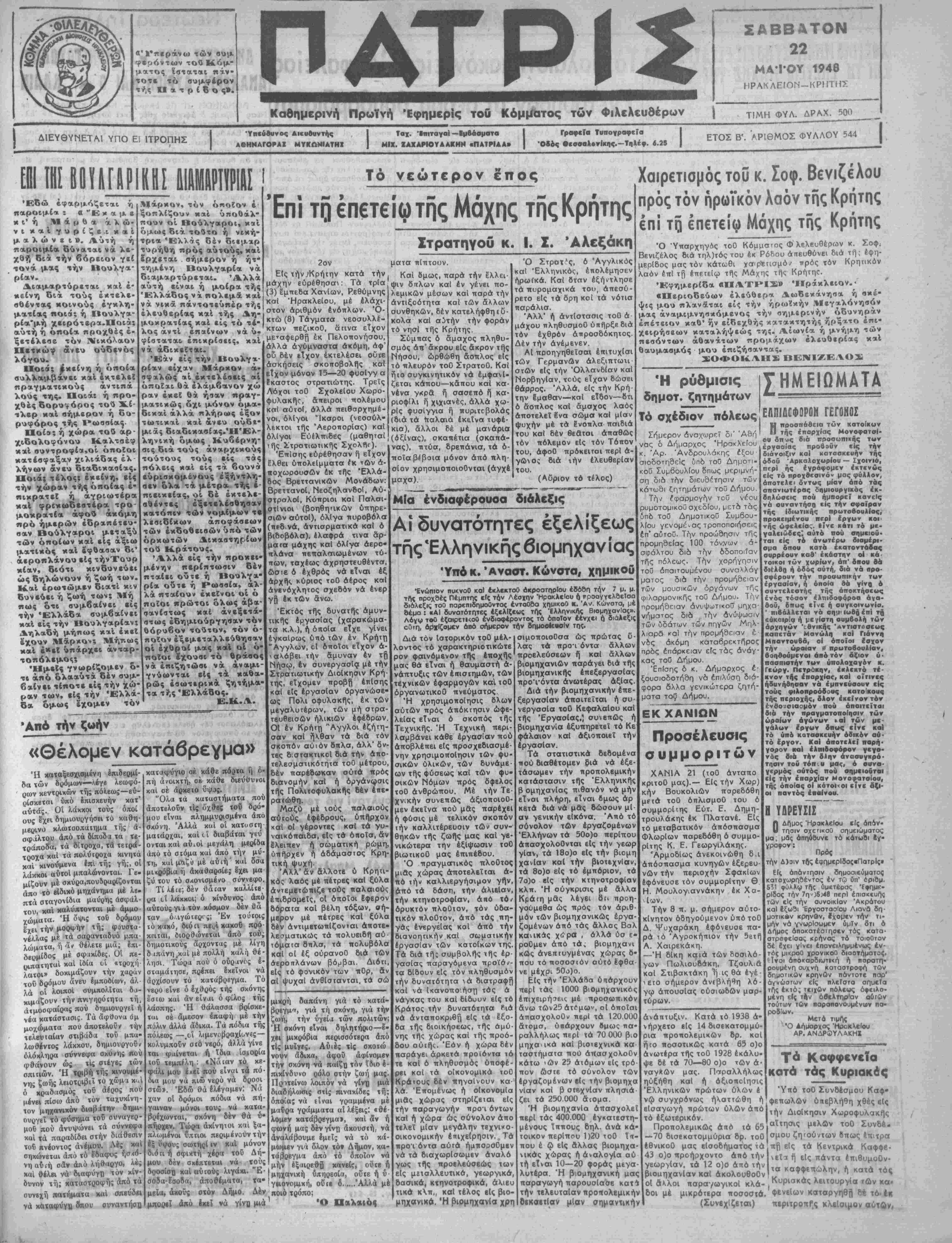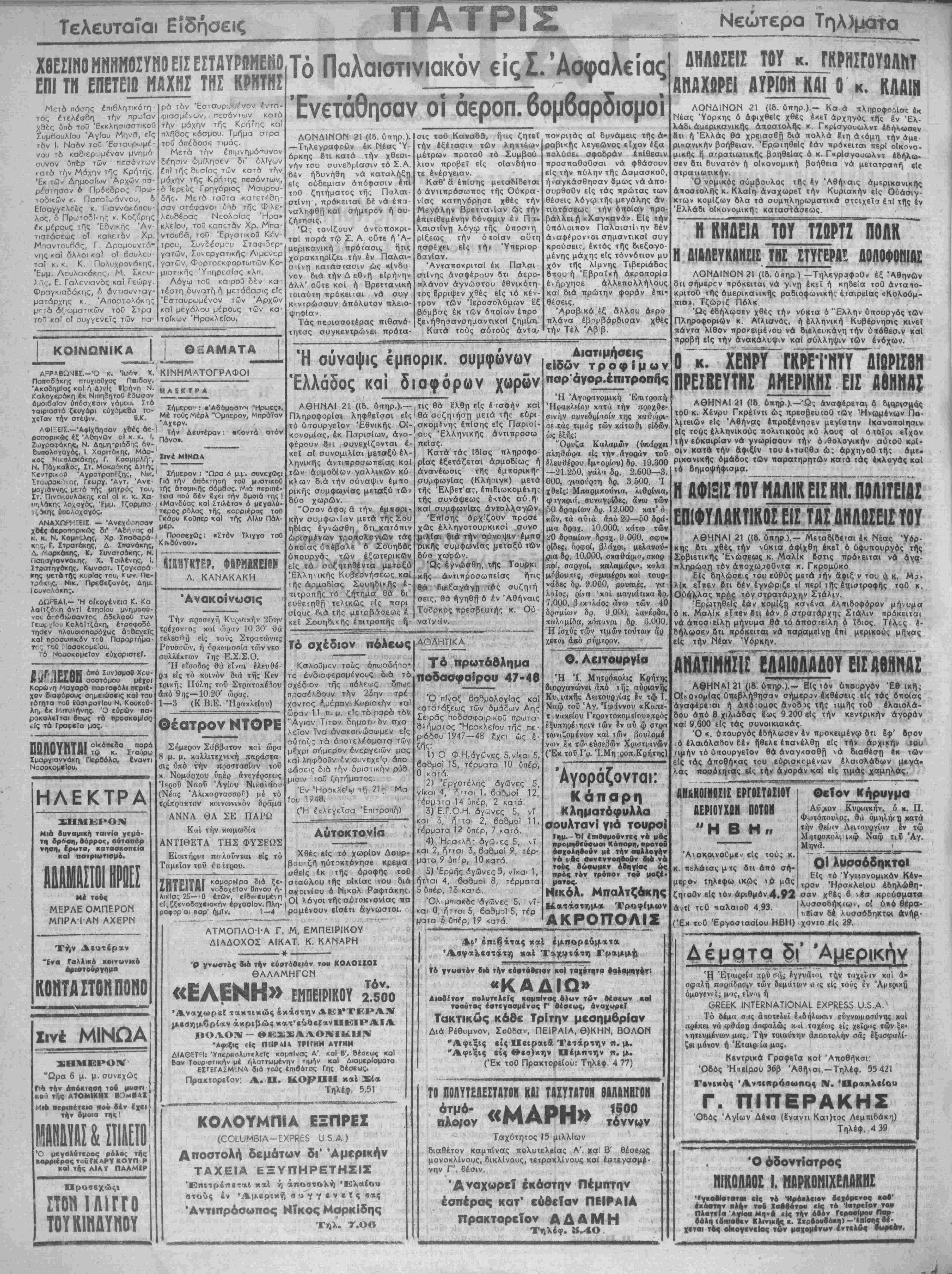 βτι ή Ελλάς θά χρβισοβρ διά πολλά ϊτη ά<όμη την άμβ- ρικανικήν βοήθειαν. Ερωτηθείς εάν πρόκειται περΐ οΐκονο- μικής ή στρατιωιΐκής βοηθείας ό κ. ΓκρΙσγουωλντ εΒήλω- σεν ότι δυνατόν ή οίκονομική βοηθεία νά μετατραηή β(ζ στμαιιωτικήν. Ό νομικός σύμβουλος τής έν Αθήναις άμερικανικτ}ς άποστολής κ. Κλαίη· αναχωρεί την Κυριακήν είς Ούάσιγ- κτων κομίζων ολα τα συμπληρωμστικά στοΐχεΐα επί τί)ς έν "Ελλάδι οίκονομική; καταστάσεως Η ΚΗΔΕΙΑΊοΫ ΤΖΟΡΤΖ ΠΟΛΪ Η ΠΙίΛΕΥΚίΙΙΣΙΣ ΤΒΕ ΣΤΥΓΕΡίϋ ΔΟΛΟΦΟΗΙΑΣ ΛΟΝΔΙΝΟΝ 21 (Ιδ. ύιιηρ ) —Τηλεγρςιφοθν έξ Αθηνών δα σήμερον τιρόκειται νά γίνη έκεΐ ή κηδεΐα τοθ άνταιο- κριτοθ τής άμερΐκανΐκής ρο&ιοφωνικής έιαιρβΐας «Κολούμ.- πιο». Τζώρτζ Πόλκ Ώ», εδήλωσεν χθες ιήν νύκτα ώ ' Ελλην ύπουργός τθν Πληροφορίαν κ. ΑΙλιοτνός, ή έλληνική Κυβέρνησις κινεϊ τιάντσ λΐθον προκΒΐμένου νά ΒιβΚευκάνη την υπόθεσιν καΐ •προβή είς την ανακάλυψιν καί σύλληψιν των ένόχων. Ο ~κ7ΐΕΪΡΤΓΚΡΕ'Μγ1ΐΩΡΙΣβΗ ΠΡΕΙΒΕΥΤΗΣ ΑΜΕΡΙΚΗΣ ΕΙΣ Α8ΗΝΑΣ Ο. ΛειτοΜΡγΙσ Ή Ί Μητρόπολις Κρητη διοργανώνβι άπό τή; αύριανη"ς Κυ,ιακής Λειτουρ/ίας έν τφ Ι Ναφ τού Αγ, Ιωάννου «Καπε· Τ νακείου Γεροντοκομείου»πρός (■ξυπηρέ'ηαν των έν αύ φ οτρ« τωνιζομένων καί των βουλομέ νων εκ τώιεΰσεβών Χριιΐτιανών (Έκ τού Γϋ. Ί.Μη ροπ.Κρήτης Άγοράζονται: Κάπαρη Κληματόφυλλα σουλτανί γιά τουρσί Ιημ.-*>1 <πιβυμοϋντες νά μ άς ηρομηβ<ύο»οι ΚΑηαριτ, ηροτου οαχοληβουν μέ την συλλογήν· νά μάς σανεννοηβοϋν διά νά τοίις βώαυμεν όβηγίας ώς πρός τόν τρόπον τού μαζέ ματος. Νικόλ. Μπαλτζάκης Κατάβτημα Τροφίμων ΑΚΡΟΓΓΟΛΙΣ επιβάτας κ αί έμπορεύματα «αί Ταχυχάτη καΐ Τ6 γνυοτόν διά την (όατάθοον κα) τα|ύτ||τα «ΚΑΔΙΩ» Αιανίτον πολυτΐλιΐς καμηΐνας δϋαν τώ» δέοιυν τοαύτος έοτεγασμένας Γ' οέοευς, αναχυρΐί Τακτικώς κάδε Τρίτην μεσημβρίαν Διά Ρέθυμνον, ΣοΟδα>', ΠΕΙΡΑΙΑ, Θ)ΚΗΝ, ΒΟΛΟΝ