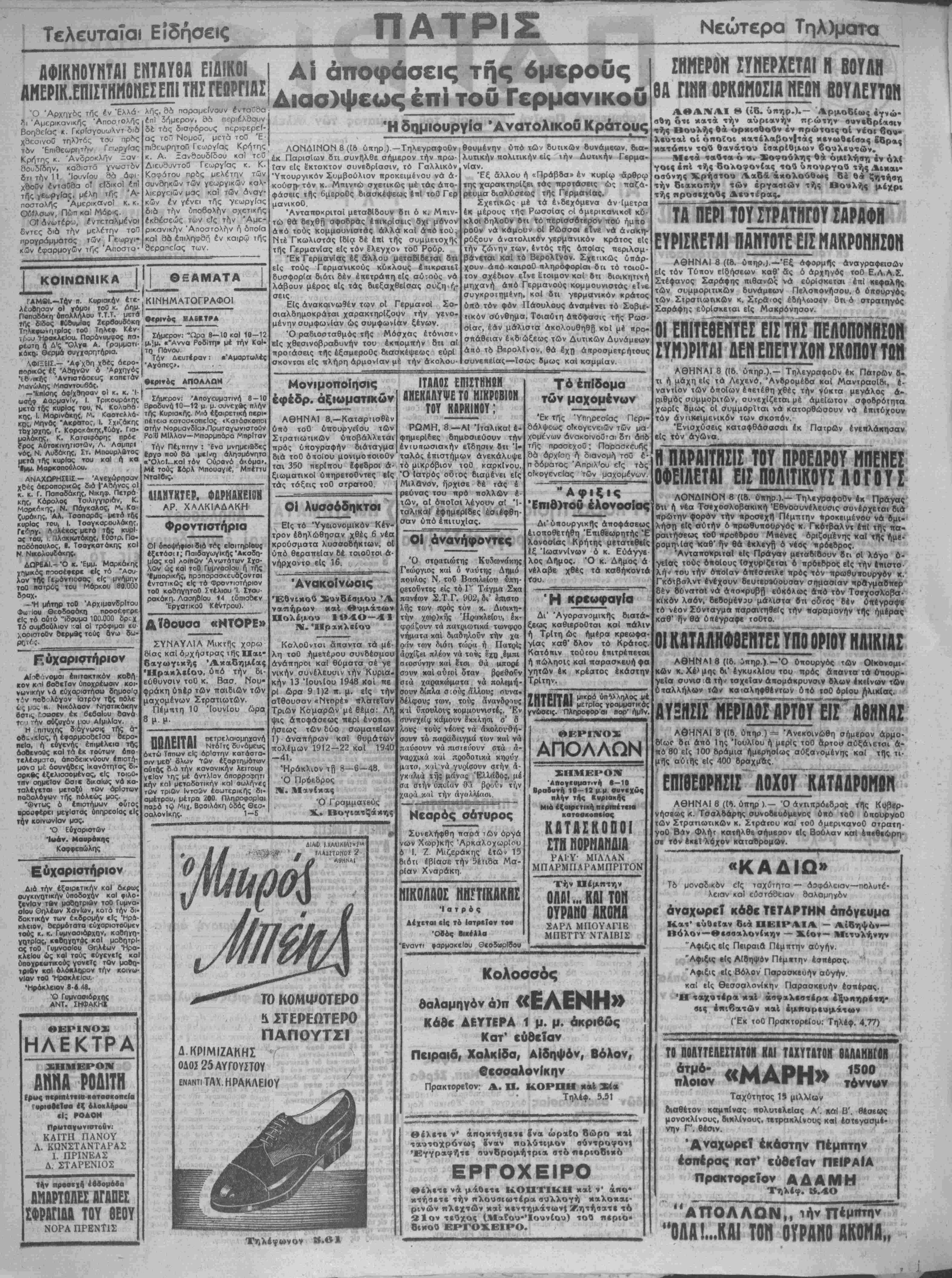 Μετά ταύτα ό κ. Σοφούλης θά ομιλήση έν όλ< γοις επί τής δολοφονίας τού ύηουργοΰ τής Αικαι- οαύνης Χρήστου Λαβά ακολούθως δέ θα ζητήση την διακοπήν των εργασιών τής Βονλής μέχρ» τής προσεχούς Δεοτέρας. ΤΑ ΠΕΡΙ ΤΟΥ ΣΤΡΑΤΗΓΟΥ ΣΑΡΑΦΪΓ ΕΥΡΙΣΚΕΤΑΙ ΠΑΝΤΟΤΕ ΕΙΣ ΜΑΚΡΟΗΗΣΟΝ ΑΘΗΝΑΙ 8 ((β. ύπηρ.}.—Έξ αφορμάς άναγραφΕΐσών είς τόν Τύπον εΐδήσεων καθ' δς ό άρχηγός τοθ Ε.Λ.Α.Σ. Στέφανος Σαράφης πιθανώς νά ευρίσκεται επί κεφαλής των συμμοριτικών δυνάμεων Πελοπονήσου, ό ύπουργός των Στρατιωτικών κ. Στραος έδήΚωσβν ότι ό στραιηγός Σσράφης ευρίσκεται είς Μακρόνησον. οι επιτεθΜεΤειΤτηΤπελμΙησον ΣΥΜ3ΡΙΤΑΙ ΔΕΗ ΕΠΕΤΥΧΟΝ ΣΚΟΠΟΥΤΩΗ ΑΘΗΝΑΙ 8 ((δ. ύπηρ.).— Τηλεγραφοθν έκ Πβτρων ό¬ τι ή μάχη είς τα Λεχενσ, Άνβρομέδα καί Μαντρσσίδι, ε¬ ναντίον των οποίων επετέθη χθές την νύκτα μεγάλον ά- ριθμός συμμοριτών, ουνεχίζεται μέ αμείωτον σφοβρότητα χωρίς βμος οί συμμορΐται νά κατορθώσουν νά επιτύχουν τόν άνηΚ€ψενικόν των σκοπόν. Ένισχύσεις καταψθάσασαι έκ ΠατρΛν ένεπλάιιησαν είς τόν άγώνα. ΗΠΑΡΑΙΤΗΣΙΣ ΤΟΥ ΠΡΟΕΔΡΟΥ ΜΠΕΝΕΣ ΟΦΕΙΛΕΤΑΙ ΕΙΣ ΠΟΛΐΤΙΚΟΥΣ ΛΟΓΟΥ Σ ΛΟΝΔΙΝΟΝ 8 ((δ. οττηρ.).— ΤηΧεγραψοΟν έκ Πράγας ότι ή νέα Τσεχοσλοβακική "Εθνοσυνέλευσις συνέρχεται διά πρώτην φοράν την προσέχη Πέμπτην *ροκειμένβυ νά ομι¬ λήση ε1« αυτήν ό ττρωθυπουργός κ. Γκότβαλντ έτιί της πα¬ ραιτήσεως τοθ τιροέ&ρου Μτιένες οριζομένης καί τ«ς ήμβ- ρομηνίβς Ήαθ' ήν θά εκλεγή ό νέος τιρόεδρος. Ανταποκριταί είς Πράγαν μεταδΐβουν δτι οί λόγο 6- γείας τοθς όποίους Ισχυρίζετο! ό πρόεδρος είς την ετιιστο λή·> τού την οποίαν απέστειλε πρός τόν πρωθυΐτουργον κ.