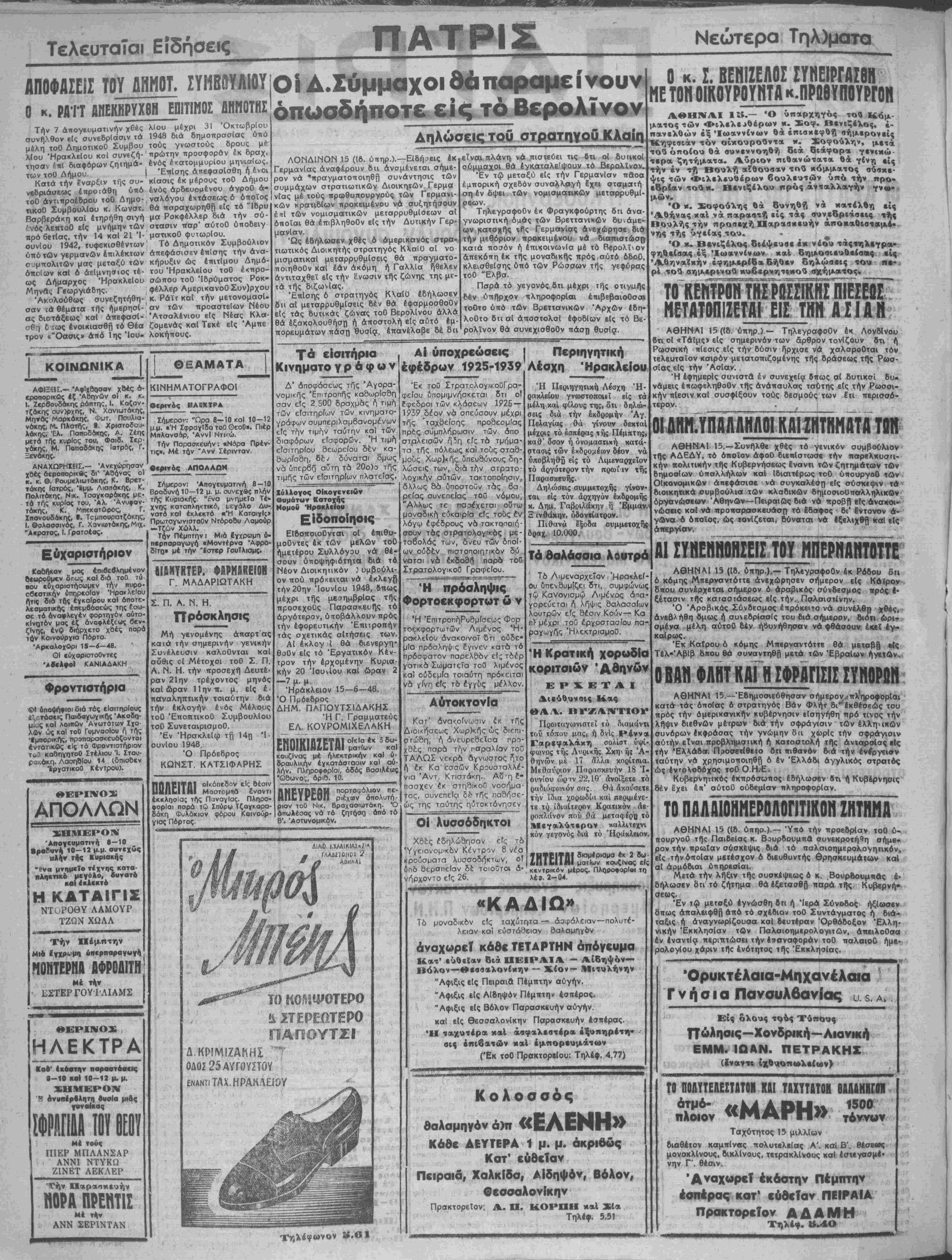 Ξ<νθάκην, οδοντίατρον. Πιθανά έ'ξοδα συμμετοχής 10.000. Νεώτερα Τηλ)μοτα Ο κ. Σ. ΒΕΝΙΖΕΛΟΣ ΣΥΝΕΙΡΓΑΣΘΗ ΜΕ ΤΟΝ 01Κ0ΥΡ0ΥΓ.ΤΛ κ-ΠΡΟΒΫΠΟΥΡΓΟΗ Τα θαλάσσια λουτρά Τδ Λιμεναρχείον Ηρακλεί¬ ου δπενθυμΐζει δτι, συμφώνως τω Κανονισμψ Λιμένος άπα- γορεύεται ή λήψις Θαλασσίων λουτρών είς θέσιν Κούν— Κα π, μέχρι τού έργοστασίου πα- ΉλεκτρισμοΟ. Ή Κρατική χορωδΐα κοριτσιών Άθιΐνΰν ΈΡΧΕΤΑΙ Διεύθυνσις Κάς, ΘΑΛ. ΙίΥΖΑΝΤΙΟΥ Προ)ΐαγωνιστεΐ τό διαμάντι τοΐ τόπου μας, ή δνίς Ρέννα Γαρεφαλάκη σολίστ ύψί- φωνος τής Λυριχής Σκηιή; Α¬ θηνών μέ 17 δλλα κορίτβια, Μεθαύριον Παρασκευήν 18 Ί ουνίου ώριν22,1Θ' άνοίξετε τό 0«8ιόφωνόν σ«ς. Θά άκούσετε την ιδία χορωδία καί περψένε- τβ τ^ ιδιαίτερον Κρατικόν άε· ροπλάνον πού θά μΐτας ές»ΐ] τό Μεγαλύτερον χαλλιτβχνι κόν γεγονός διά τό Ηράκλειον. ΤΗΤΡΙΤΒΙ 8ι°Μ*Ρ'0Μα έκ 2 δω ■νΙΐΛίΙΙΗΙ μαιίυν κουζίνας είς κεντρικόν μίρος. ΠλοροοορΙοι τη λ£». 2-04. «ΚΑΔΙΩ» Τδ μοναδικόν είς ταχύτη·τα — άαφάλειαν—πολυτί- λειΰν κοι εύστάΒειαν οαλαμηγδν αναχωρεί κάσ€ ΤΕΤΑΡΤΗΝ όπόγευμα Κατ' ευθείαν διά ΠΕΙΡΑΙΑ — Αίδηψόν— Βόλον—Θεσσαλονίκην — ~ίον— Μιτυλήνην "Άφιξις είς Πειραια Πέμπτην αύγήν. "Αφιξις είς Αίδηψόν Πέμπτην εσπέρας. "Αφιξις είς Βόλον Παρασκευήν αύγήν. καΐ είς Θεσσαλονίκην Παρασκευήν εσπέρας. Ή ταχυτέρα κ αί άσφαλεστέρα έξυηηρέτη- οι ς έηιβατών κ αί έμπορευμάτων (Έκ τοΟ Πρακτορείου: Τηλβφ. 4.77} ΑΘΗΝΑΙ ΙΚ.— Ό ύπαρχηγός τού ματος των Φιλελεαθέρων κ. Σοφ. Βενιζέλος, ε¬ πανελθών έξ Ιωαννίνων Θά επισκεφθή σήμερον είς Κηφισιάν τ6ν οίκουροβντα κ. Σοφούλην, μβ,4 τού όποίου Θά συνεννοήθη διά βιαφορα γενικώ τέραν ζητήματα. Αυριον πιθανώτατα θά γίνη είς την έν τ$ Βουλή αίθουσαν τού κόμματος σύσκε- ψις των 4>ιλελευθέρων βουλευτών υπό την προ-